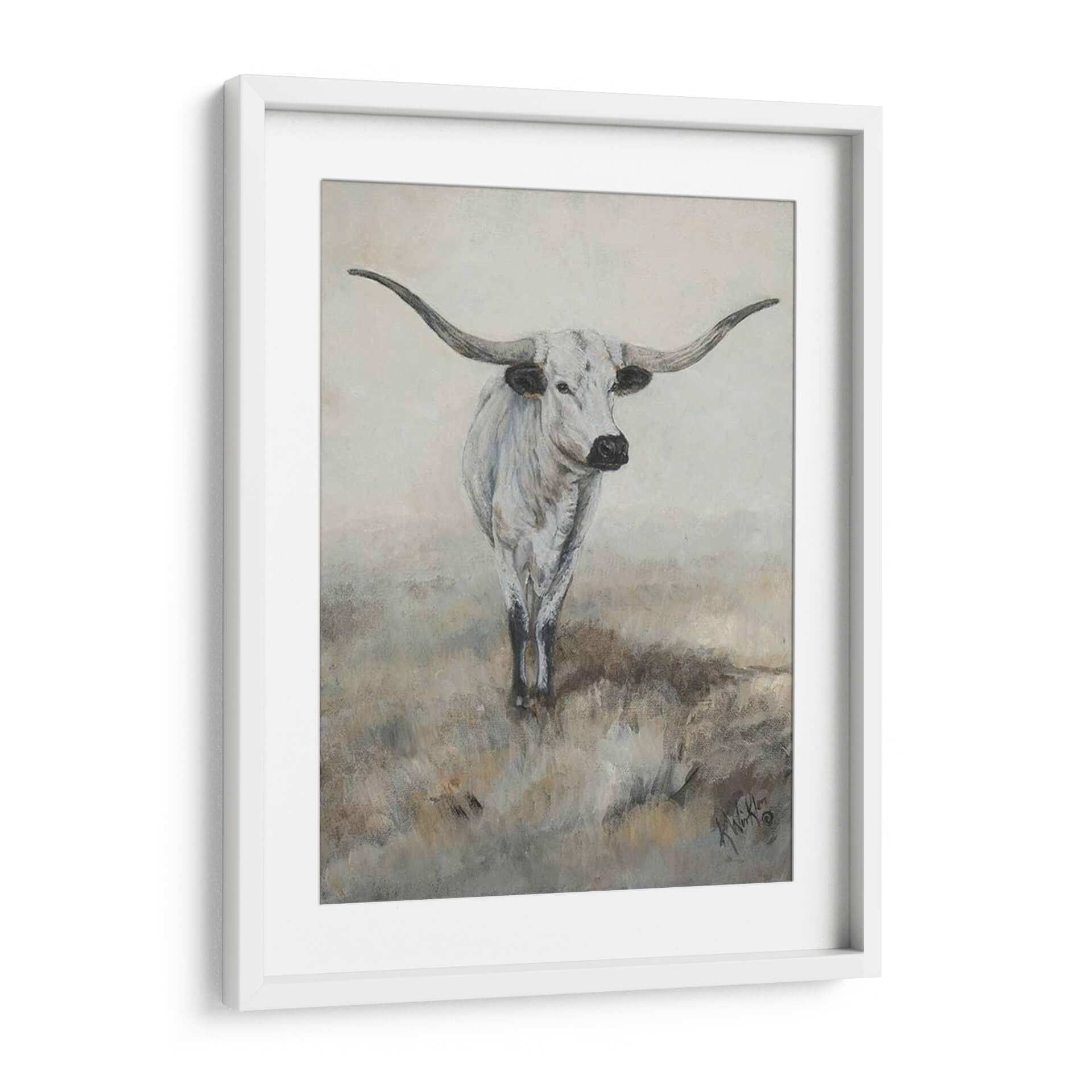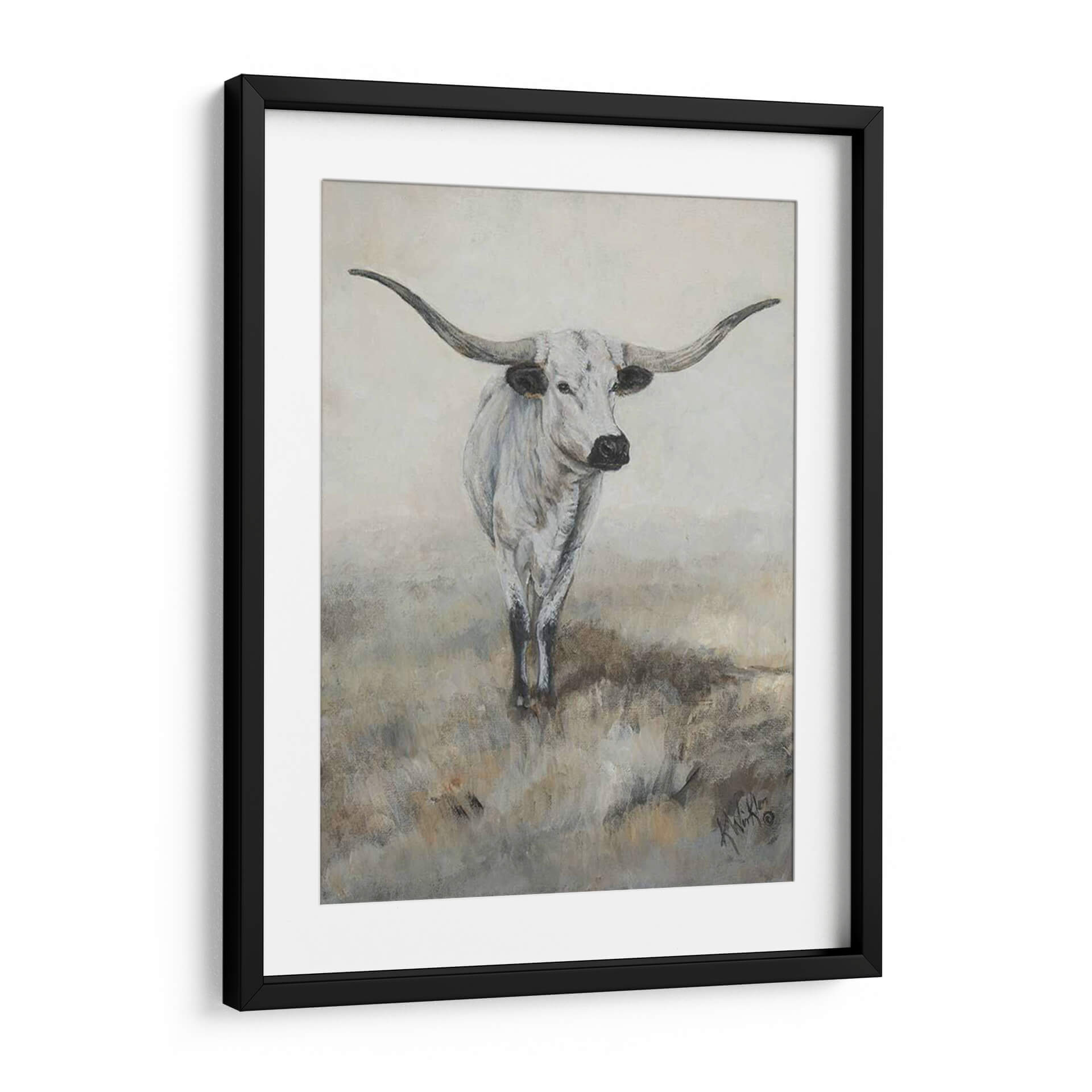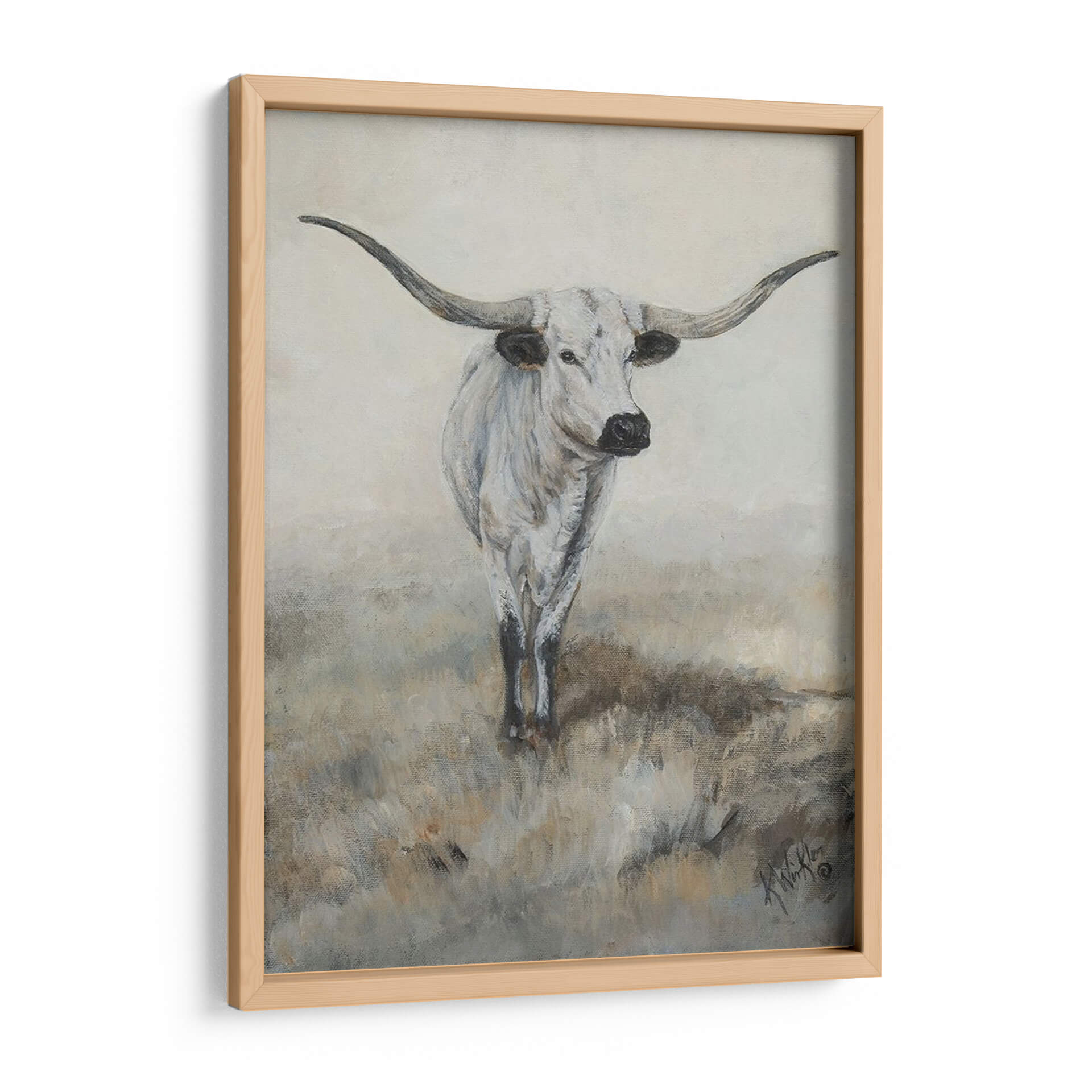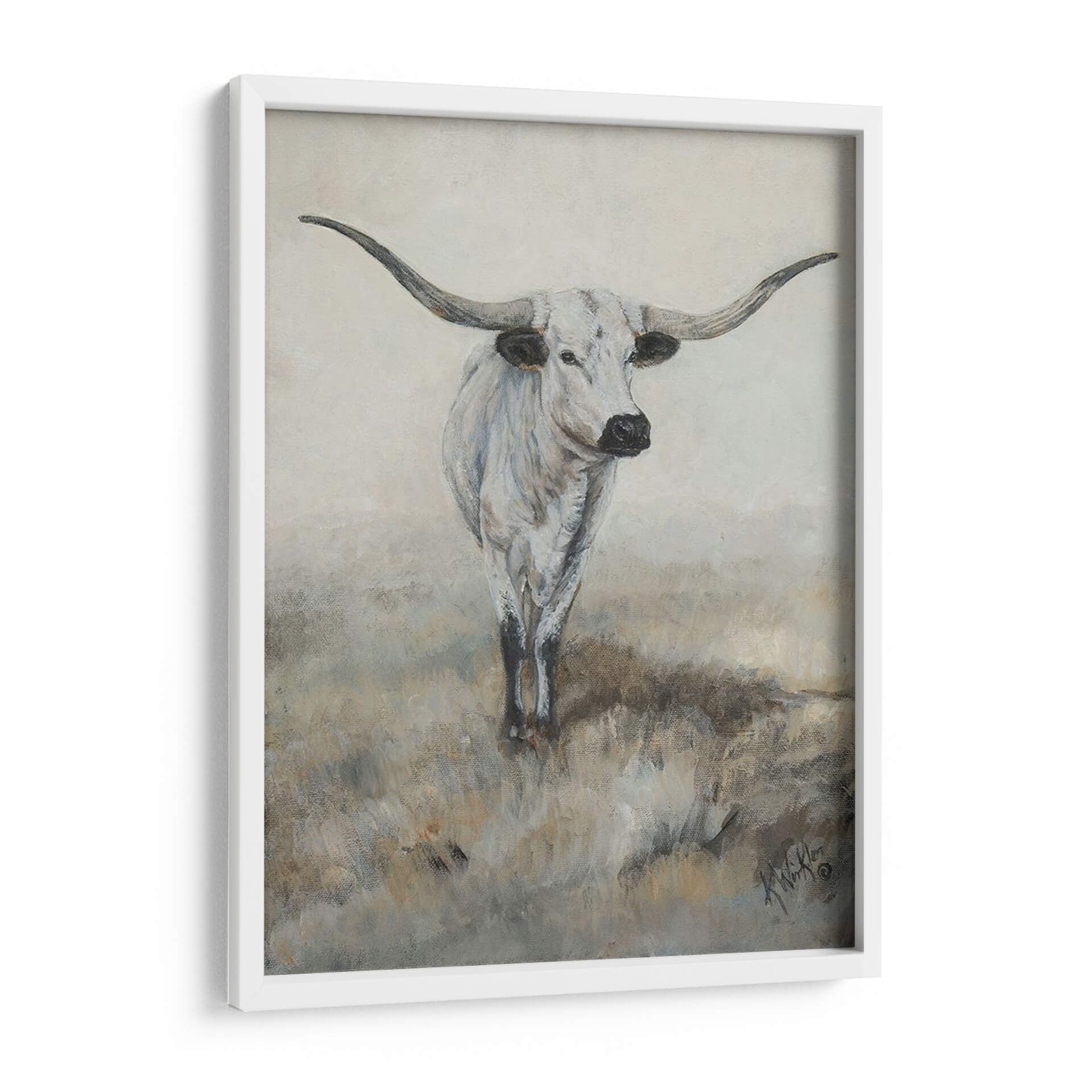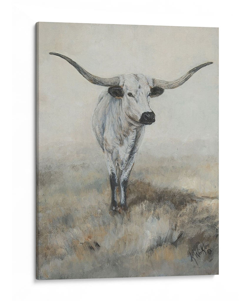 Capture la esencia de la majestuosidad campestre con este cautivador cuadro decorativo de un toro Texas Longhorn. La obra, titulada 'Impresión Duradera' por la artista Kathy Winkler, presenta un retrato evocador de esta icónica criatura, destacando sus imponentes cuernos curvos y su mirada serena. La paleta de colores se centra en tonos neutros y terrosos, con sutiles matices de blanco, gris y beige, creando una atmósfera de calma y elegancia rústica. La técnica pictórica, con pinceladas expresivas y una textura sutil, añade profundidad y carácter a la pieza, invitando a la contemplación. Este cuadro es perfecto para quienes buscan infundir a su hogar u oficina un toque de naturaleza indómita y sofisticación. Su estilo atemporal y su representación realista pero artística lo convierten en una adición versátil para cualquier decoración, desde la rústica hasta la contemporánea. Imagine este impresionante animal añadiendo un punto focal de carácter y serenidad a su sala de estar, estudio o dormitorio. Es una pieza que habla de fuerza, resistencia y la belleza del mundo natural, perfecta para crear un ambiente acogedor y lleno de personalidad.
