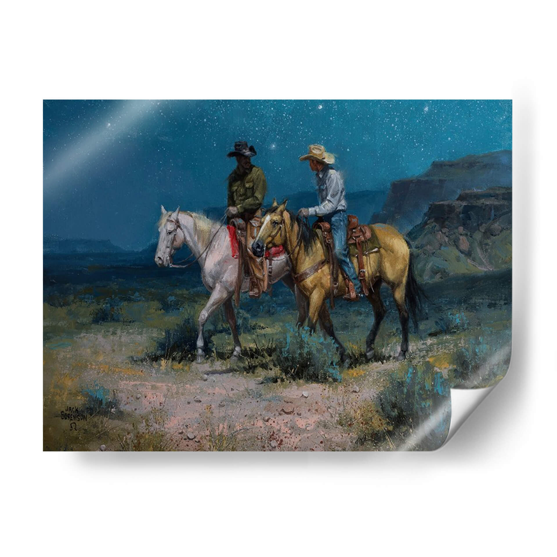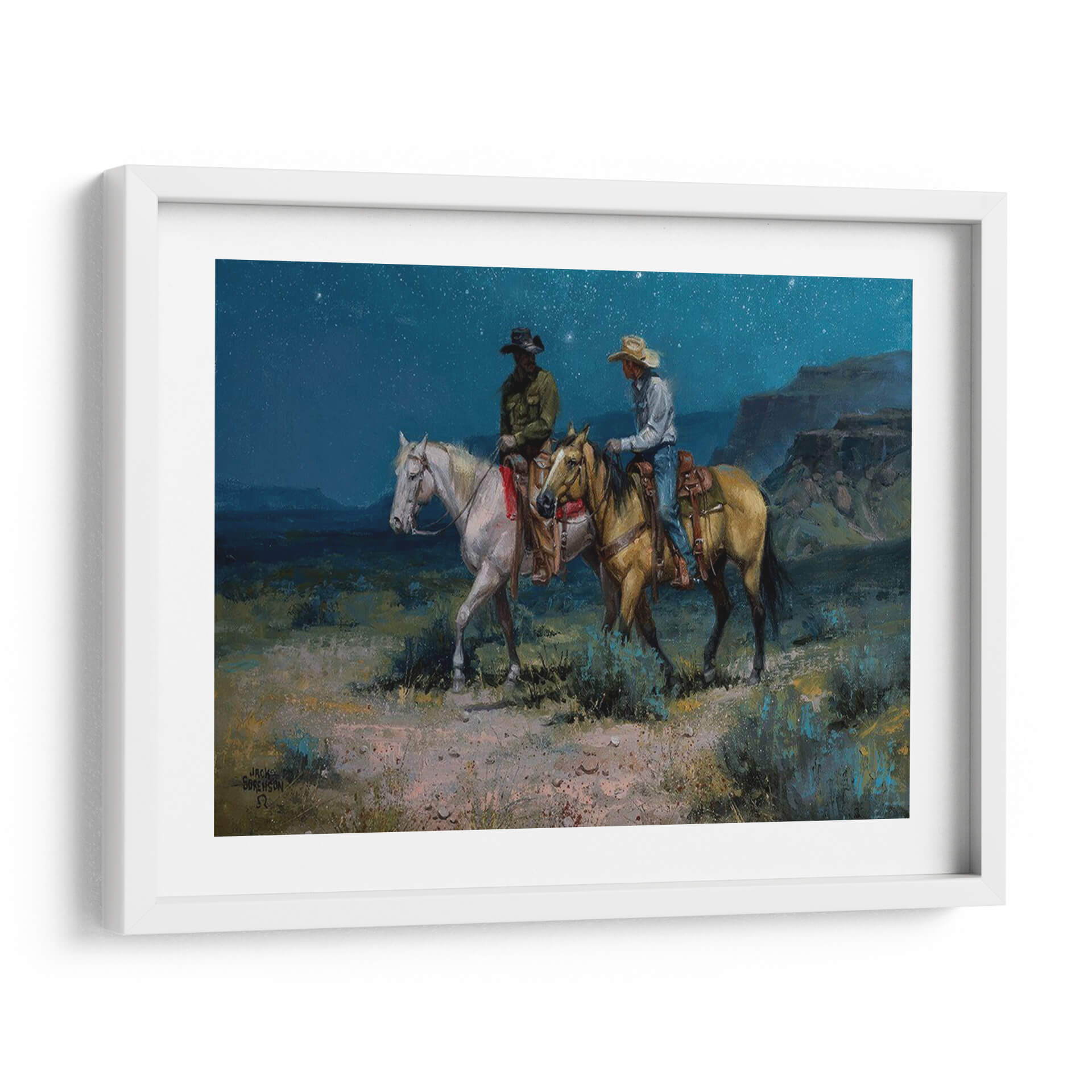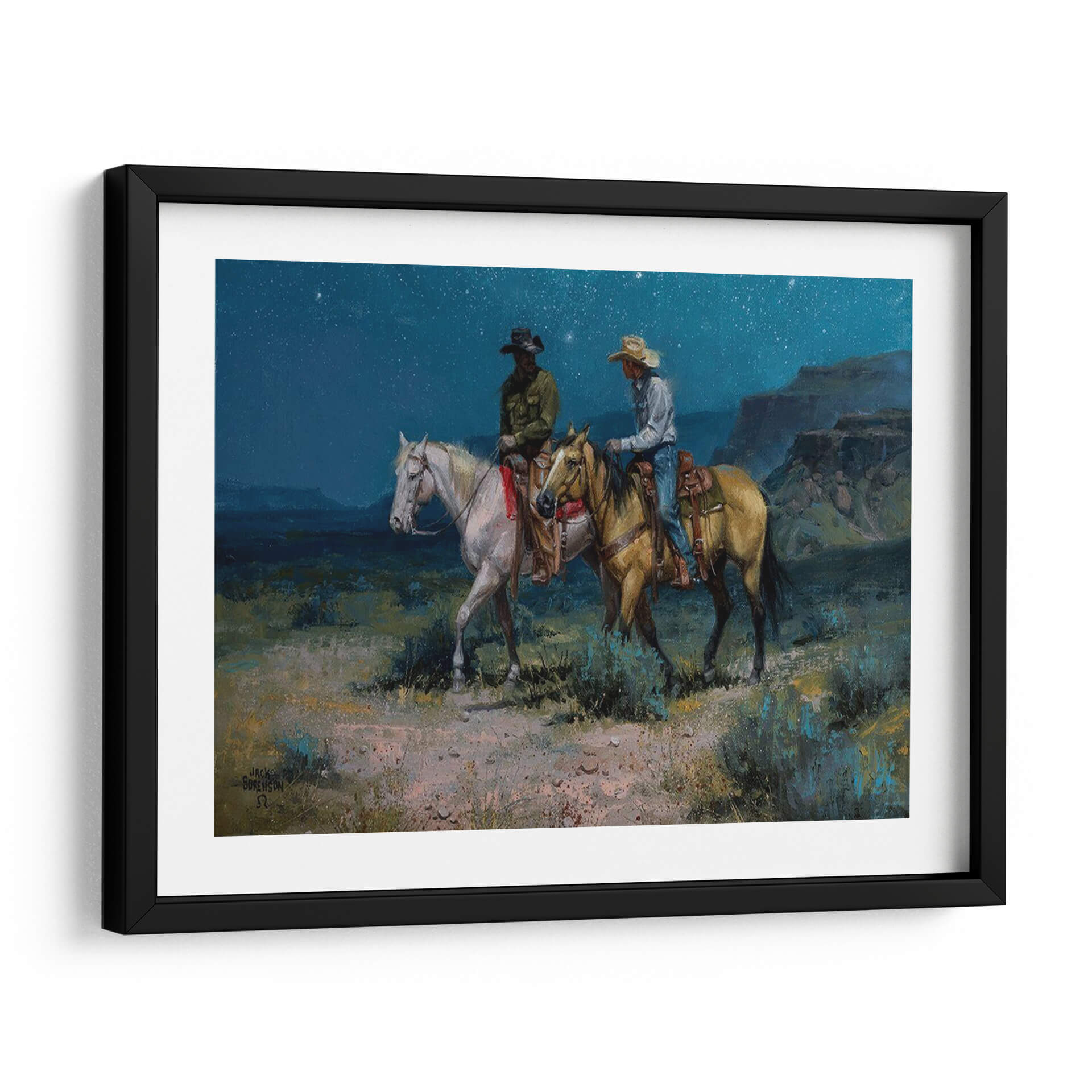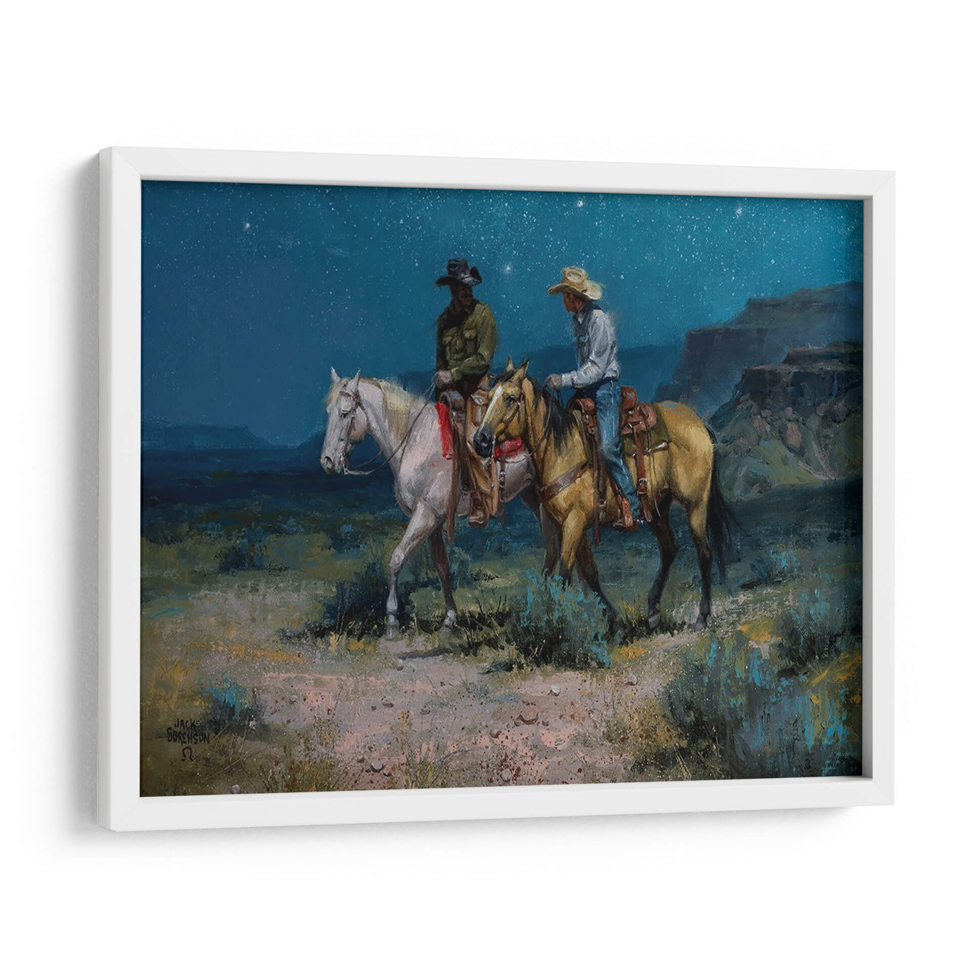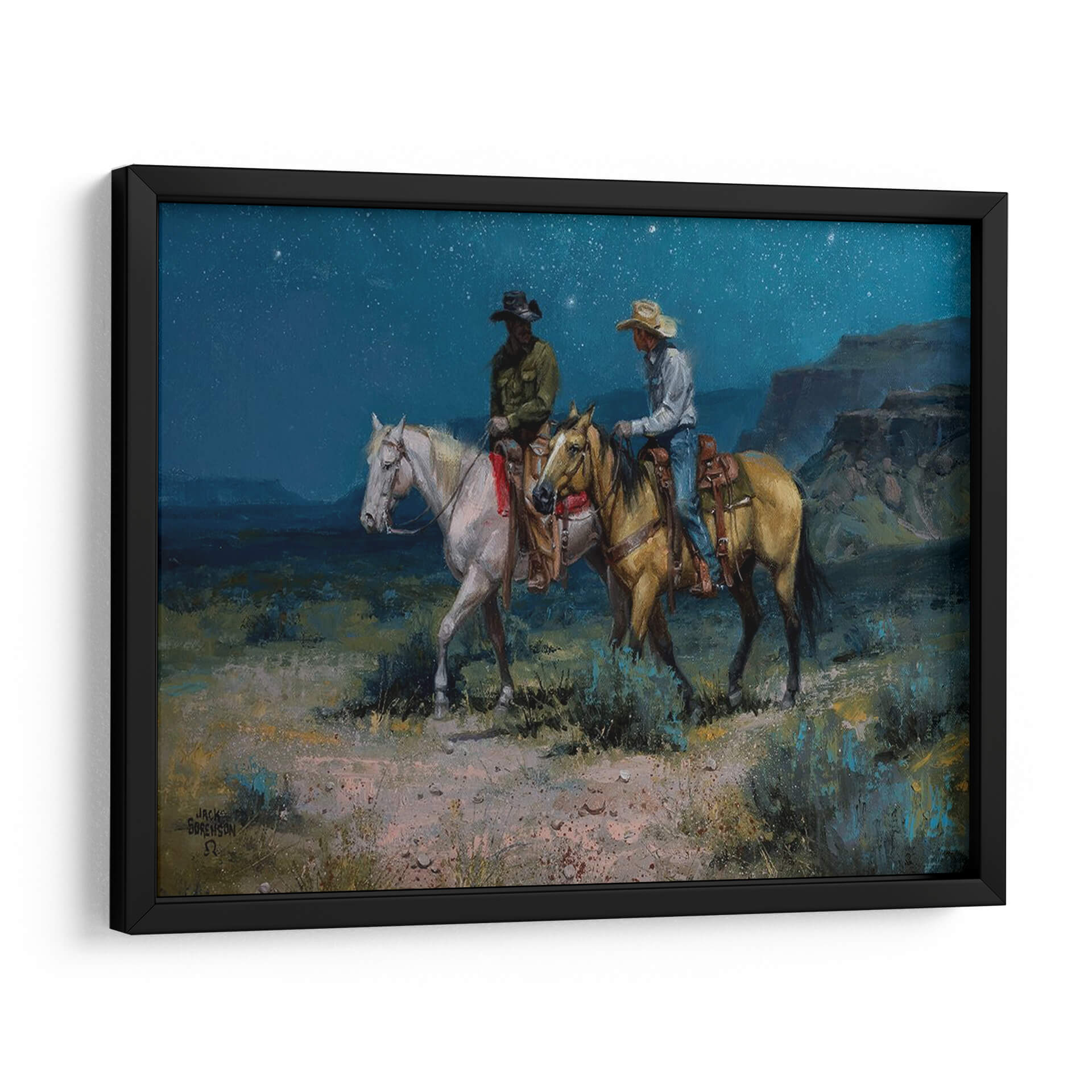 Transporta tu espacio a la vastedad del oeste con "Jinetes Nocturnos", una obra maestra evocadora del artista Jack Sorenson. Este cuadro decorativo captura un momento íntimo y sereno bajo un cielo estrellado, donde dos jinetes a caballo avanzan por un paisaje desértico al anochecer. La paleta de colores profundos, dominada por azules nocturnos, ocres terrosos y verdes musgo, crea una atmósfera de misterio y tranquilidad. Las pinceladas audaces y expresivas añaden textura y dinamismo, invitando al espectador a sentir la brisa fresca y el silencio del desierto. Los detalles en la vestimenta de los jinetes y la musculatura de los caballos demuestran la habilidad del artista para dar vida a sus creaciones. Ideal para un salón rústico, un estudio o cualquier rincón que busque un toque de aventura y contemplación, "Jinetes Nocturnos" es más que una simple decoración; es una ventana a un mundo de leyendas y paisajes indomables. Permite que esta pieza inspire conversaciones y transporte tu imaginación a las vastas llanuras bajo el manto estrellado.