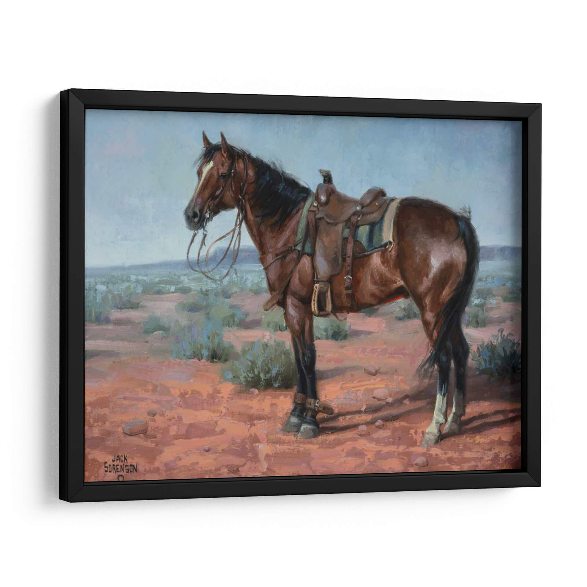 Sumérgete en la serenidad del Oeste americano con este cautivador cuadro decorativo del artista Jack Sorenson, titulado "Listo Y Esperando". La obra captura la imagen de un caballo de color castaño oscuro, ricamente ensillado, parado en un paisaje árido y polvoriento bajo un cielo azul pálido. La paleta de colores, dominada por tonos tierra, ocres y azules suaves, evoca una sensación de calma y desolación, típica de las vastas extensiones del desierto. Las pinceladas audaces y el estilo realista pero con un toque impresionista dan vida a la textura del pelaje del caballo y a la rugosidad del terreno. Este cuadro es perfecto para aquellos que aprecian la belleza rústica y la fortaleza de los equinos, así como la estética del arte western. Imagina esta pieza como un punto focal en tu sala de estar, estudio u oficina, añadiendo un toque de naturaleza salvaje y elegancia atemporal. "Listo Y Esperando" no es solo una obra de arte, sino una invitación a contemplar la quietud y la anticipación, un diálogo silencioso entre el animal y el paisaje que lo rodea. Ideal para amantes de los caballos, la cultura vaquera y el arte decorativo que inspira y transporta.