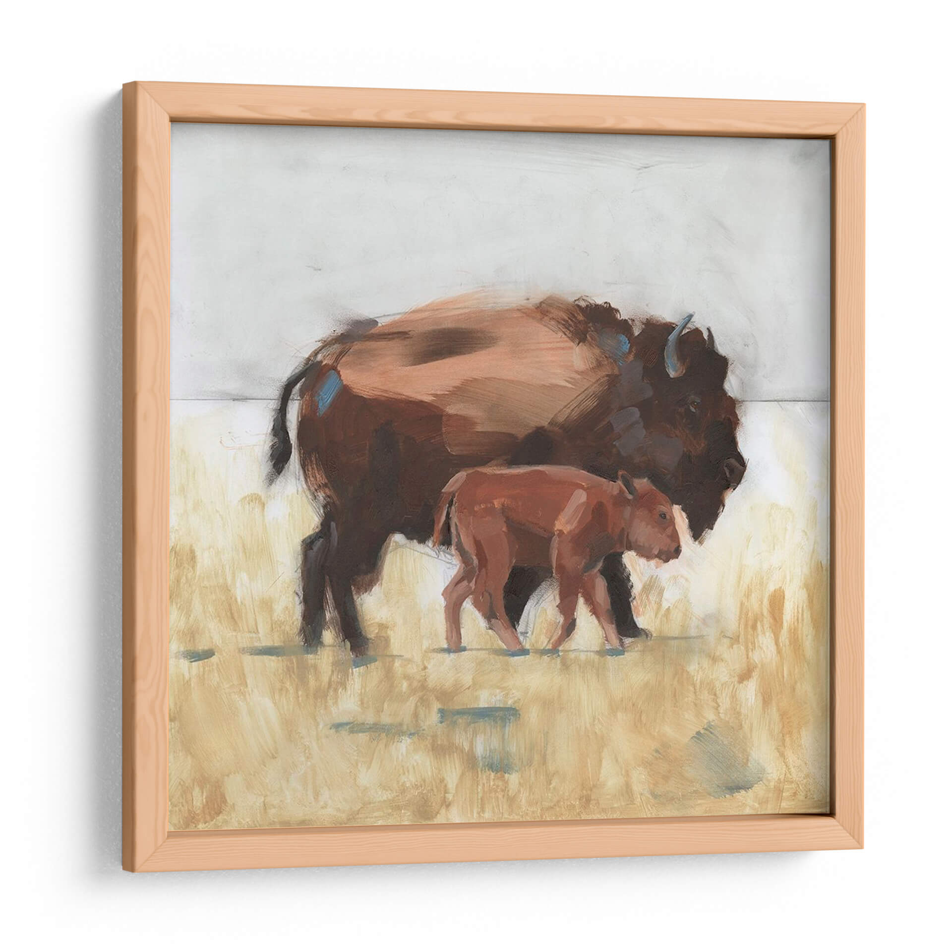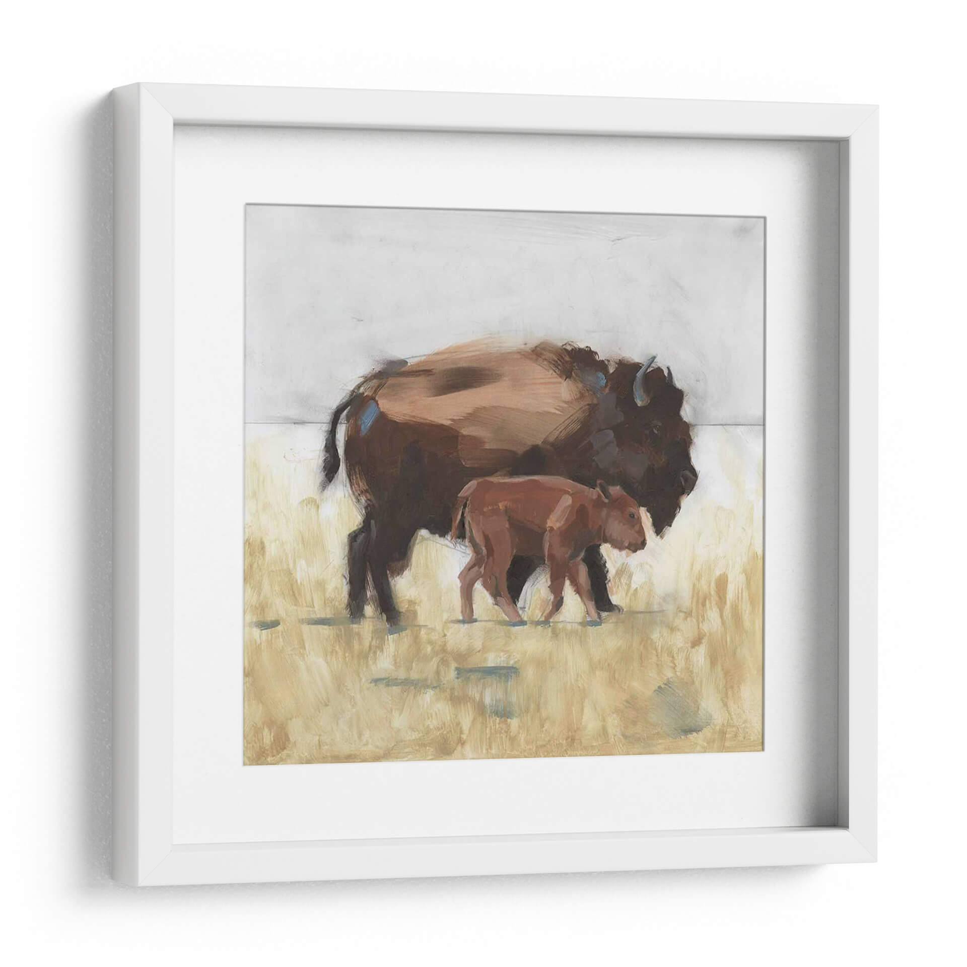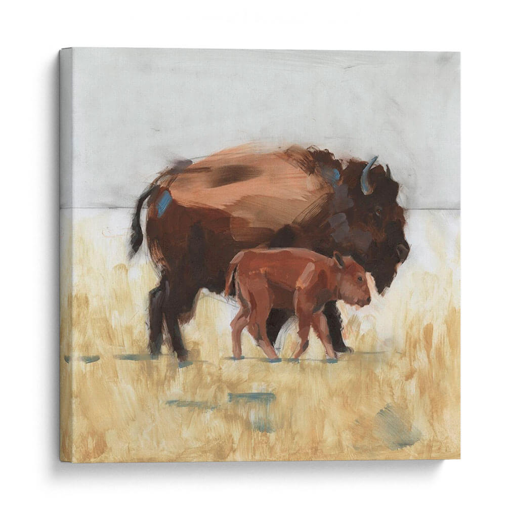 Captura la majestuosidad de la naturaleza con "Lodge Guardian III", una obra de arte cautivadora que presenta a un imponente bisonte adulto acompañado de su cría. La pieza evoca una profunda conexión con la vida salvaje y la fuerza de los lazos familiares. El artista W. Rutledge utiliza una paleta de colores tierra, dominada por tonos marrones cálidos y amarillos dorados, que recrean la atmósfera de una pradera al atardecer. Las pinceladas audaces y expresivas añaden textura y movimiento, confiriendo a la escena un aire de impresionismo moderno. El contraste entre las figuras robustas de los bisontes y el suave fondo desenfocado crea un punto focal dinámico, invitando a la contemplación. Este cuadro decorativo es ideal para añadir un toque de serenidad y carácter natural a cualquier espacio, desde una sala de estar rústica hasta una oficina moderna que busque inspiración en la resiliencia y la belleza del mundo natural. La composición, centrada en la protección y el vínculo, transmite paz y fortaleza, convirtiéndola en una adición significativa para tu hogar.