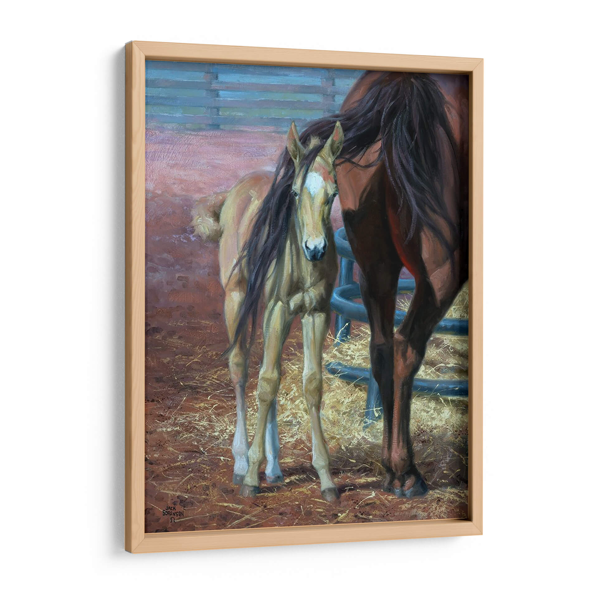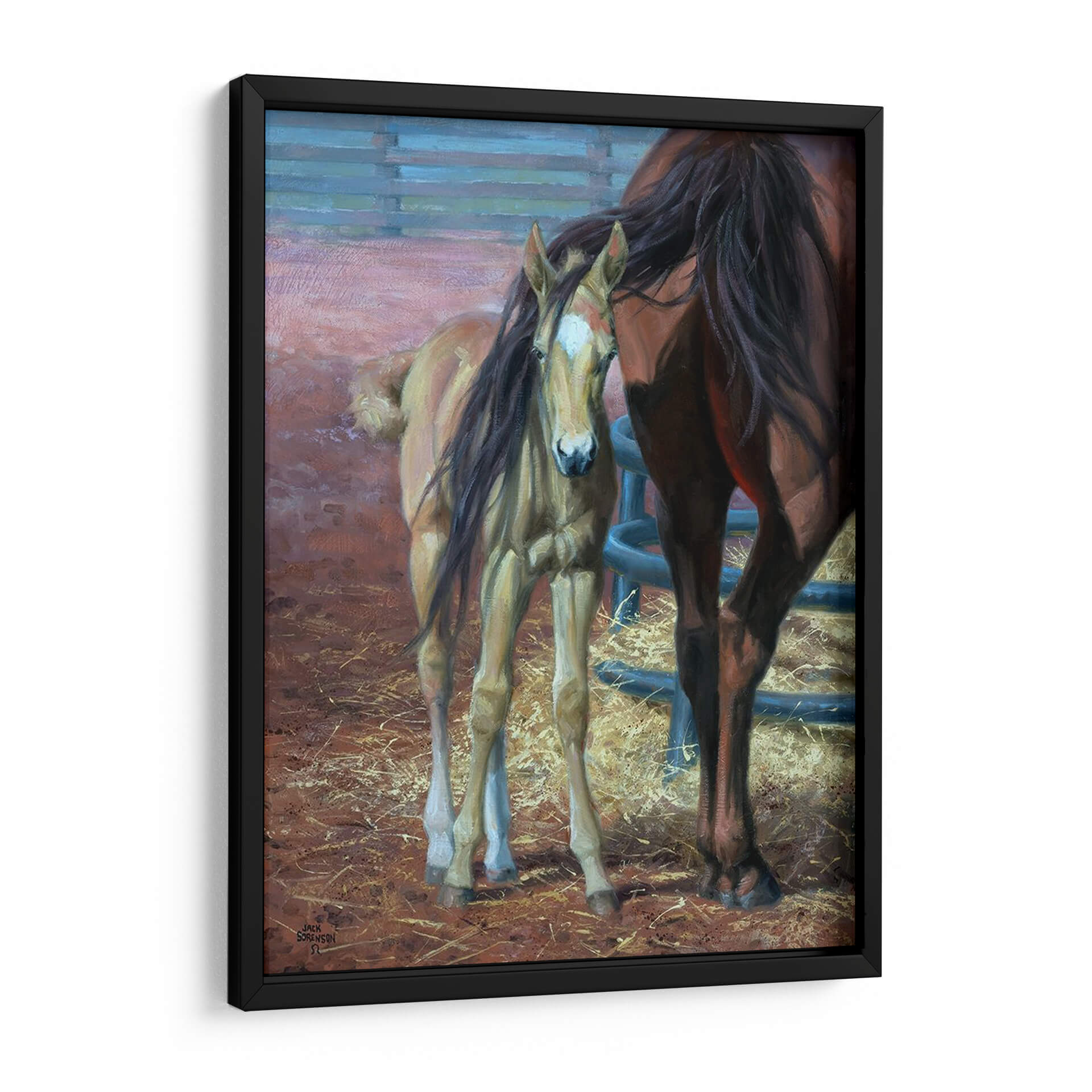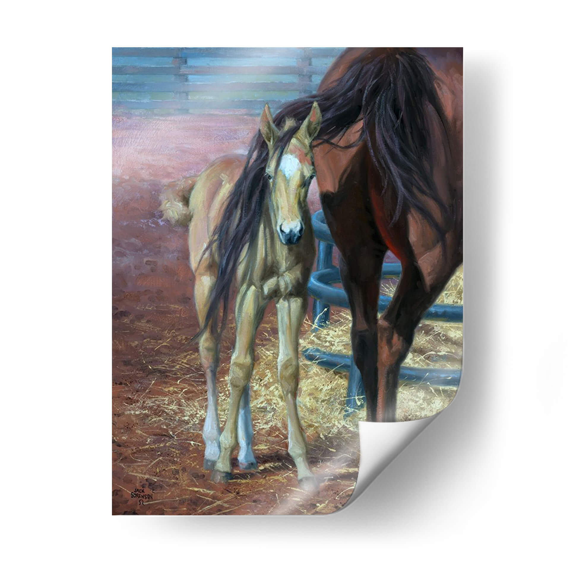 Captura la ternura y la conexión intergeneracional con este conmovedor cuadro decorativo "Mal Día De Cabello" de Jack Sorenson. La obra maestra presenta un potro de pelaje dorado, con una crin larga y sedosa que cae sobre sus ojos curiosos, apoyado tiernamente contra la pata de un caballo adulto, cuya imponente figura sugiere protección y seguridad. La paleta de colores cálidos, dominada por tonos tierra, ocres y marrones, evoca la rusticidad del entorno de una granja o establo, acentuada por el azul vibrante de las vallas y un cielo sutilmente sugerido. El estilo realista y detallado de Sorenson da vida a la textura del pelaje y la paja en el suelo, creando una atmósfera de calma y naturalidad. Este cuadro decorativo es una pieza excepcional para añadir un toque de calidez, inocencia y la belleza de la vida rural a cualquier espacio, ya sea una sala de estar, un dormitorio o una oficina. Ideal para amantes de los animales y para quienes buscan una obra de arte que transmita sentimientos de afecto y seguridad. Su composición íntima y el enfoque en la relación entre los caballos invitan a la contemplación y a la apreciación de los lazos familiares en el reino animal, convirtiéndolo en un punto focal emocional y estético en tu decoración.