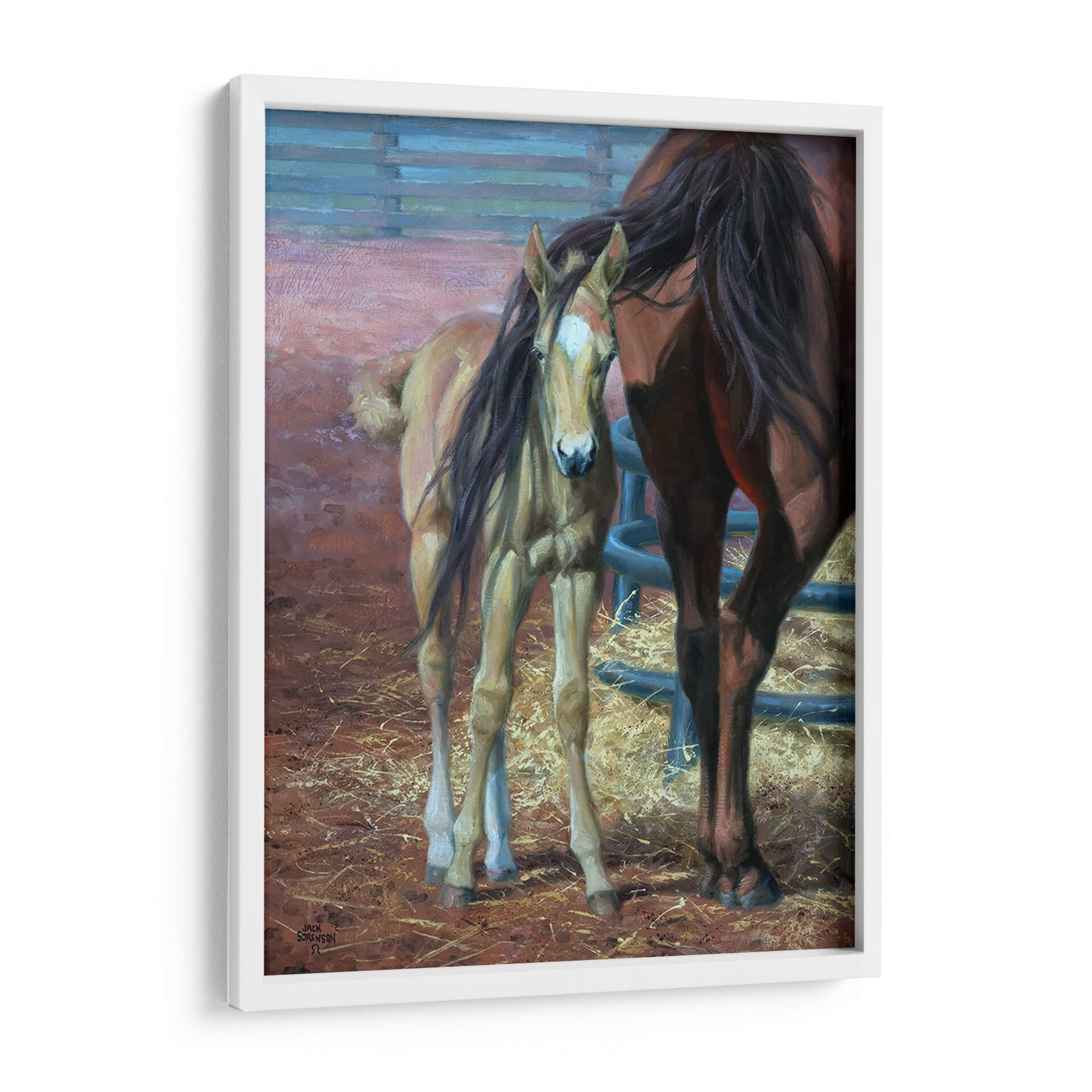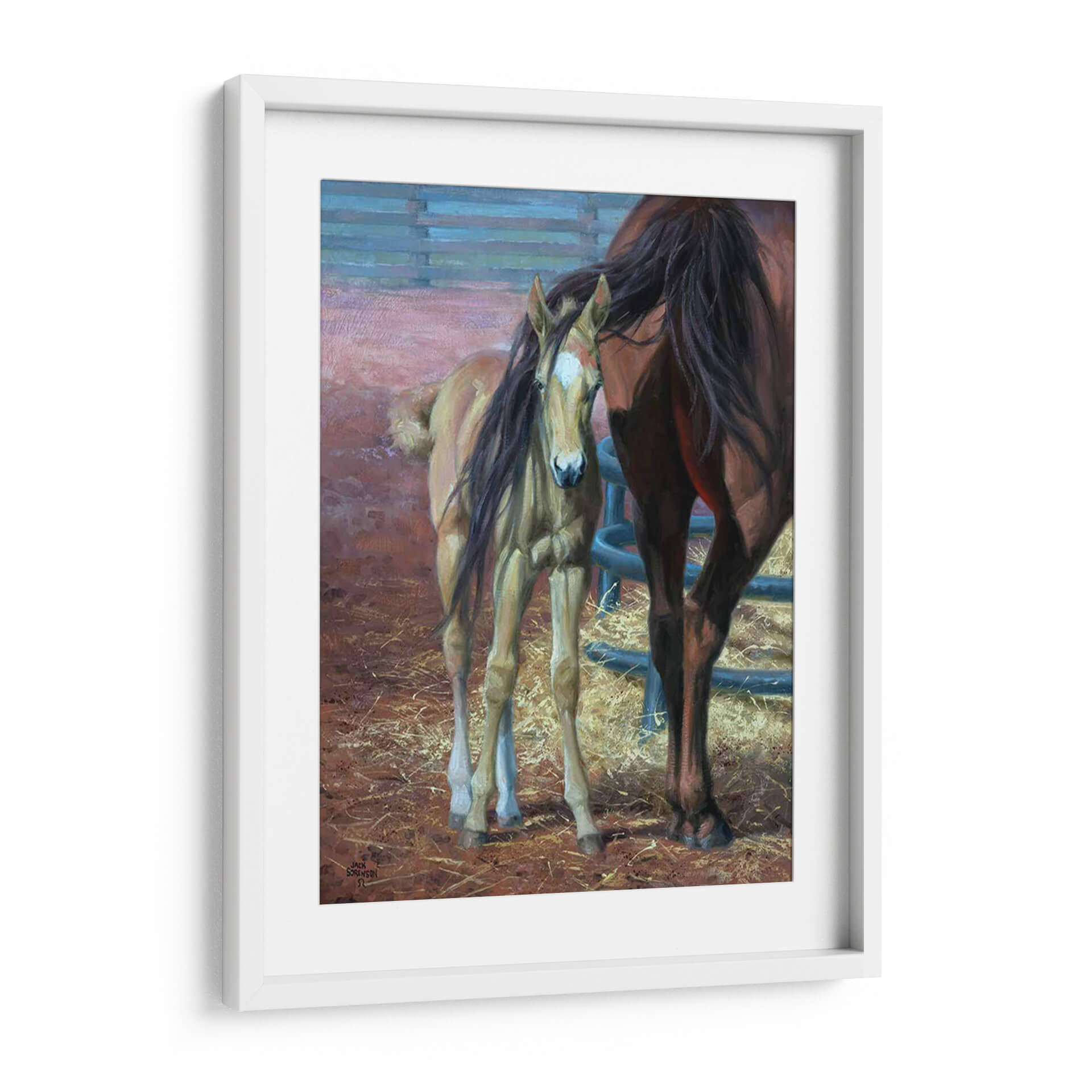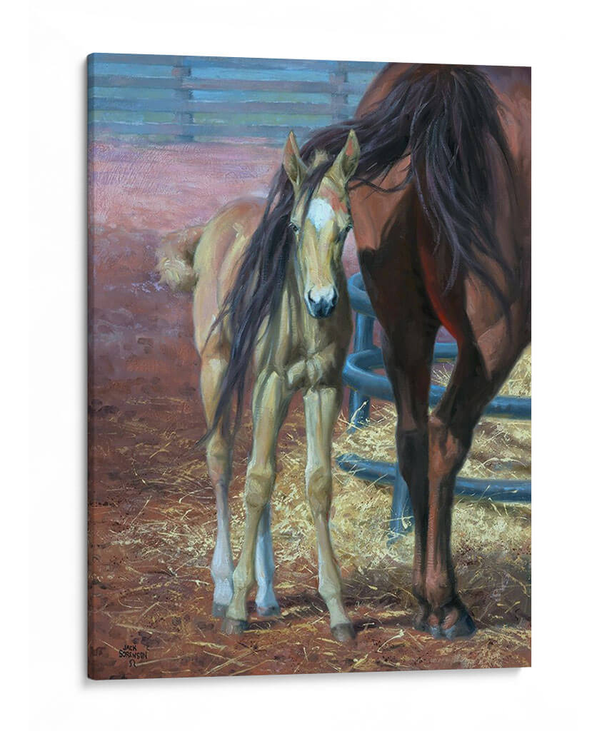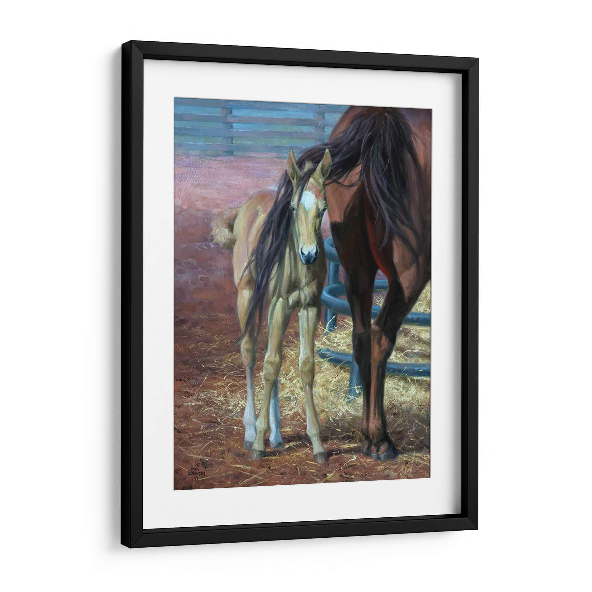 Captura la ternura y la conexión intergeneracional con este conmovedor cuadro decorativo "Mal Día De Cabello" de Jack Sorenson. La obra maestra presenta un potro de pelaje dorado, con una crin larga y sedosa que cae sobre sus ojos curiosos, apoyado tiernamente contra la pata de un caballo adulto, cuya imponente figura sugiere protección y seguridad. La paleta de colores cálidos, dominada por tonos tierra, ocres y marrones, evoca la rusticidad del entorno de una granja o establo, acentuada por el azul vibrante de las vallas y un cielo sutilmente sugerido. El estilo realista y detallado de Sorenson da vida a la textura del pelaje y la paja en el suelo, creando una atmósfera de calma y naturalidad. Este cuadro decorativo es una pieza excepcional para añadir un toque de calidez, inocencia y la belleza de la vida rural a cualquier espacio, ya sea una sala de estar, un dormitorio o una oficina. Ideal para amantes de los animales y para quienes buscan una obra de arte que transmita sentimientos de afecto y seguridad. Su composición íntima y el enfoque en la relación entre los caballos invitan a la contemplación y a la apreciación de los lazos familiares en el reino animal, convirtiéndolo en un punto focal emocional y estético en tu decoración.