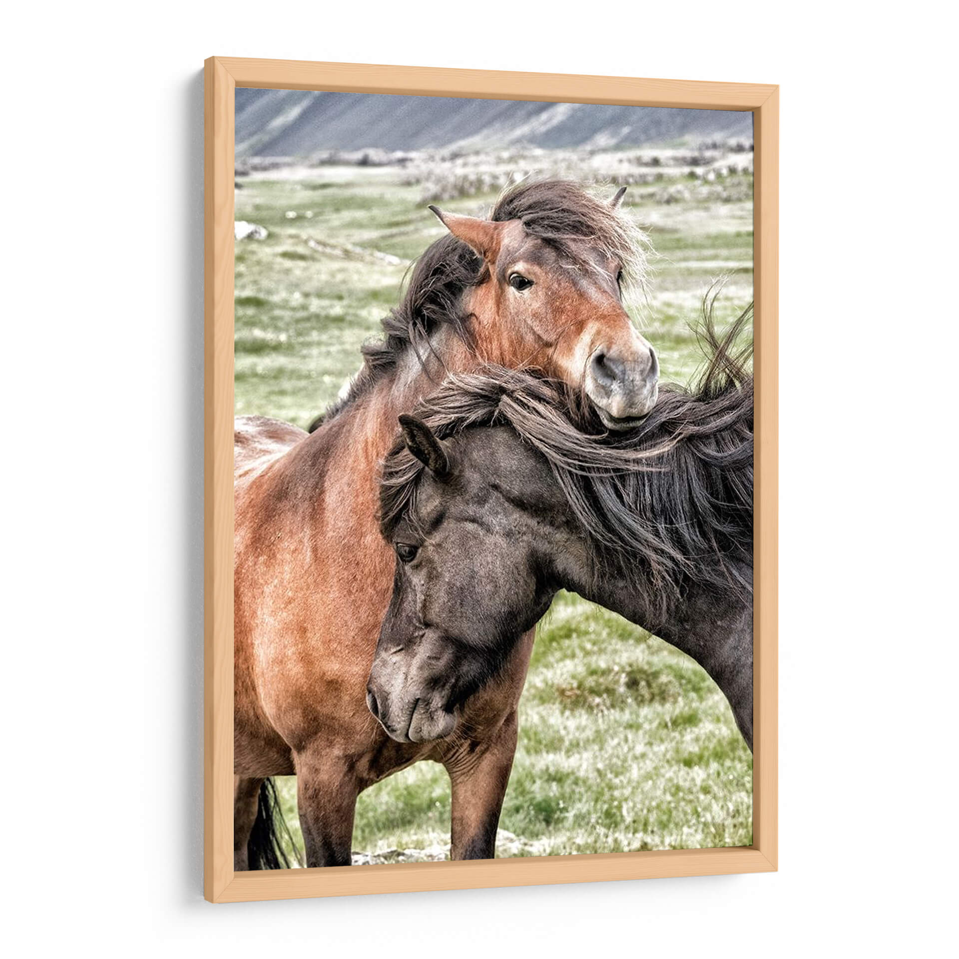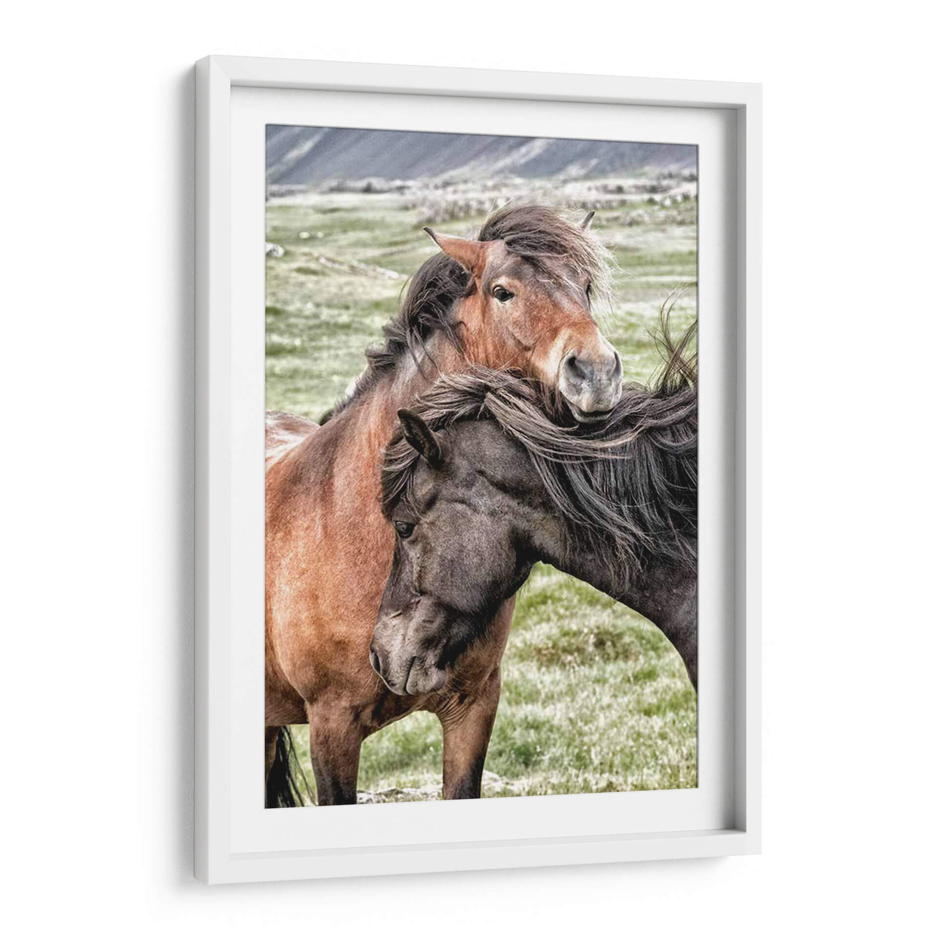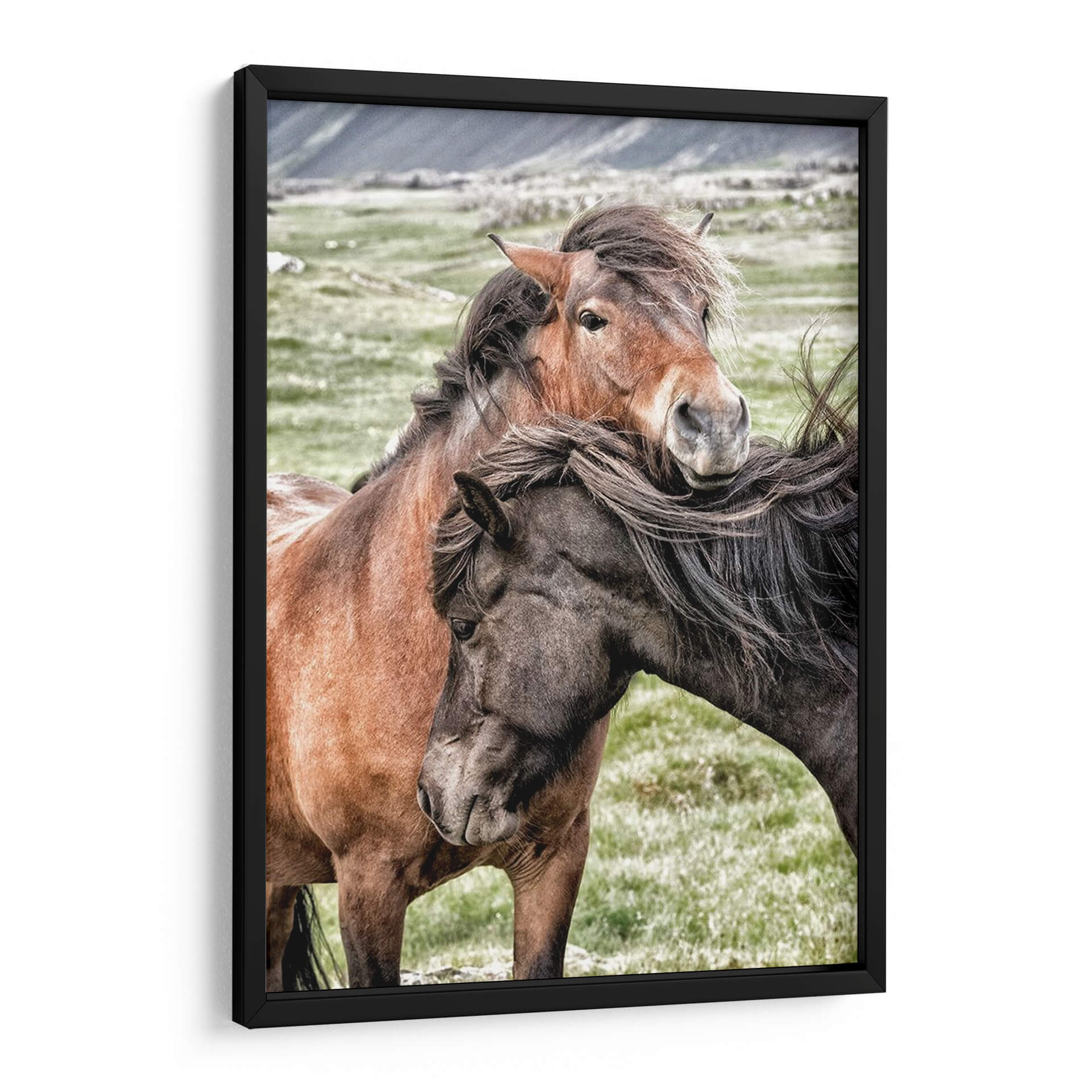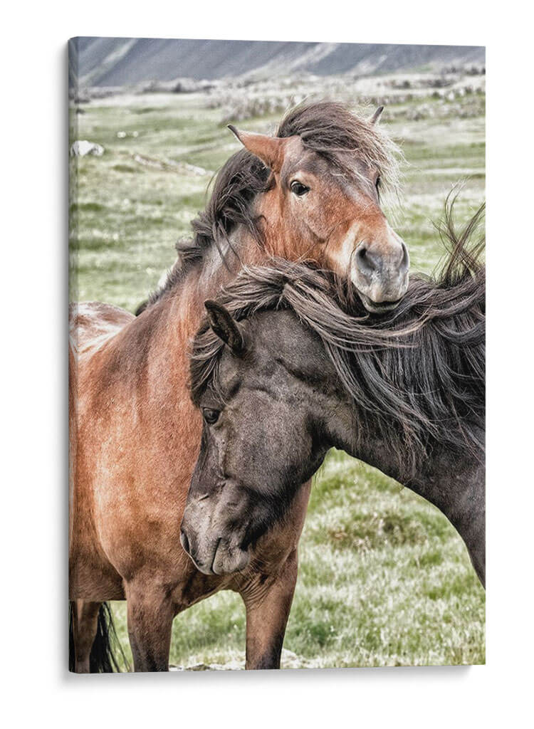 Captura la esencia de la conexión y la lealtad con nuestro cuadro decorativo "Mejores Amigos", una obra del artista Danny Head que inmortaliza la profunda amistad entre dos caballos. La imagen presenta un primer plano íntimo de dos equinos, uno de pelaje castaño rojizo y el otro de tonalidad oscura, cuyas cabezas se entrelazan en un gesto tierno y protector. El fondo, un paisaje campestre sereno con colinas difuminadas, resalta la expresividad de los animales. La paleta de colores, dominada por tonos tierra, verdes suaves y grises naturales, crea una atmósfera de tranquilidad y armonía, ideal para espacios que buscan transmitir paz y calidez. El estilo fotográfico, con un enfoque nítido en los rostros y las crines al viento, aporta un realismo emotivo que invita a la contemplación. Este cuadro es perfecto para añadir un toque de naturaleza y sentimiento a tu hogar u oficina, evocando la fuerza de los lazos inquebrantables. Su composición centra la atención en la mirada y el contacto físico de los caballos, sugiriendo una narrativa de compañerismo y confianza mutua, convirtiéndolo en una pieza decorativa conmovedora y significativa para cualquier amante de los animales o del arte inspirador.