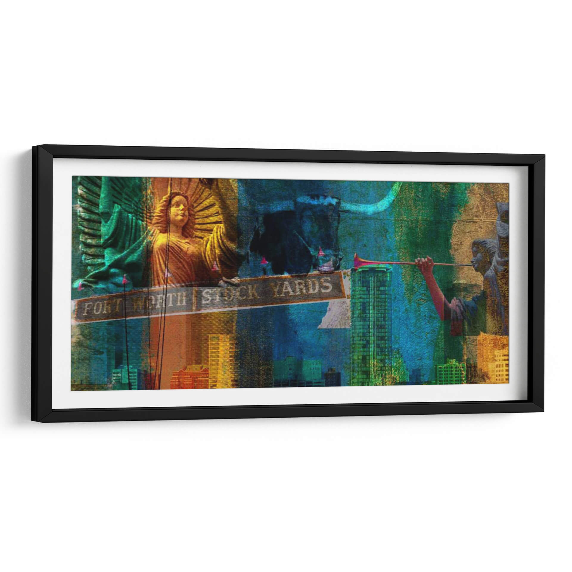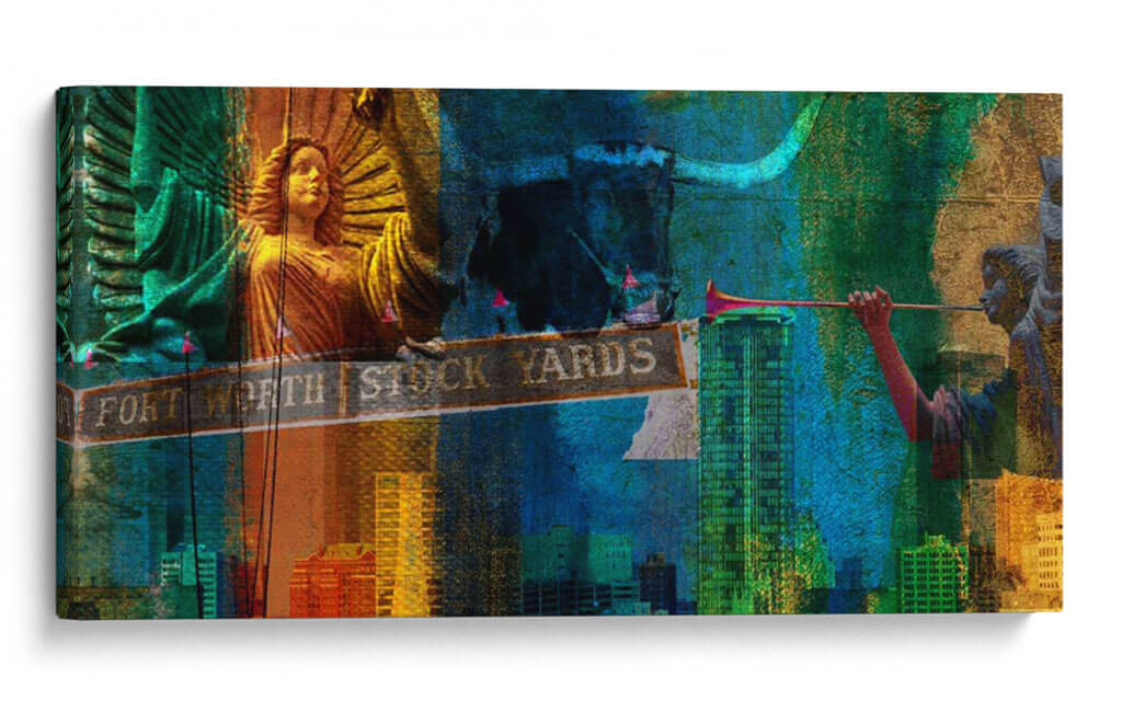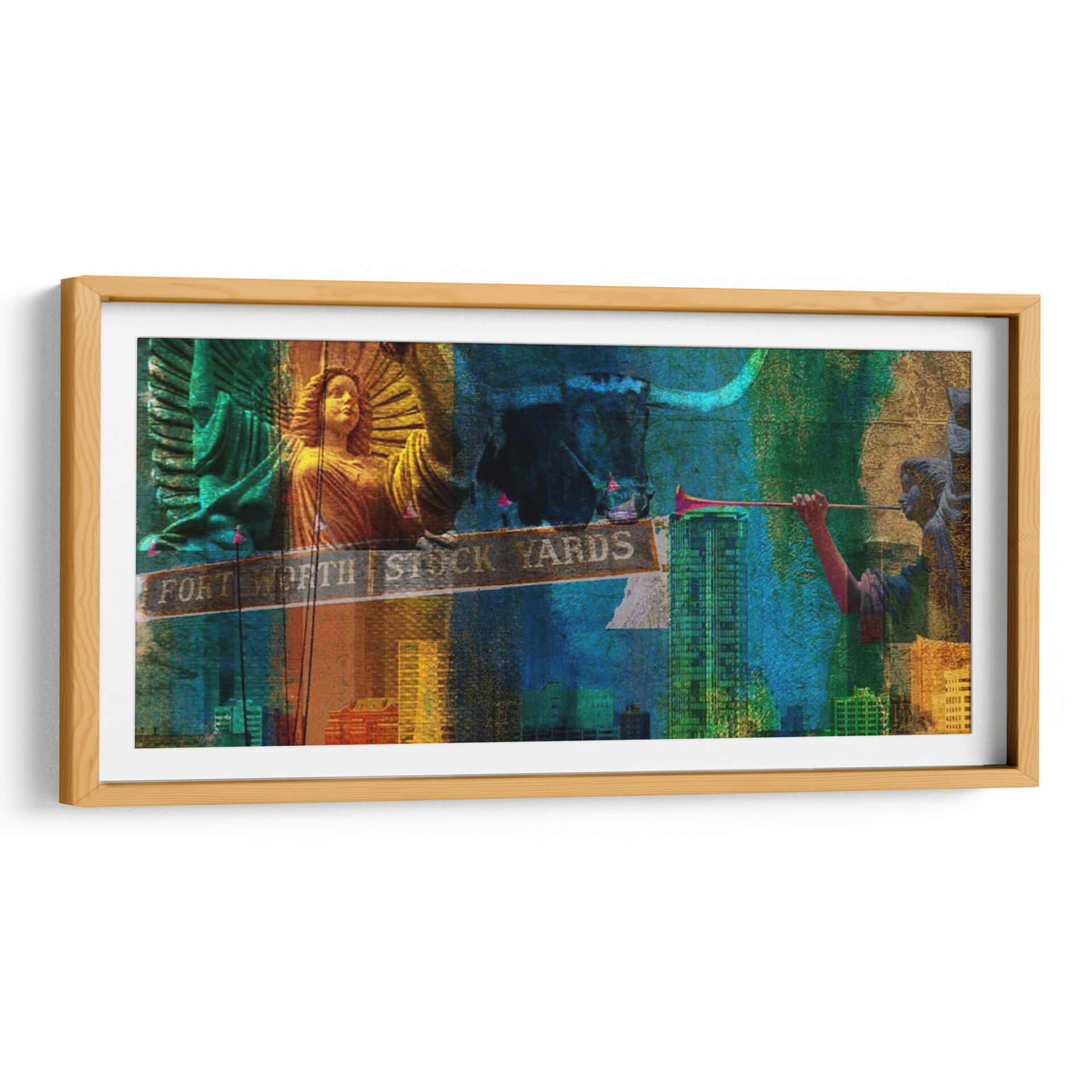 Sumérgete en la vibrante y enigmática obra 'Pie. Panel Valioso' de Sisa Jasper, una pieza que desafía las convenciones y captura la imaginación. Este cuadro decorativo es una explosión de color y textura, fusionando elementos urbanos con figuras clásicas y símbolos icónicos. En el centro, una figura alada con túnica dorada y ocre parece emerger de un telón de fondo abstracto de azules profundos y verdes esmeralda, evocando una sensación de majestuosidad y misterio. A su lado, un toro imponente se asoma, sugiriendo fuerza y conexión con la historia o la naturaleza. La obra está salpicada de rascacielos estilizados y la distintiva señal "Fort Worth Stock Yards", añadiendo capas de contexto y narrativa. La paleta de colores, rica y audaz, transita por tonos cálidos y fríos, creando un contraste dinámico que atrae la mirada y estimula la conversación. El estilo artístico, una mezcla de collage digital y realismo texturizado, otorga a la pieza una profundidad y un carácter únicos. Este cuadro decorativo es perfecto para espacios que buscan un toque de originalidad y profundidad, ya sea una sala de estar moderna, una oficina ejecutiva o un estudio creativo, convirtiéndose en un punto focal ineludible y una fuente constante de inspiración visual.