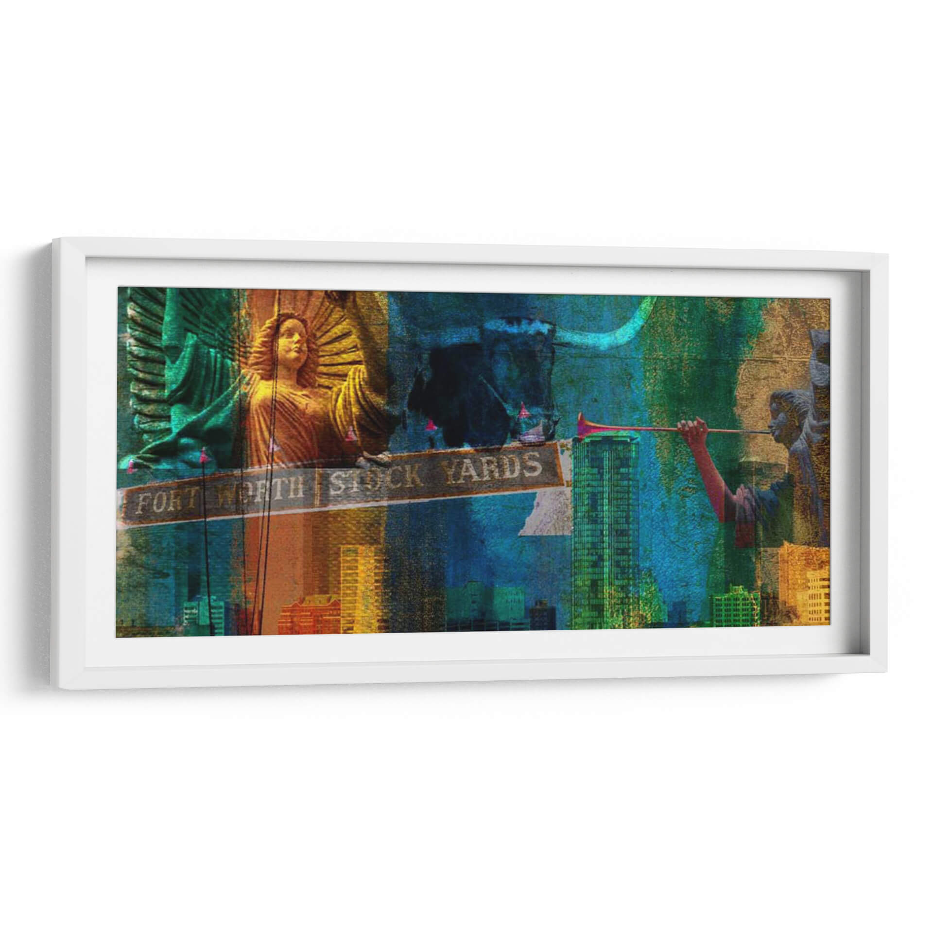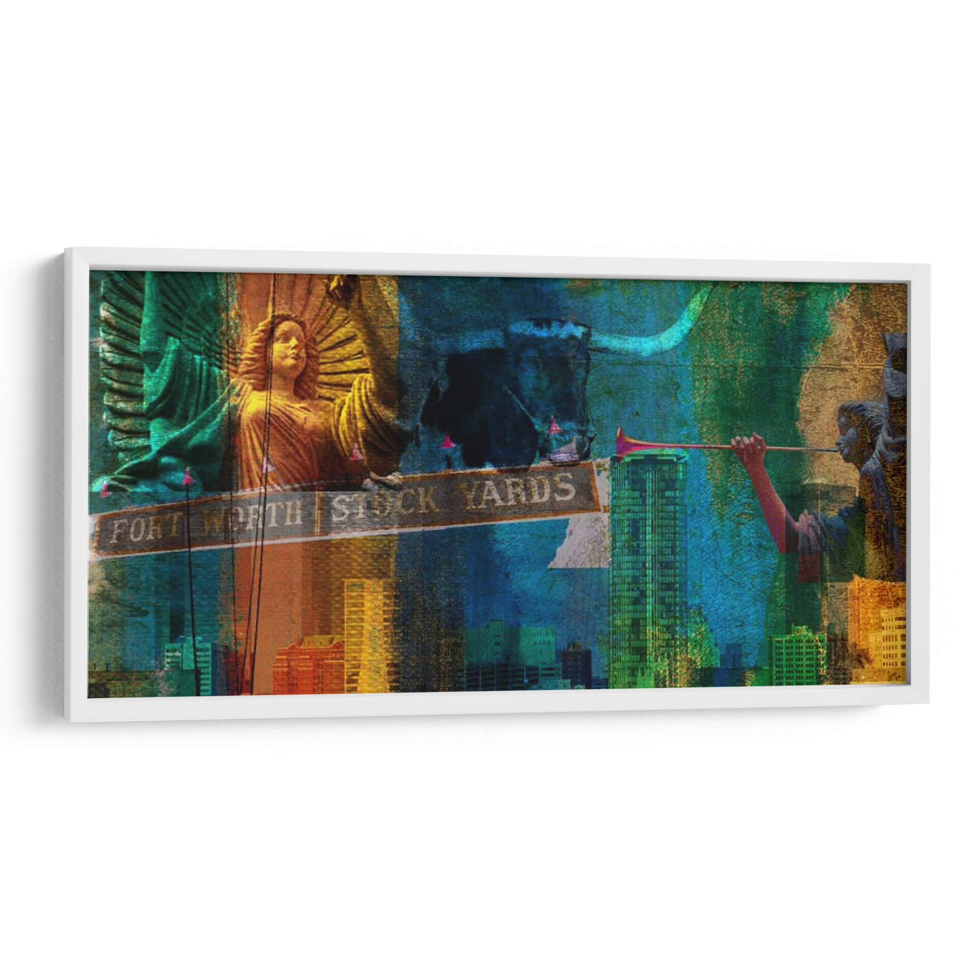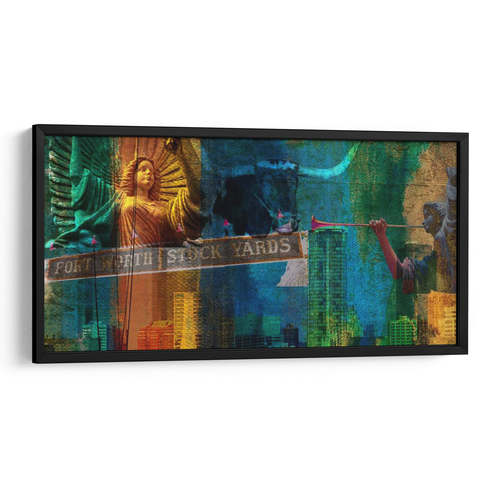 Sumérgete en la vibrante y enigmática obra 'Pie. Panel Valioso' de Sisa Jasper, una pieza que desafía las convenciones y captura la imaginación. Este cuadro decorativo es una explosión de color y textura, fusionando elementos urbanos con figuras clásicas y símbolos icónicos. En el centro, una figura alada con túnica dorada y ocre parece emerger de un telón de fondo abstracto de azules profundos y verdes esmeralda, evocando una sensación de majestuosidad y misterio. A su lado, un toro imponente se asoma, sugiriendo fuerza y conexión con la historia o la naturaleza. La obra está salpicada de rascacielos estilizados y la distintiva señal "Fort Worth Stock Yards", añadiendo capas de contexto y narrativa. La paleta de colores, rica y audaz, transita por tonos cálidos y fríos, creando un contraste dinámico que atrae la mirada y estimula la conversación. El estilo artístico, una mezcla de collage digital y realismo texturizado, otorga a la pieza una profundidad y un carácter únicos. Este cuadro decorativo es perfecto para espacios que buscan un toque de originalidad y profundidad, ya sea una sala de estar moderna, una oficina ejecutiva o un estudio creativo, convirtiéndose en un punto focal ineludible y una fuente constante de inspiración visual.