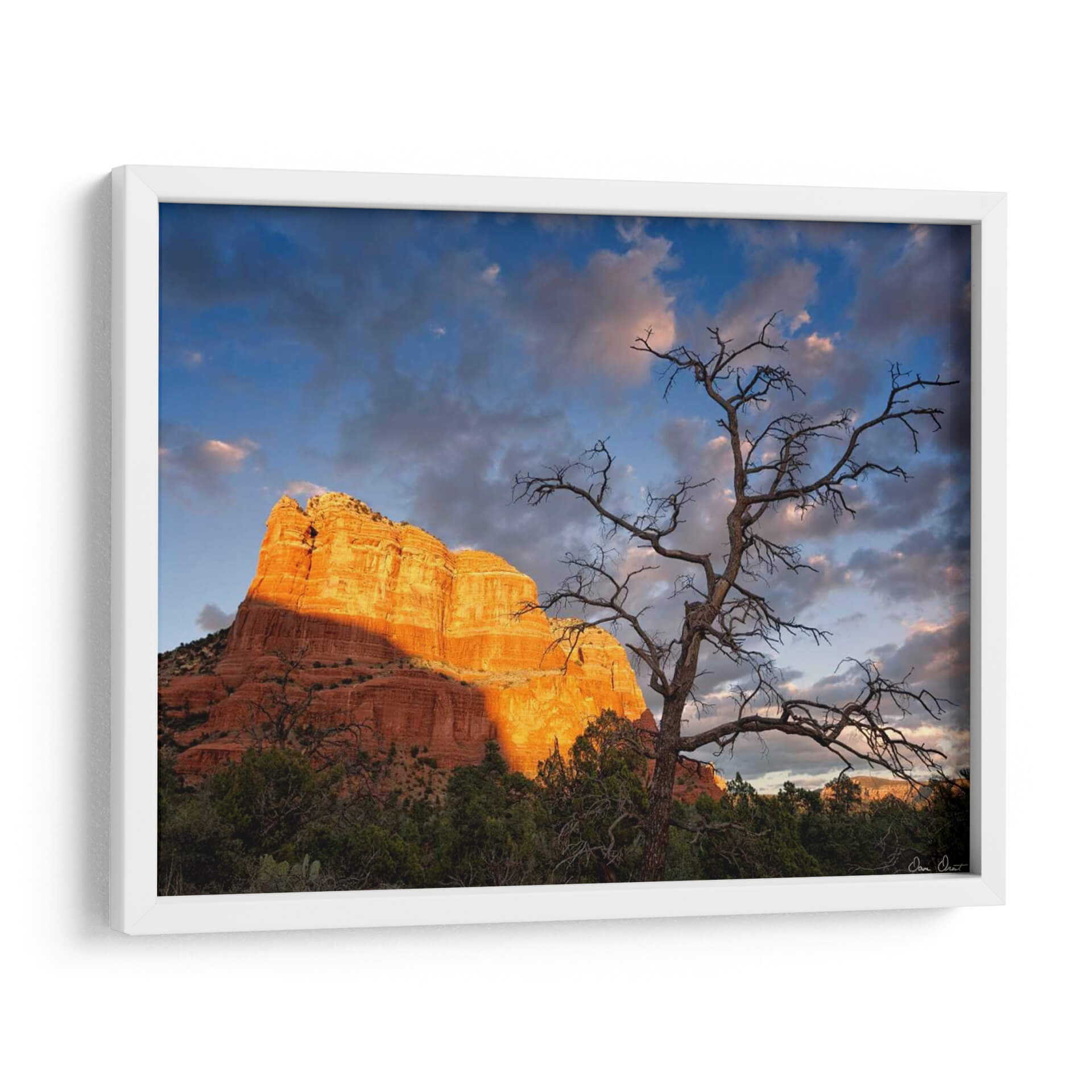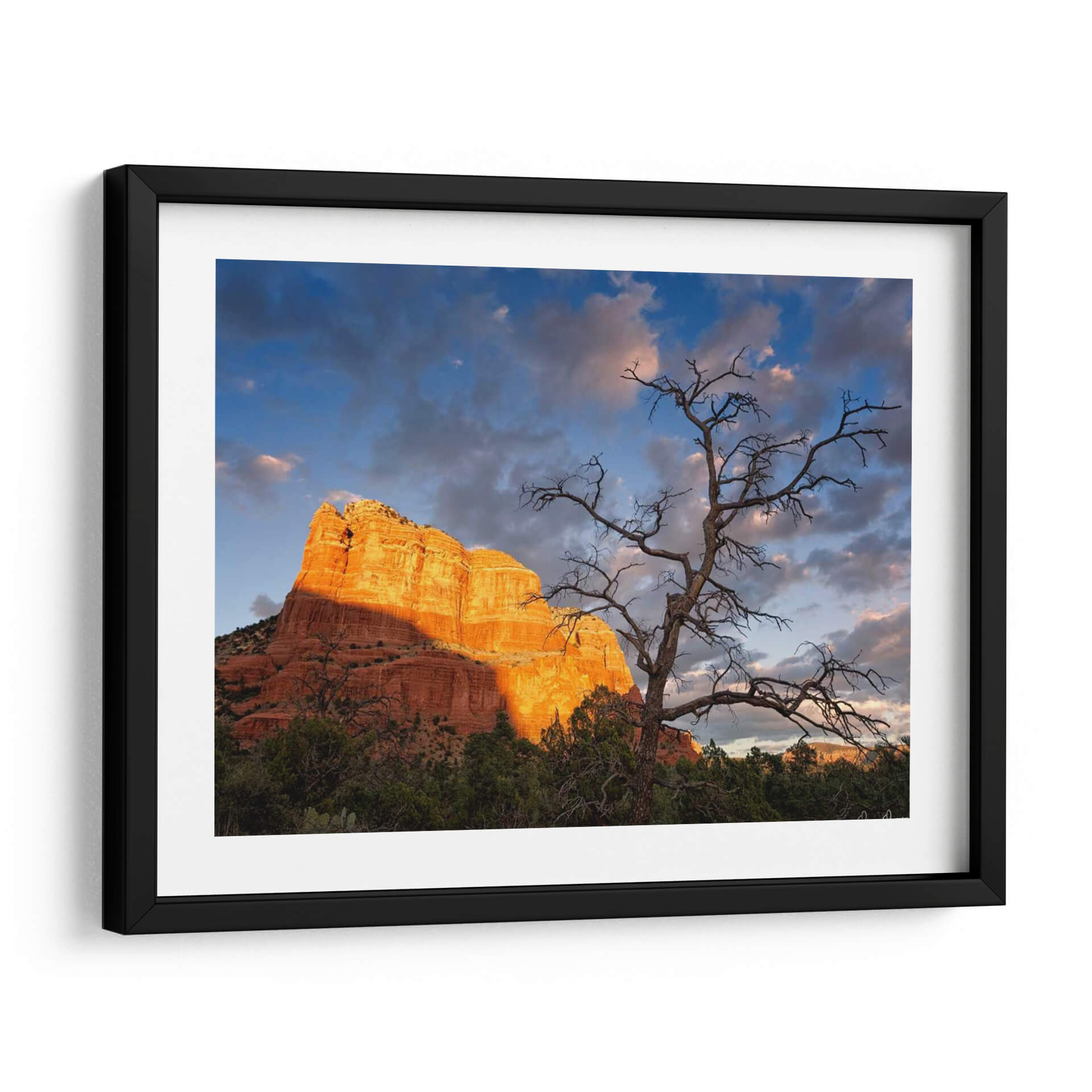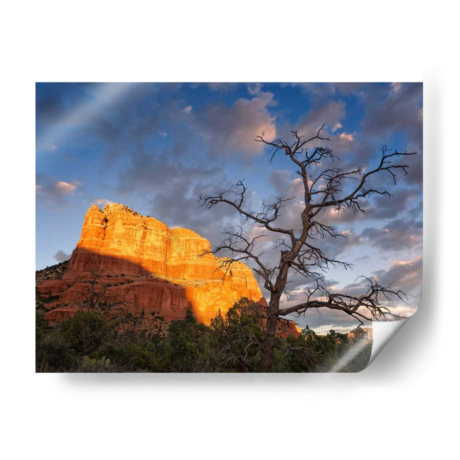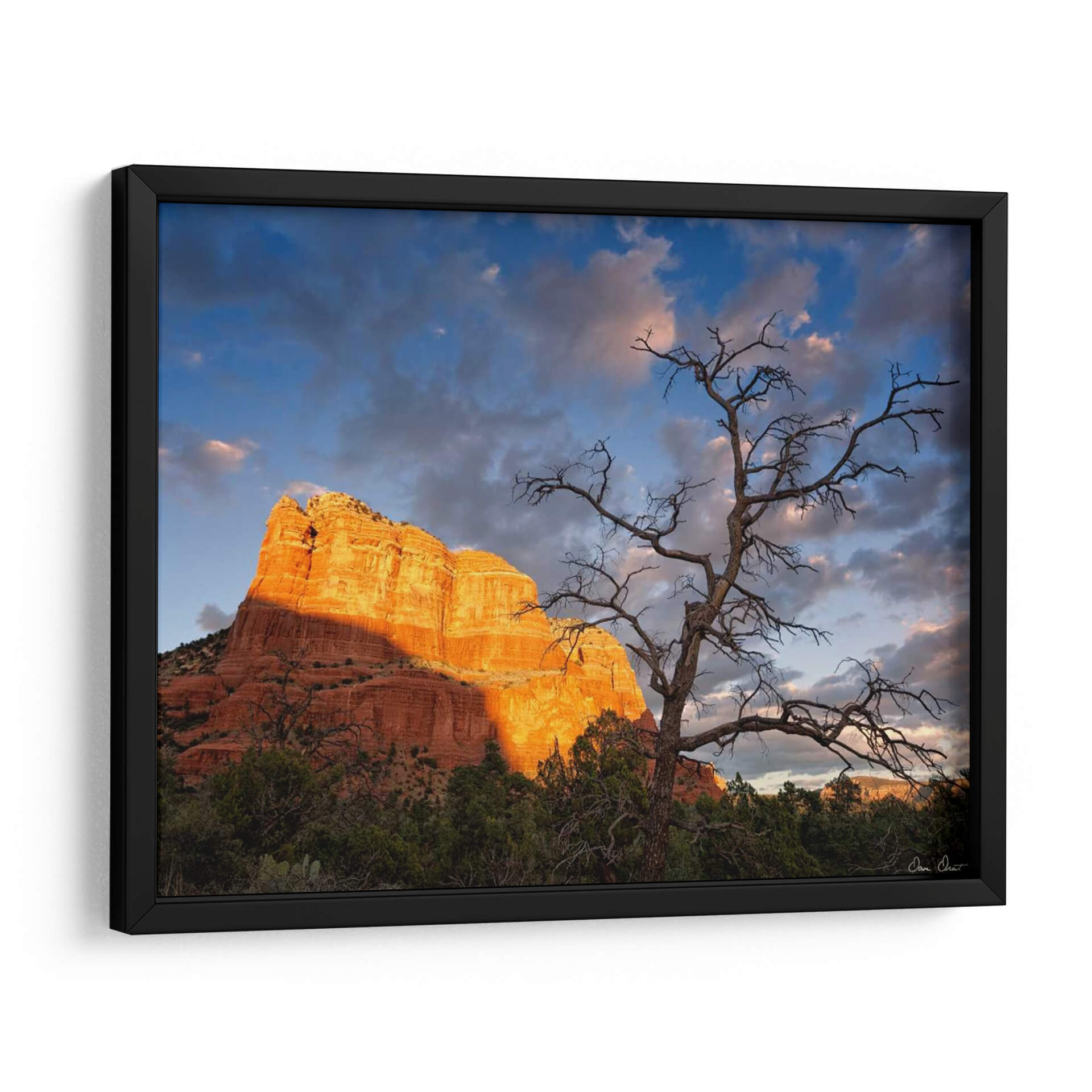 Sumérgete en la majestuosidad del desierto con "Puesta De Sol En El Desierto II", una obra maestra fotográfica de David Drost que captura la esencia cruda y la belleza atemporal de un paisaje árido bañado por la luz dorada del atardecer. La imponente formación rocosa, bañada en tonos anaranjados y rojizos intensos, contrasta dramáticamente con las sombras profundas que se alargan, creando una atmósfera de misterio y poder natural. En primer plano, un árbol seco y retorcido se alza como un centinela silencioso, sus ramas desnudas dibujando patrones intrincados contra un cielo de un azul vibrante, salpicado de nubes que reflejan los últimos rayos del sol en tonos rosados y violetas. La composición, con su profundidad y el juego de luces y sombras, invita a la contemplación, evocando una sensación de paz, soledad y la inmensidad de la naturaleza. Este cuadro decorativo es ideal para añadir un toque de serenidad y fuerza a tu sala de estar, estudio u oficina, transformando cualquier espacio en un santuario de inspiración natural y belleza salvaje. Su realismo fotográfico y la paleta de colores cálidos lo convierten en una pieza versátil que complementa tanto decoraciones rústicas como contemporáneas, añadiendo un punto focal cautivador y un recordatorio constante de la resistencia y la belleza efímera del mundo natural.