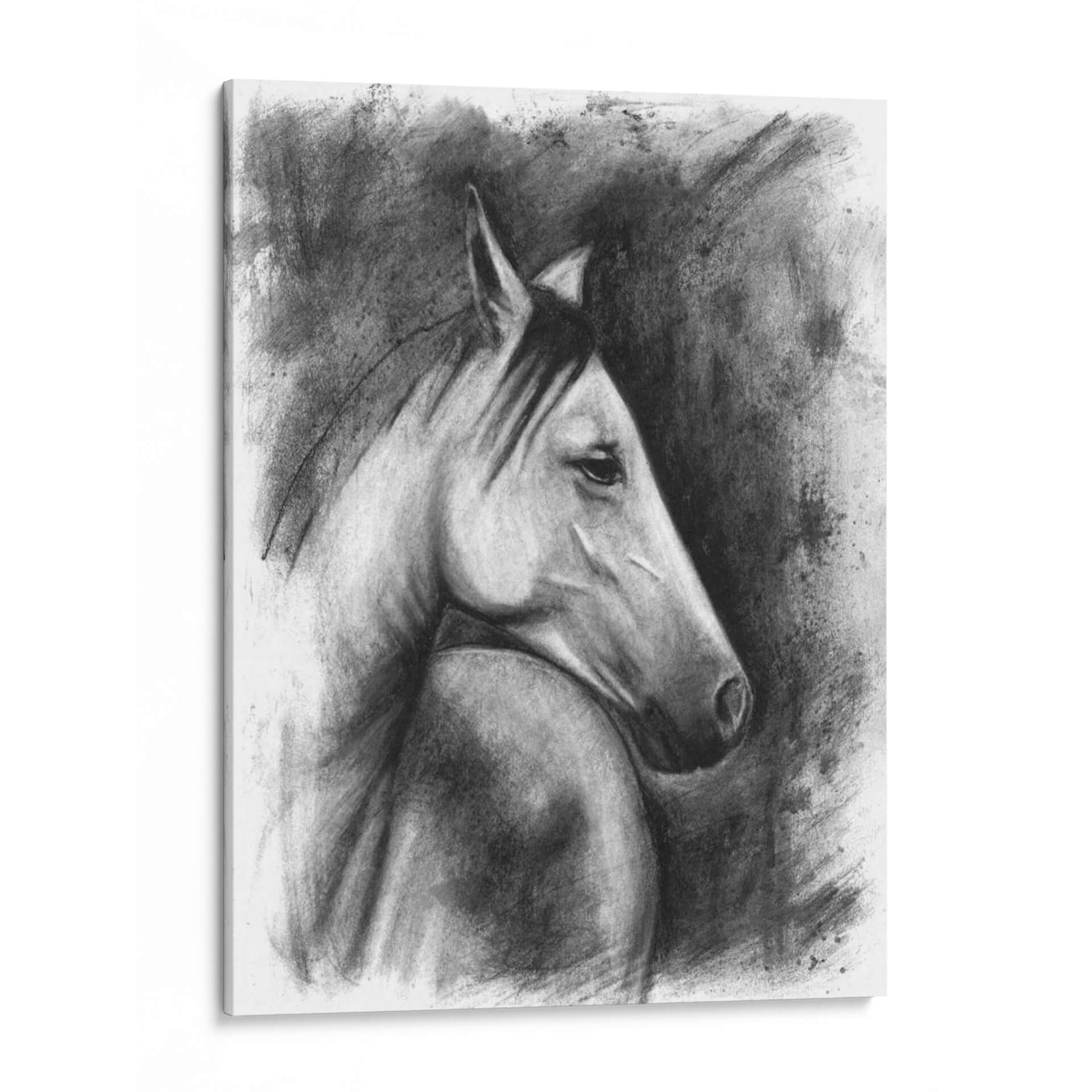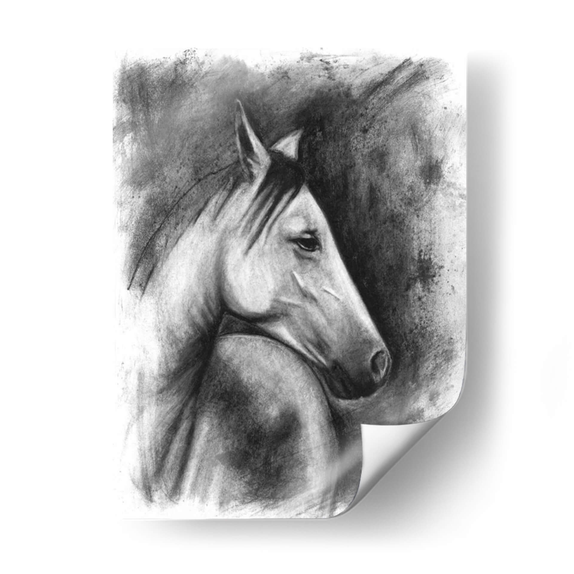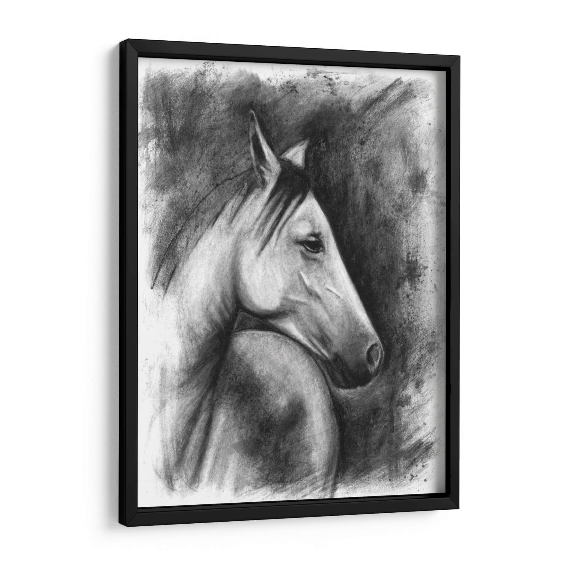 Captura la majestuosidad y el espíritu indomable de la naturaleza con este evocador cuadro decorativo de un retrato ecuestre. La obra, creada con una técnica magistral de carboncillo por Naomi McCavitt, presenta un caballo en un perfil sereno pero poderoso, destacando la fuerza y la elegancia de este noble animal. La paleta de colores en escala de grises y negros crea una atmósfera de profundidad y dramatismo, mientras que el uso del carboncillo aporta una textura rica y expresiva. Las pinceladas sueltas y los trazos audaces del fondo contrastan con la delicadeza de los detalles en el rostro del caballo, generando un juego de luces y sombras que cautiva la mirada. Este cuadro es ideal para añadir un toque de sofisticación y carácter a cualquier espacio, ya sea una sala de estar moderna, un estudio clásico o una oficina ejecutiva. Su estilo atemporal y su tema universal lo convierten en una pieza decorativa versátil y llena de personalidad, perfecta para los amantes de los animales y del arte con alma. Transforma tu pared en una galería de arte personal con esta impactante obra.