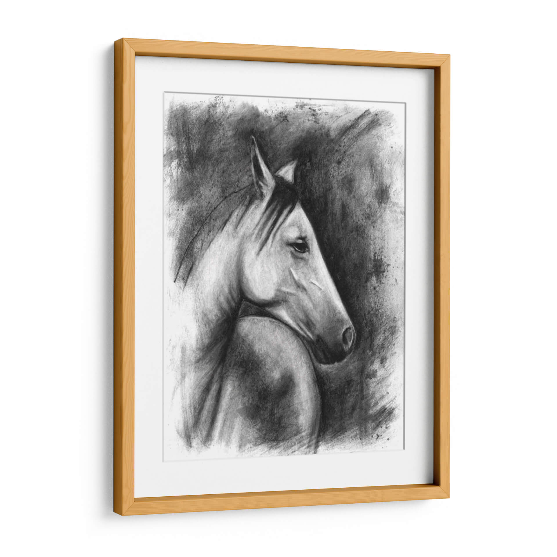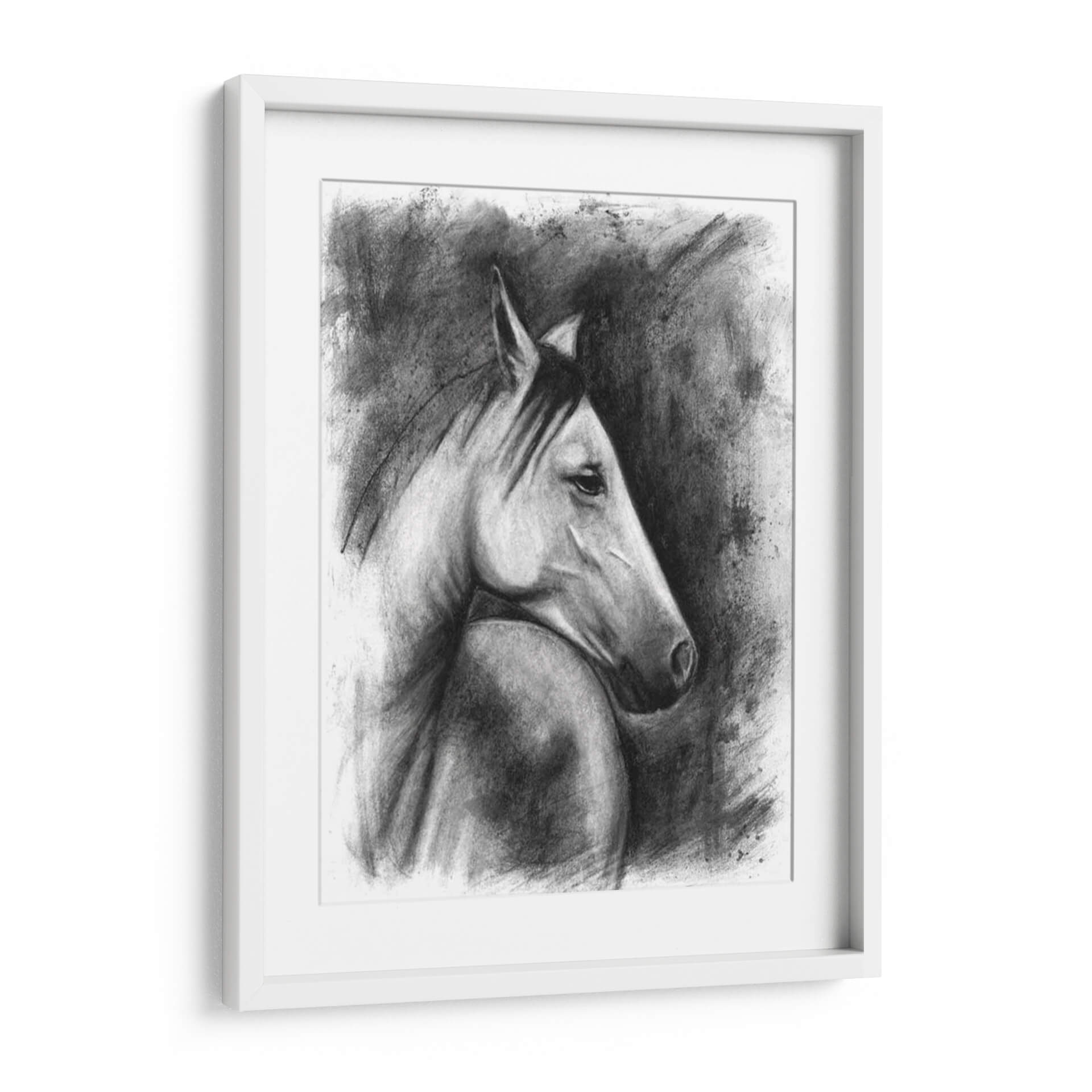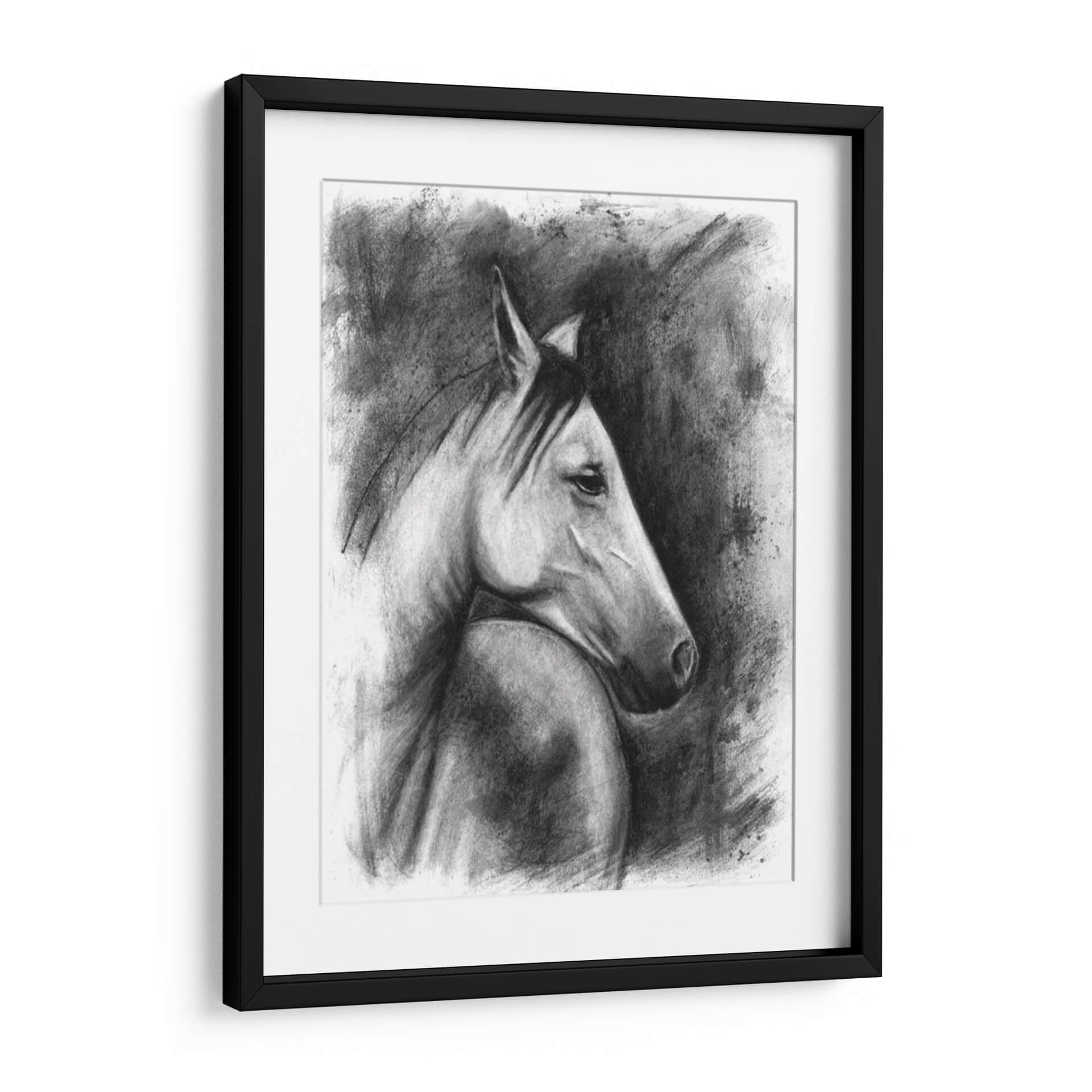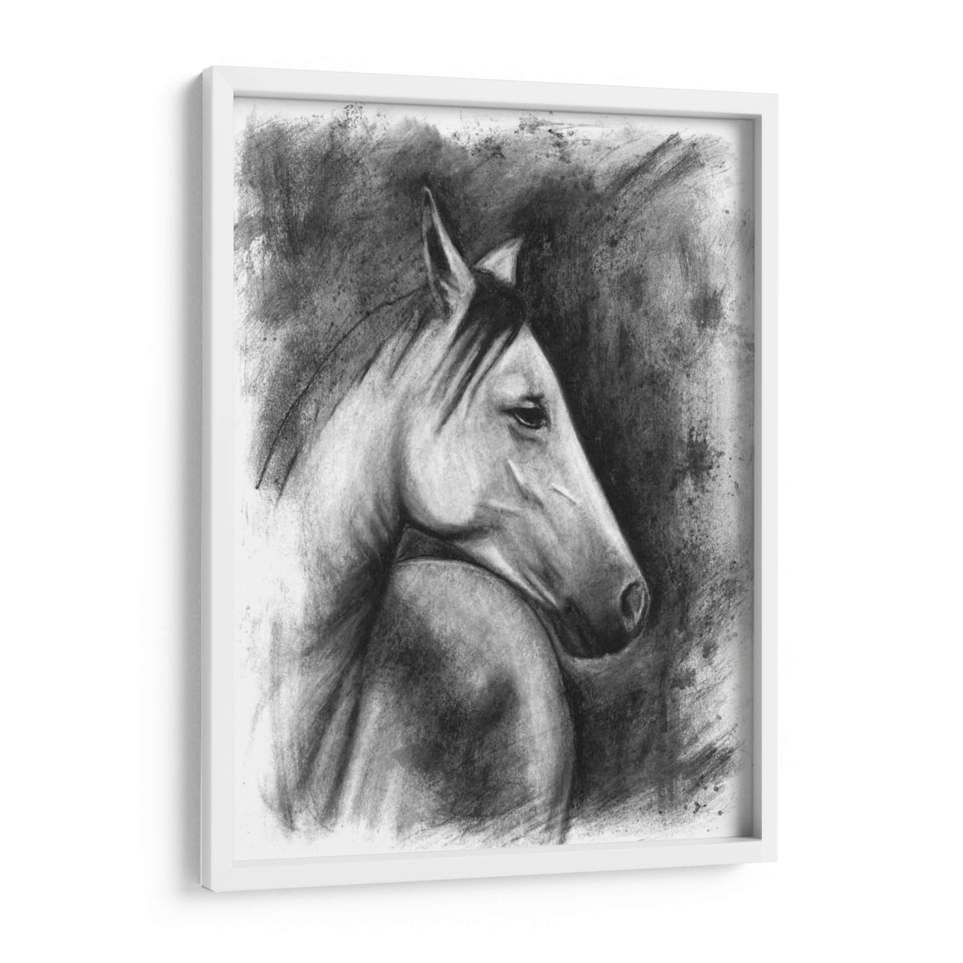 Captura la majestuosidad y el espíritu indomable de la naturaleza con este evocador cuadro decorativo de un retrato ecuestre. La obra, creada con una técnica magistral de carboncillo por Naomi McCavitt, presenta un caballo en un perfil sereno pero poderoso, destacando la fuerza y la elegancia de este noble animal. La paleta de colores en escala de grises y negros crea una atmósfera de profundidad y dramatismo, mientras que el uso del carboncillo aporta una textura rica y expresiva. Las pinceladas sueltas y los trazos audaces del fondo contrastan con la delicadeza de los detalles en el rostro del caballo, generando un juego de luces y sombras que cautiva la mirada. Este cuadro es ideal para añadir un toque de sofisticación y carácter a cualquier espacio, ya sea una sala de estar moderna, un estudio clásico o una oficina ejecutiva. Su estilo atemporal y su tema universal lo convierten en una pieza decorativa versátil y llena de personalidad, perfecta para los amantes de los animales y del arte con alma. Transforma tu pared en una galería de arte personal con esta impactante obra.