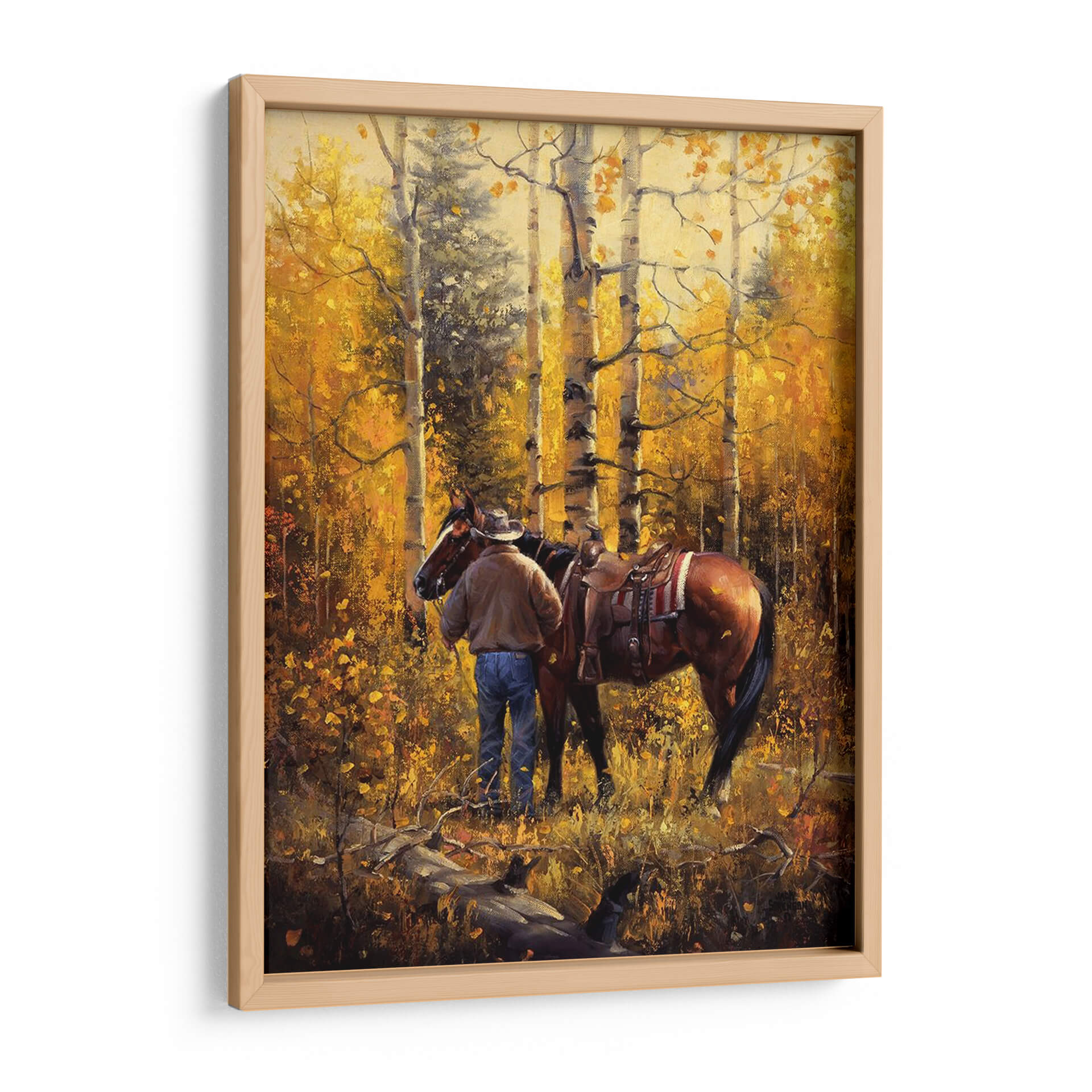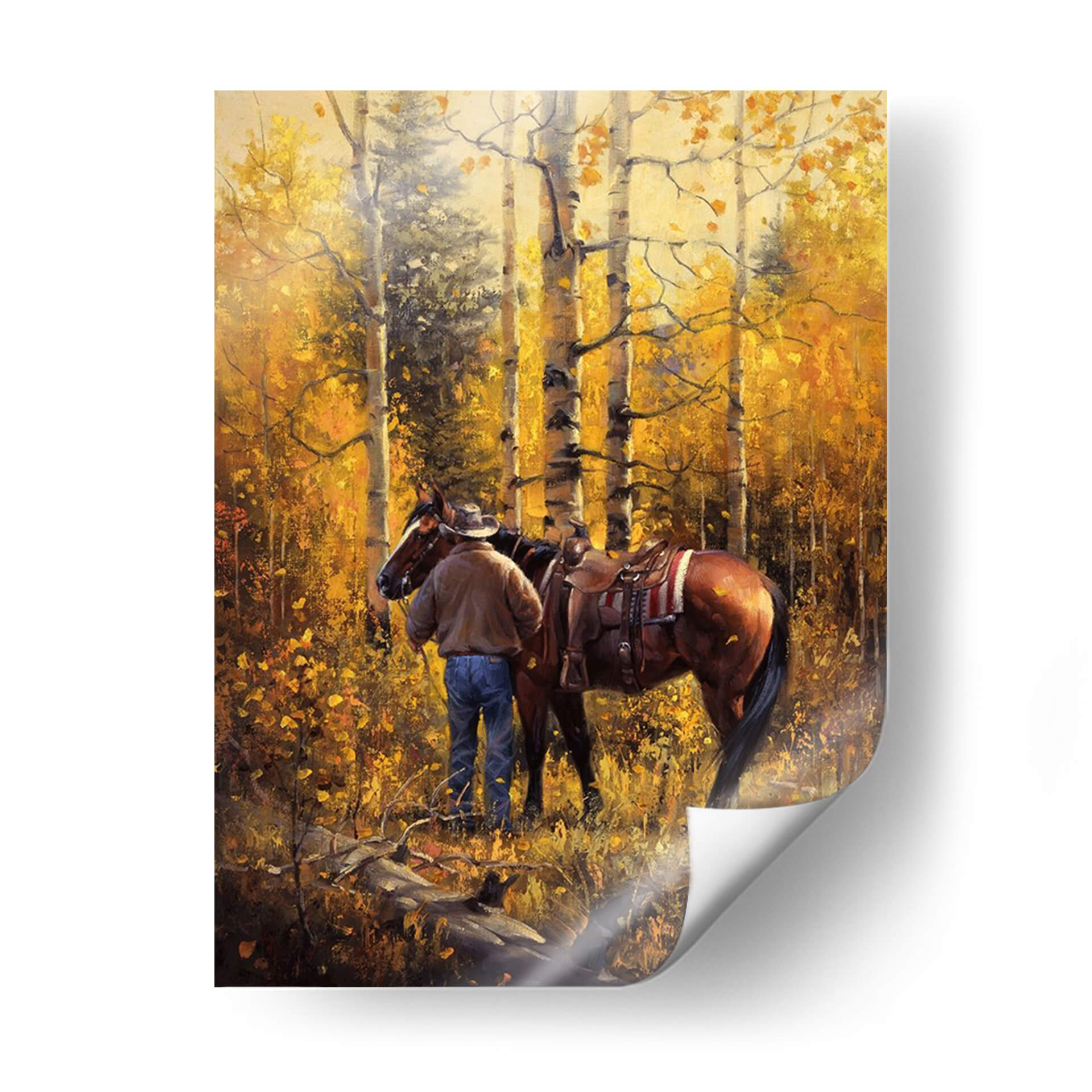 Sumérgete en la calidez y la nostalgia de "Sangre De Cristo Gold", una obra maestra del artista Jack Sorenson. Este cuadro decorativo captura un momento íntimo entre un jinete y su caballo en medio de un vibrante bosque otoñal. La luz dorada del sol se filtra a través de las hojas de álamo, bañando la escena en tonos ocres, dorados y anaranjados, creando una atmósfera de profunda serenidad y conexión con la naturaleza. La detallada representación del caballo, con su equipo listo para la aventura, y la figura del vaquero, de espaldas al espectador, invitan a la contemplación y a la reflexión sobre la vida rural y la libertad. El estilo realista y la rica paleta de colores hacen de esta pieza un elemento decorativo ideal para salones, estudios o cualquier espacio que busque una dosis de carácter y encanto rústico. Añade esta impresionante obra a tu colección y transforma tu hogar en un refugio de tranquilidad y belleza natural. Es una pieza que evoca historias de senderos olvidados y la majestuosidad del otoño.