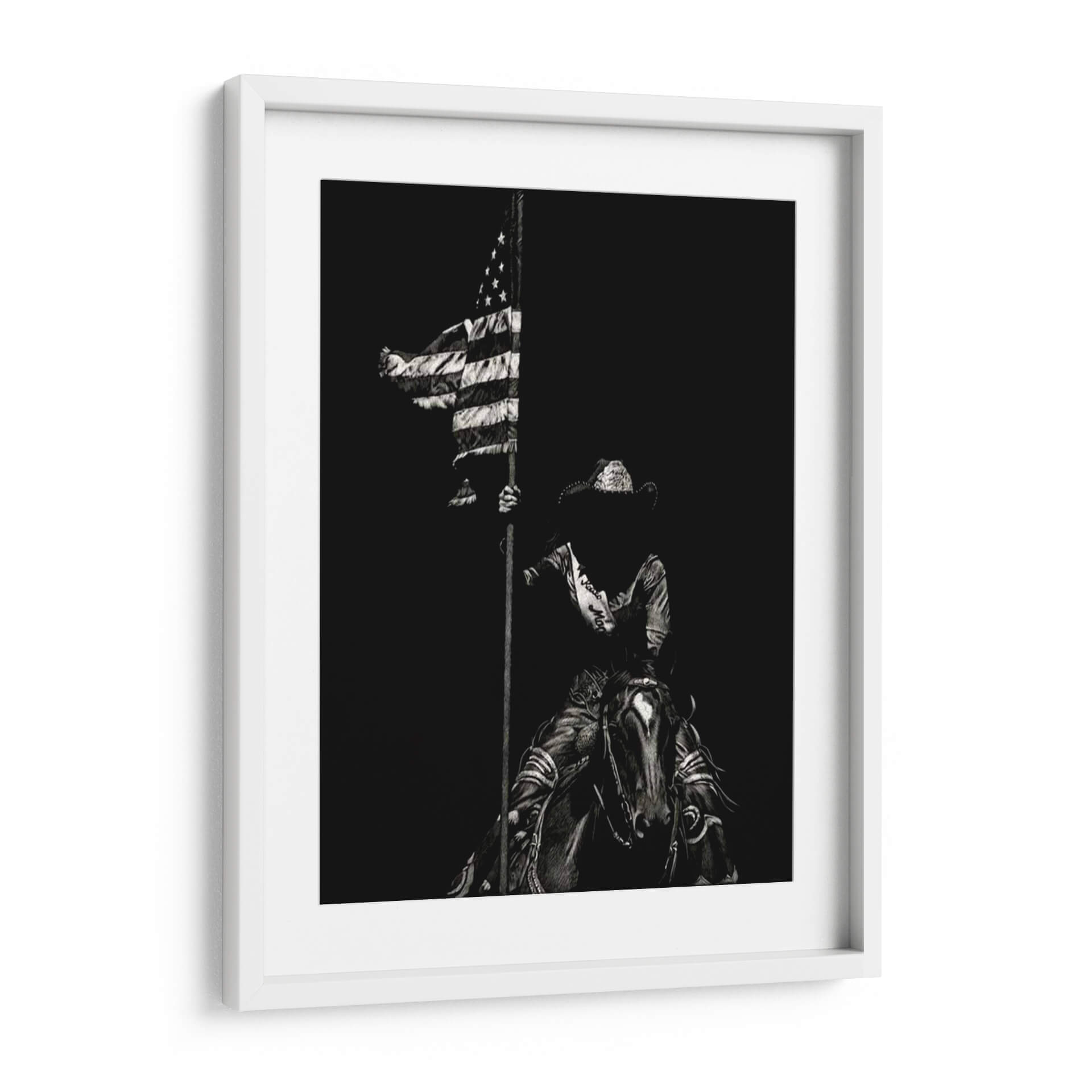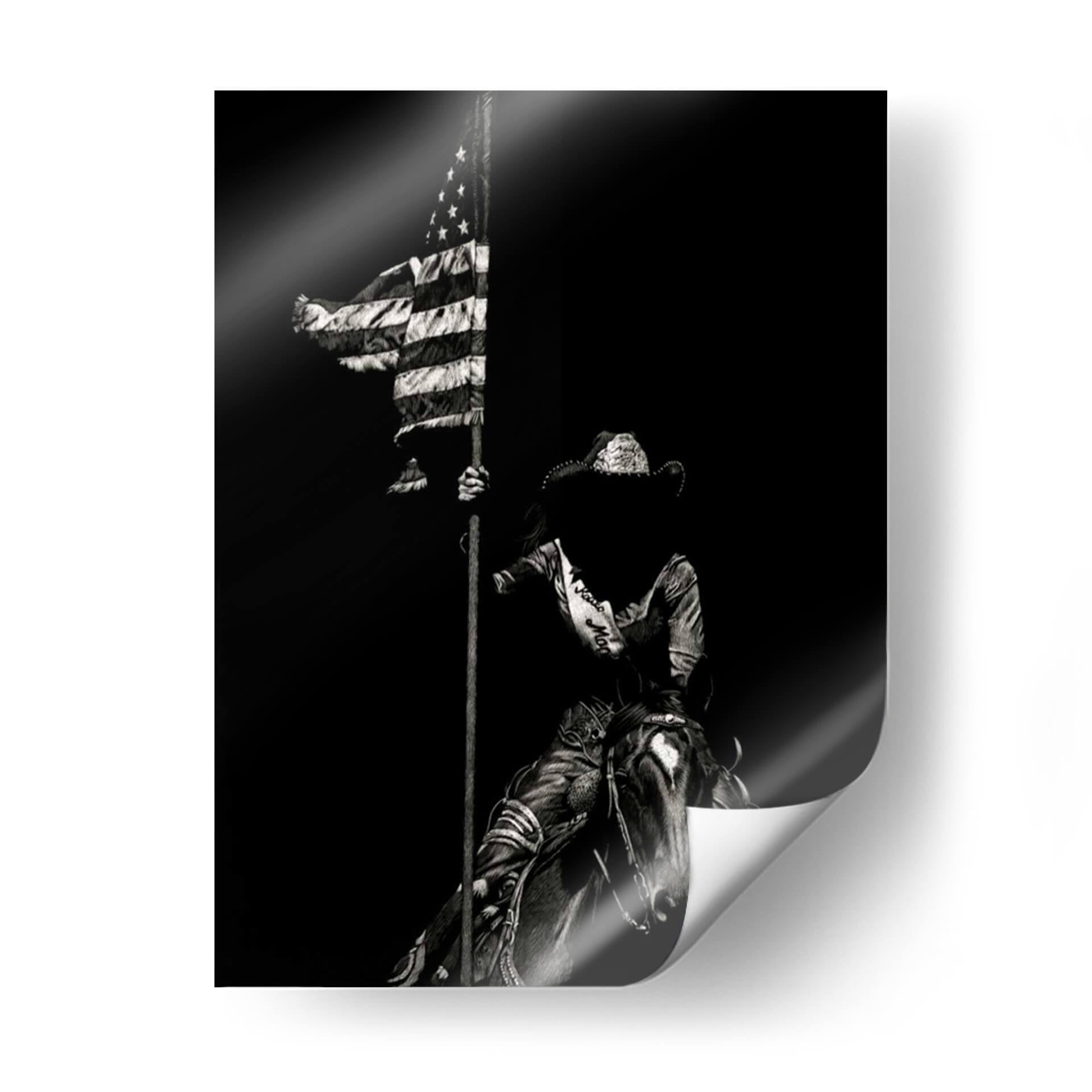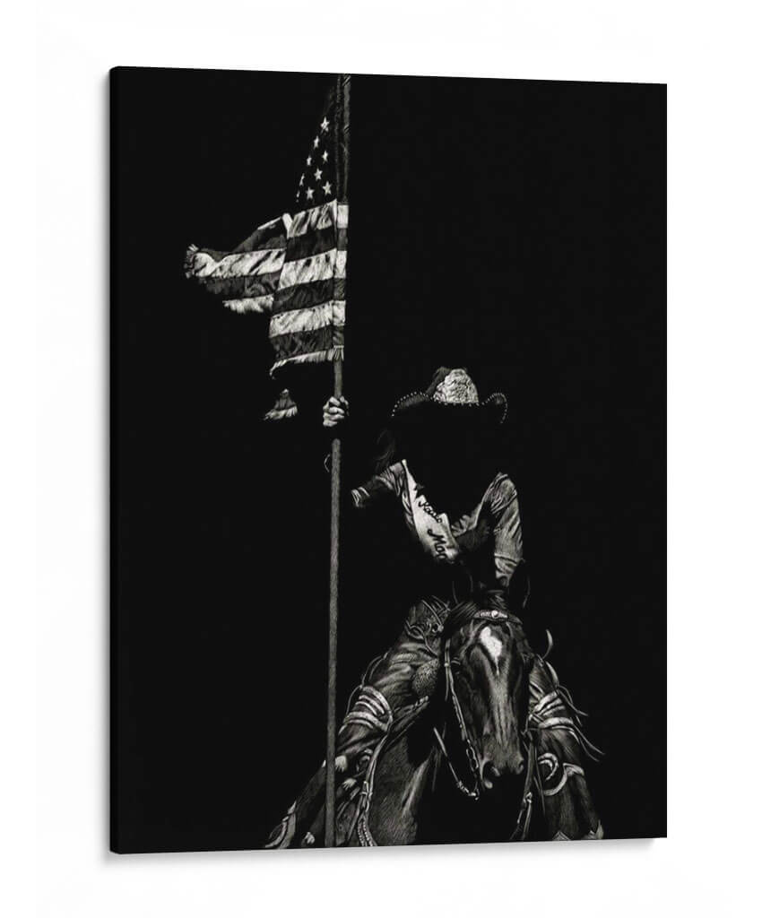Sumérgete en la fuerza y el espíritu indomable del oeste americano con "Scratchboard Rodeo Vi", una obra maestra de Julie T. Chapman. Este cuadro decorativo captura un momento icónico y poderoso: una figura ecuestre, envuelta en la atmósfera dramática del rodeo, ondea la bandera estadounidense con orgullo. La técnica de "scratchboard" o raspa, utilizada por la artista, dota a la pieza de una textura única y un contraste impactante, resaltando cada detalle en tonos de negro y blanco, desde el rizado de la tela de la bandera hasta la expresión intensa del jinete y el caballo. La composición, centrada en esta figura icónica contra un fondo oscuro y profundo, evoca un sentimiento de valentía, patriotismo y la esencia de la tradición del rodeo. Es una pieza de arte que no solo embellece, sino que también cuenta una historia de coraje y herencia. Ideal para espacios que buscan un toque de carácter y una conexión con la cultura vaquera, como una sala de estar rústica, un estudio o incluso una oficina que aspire a inspirar fuerza y determinación. Añade este cuadro decorativo a tu colección para crear un punto focal inolvidable que celebre el espíritu americano.