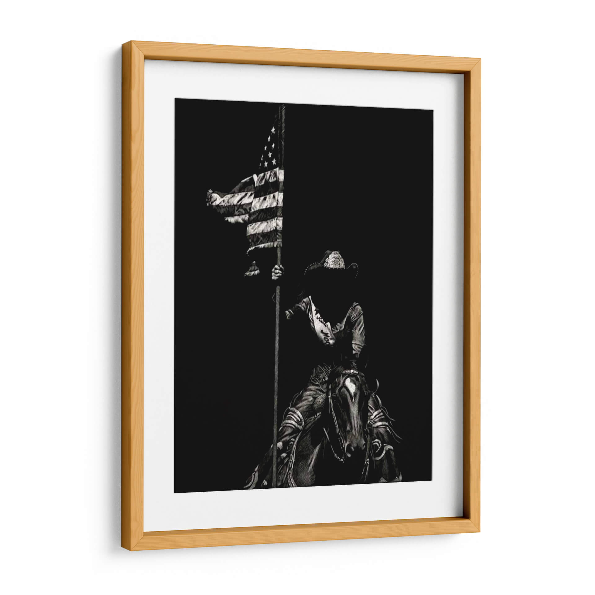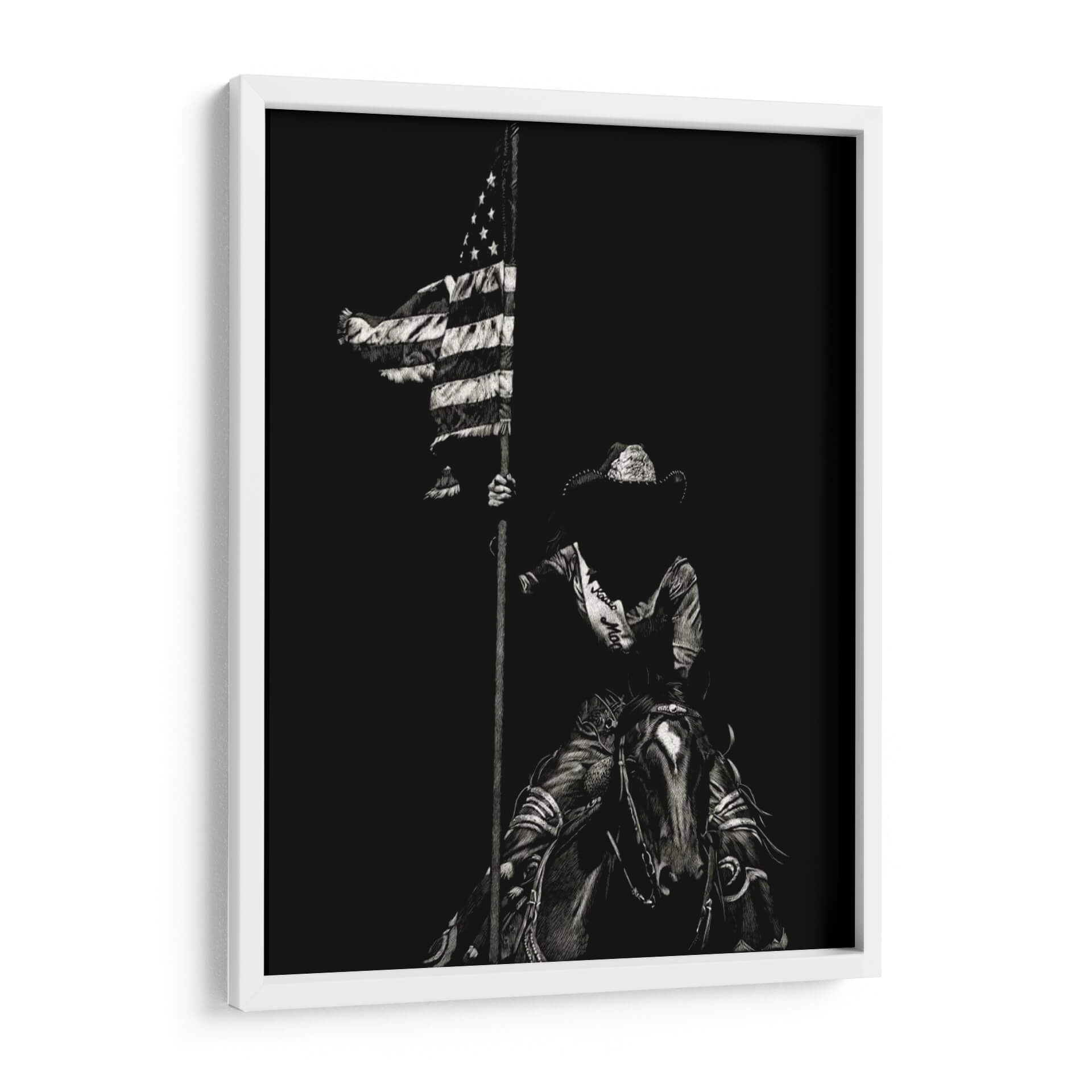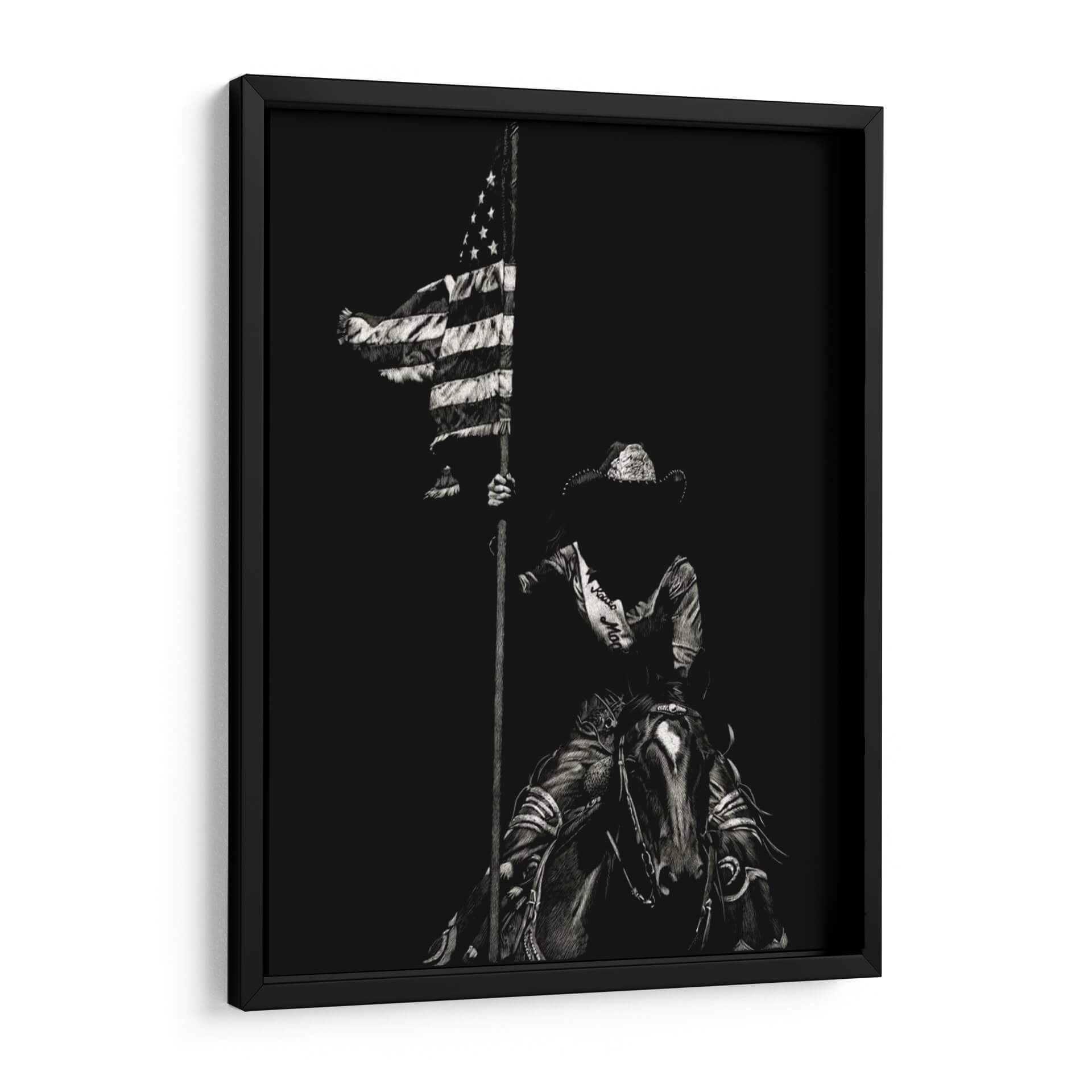 Sumérgete en la fuerza y el espíritu indomable del oeste americano con "Scratchboard Rodeo Vi", una obra maestra de Julie T. Chapman. Este cuadro decorativo captura un momento icónico y poderoso: una figura ecuestre, envuelta en la atmósfera dramática del rodeo, ondea la bandera estadounidense con orgullo. La técnica de "scratchboard" o raspa, utilizada por la artista, dota a la pieza de una textura única y un contraste impactante, resaltando cada detalle en tonos de negro y blanco, desde el rizado de la tela de la bandera hasta la expresión intensa del jinete y el caballo. La composición, centrada en esta figura icónica contra un fondo oscuro y profundo, evoca un sentimiento de valentía, patriotismo y la esencia de la tradición del rodeo. Es una pieza de arte que no solo embellece, sino que también cuenta una historia de coraje y herencia. Ideal para espacios que buscan un toque de carácter y una conexión con la cultura vaquera, como una sala de estar rústica, un estudio o incluso una oficina que aspire a inspirar fuerza y determinación. Añade este cuadro decorativo a tu colección para crear un punto focal inolvidable que celebre el espíritu americano.