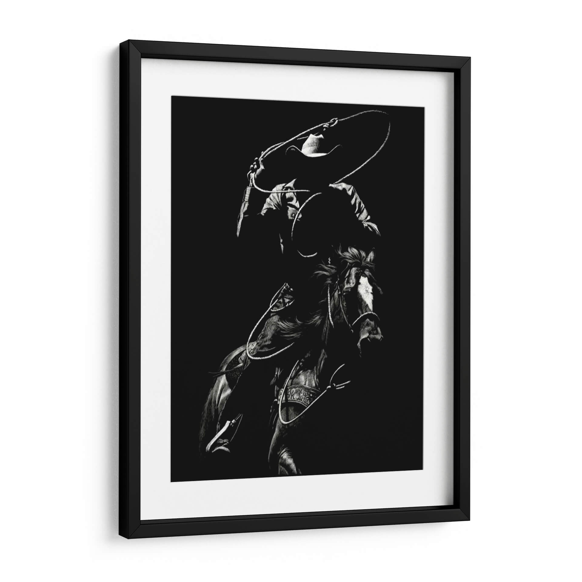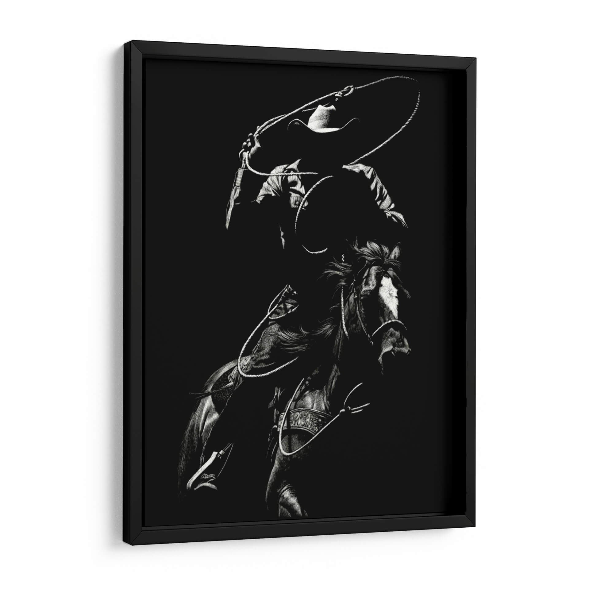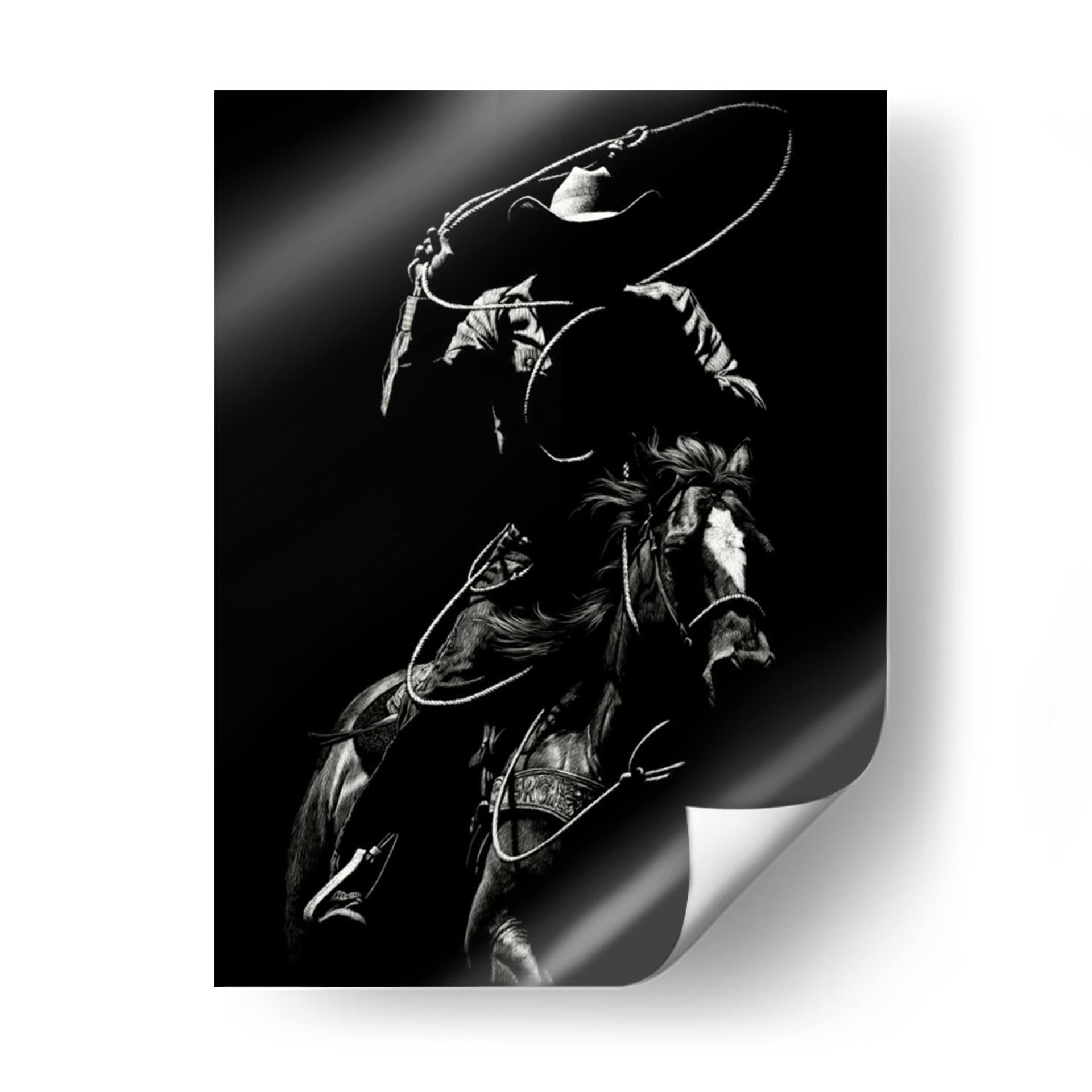 Captura la esencia dinámica y la intensidad del rodeo con "Scratchboard Rodeo Vii", una obra maestra de Julie T. Chapman. Este cuadro decorativo en blanco y negro presenta a un jinete en pleno movimiento, con la cuerda trazando un círculo en el aire, listo para la acción. La detallada representación del caballo y el vaquero, junto con el uso dramático de luces y sombras, crea una atmósfera de energía cruda y habilidad. La paleta monocromática resalta la textura y la forma, otorgando a la pieza una profundidad visual impactante. Es la adición perfecta para aquellos que aprecian la tradición del Oeste americano, la destreza ecuestre y el arte con carácter. Ideal para salones rústicos, estudios masculinos o cualquier espacio que busque un toque de audacia y emoción. Esta obra no es solo una imagen, es una narrativa visual que evoca la valentía, la velocidad y el espíritu indomable del rodeo. El contraste entre la oscuridad del fondo y las áreas iluminadas de la figura principal atrae la mirada, generando un punto focal cautivador. La habilidad de Chapman para capturar el movimiento y la tensión en un medio monocromático es excepcional, haciendo de este cuadro una pieza de conversación. Añade un toque de autenticidad y fuerza a tu decoración con "Scratchboard Rodeo Vii", una obra que celebra la pasión y la tradición del mundo ecuestre.