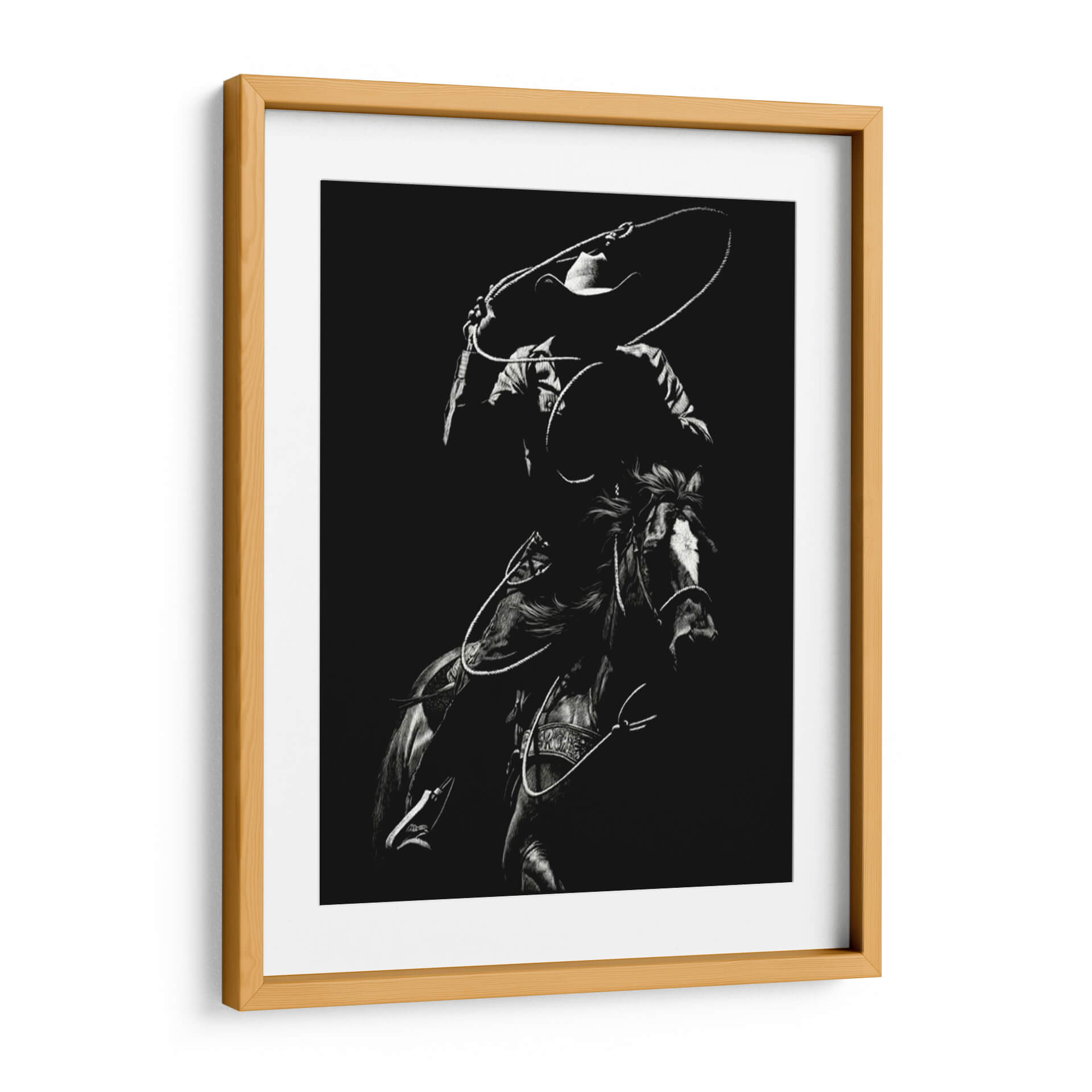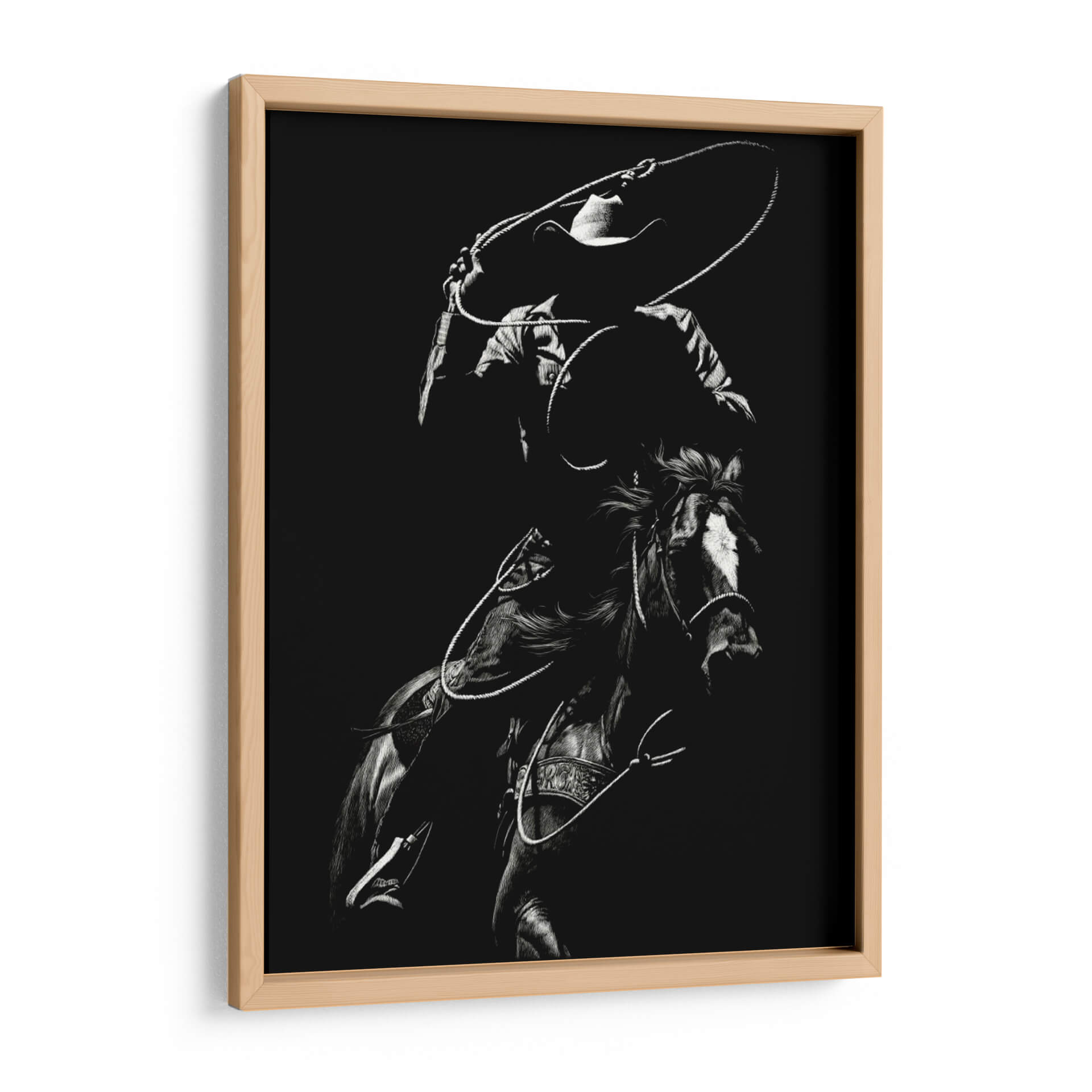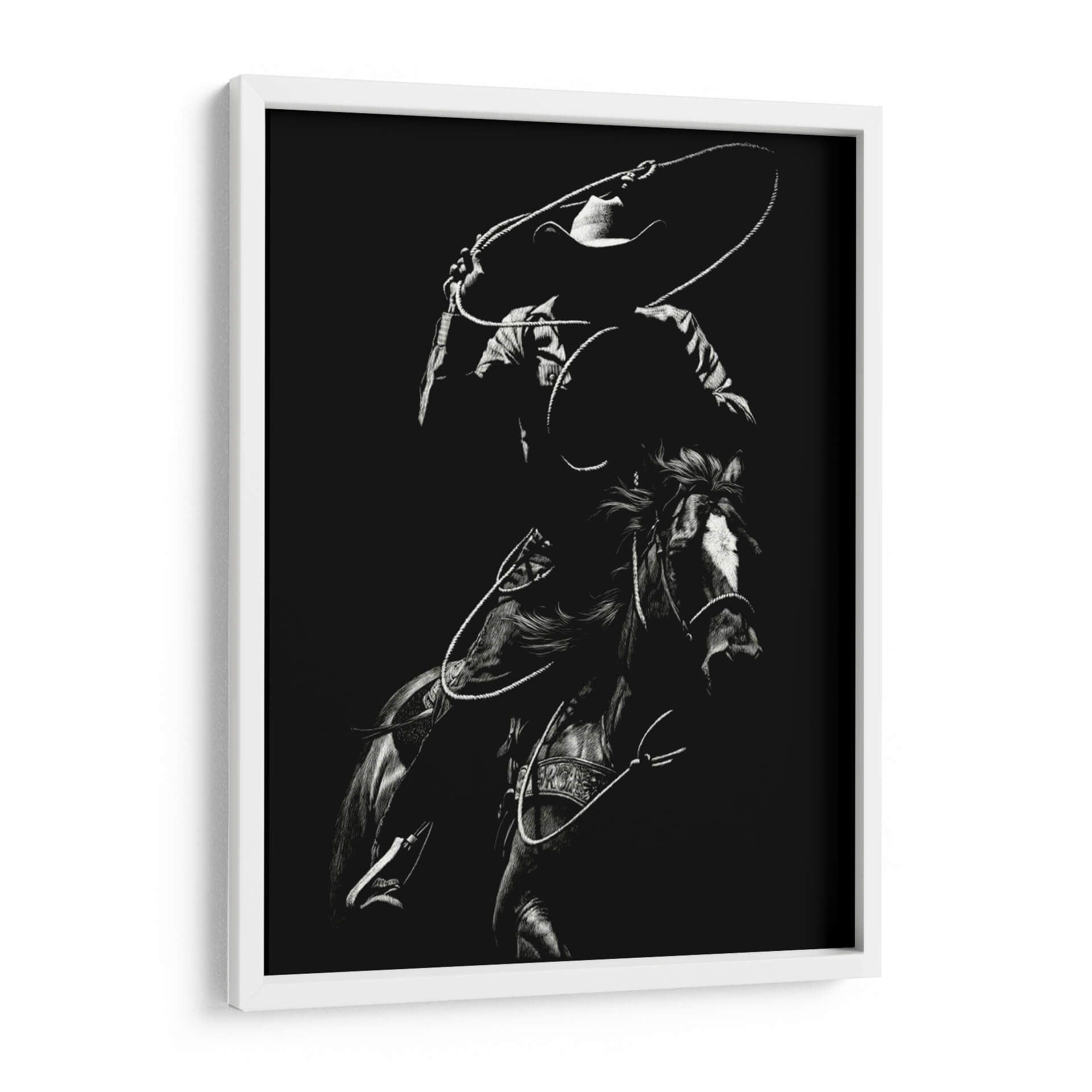 Captura la esencia dinámica y la intensidad del rodeo con "Scratchboard Rodeo Vii", una obra maestra de Julie T. Chapman. Este cuadro decorativo en blanco y negro presenta a un jinete en pleno movimiento, con la cuerda trazando un círculo en el aire, listo para la acción. La detallada representación del caballo y el vaquero, junto con el uso dramático de luces y sombras, crea una atmósfera de energía cruda y habilidad. La paleta monocromática resalta la textura y la forma, otorgando a la pieza una profundidad visual impactante. Es la adición perfecta para aquellos que aprecian la tradición del Oeste americano, la destreza ecuestre y el arte con carácter. Ideal para salones rústicos, estudios masculinos o cualquier espacio que busque un toque de audacia y emoción. Esta obra no es solo una imagen, es una narrativa visual que evoca la valentía, la velocidad y el espíritu indomable del rodeo. El contraste entre la oscuridad del fondo y las áreas iluminadas de la figura principal atrae la mirada, generando un punto focal cautivador. La habilidad de Chapman para capturar el movimiento y la tensión en un medio monocromático es excepcional, haciendo de este cuadro una pieza de conversación. Añade un toque de autenticidad y fuerza a tu decoración con "Scratchboard Rodeo Vii", una obra que celebra la pasión y la tradición del mundo ecuestre.