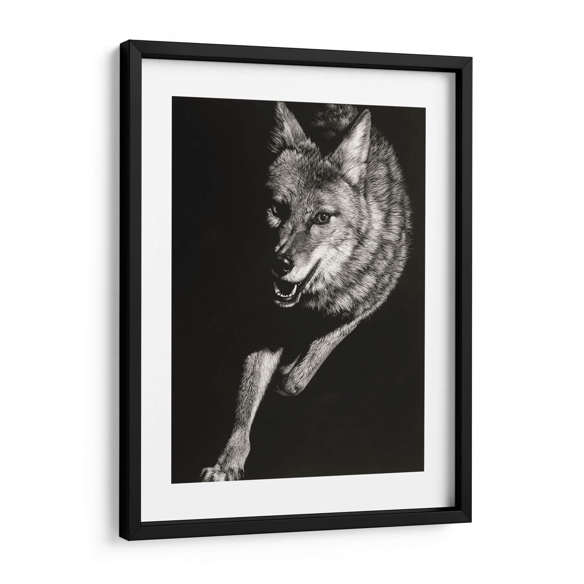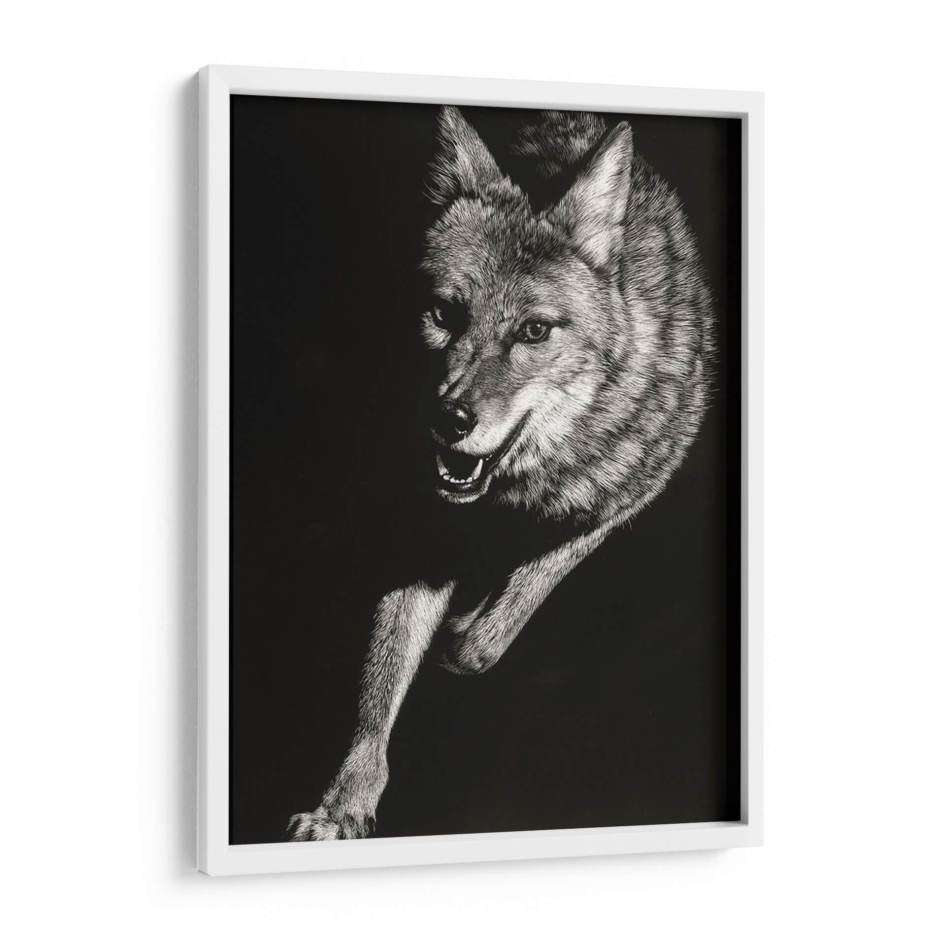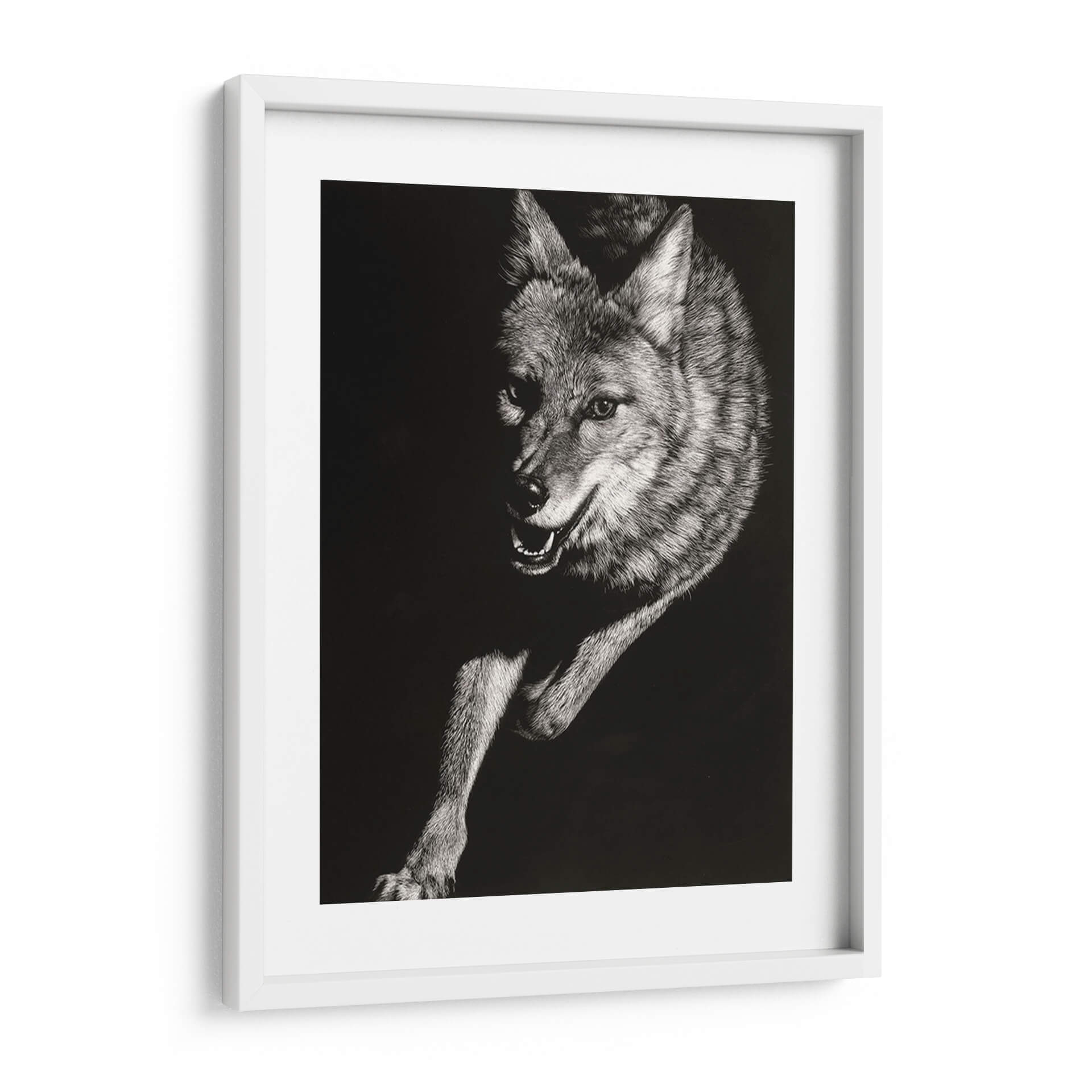 Sumérgete en la salvaje y cautivadora esencia de la naturaleza con el cuadro decorativo "Scratchboard Salvaje V" de Julie T. Chapman. Esta obra maestra, creada con una técnica detallada de "scratchboard", captura la intensidad y la fuerza de un coyote en movimiento. La paleta monocromática, con un profundo contraste entre luces y sombras, resalta la textura intrincada del pelaje y la expresividad penetrante de la mirada del animal. La composición dinámica, que enfoca la figura en un fondo oscuro y minimalista, atrae la atención hacia el sujeto, generando una sensación de energía contenida y misterio. Ideal para añadir un toque de audacia y carácter a tu salón, estudio u oficina, este cuadro decorativo se convierte en un punto focal que evoca la indómita belleza del mundo animal. Es una pieza que resuena con aquellos que aprecian la fauna salvaje y el arte con una fuerte presencia visual. Transforma tu espacio con esta representación impactante de la vida salvaje, que combina una ejecución técnica excepcional con una poderosa narrativa visual.