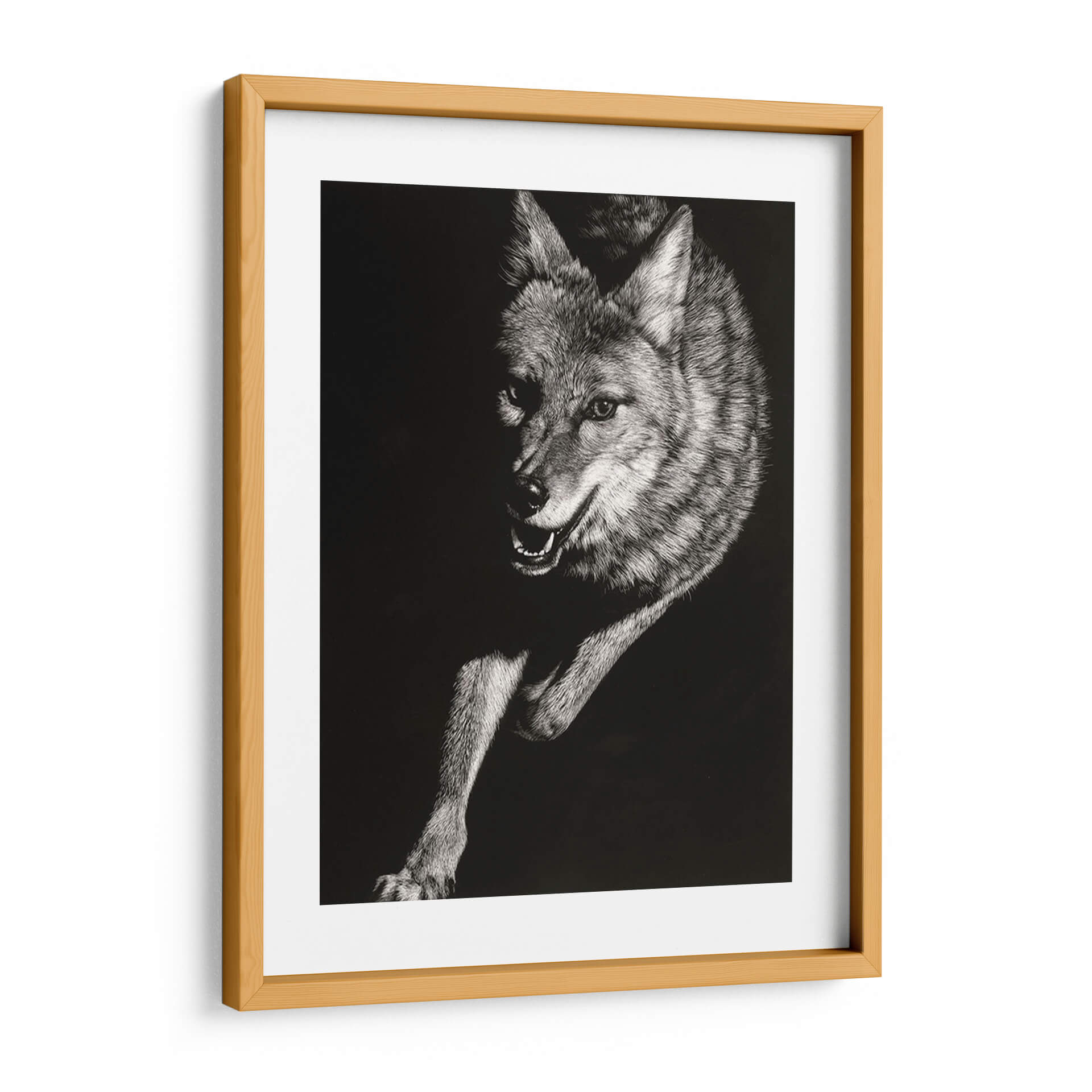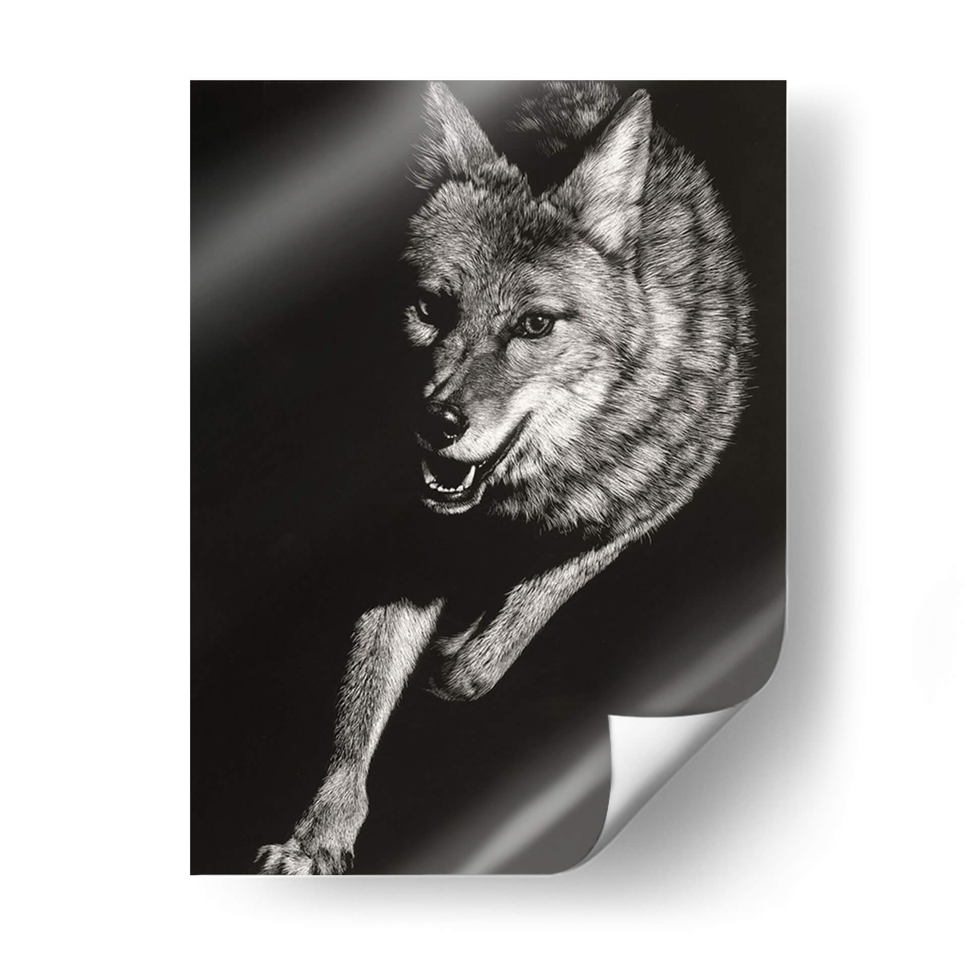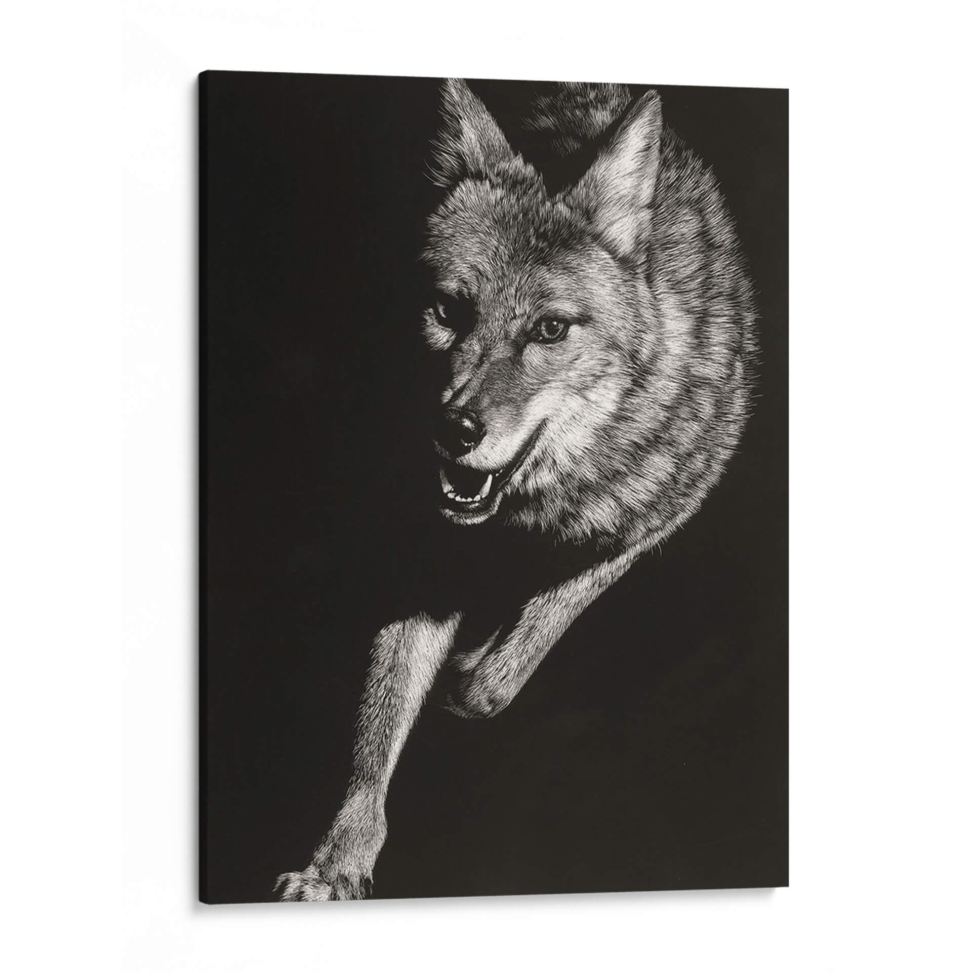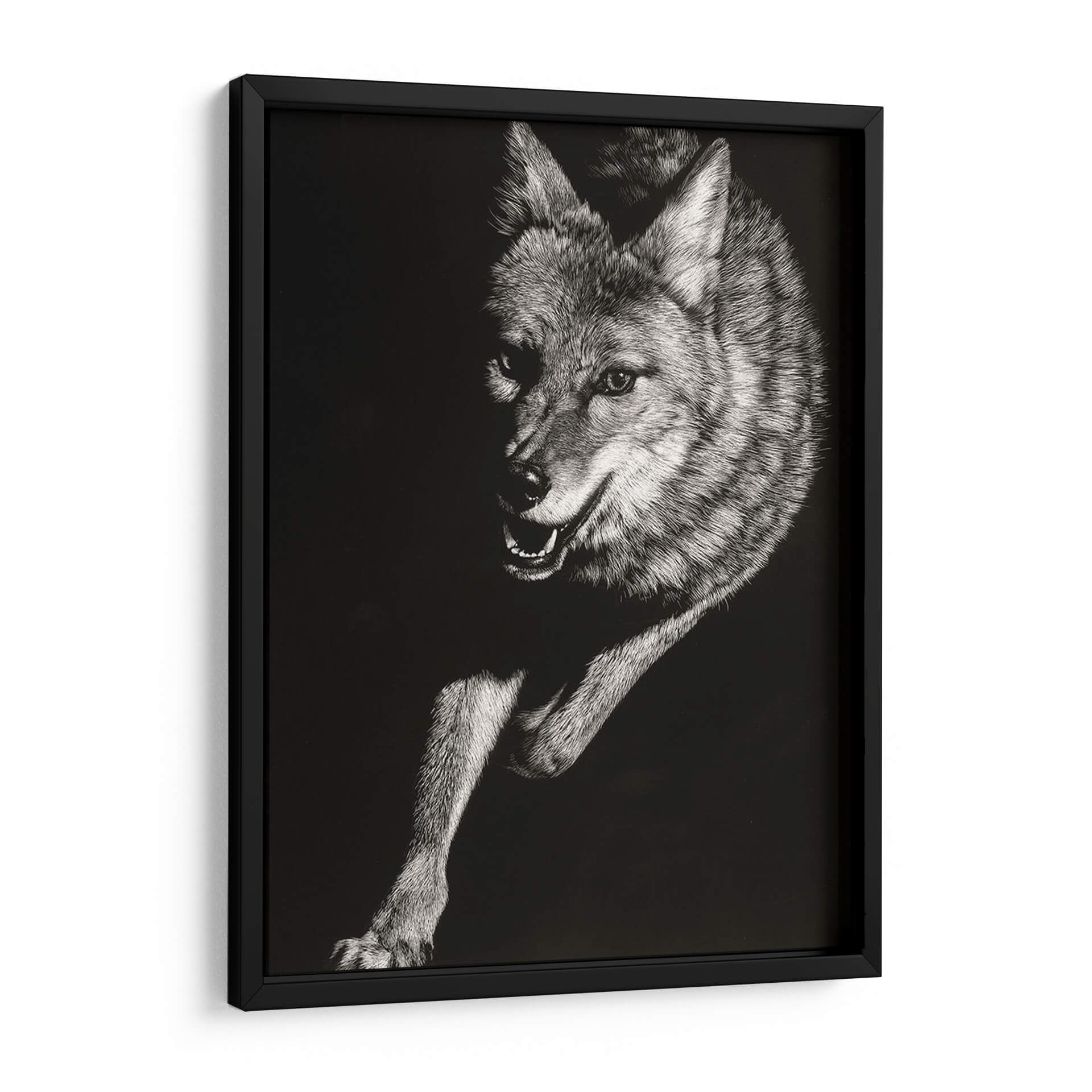 Sumérgete en la salvaje y cautivadora esencia de la naturaleza con el cuadro decorativo "Scratchboard Salvaje V" de Julie T. Chapman. Esta obra maestra, creada con una técnica detallada de "scratchboard", captura la intensidad y la fuerza de un coyote en movimiento. La paleta monocromática, con un profundo contraste entre luces y sombras, resalta la textura intrincada del pelaje y la expresividad penetrante de la mirada del animal. La composición dinámica, que enfoca la figura en un fondo oscuro y minimalista, atrae la atención hacia el sujeto, generando una sensación de energía contenida y misterio. Ideal para añadir un toque de audacia y carácter a tu salón, estudio u oficina, este cuadro decorativo se convierte en un punto focal que evoca la indómita belleza del mundo animal. Es una pieza que resuena con aquellos que aprecian la fauna salvaje y el arte con una fuerte presencia visual. Transforma tu espacio con esta representación impactante de la vida salvaje, que combina una ejecución técnica excepcional con una poderosa narrativa visual.