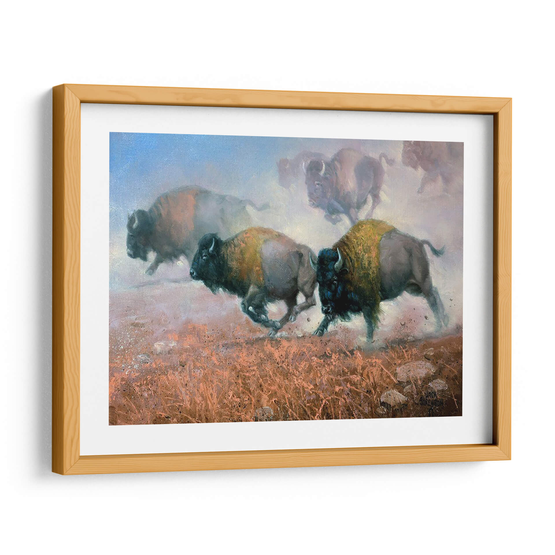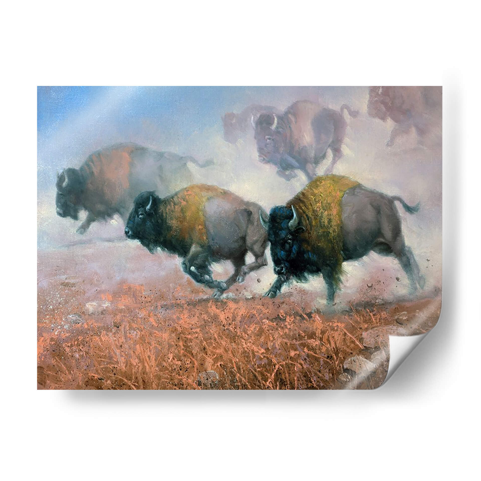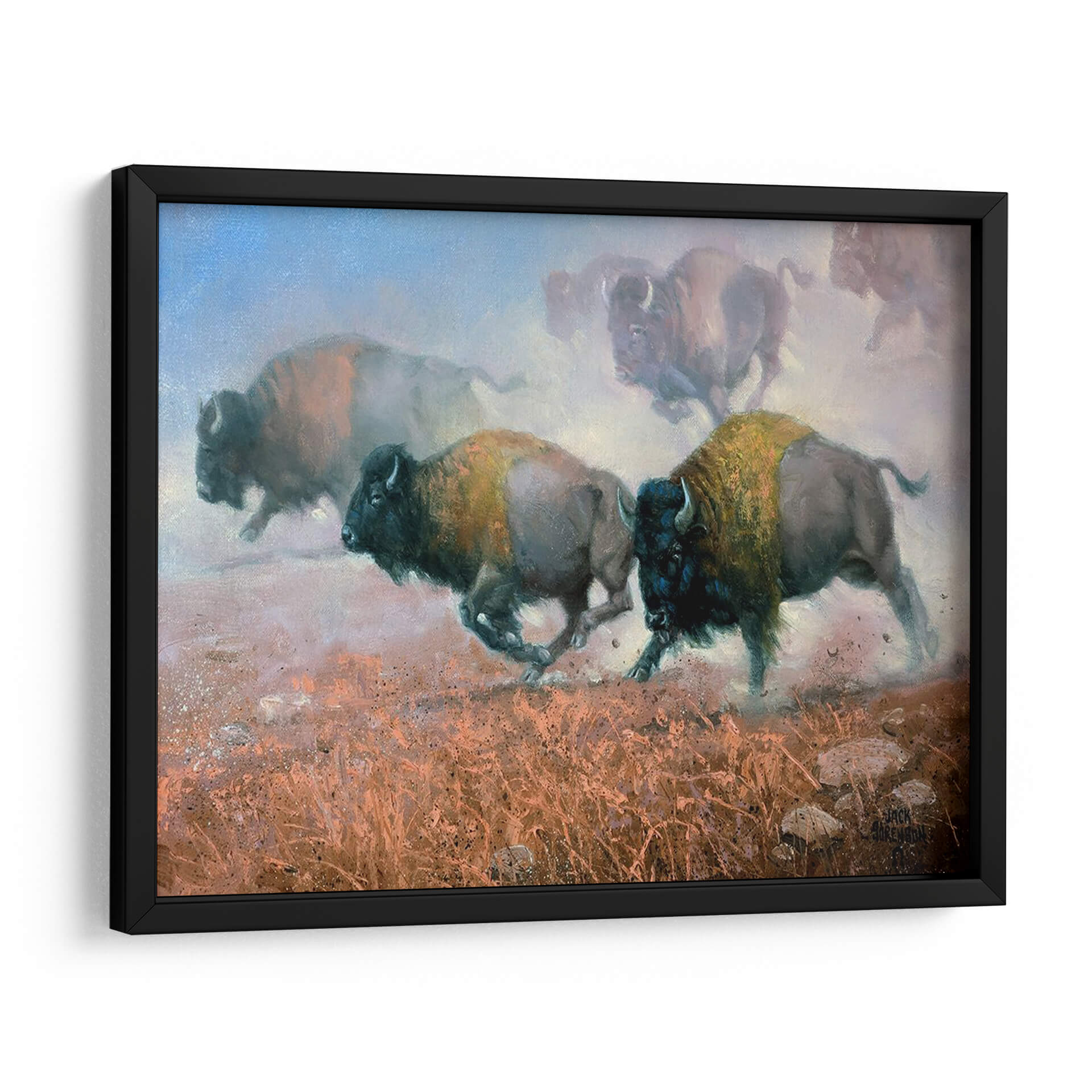 Capture la fuerza indómita de la naturaleza con "Trueno de Pradera", una obra de arte evocadora del talentoso Jack Sorenson. Esta pieza maestra traslada la energía cruda y el espíritu salvaje de una manada de bisontes en pleno galope a su espacio. La paleta de colores, dominada por tonos tierra cálidos y ocres vibrantes que reflejan la hierba seca y el polvo levantado, se complementa con sutiles toques de azul en el cielo que añaden profundidad y atmósfera. La composición dinámica guía la mirada a través de la estampida, transmitiendo una sensación de movimiento incesante y poder primigenio. El estilo pictórico, con pinceladas expresivas, añade textura y vida a las figuras imponentes de los bisontes, logrando un equilibrio entre el realismo y la interpretación artística. Este cuadro decorativo es ideal para infundir carácter y vitalidad a salones, estudios o cualquier espacio que se beneficie de una conexión con la majestuosidad del mundo natural. "Trueno de Pradera" no es solo una decoración, sino una declaración de la fuerza y la belleza del oeste americano, perfecta para coleccionistas y amantes del arte que buscan piezas con alma y narrativa.
