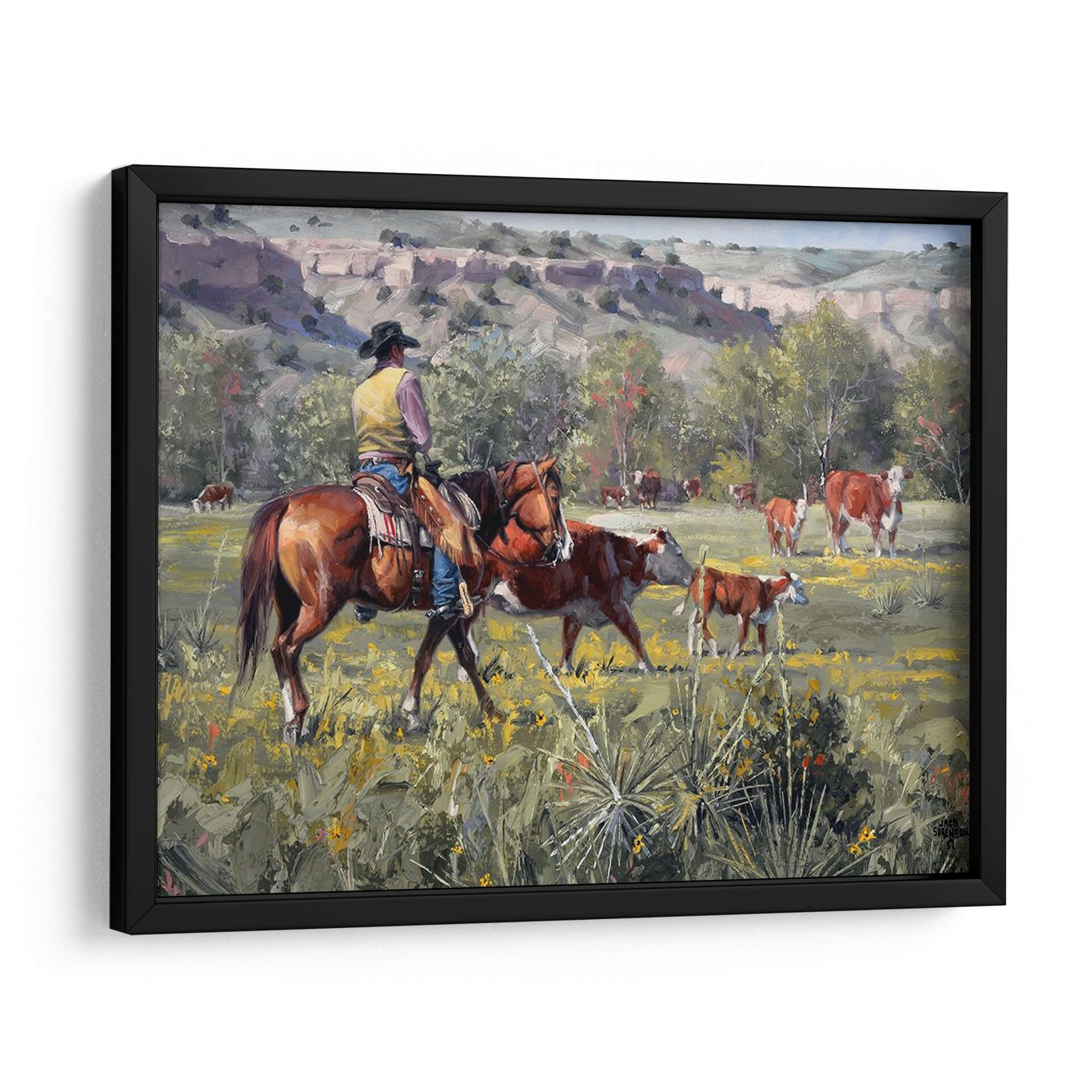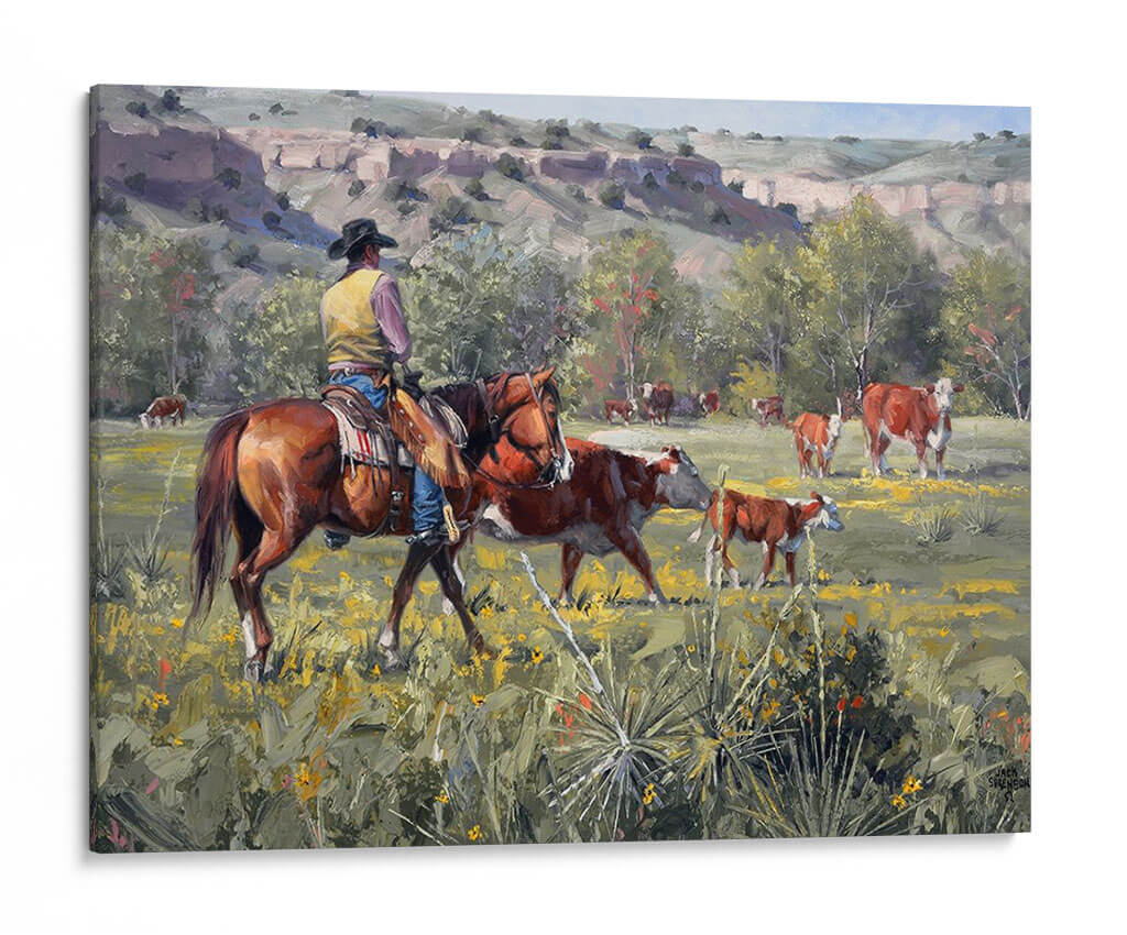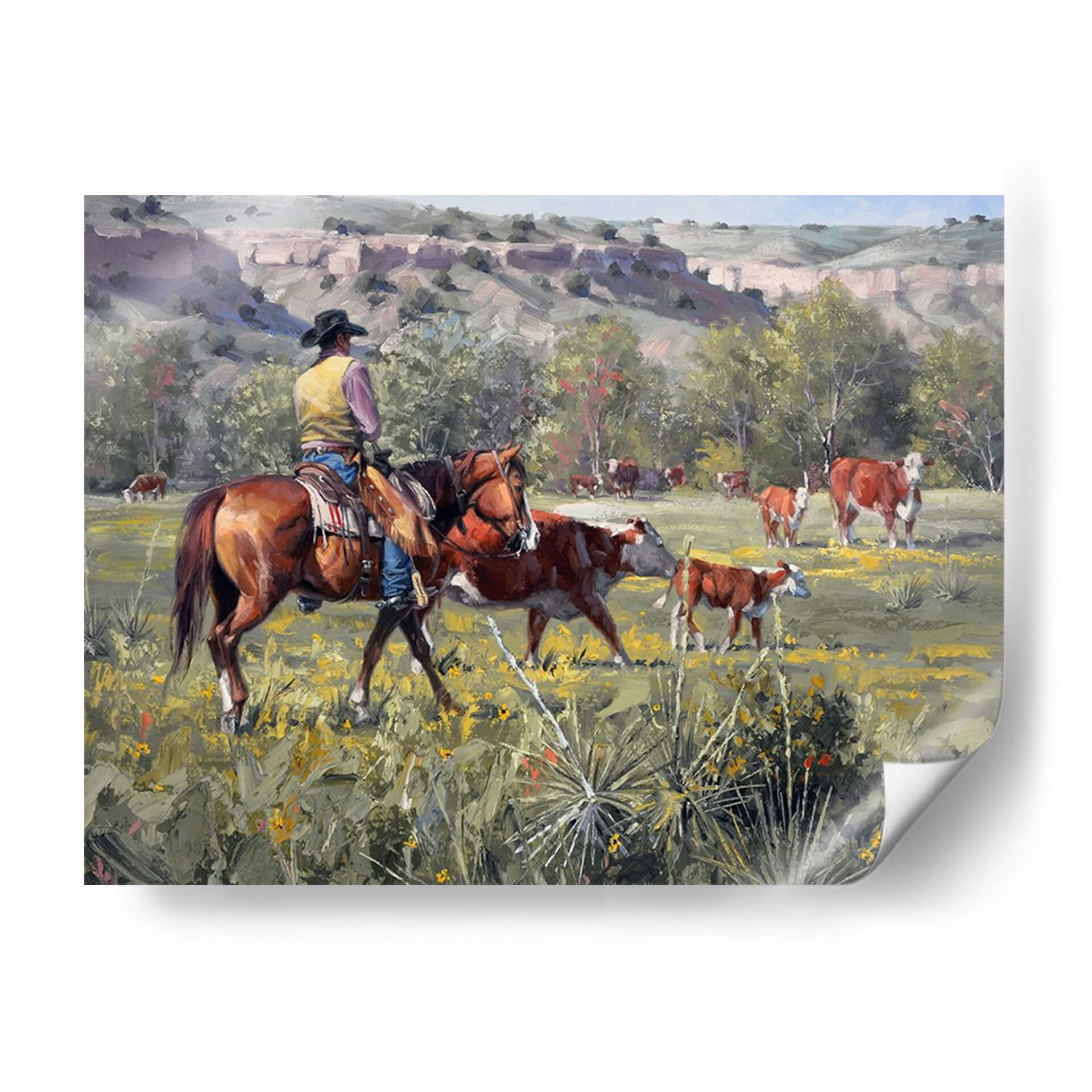 Sumérgete en la serenidad del oeste americano con "Una Buena Primavera", una obra maestra del artista Jack Sorenson. Este cuadro decorativo captura la esencia de un paisaje campestre bañado por el sol, donde un vaquero solitario a caballo vigila su ganado en un prado exuberante. La paleta de colores, dominada por verdes vibrantes, amarillos dorados y los cálidos tonos tierra de las colinas y el cielo, evoca una sensación de paz y conexión con la naturaleza. El estilo pictórico, con pinceladas que sugieren movimiento y luz, da vida a cada elemento, desde el pelaje del caballo hasta las texturas de la vegetación y la majestuosidad de las formaciones rocosas al fondo. Esta pieza es ideal para aquellos que buscan infundir a sus hogares u oficinas un aire de tranquilidad, tradición y la belleza atemporal del campo. Coloca este cuadro decorativo en tu sala de estar, estudio o cualquier espacio que necesite un toque de serenidad y un recordatorio de la vida rural. "Una Buena Primavera" no es solo una imagen, es una invitación a un momento de paz y contemplación, un tesoro artístico que enriquecerá tu entorno con su atmósfera evocadora y su cuidada composición. Es el complemento perfecto para amantes del arte western y la decoración rústica.