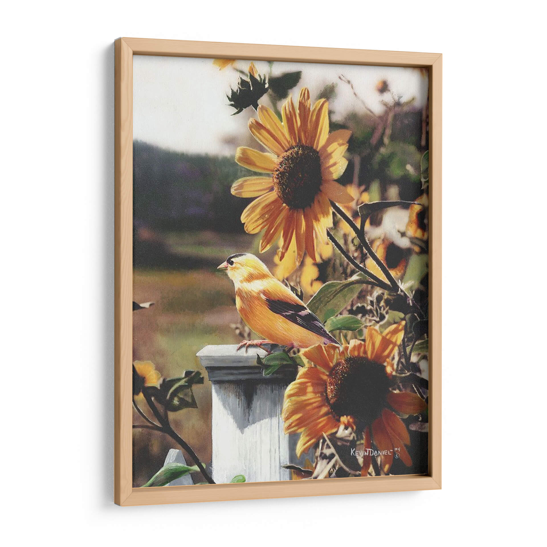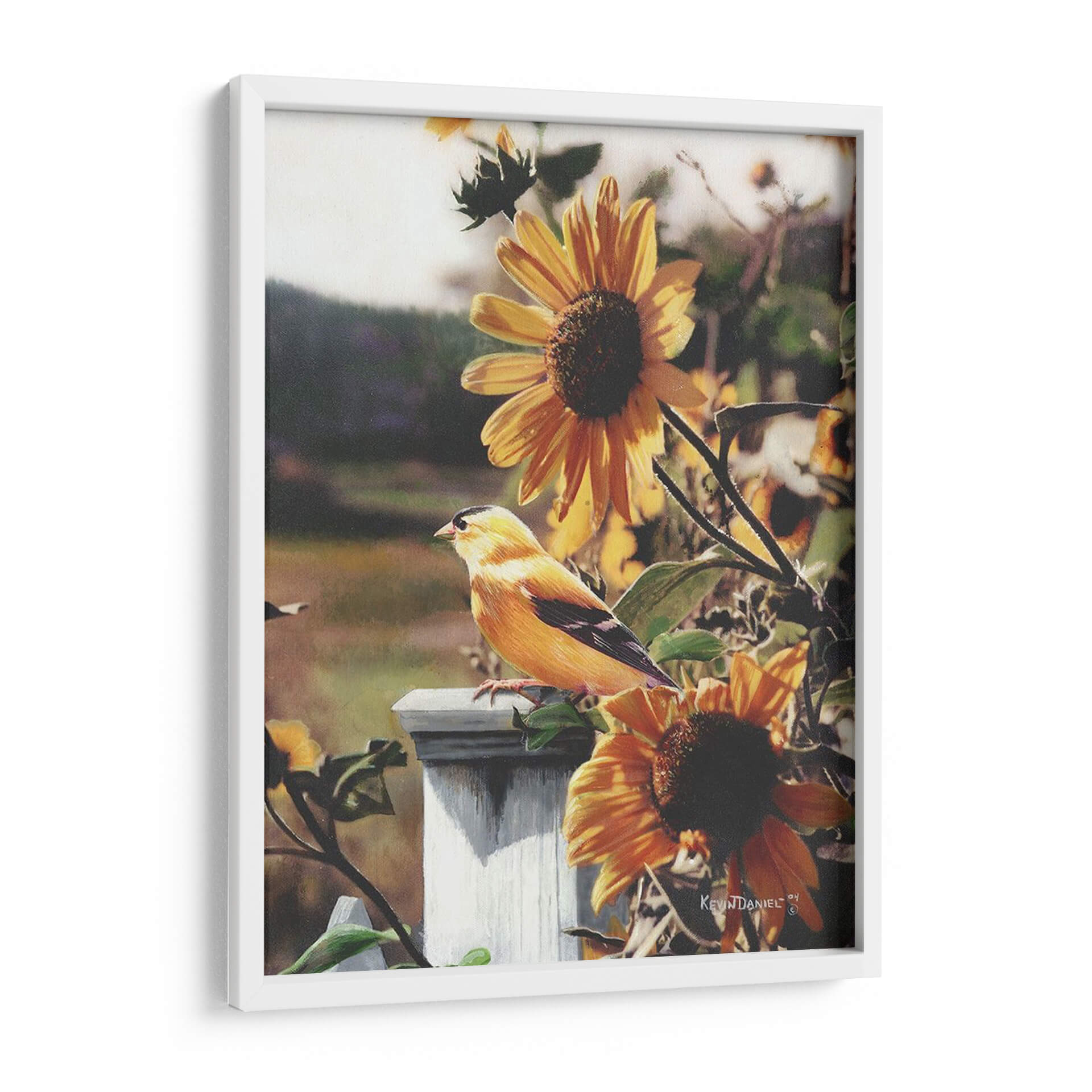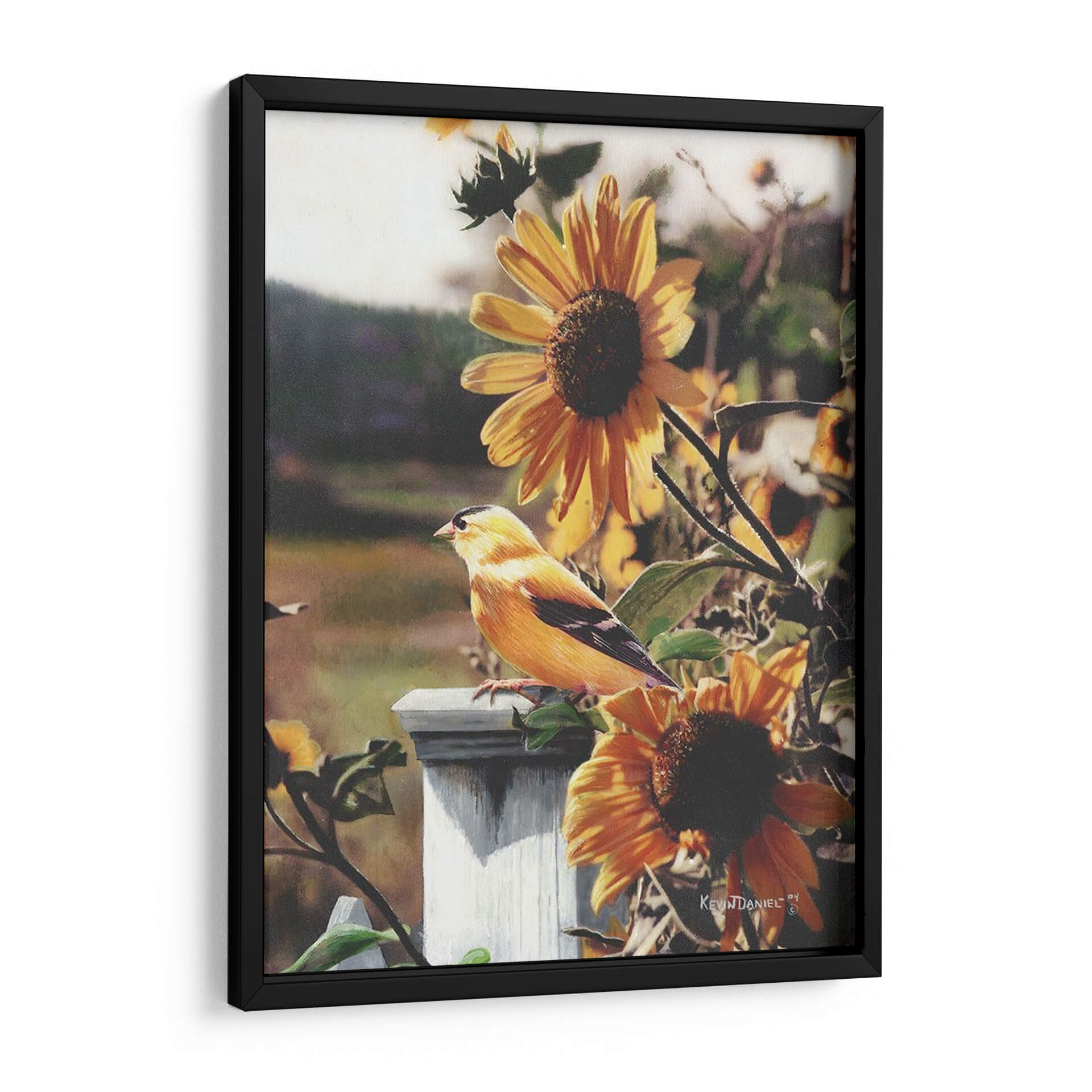 Captura la esencia de una mañana radiante con "Una Mañana Dorada", una obra de arte que evoca calidez y la vibrante belleza de la naturaleza. Este cuadro decorativo presenta un hermoso pájaro posado en una cerca blanca, rodeado de exuberantes girasoles en plena floración. La paleta de colores, dominada por cálidos tonos amarillos y dorados, se complementa con verdes y marrones terrosos, creando una atmósfera serena y acogedora. El estilo realista y detallado de Kevin Daniel da vida a cada pluma del ave y a cada pétalo de las flores, invitando al espectador a sumergirse en una escena campestre llena de luz y vida. Es la pieza perfecta para añadir un toque de optimismo y color a cualquier estancia, ya sea una sala de estar, un dormitorio o una oficina. Imagina la luz del sol filtrándose a través de los girasoles, un momento efímero capturado para siempre en esta impresionante composición. "Una Mañana Dorada" no es solo una obra de arte, es una ventana a un instante de pura felicidad natural que transformará tu espacio, aportando una sensación de paz y conexión con el entorno.