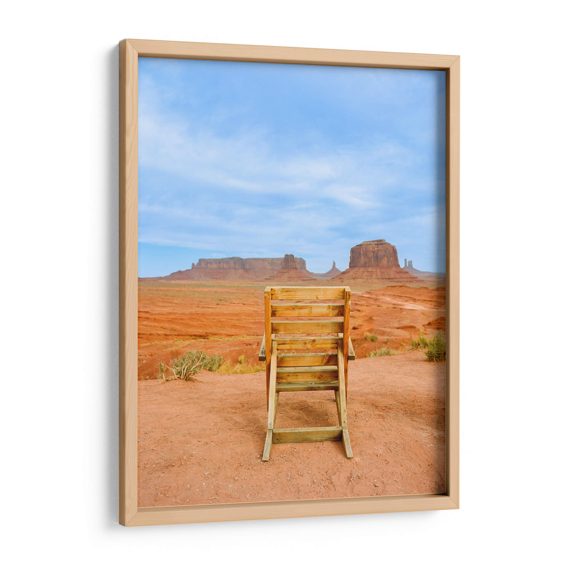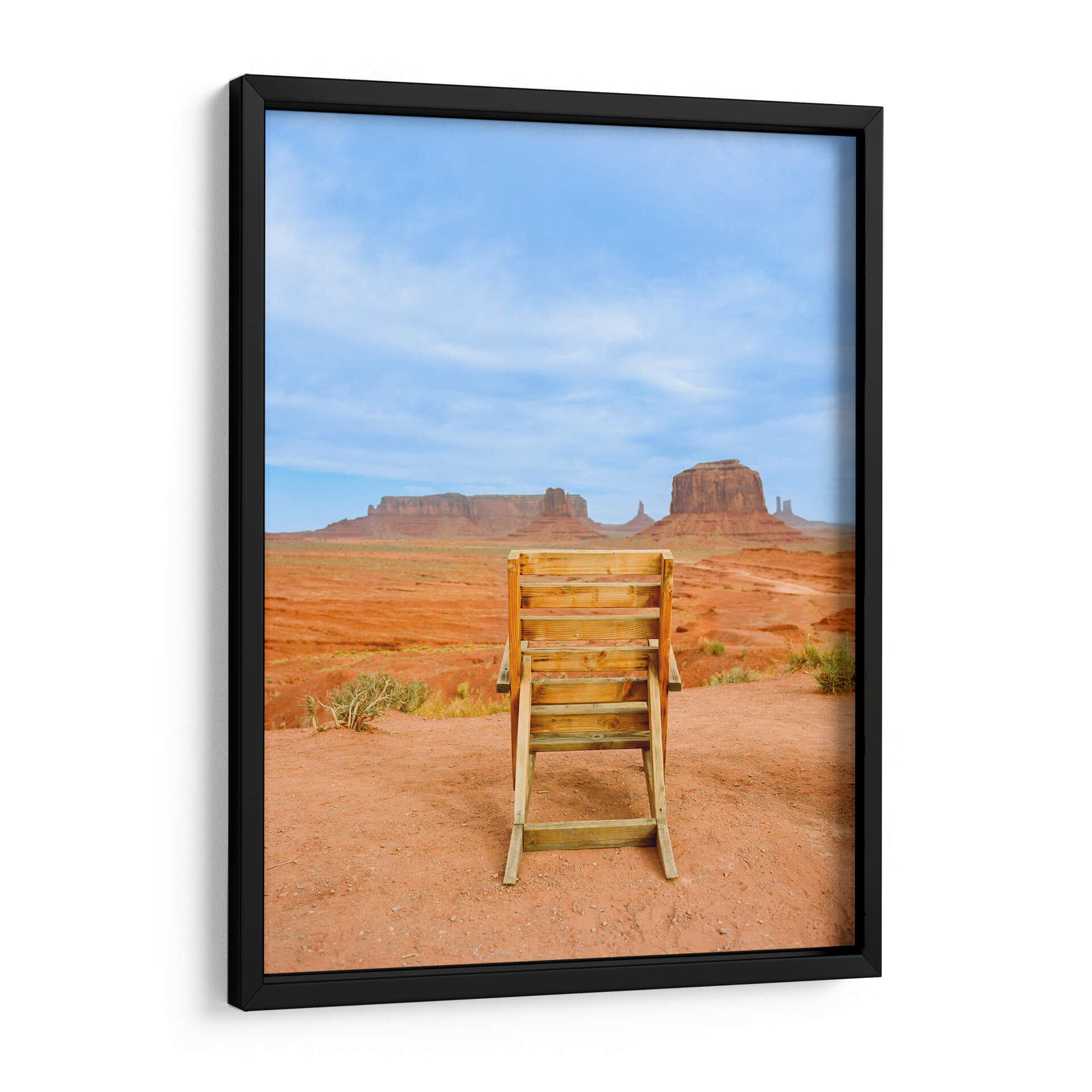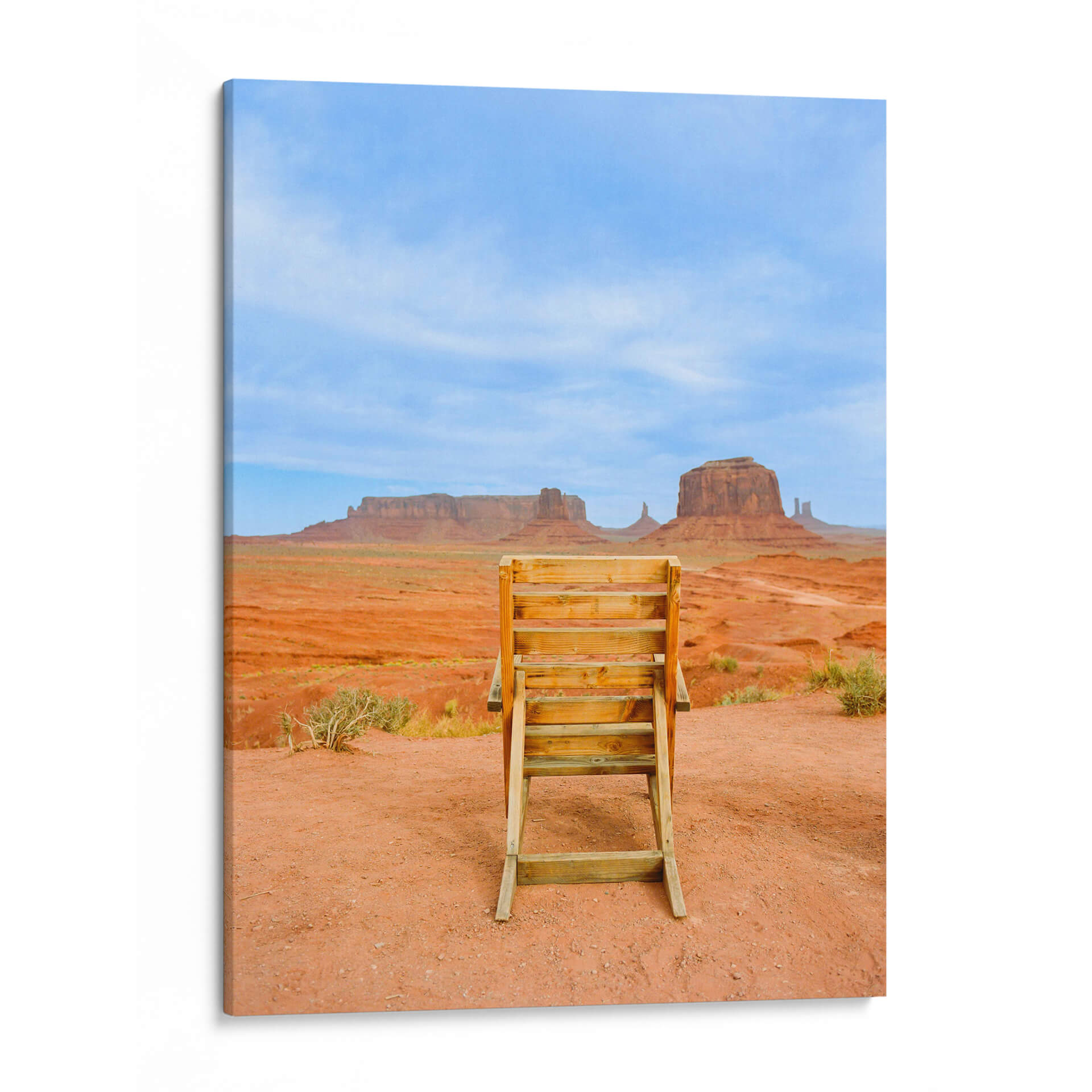 Sumérgete en la majestuosidad del suroeste americano con "Valle de los Monumentos XVIII", una obra de arte que captura la esencia icónica de Monument Valley. Este cuadro decorativo te transporta a un paisaje desértico de tonos rojizos intensos, salpicado por la vegetación escasa y coronado por un cielo azul vibrante, salpicado de nubes tenues. En primer plano, una escalera de madera rústica se erige como un portal a la contemplación, invitando al espectador a una perspectiva única de las imponentes formaciones rocosas que definen este lugar legendario. La composición fotográfica, con su enfoque nítido y su paleta de colores terrosos y celestes, evoca una sensación de calma, grandeza y aventura. Ideal para añadir un toque de naturaleza inspiradora y serena a tu hogar u oficina, este cuadro es perfecto para quienes buscan una conexión con la belleza indómita de la naturaleza y los espacios amplios y abiertos. Transforma tu pared en una ventana a uno de los paisajes más fotografiados del mundo, una pieza que inspira reflexión y admiración.