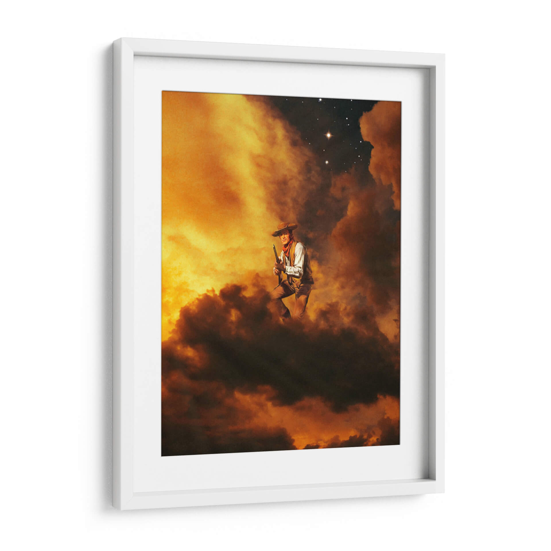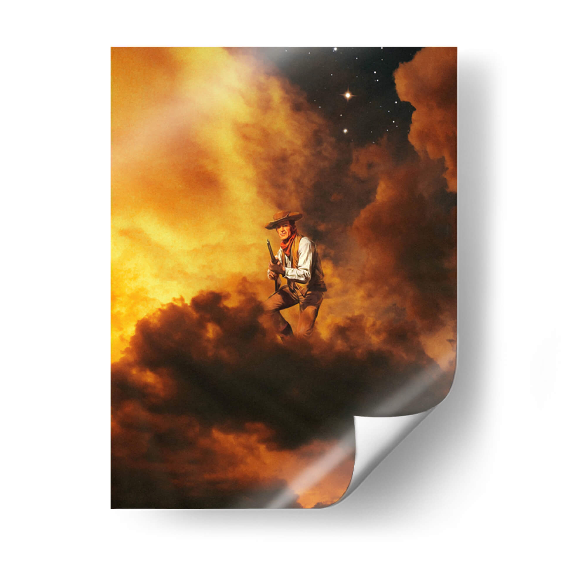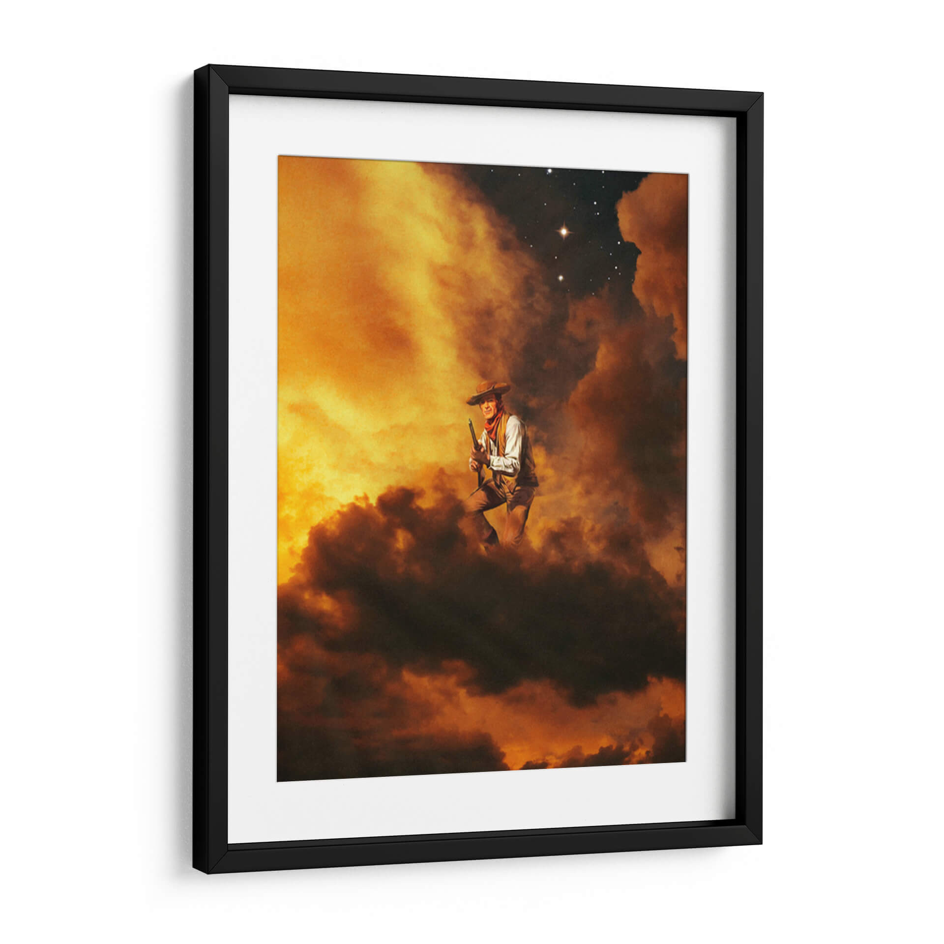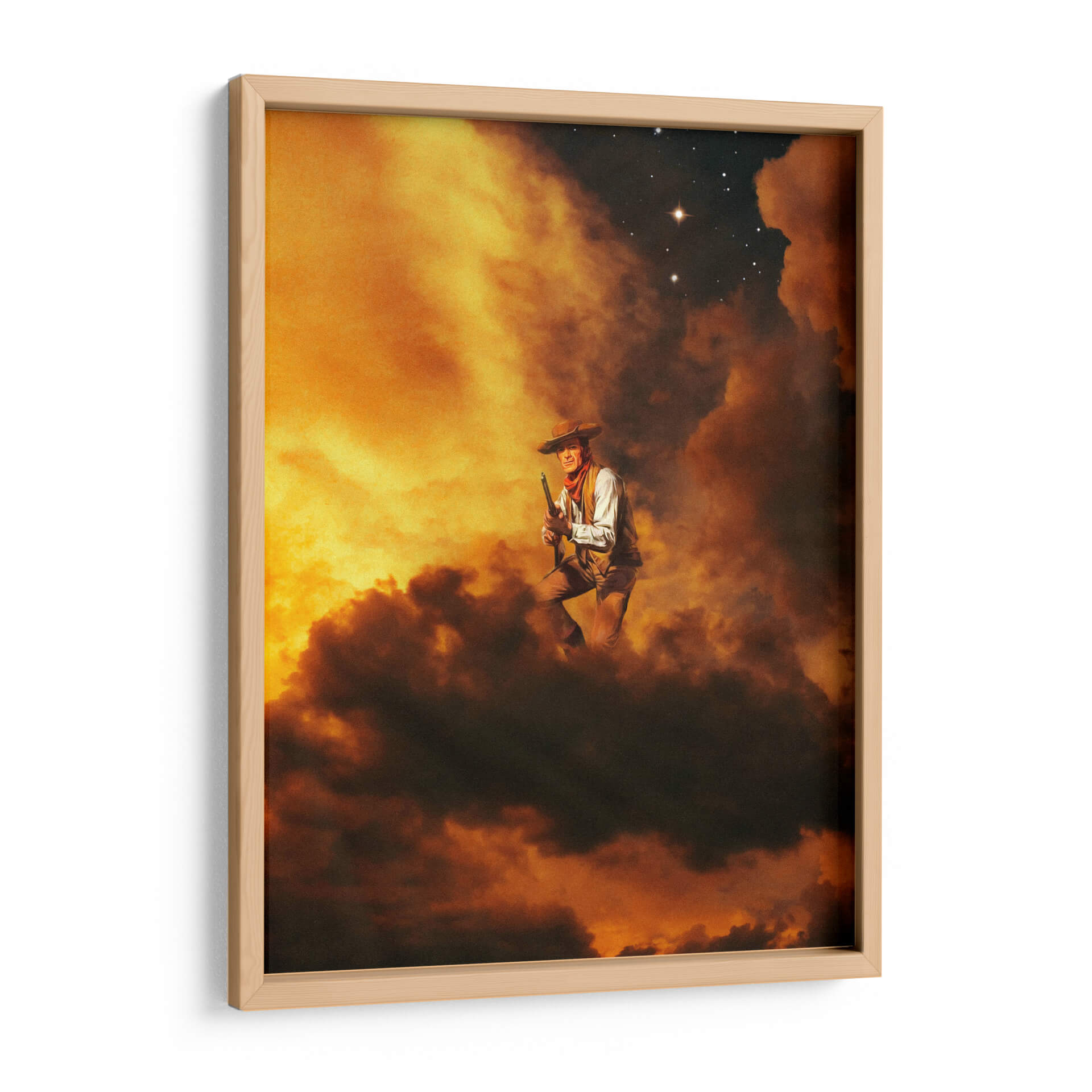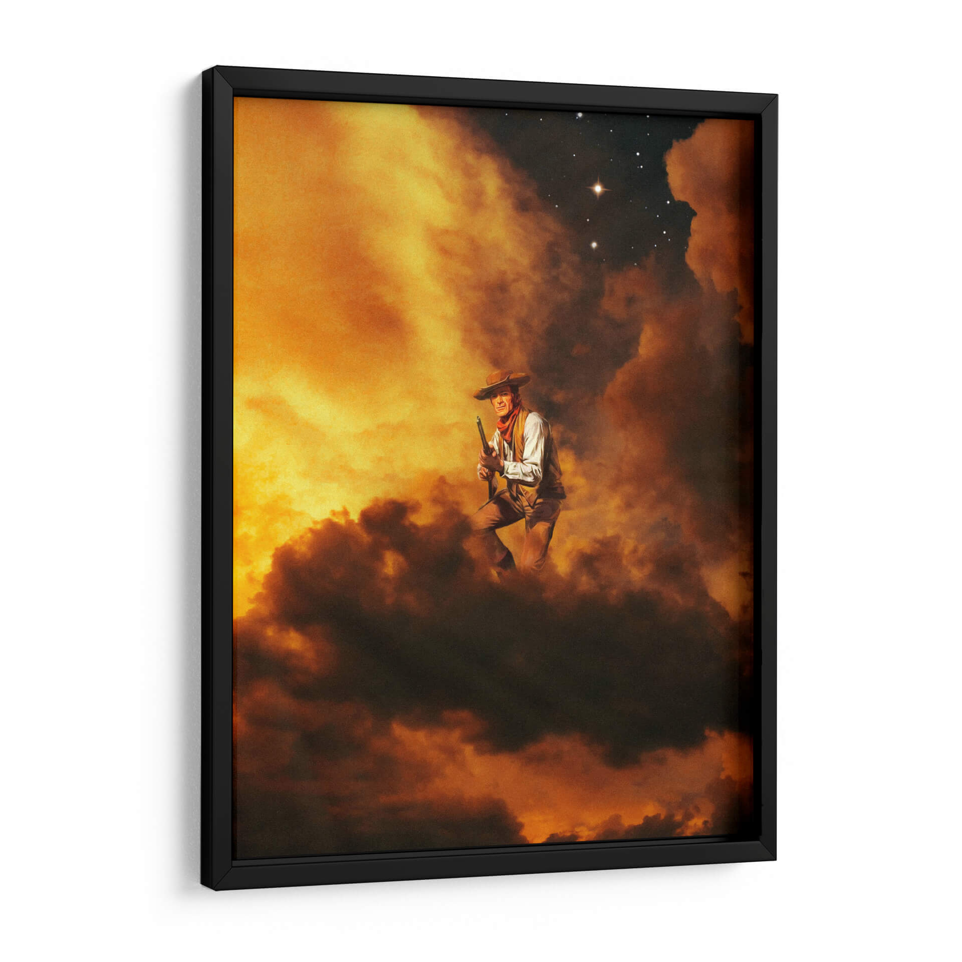 Sumérgete en la mística del oeste americano con "Vaquero I", una obra de arte cautivadora que evoca la fuerza y la soledad de una figura icónica. El cuadro presenta a un vaquero en una pose dinámica, rodeado por un cielo tormentoso de nubes intensas y tonos ardientes que van desde el amarillo dorado hasta el marrón profundo. La iluminación dramática realza la textura de las nubes y crea una atmósfera de misterio y aventura. En la parte superior, un cielo nocturno salpicado de estrellas, una de ellas brillando con intensidad, añade un toque de grandiosidad y eternidad. La composición, centrada en la figura del vaquero con un rifle en mano, transmite una sensación de determinación y resiliencia. Este cuadro decorativo es perfecto para espacios que buscan un punto focal audaz y una conexión con el espíritu indomable del viejo oeste. Ideal para salones, estudios o cualquier lugar donde se desee añadir un carácter distintivo y una narrativa visual potente. Transforma tu pared en una ventana a un mundo de leyendas y paisajes épicos.