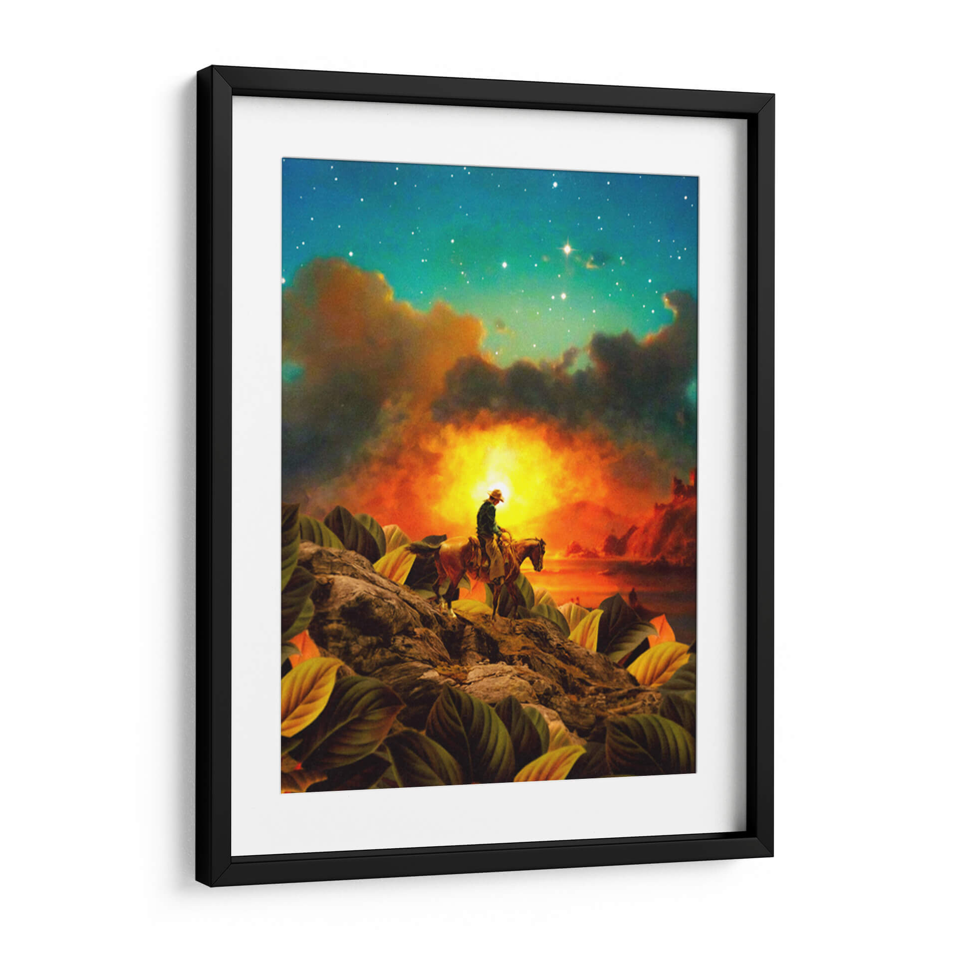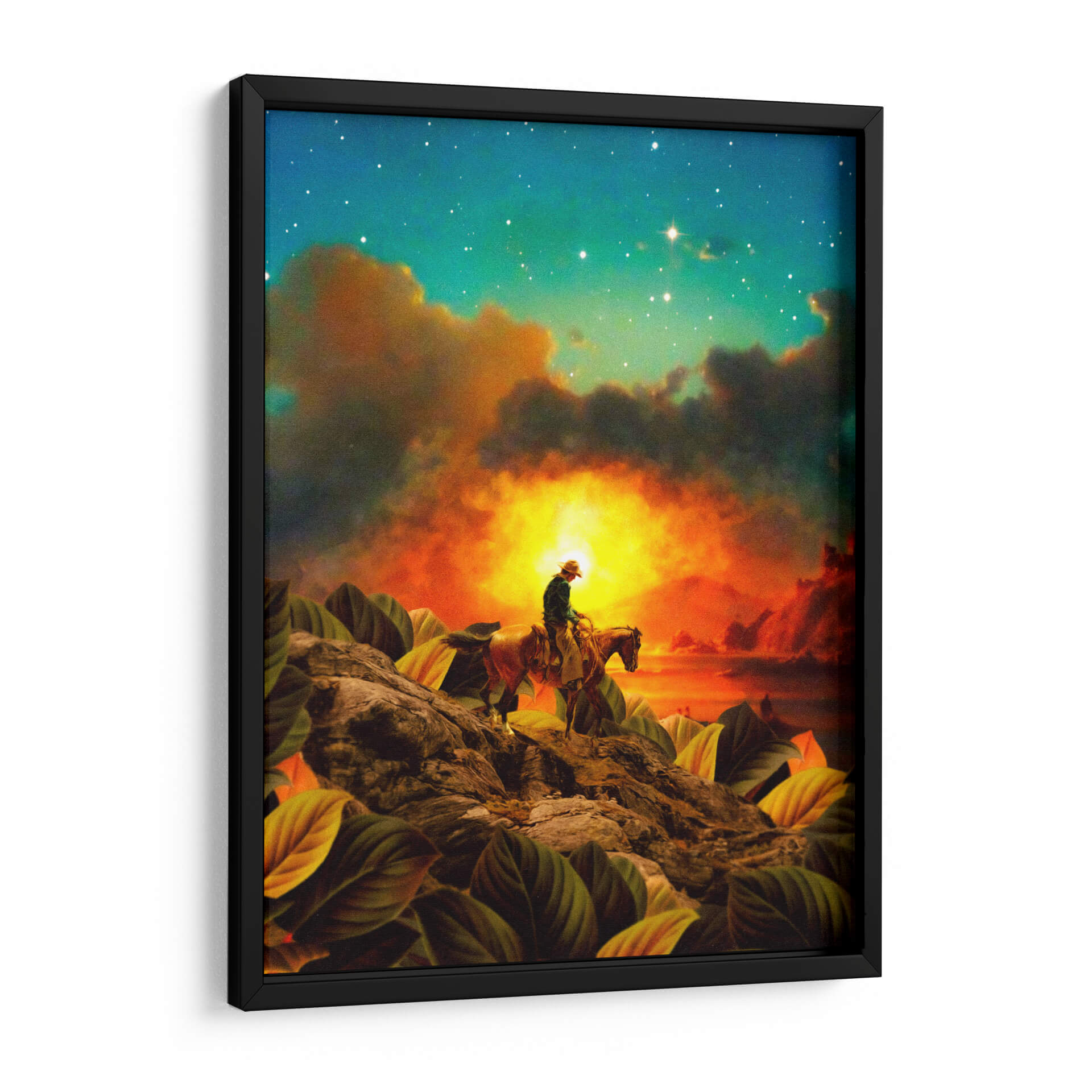 Sumérgete en la evocadora obra "Vaquero II" de Taudalpoi, un cuadro decorativo que traslada al espectador a un atardecer místico en medio de un paisaje salvaje. La pieza presenta a un solitario vaquero a caballo, contemplando un cielo vibrante teñido de naranjas intensos, amarillos incandescentes y azules profundos salpicados de estrellas. Las nubes dramáticas y el sol poniente crean una atmósfera de asombro y misterio, mientras que la vegetación exuberante en primer plano añade un toque terrenal y salvaje a la escena. El estilo único de Taudalpoi fusiona elementos surrealistas con una paleta de colores audaz, resultando en una obra de arte cautivadora que invita a la reflexión sobre la libertad, la naturaleza y la inmensidad del universo. Este cuadro decorativo es perfecto para añadir un punto focal dramático y una narrativa intrigante a cualquier sala de estar, estudio o dormitorio, resonando con aquellos que aprecian la belleza de lo indómito y la magia de los momentos fugaces. "Vaquero II" no es solo una pieza de decoración, sino una ventana a un mundo de ensueño y aventura.