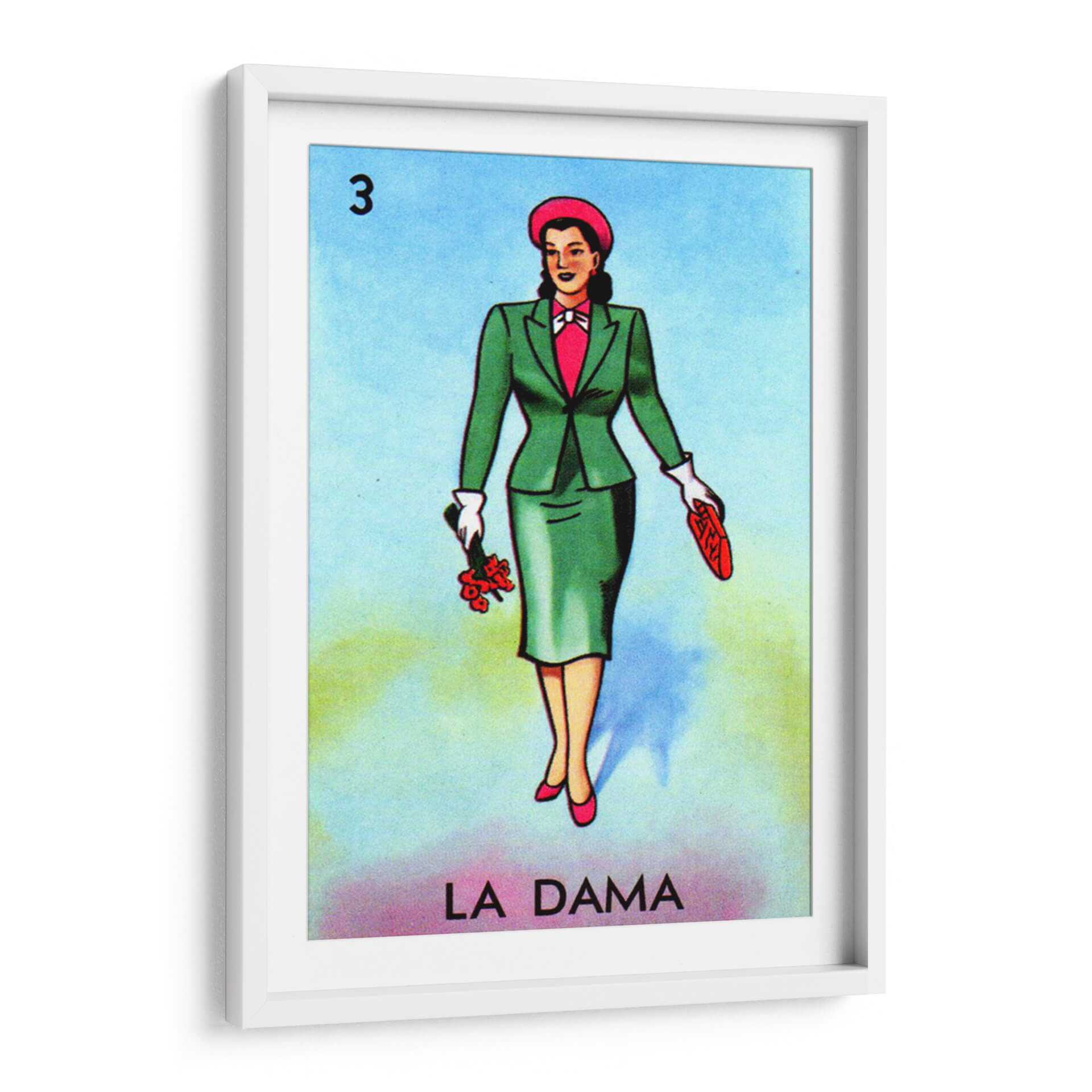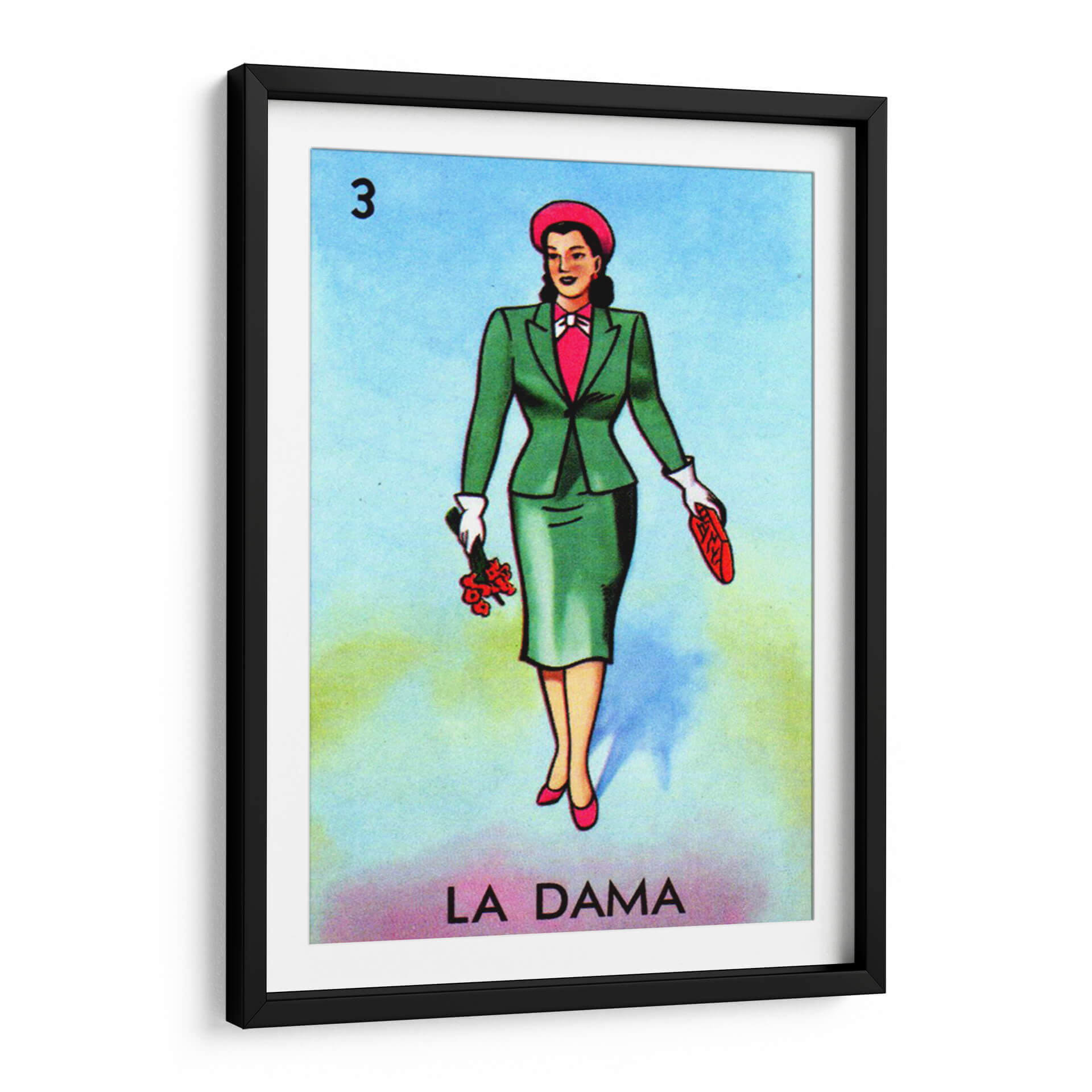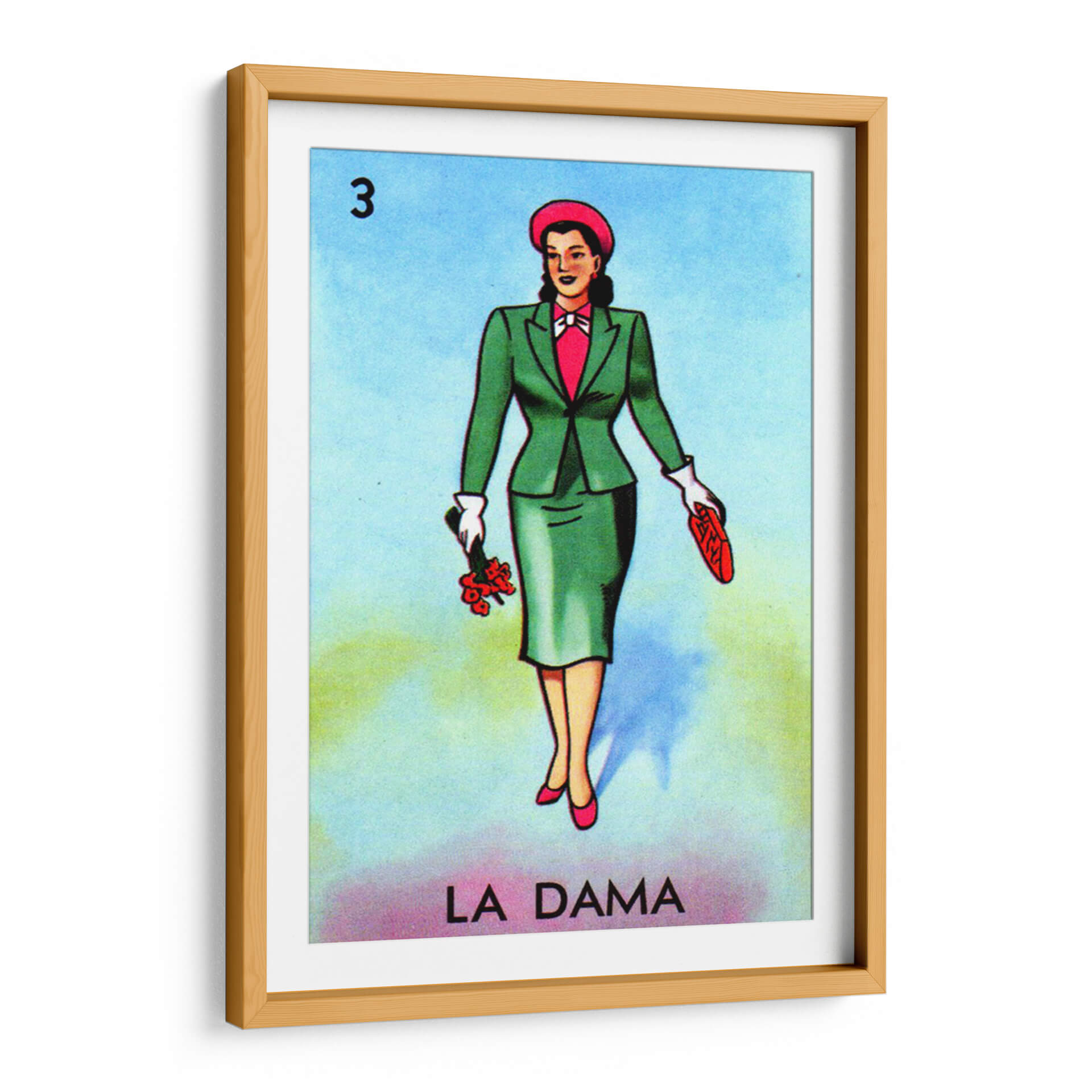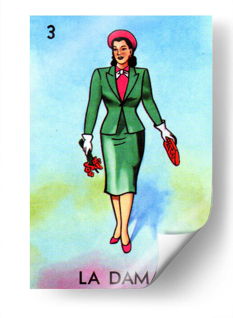 Este cautivador cuadro decorativo, titulado 'La Dama', presenta una figura femenina con un estilo que evoca la nostalgia y la elegancia de épocas pasadas. La obra se distingue por su paleta de colores vibrantes, dominada por el verde esmeralda del traje sastre y los acentos en rosa de la boina y el detalle de la blusa, creando un contraste llamativo contra el cielo azul degradado y un suave fondo abstracto verdoso. La composición centrada en la figura, que porta un ramo de flores rojas y un accesorio en la mano, transmite una sensación de confianza y presencia. El trazo distintivo y la estética reminiscent de las tarjetas de lotería mexicana añaden un toque cultural y único a esta pieza. Es ideal para añadir un punto focal de carácter y sofisticación a salas de estar, recibidores o estudios. Un cuadro decorativo perfecto para quienes aprecian el arte con historia y un diseño gráfico audaz, capaz de dialogar con decoraciones modernas y clásicas, aportando personalidad y un aire de distinción a cualquier ambiente.