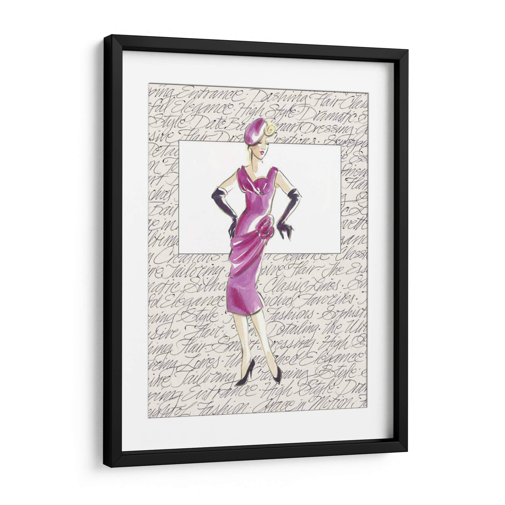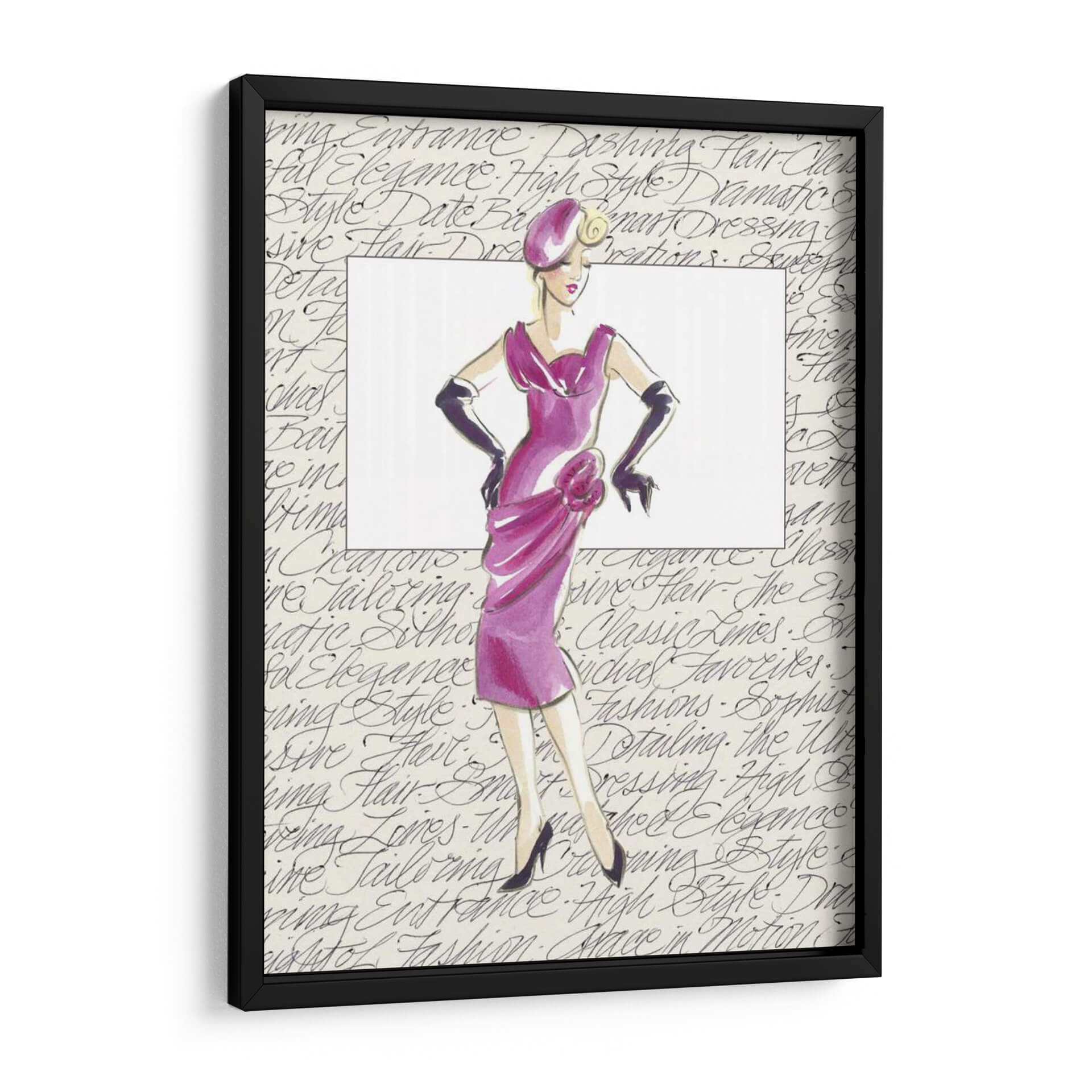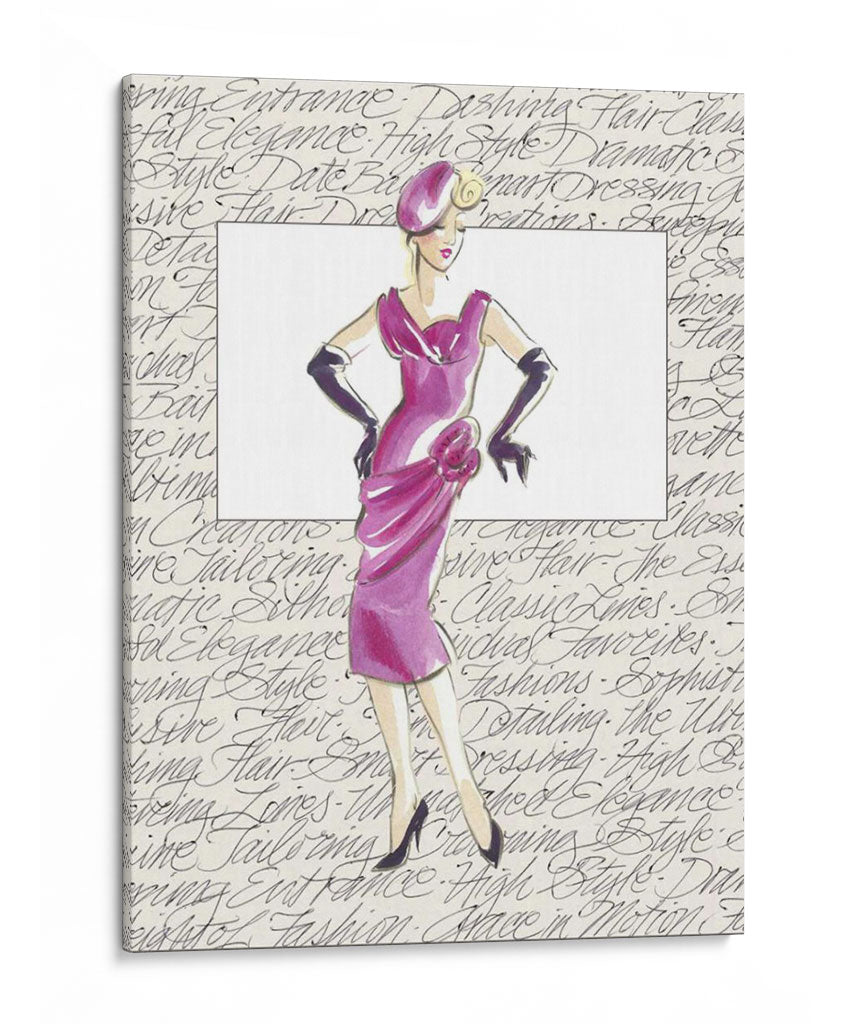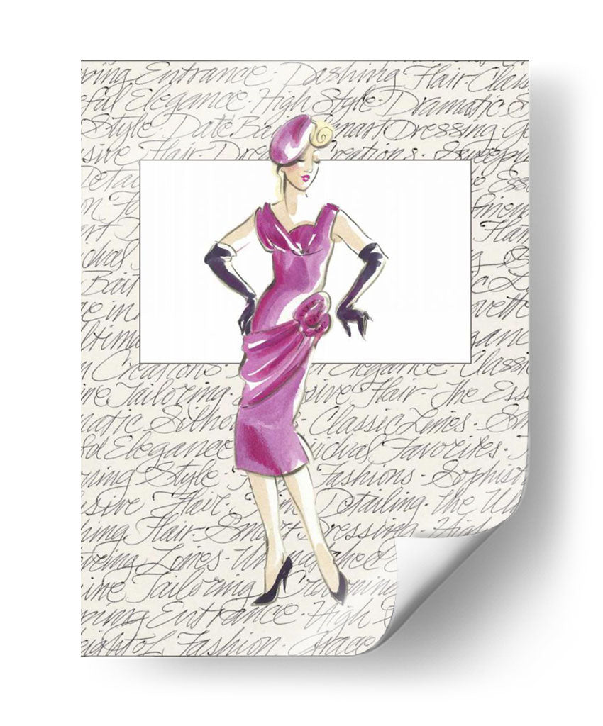 Adéntrate en el mundo de la alta costura y el estilo atemporal con "50S Moda Vi" de Elissa Della-Piana. Esta cautivadora obra de arte captura la esencia de la moda de mediados de siglo con una figura femenina elegante vestida con un sofisticado traje lila. La paleta de colores vibrante pero refinada, dominada por el púrpura del vestido y los guantes contrastantes, se complementa con un fondo de caligrafía estilizada en tonos neutros, creando una atmósfera de glamour y nostalgia. La composición, centrada en la figura con una pose segura y las manos en las caderas, transmite confianza y distinción. Ideal para quienes buscan añadir un toque de elegancia vintage a su hogar u oficina, este cuadro decorativo es una pieza que evoca sofisticación y un espíritu chic. Su diseño lo hace perfecto para salas de estar, vestidores o espacios donde se desee un acento de estilo retro y chic. "50S Moda Vi" no es solo una imagen, es una declaración de moda y arte que aporta un aire de distinción a cualquier ambiente, invitando a la admiración y la conversación, y se convertirá en el punto focal de tu decoración.