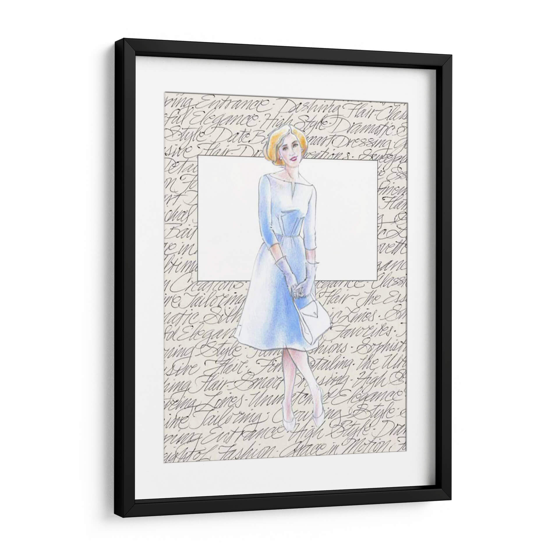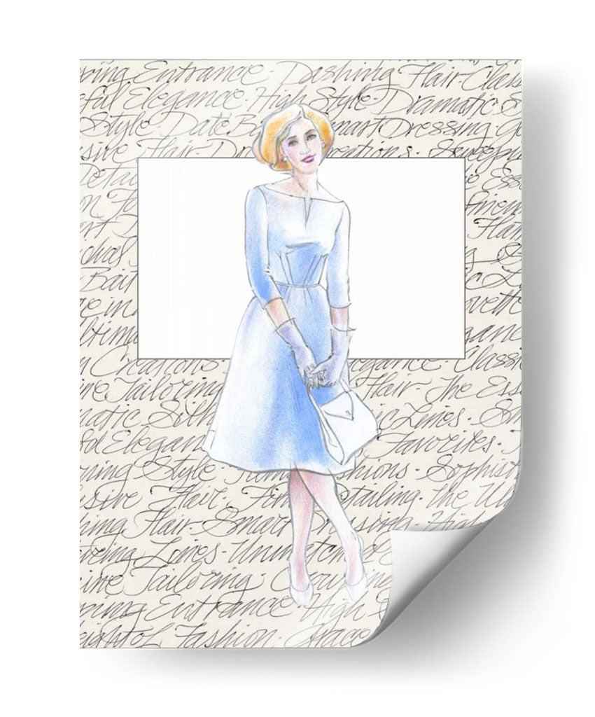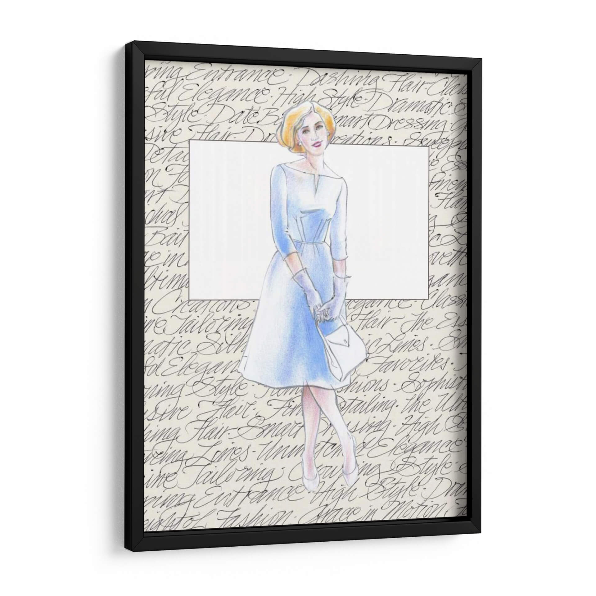 Este exquisito cuadro decorativo, titulado '50S Moda Viii' de Elissa Della-Piana, evoca la elegancia y el glamour de la moda de mediados de siglo con un toque artístico contemporáneo. La obra presenta una figura femenina estilizada, vestida con un elegante traje azul claro y guantes blancos, que irradia sofisticación y encanto. El fondo está adornado con una caligrafía cursiva en tonos neutros que complementa la figura central sin abrumarla, creando una atmósfera de refinamiento y nostalgia. La paleta de colores, dominada por suaves tonos pastel y el contraste del negro de la escritura, aporta una sensación de calma y distinción. Ideal para añadir un punto focal chic a un salón, un dormitorio o un espacio de tocador, esta pieza es perfecta para quienes aprecian el diseño atemporal y la estética de la alta costura. La composición es equilibrada, con la figura femenina como protagonista destacada, invitando a la contemplación y admiración. Añade un toque de opulencia y estilo retro a tu decoración con este cautivador cuadro decorativo, una verdadera joya para los amantes del arte y la moda.