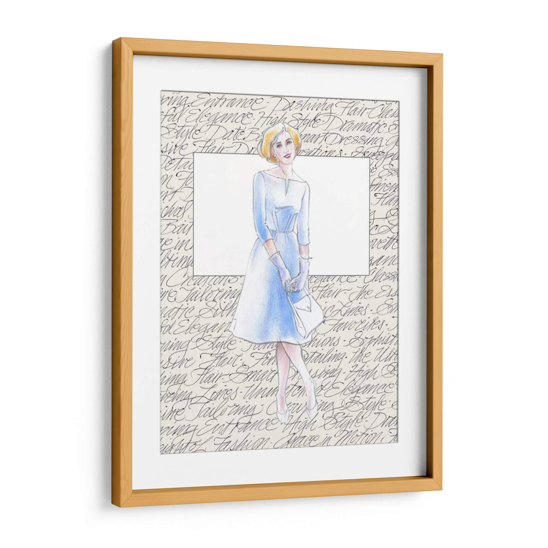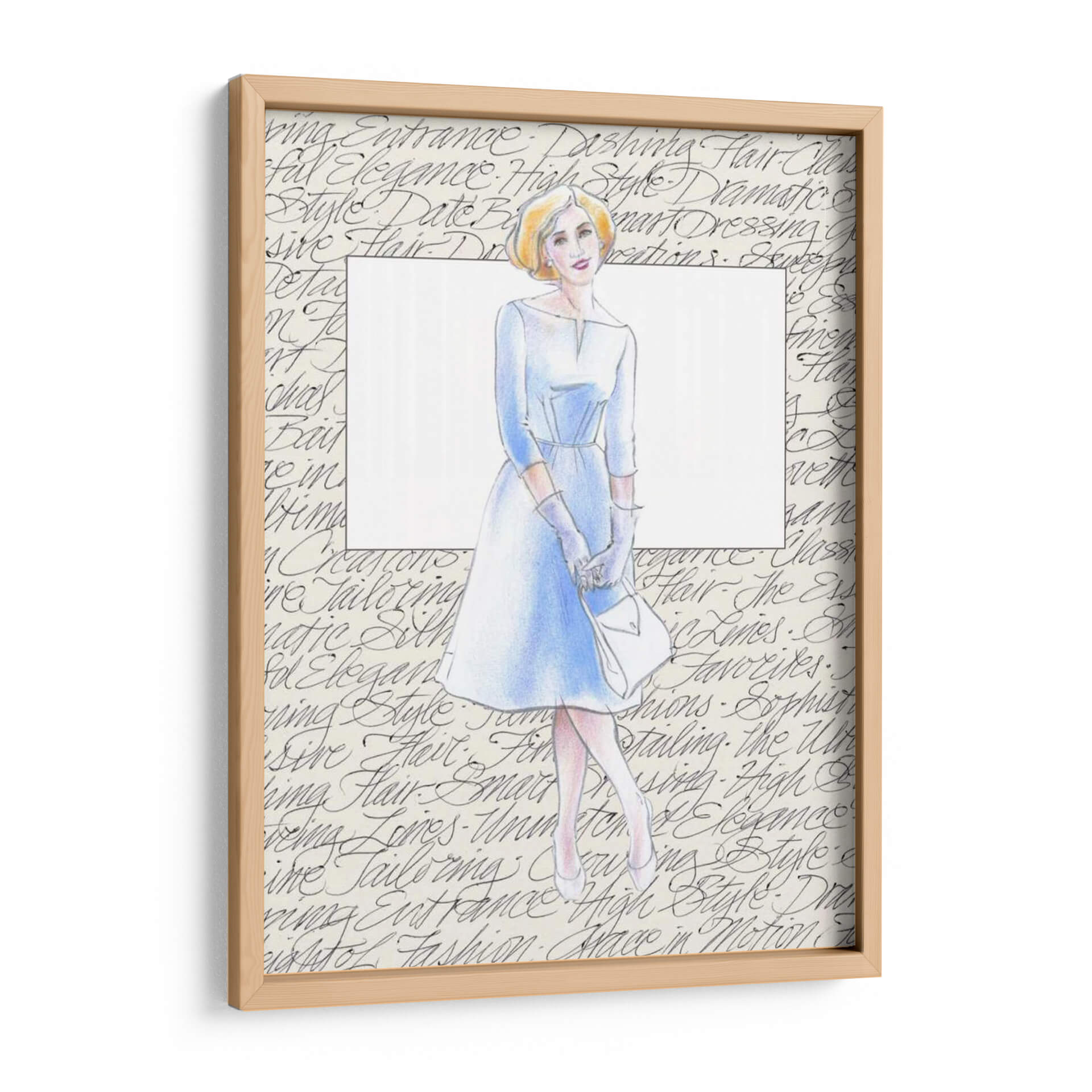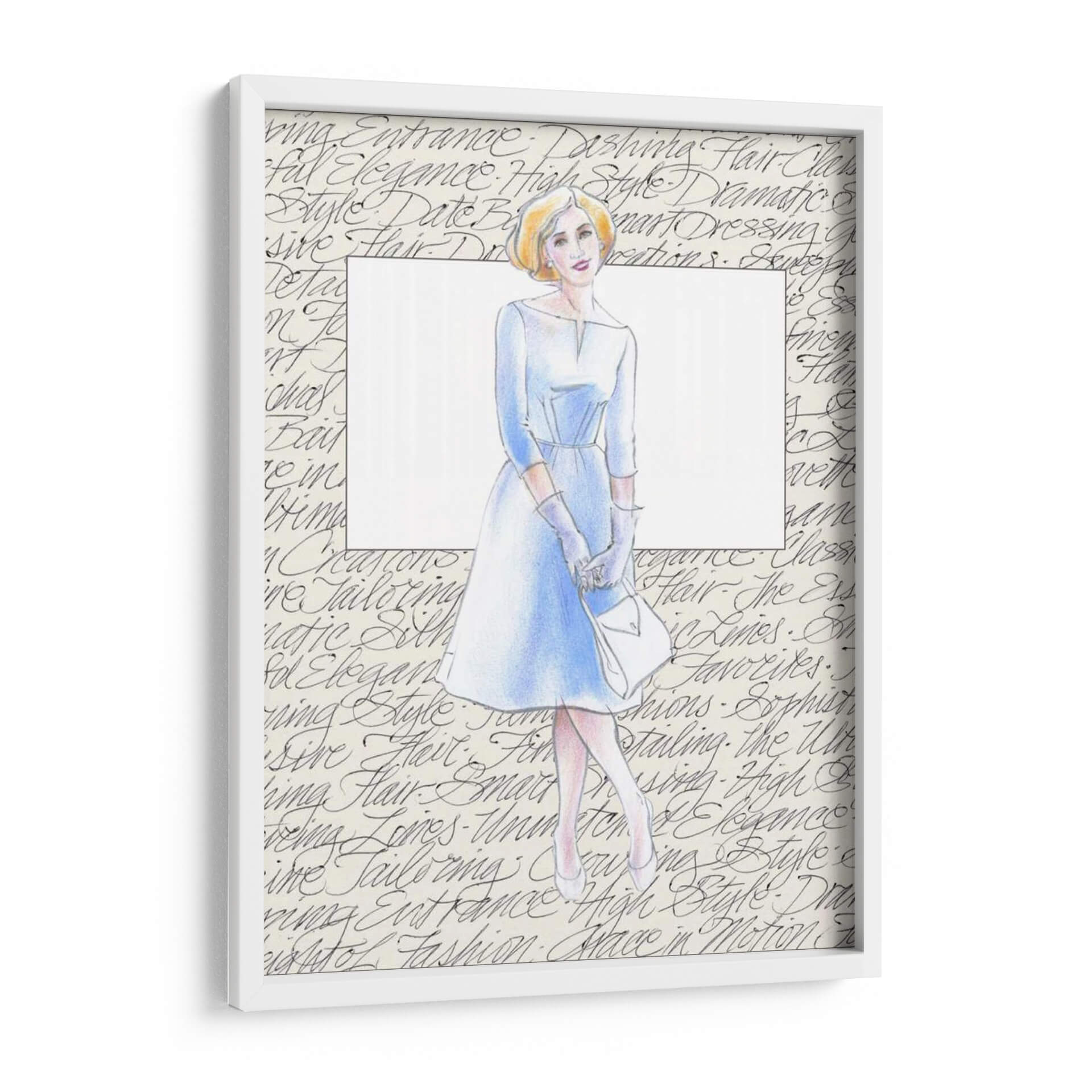 Este exquisito cuadro decorativo, titulado '50S Moda Viii' de Elissa Della-Piana, evoca la elegancia y el glamour de la moda de mediados de siglo con un toque artístico contemporáneo. La obra presenta una figura femenina estilizada, vestida con un elegante traje azul claro y guantes blancos, que irradia sofisticación y encanto. El fondo está adornado con una caligrafía cursiva en tonos neutros que complementa la figura central sin abrumarla, creando una atmósfera de refinamiento y nostalgia. La paleta de colores, dominada por suaves tonos pastel y el contraste del negro de la escritura, aporta una sensación de calma y distinción. Ideal para añadir un punto focal chic a un salón, un dormitorio o un espacio de tocador, esta pieza es perfecta para quienes aprecian el diseño atemporal y la estética de la alta costura. La composición es equilibrada, con la figura femenina como protagonista destacada, invitando a la contemplación y admiración. Añade un toque de opulencia y estilo retro a tu decoración con este cautivador cuadro decorativo, una verdadera joya para los amantes del arte y la moda.