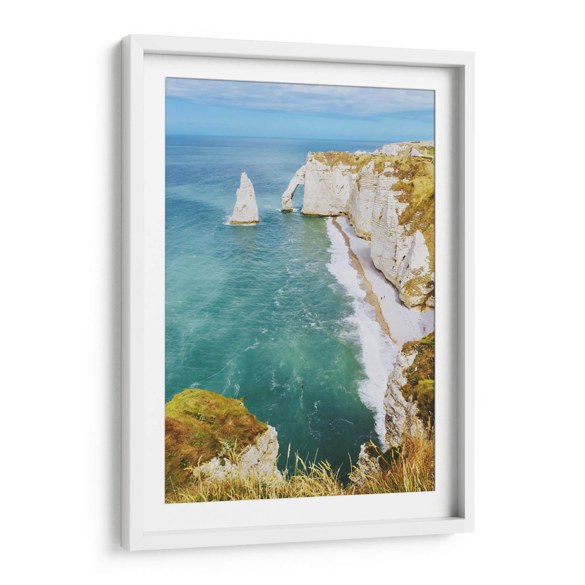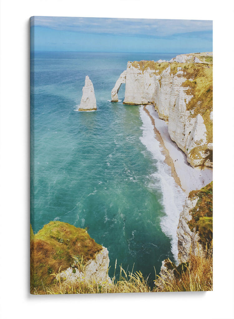 Capture la majestuosidad de la naturaleza con esta impresionante obra de arte de los Acantilados de Étretat. La imagen, que evoca una sensación de paz y aventura, presenta una vista aérea de las icónicas formaciones rocosas blancas que se alzan dramáticamente sobre el mar turquesa. Las olas suaves rompen en una playa de guijarros dorados, mientras que la vegetación dorada y verde corona los acantilados, creando un contraste vibrante. La paleta de colores, dominada por azules profundos del océano, blancos cremosos de las rocas y tonos tierra de la vegetación, transmite una atmósfera serena y a la vez energizante. El estilo fotográfico, que resalta la escala monumental del paisaje, convierte esta pieza en una ventana a la belleza indómita de la costa normanda. Ideal para quienes buscan añadir un toque de serenidad costera y esplendor natural a su hogar u oficina, esta impresión en lienzo es un recordatorio constante de la magnificencia del mundo natural. Perfecta para salones, dormitorios o espacios que necesiten una dosis de tranquilidad y belleza paisajística.