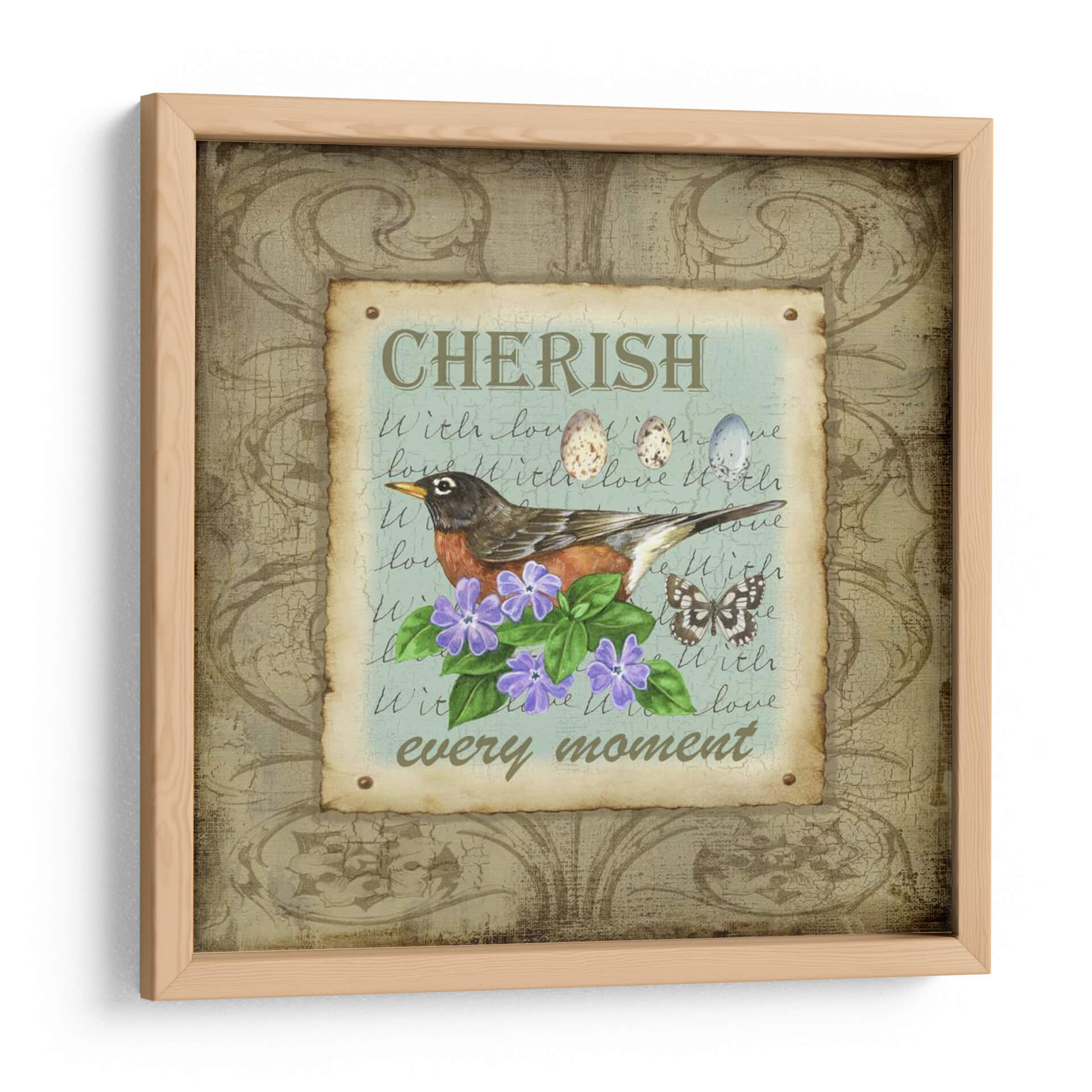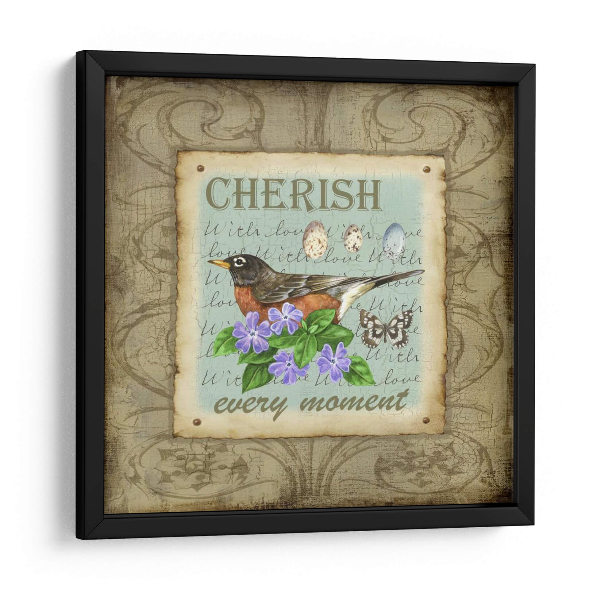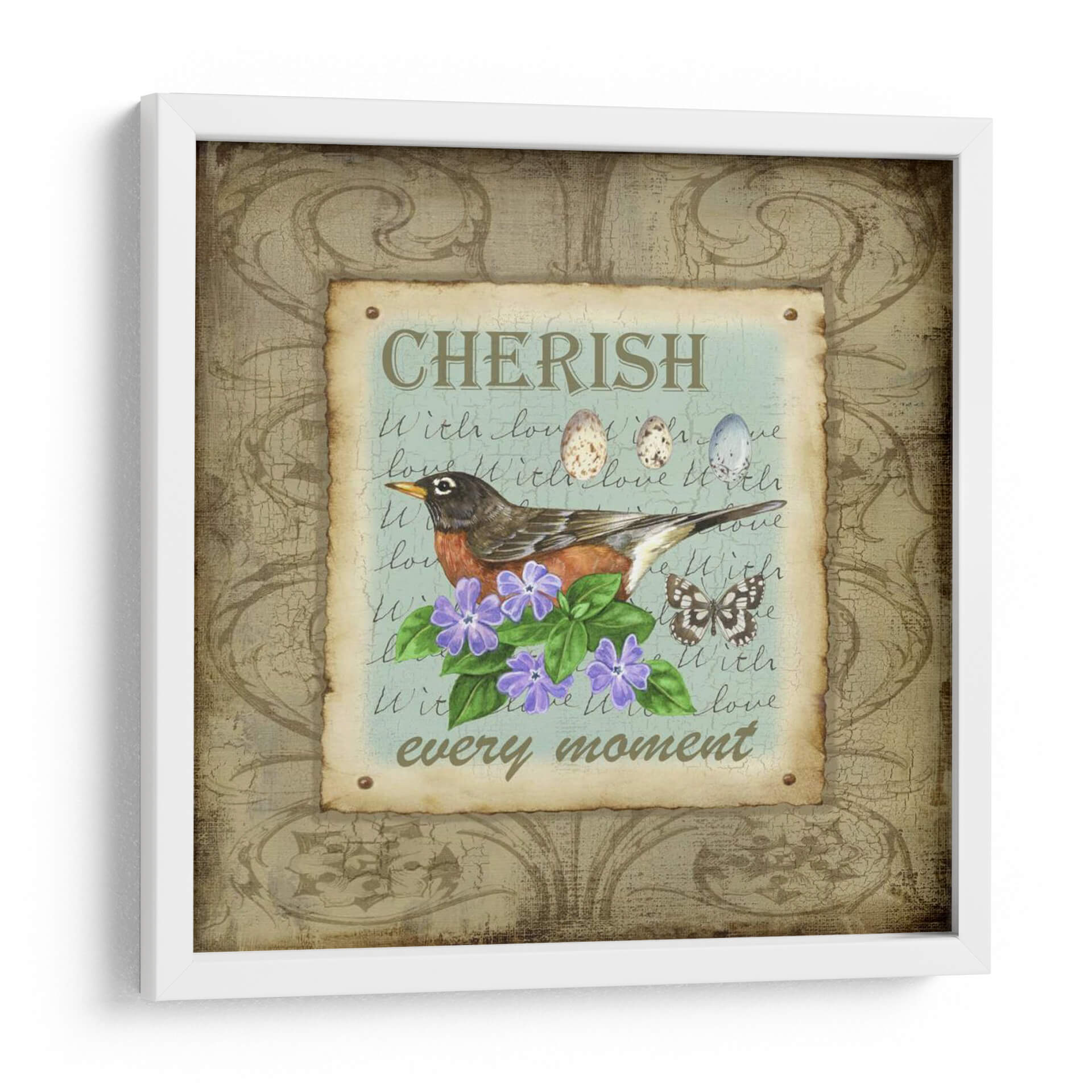 Embárcate en un viaje de serenidad y aprecio con "Alas De La Maravilla III", una obra de arte digital que captura la delicadeza de la naturaleza y la calidez de los momentos significativos. Esta pieza presenta un tierno petirrojo posado graciosamente sobre un vibrante ramo de flores moradas, rodeado por el suave batir de las alas de una mariposa y el simbólico legado de huevos de ave. El texto manuscrito superpuesto, que incluye las frases "CHERISH" y "every moment", añade una capa de introspección nostálgica y un recordatorio para atesorar cada instante. La paleta de colores, dominada por tonos tierra, verdes suaves y acentos azules y morados, crea una atmósfera tranquila y acogedora, perfecta para infundir paz en cualquier espacio. El estilo ilustrativo, con un toque rústico y vintage, hace que este cuadro decorativo sea ideal para complementar decoraciones de estilo campestre, shabby chic o simplemente para añadir un punto de dulzura a un rincón de lectura, un dormitorio o un espacio de trabajo. "Alas De La Maravilla III" no es solo una imagen, es una invitación a la contemplación y a la celebración de la belleza efímera que nos rodea, convirtiéndose en una adición encantadora y significativa a tu hogar.