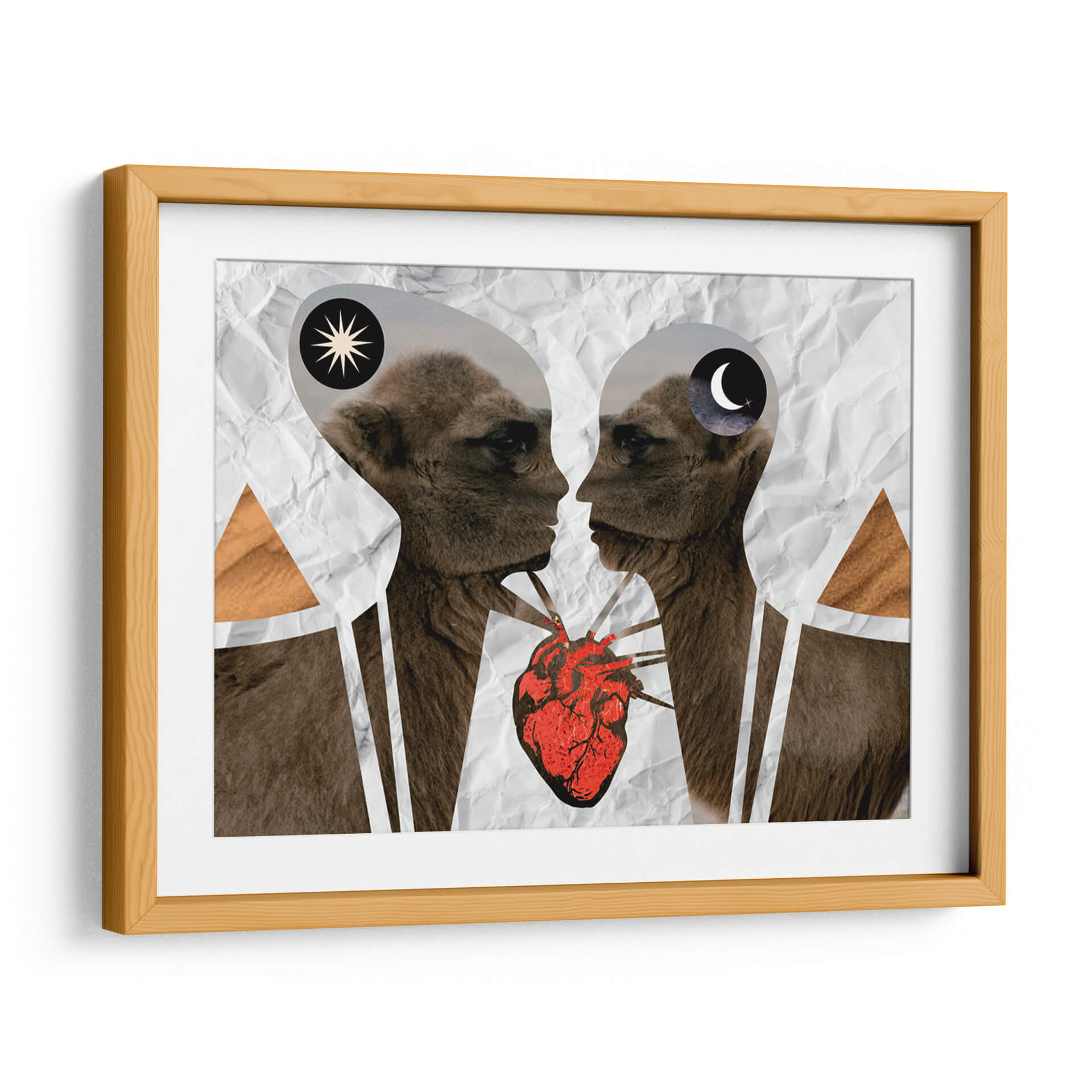 Sumérgete en la fascinante obra de arte "Amor de camellos" del artista Homo Cosmicam, una pieza que fusiona lo terrenal con lo etéreo. Este cuadro decorativo presenta dos perfiles de camellos mirándose fijamente, creando una conexión visual intensa. En el centro, un corazón anatómicamente detallado irradia su vitalidad, simbolizando la esencia de la vida y la conexión emocional profunda. La paleta de colores, dominada por tonos tierra, grises y blancos arrugados que evocan papel, contrasta con el vibrante rojo del corazón, añadiendo un punto focal dramático. Elementos geométricos sutiles, como triángulos y líneas, junto a símbolos celestiales (un sol radiante y una luna creciente), aportan una dimensión surrealista y cósmica a la composición. Esta obra de arte es una invitación a la reflexión sobre el amor, la conexión y la dualidad de la existencia, ideal para espacios que buscan un toque de originalidad, misterio y profundidad emocional, como una sala de estar moderna, un estudio o una oficina creativa. Transforma tu hogar con este cuadro decorativo único que estimula la conversación y la imaginación.