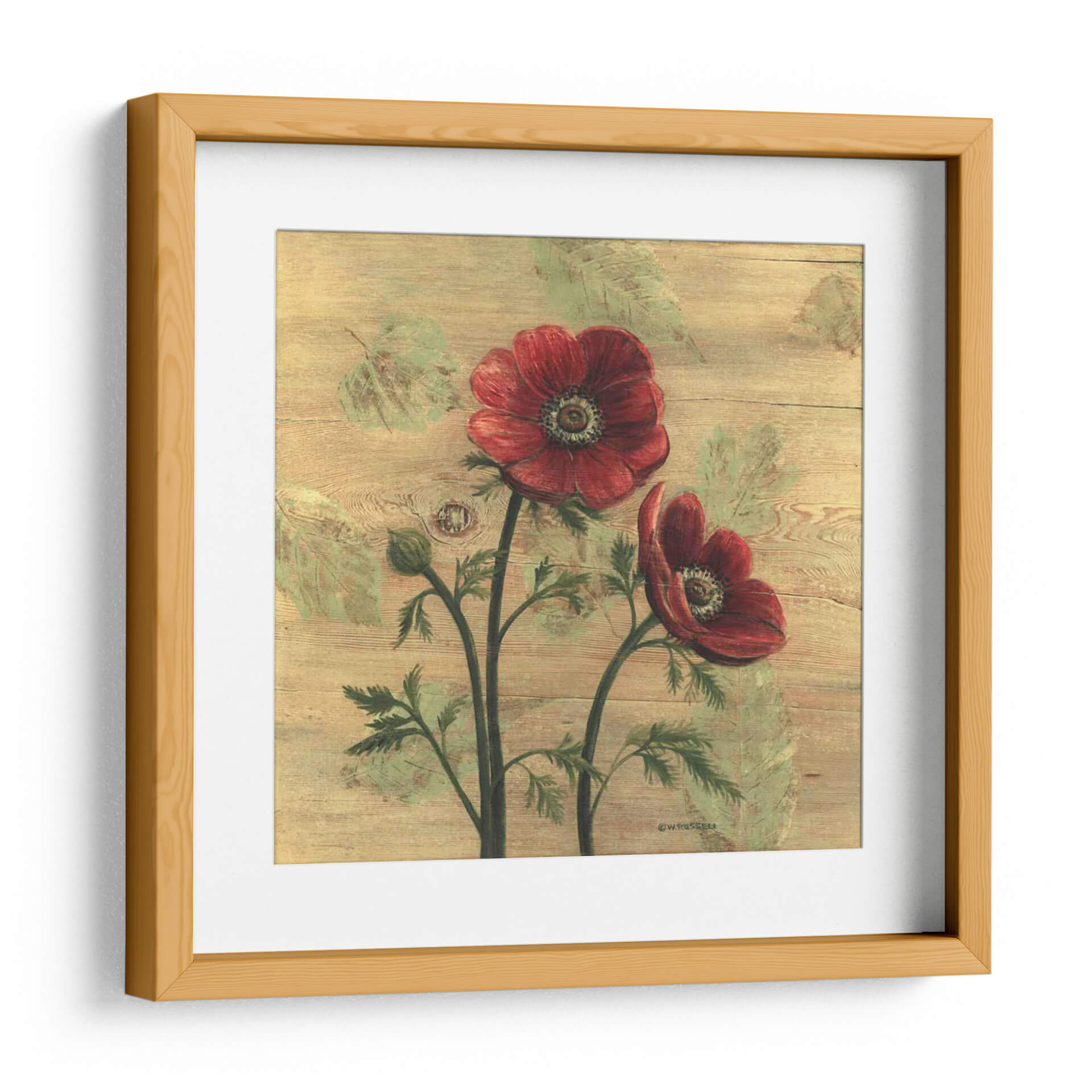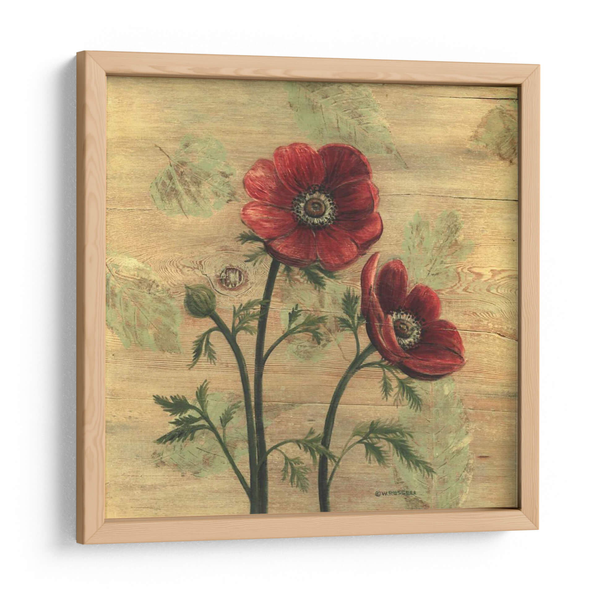 Aporta un toque de la naturaleza y la elegancia atemporal a tu hogar con este cautivador cuadro decorativo de anémonas. La obra "Anemona En Madera" de Wendy Russell presenta dos vibrantes anémonas rojas en plena floración, con delicados capullos y hojas verdes exuberantes, posadas sobre un fondo de textura de madera rústica. Los tonos cálidos y terrosos del fondo, combinados con el intenso rojo de las flores y el verde suave de las hojas, crean una composición visualmente atractiva que evoca una sensación de calma y belleza natural. El estilo pictórico, con sutiles toques de realismo y una pincelada que sugiere la técnica tradicional, confiere a la pieza una profundidad y un carácter únicos. Este cuadro es ideal para añadir un punto de color y sofisticación a cualquier estancia, ya sea una sala de estar, un comedor o un dormitorio. Su diseño orgánico y su paleta de colores armoniosa lo convierten en una adición versátil para estilos decorativos que van desde el rústico y el campestre hasta el contemporáneo y el moderno, infundiendo serenidad y vida a tu espacio. Descubre la belleza de la naturaleza transformada en arte para tu pared.