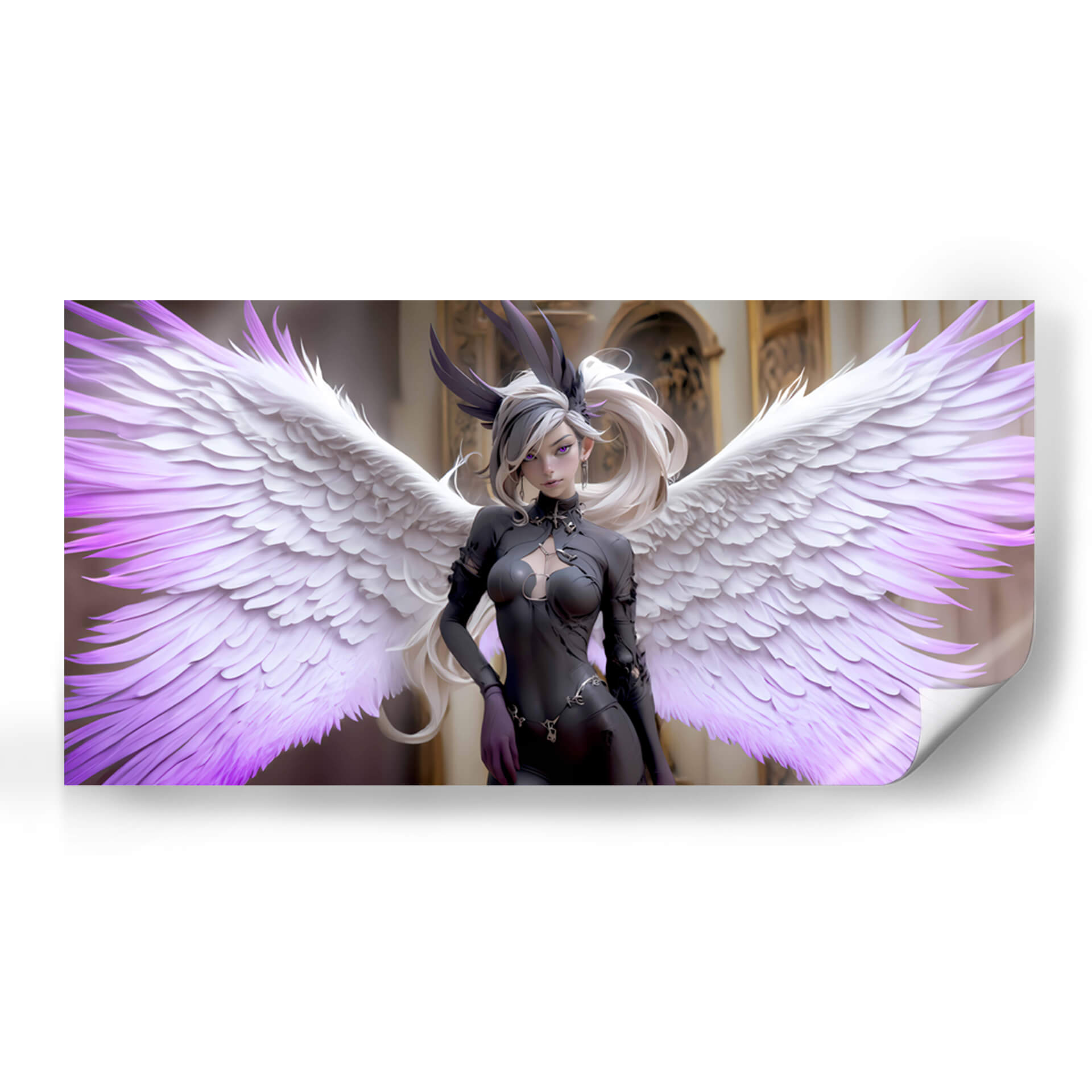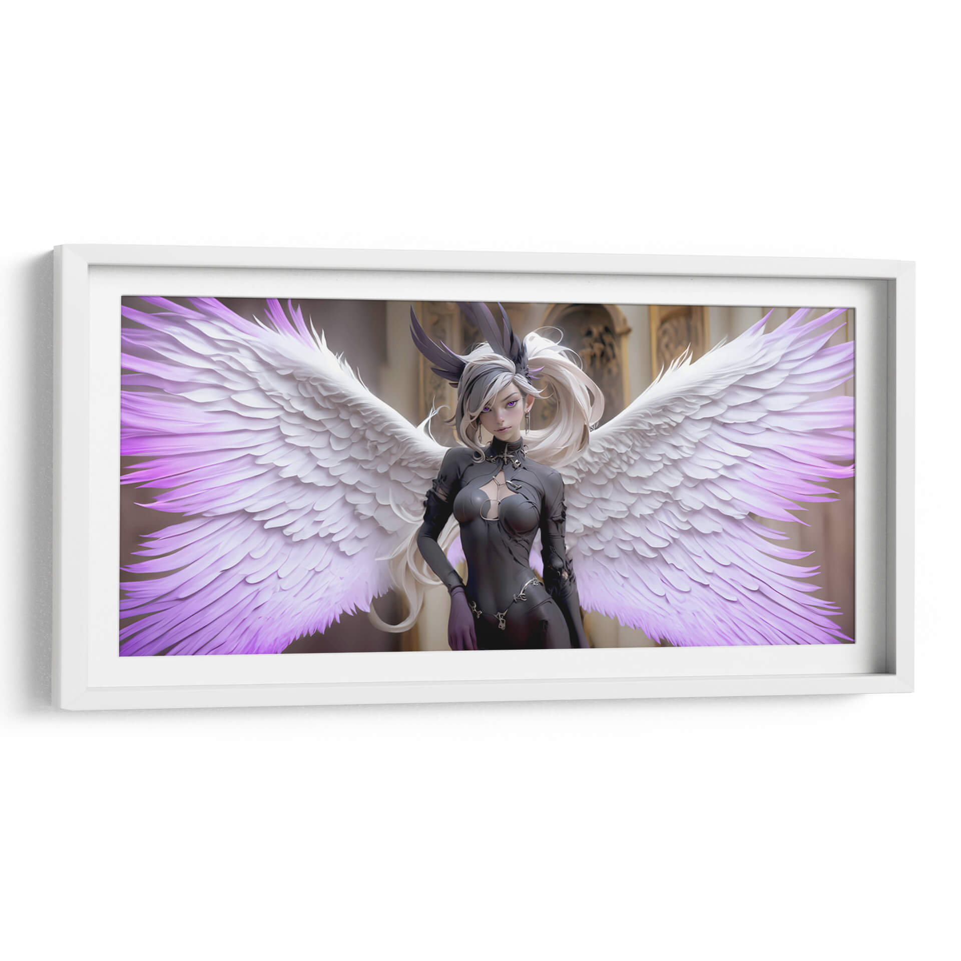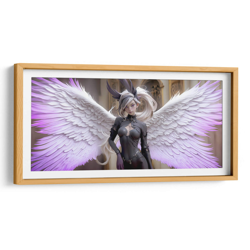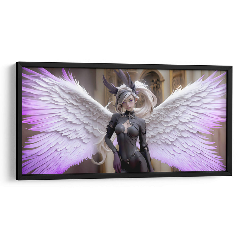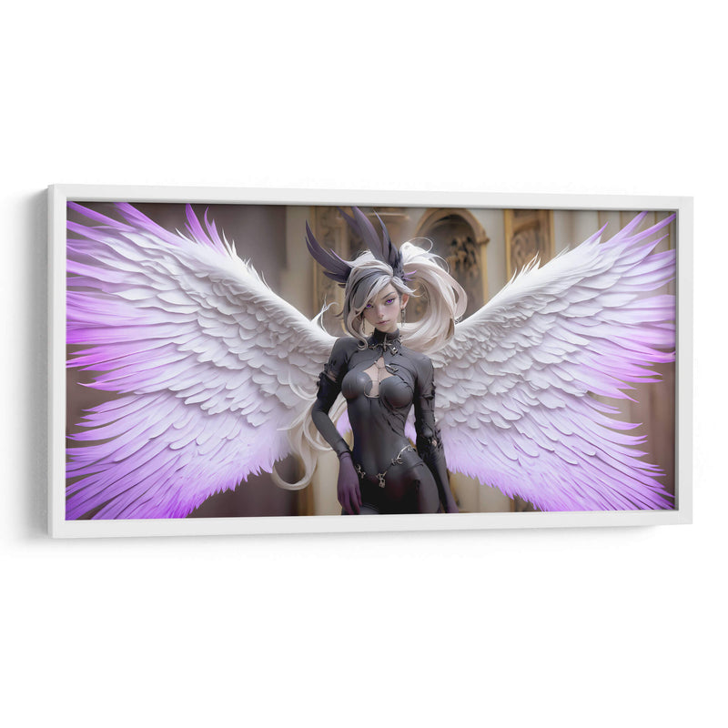 Sumérgete en el misterio y la elegancia con "Ángel Obscuro", una obra de arte digital cautivadora que redefine la estética contemporánea. Esta pieza presenta una figura etérea con imponentes alas, donde la delicadeza de las plumas blancas se funde con sutiles toques de púrpura vibrante, creando un contraste hipnótico. La figura central, vestida con un atuendo oscuro y detallado, irradia una dualidad intrigante, evocando una sensación de poder sereno y una belleza enigmática. El fondo, de arquitectura clásica y tonos dorados, contrasta con la figura moderna, anclando la composición y añadiendo profundidad. "Ángel Obscuro" es ideal para espacios que buscan un toque de sofisticación audaz y un aire de fantasía controlada. Su estilo único, que combina elementos de fantasía oscura y arte digital moderno, lo convierte en una adición impactante para cualquier colección de decoración de pared, ya sea en una sala de estar moderna, un estudio creativo o un dormitorio con carácter. Esta obra invita a la contemplación, añadiendo un elemento de intriga y belleza a tu entorno.