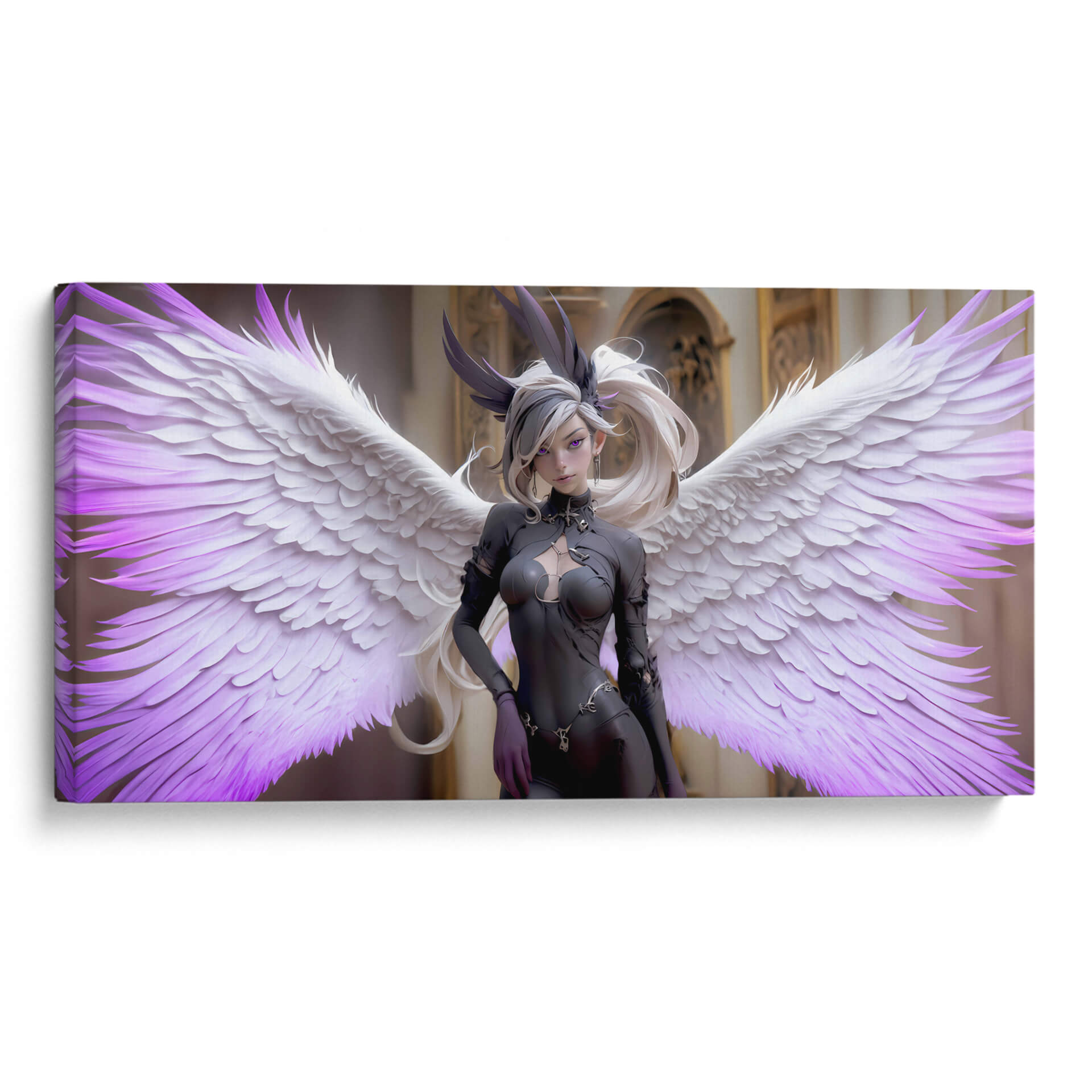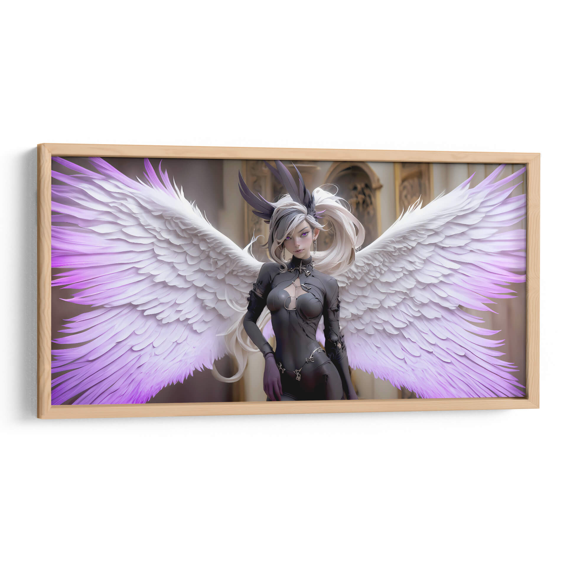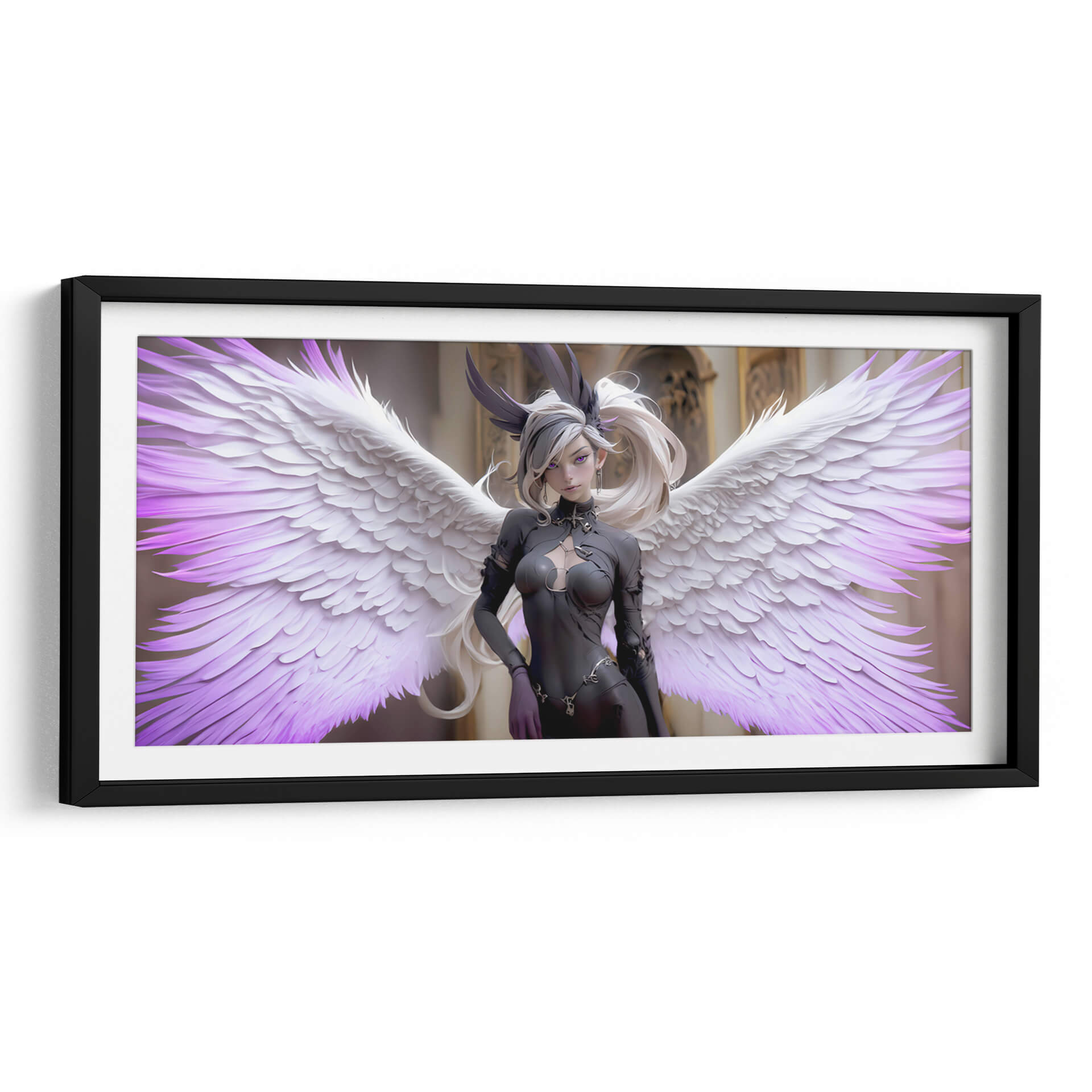 Sumérgete en el misterio y la elegancia con "Ángel Obscuro", una obra de arte digital cautivadora que redefine la estética contemporánea. Esta pieza presenta una figura etérea con imponentes alas, donde la delicadeza de las plumas blancas se funde con sutiles toques de púrpura vibrante, creando un contraste hipnótico. La figura central, vestida con un atuendo oscuro y detallado, irradia una dualidad intrigante, evocando una sensación de poder sereno y una belleza enigmática. El fondo, de arquitectura clásica y tonos dorados, contrasta con la figura moderna, anclando la composición y añadiendo profundidad. "Ángel Obscuro" es ideal para espacios que buscan un toque de sofisticación audaz y un aire de fantasía controlada. Su estilo único, que combina elementos de fantasía oscura y arte digital moderno, lo convierte en una adición impactante para cualquier colección de decoración de pared, ya sea en una sala de estar moderna, un estudio creativo o un dormitorio con carácter. Esta obra invita a la contemplación, añadiendo un elemento de intriga y belleza a tu entorno.