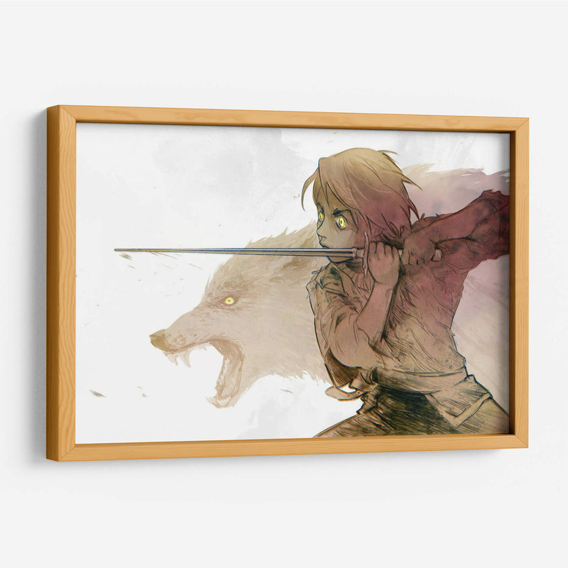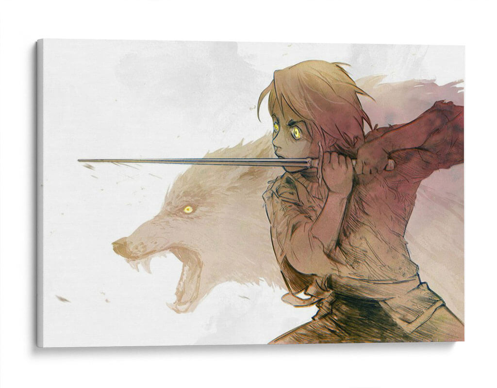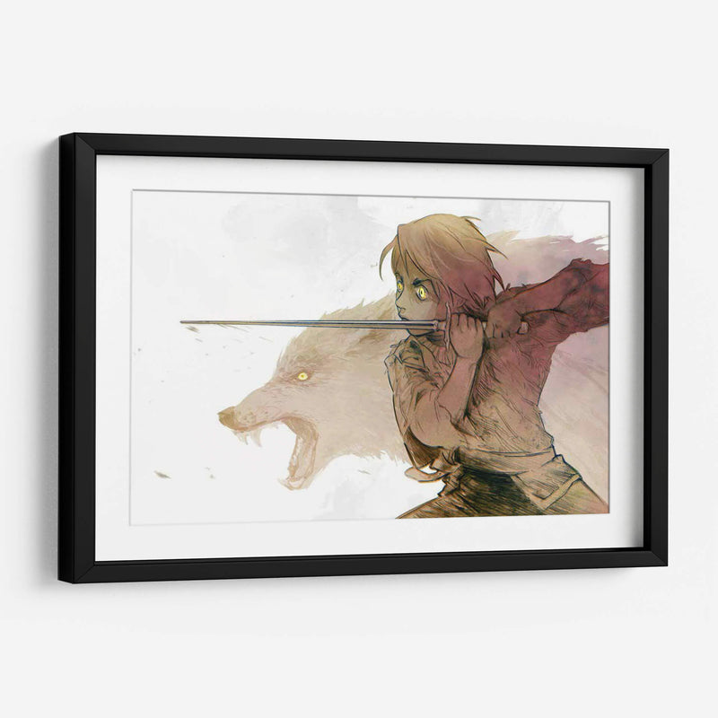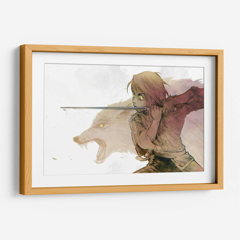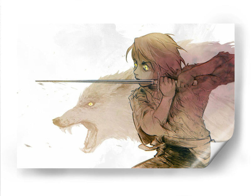 Adéntrate en un mundo de fantasía y valentía con este cautivador cuadro decorativo 'Arya con Nymeria'. La obra representa una escena dinámica y llena de tensión, con una figura joven en primer plano empuñando con determinación una espada, mientras que la silueta amenazante de un lobo salvaje, Nymeria, emerge del fondo con la boca abierta y mirada feroz. La paleta de colores, dominada por tonos tierra, ocres y sutiles toques de rojo, junto con el contraste de los ojos amarillos brillantes del lobo y la figura, crea una atmósfera de intriga y poder. El estilo artístico, que evoca ilustraciones de novelas gráficas o animaciones de fantasía, es ideal para quienes buscan añadir un toque de carácter y narrativa a sus espacios. Este cuadro decorativo es perfecto para una sala de estar moderna, una oficina con personalidad o incluso un dormitorio temático, inyectando una dosis de aventura y fuerza visual. Su composición dramática y la conexión entre la figura y el lobo invitan a la contemplación y la conversación, convirtiéndolo en un punto focal inolvidable. Transforma tu pared con esta pieza que evoca coraje, instinto y la fuerza indomable de la naturaleza.