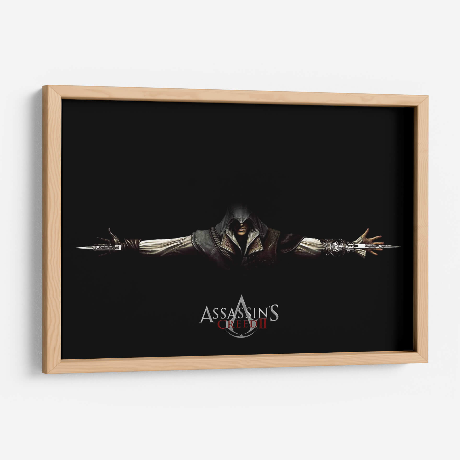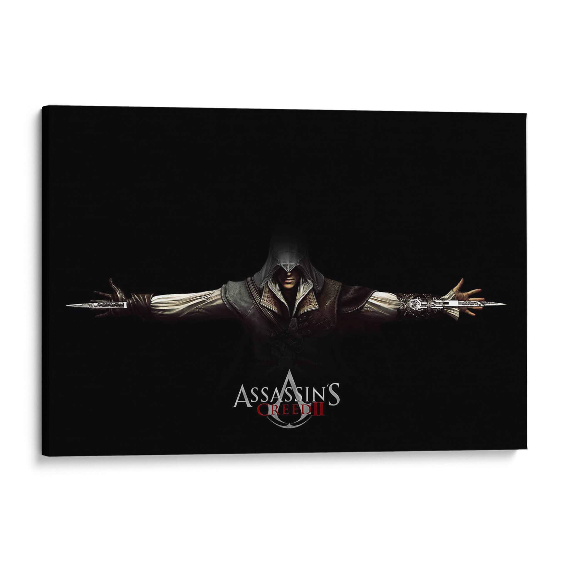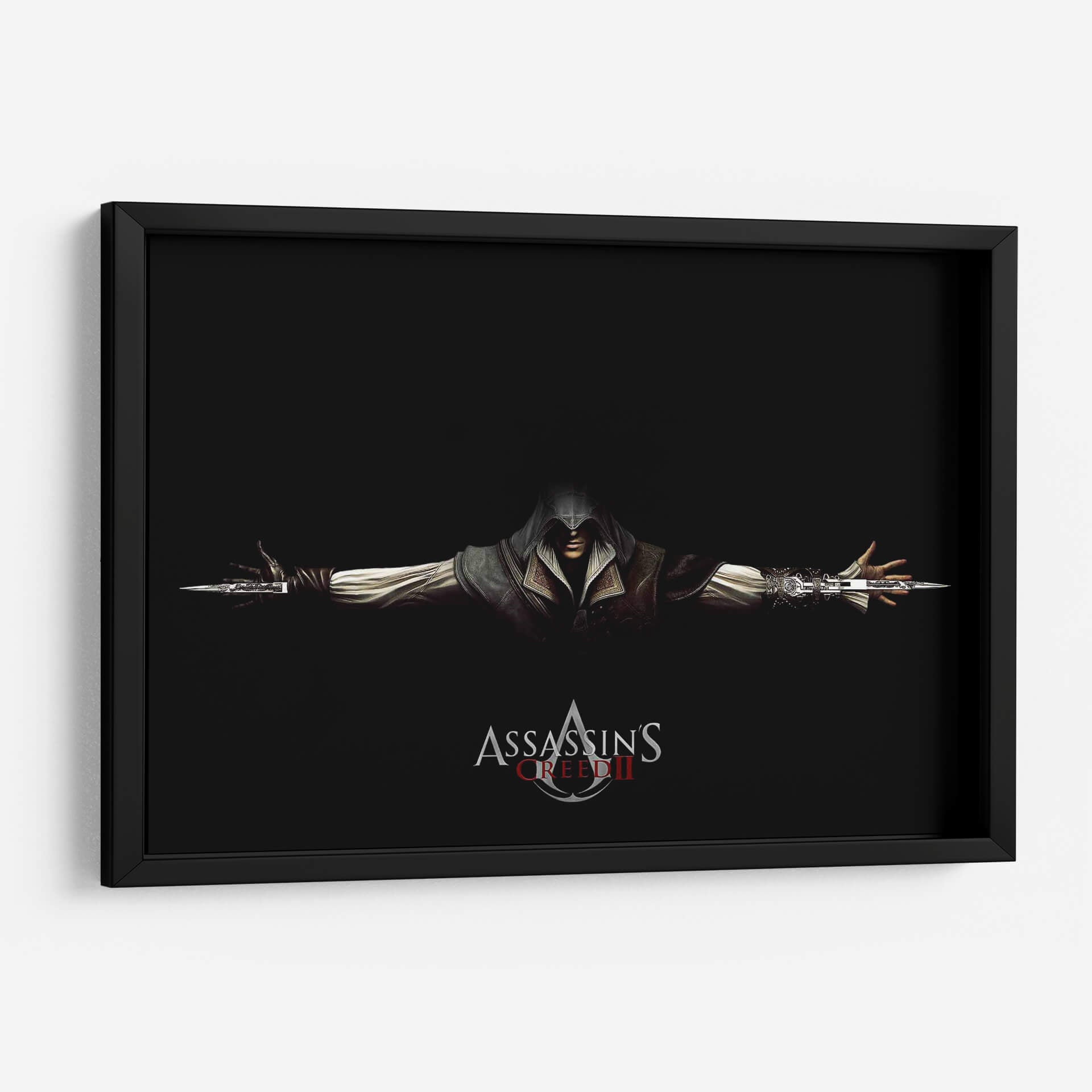Sumérgete en el misterio y la acción con este impactante cuadro decorativo inspirado en el legendario videojuego Assassin's Creed II. La obra presenta una figura enigmática con capucha, cuyas manos extienden las icónicas dagas ocultas, listas para la acción. Predomina un fondo oscuro e intenso que resalta la figura central, creando una atmósfera de suspense y elegancia letal. Los detalles en la vestimenta, como el cuero y las telas de época, junto con los intrincados grabados de las dagas, aportan un realismo cautivador. La paleta de colores, dominada por negros profundos y sutiles toques de luz en la piel y las armas, intensifica el drama y la intriga de la escena. Este cuadro es una pieza central perfecta para cualquier aficionado a la saga, aportando un toque de sofisticación oscura y aventura a salas de estar, estudios o áreas de entretenimiento. Ideal para quienes buscan una decoración audaz y con carácter que evoque historia, sigilo y legendarios enfrentamientos. Transforma tu espacio con la esencia de una de las aventuras más aclamadas, capturando la dualidad entre el arte y la letalidad.