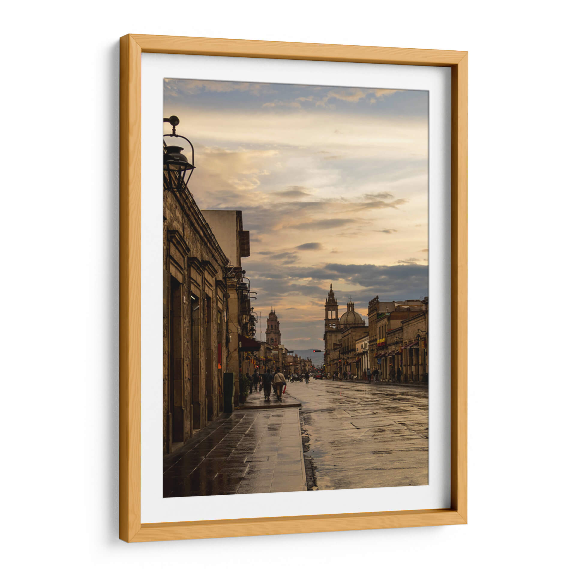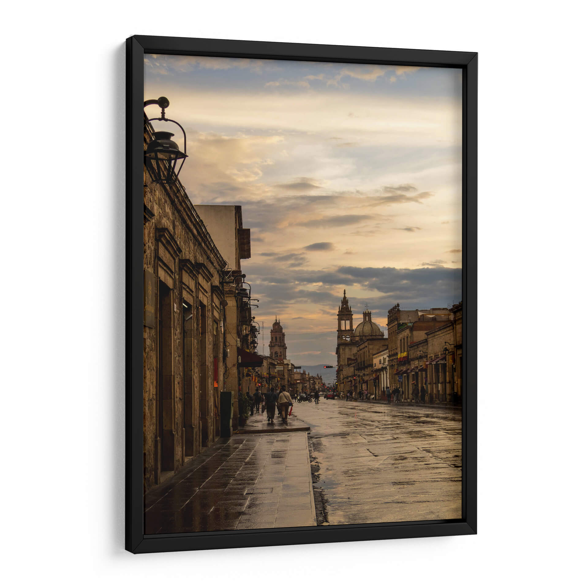 Captura la esencia de la arquitectura histórica y la atmósfera melancólica de una ciudad bajo la luz dorada del atardecer con este cuadro decorativo. La obra retrata una calle empedrada, aún húmeda por la lluvia reciente, que refleja las luces tenues y los colores cálidos del cielo crepuscular. Las fachadas de edificios coloniales flanquean la avenida, con detalles arquitectónicos que evocan el pasado, mientras que en el fondo se alzan majestuosas torres y cúpulas, testigos de la historia. Las figuras humanas caminando por la acera añaden una escala sutil y un toque de vida cotidiana a la escena. La paleta de colores, dominada por tonos ocres, dorados, grises y azules suaves, crea una atmósfera serena y contemplativa. Este cuadro de calle histórica es ideal para quienes buscan añadir un toque de elegancia, nostalgia y profundidad a su hogar u oficina. Imagina esta pieza como un punto focal en tu sala de estar, aportando calma y un sentido de viaje a través del tiempo, o como un recordatorio de la belleza efímera de los momentos post-lluvia en un dormitorio o estudio. Es una invitación a detenerse y apreciar la belleza en los detalles urbanos y en la luz cambiante del día.