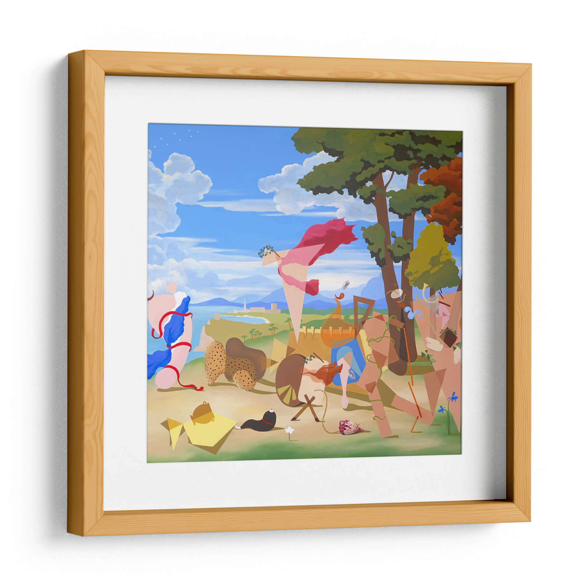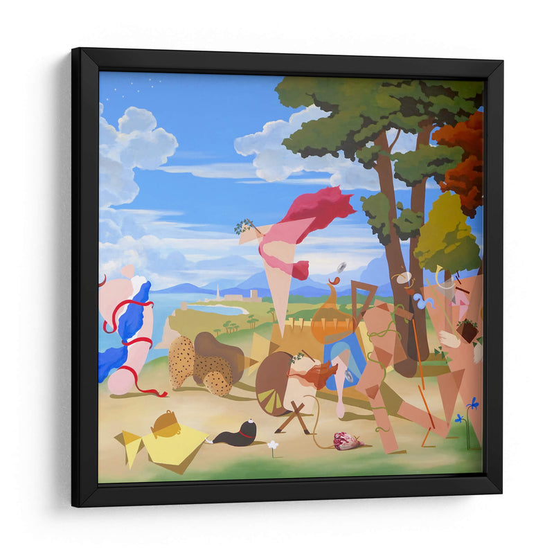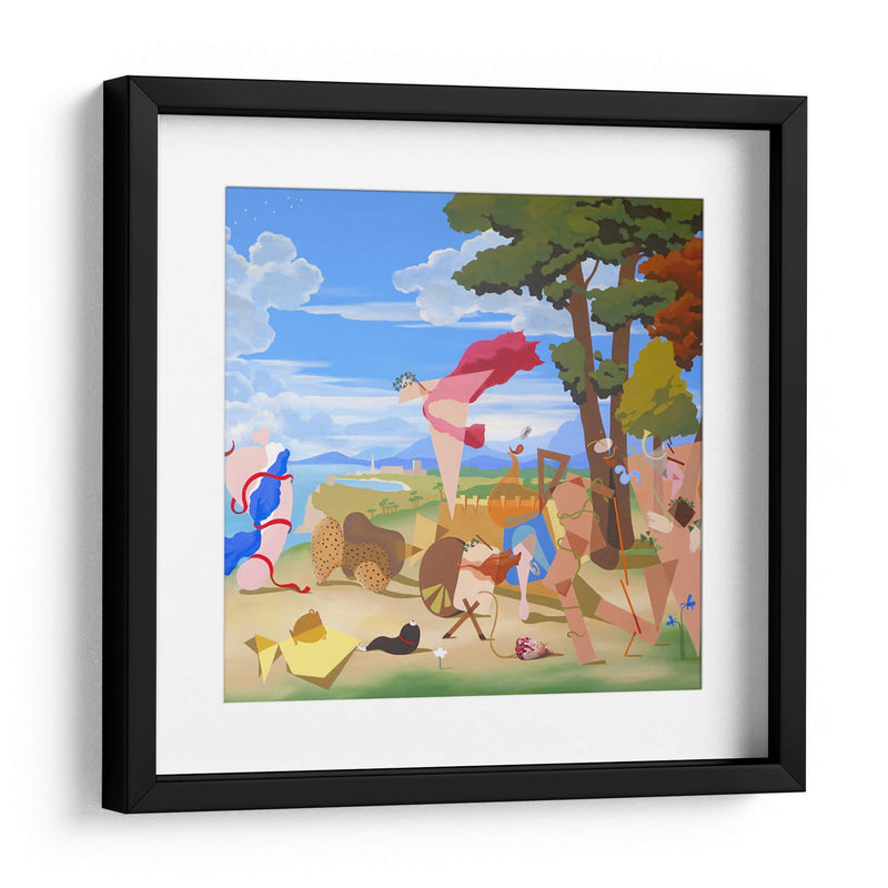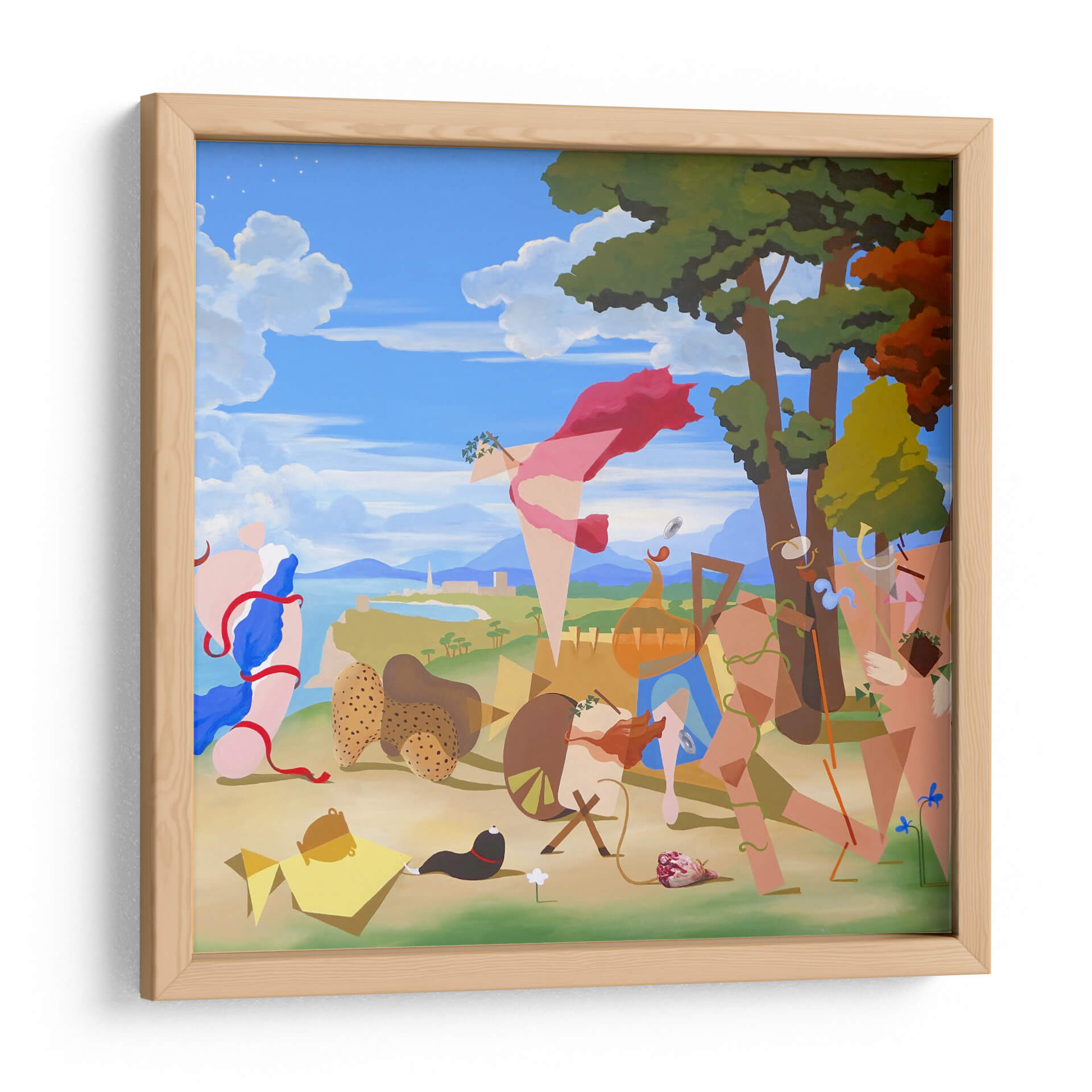 Sumérgete en la vibrante narrativa visual de "Baco y Ariadna Abstracto", una obra que reinventa un mito clásico con una audacia contemporánea. Esta pieza cautiva con su composición dinámica y una paleta de colores que evoca la serenidad de un paisaje mediterráneo bañado por un cielo azul intenso y nubes algodonosas. Las figuras, representadas a través de formas geométricas y fluidas, danzan en una escena que mezcla lo terrenal con lo onírico, creando un ambiente de celebración y vitalidad.