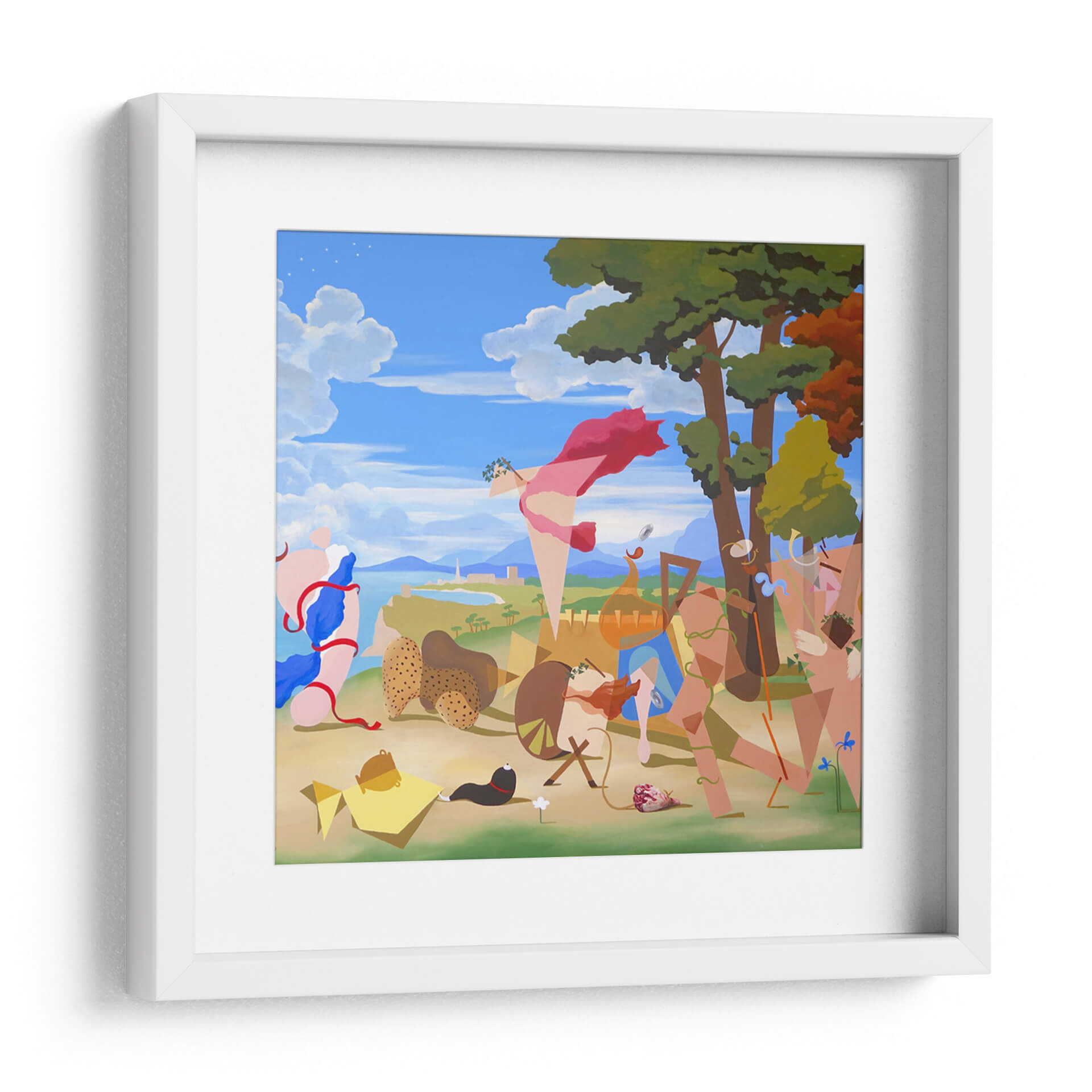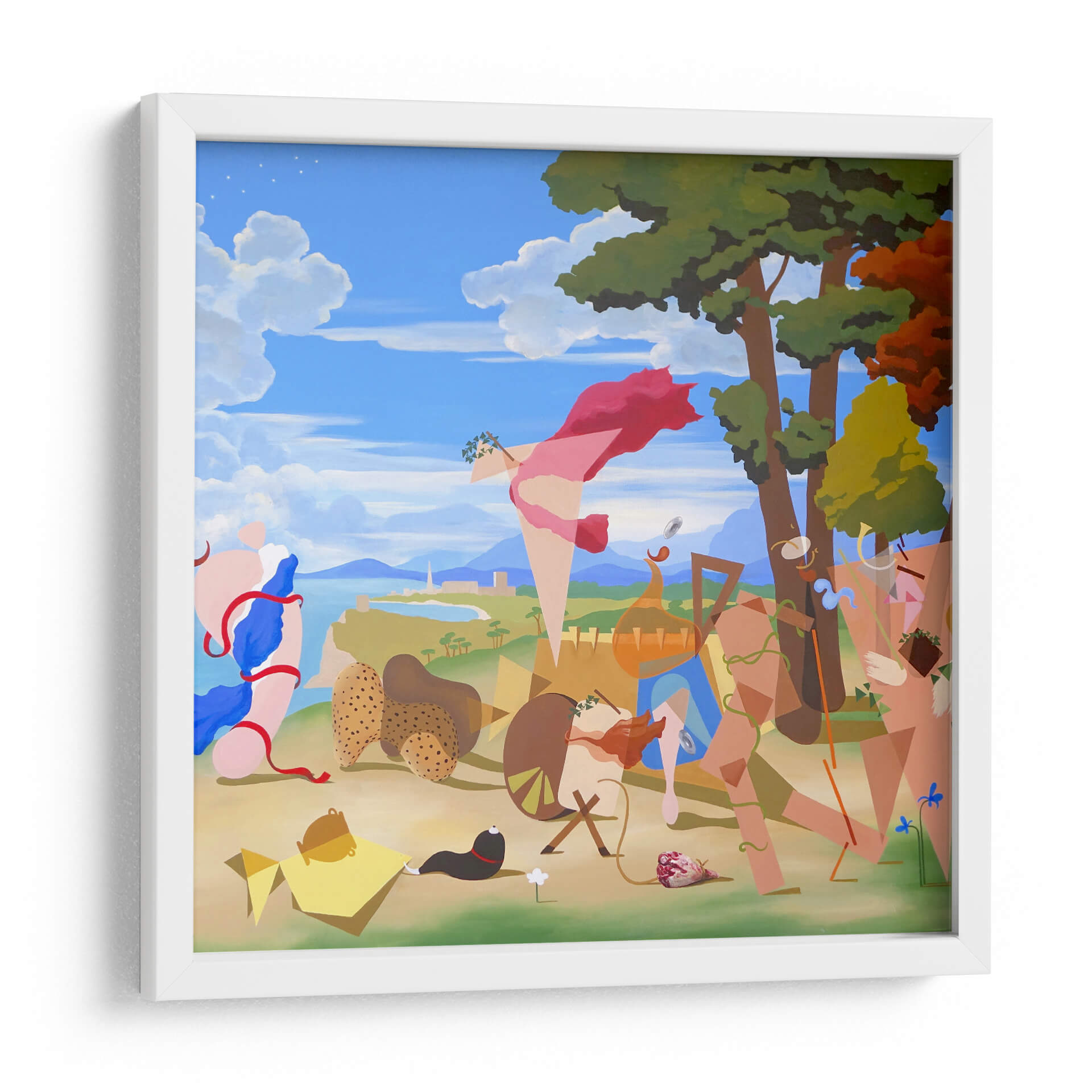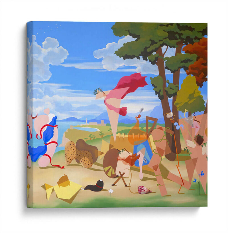 Sumérgete en la vibrante narrativa visual de "Baco y Ariadna Abstracto", una obra que reinventa un mito clásico con una audacia contemporánea. Esta pieza cautiva con su composición dinámica y una paleta de colores que evoca la serenidad de un paisaje mediterráneo bañado por un cielo azul intenso y nubes algodonosas. Las figuras, representadas a través de formas geométricas y fluidas, danzan en una escena que mezcla lo terrenal con lo onírico, creando un ambiente de celebración y vitalidad.
