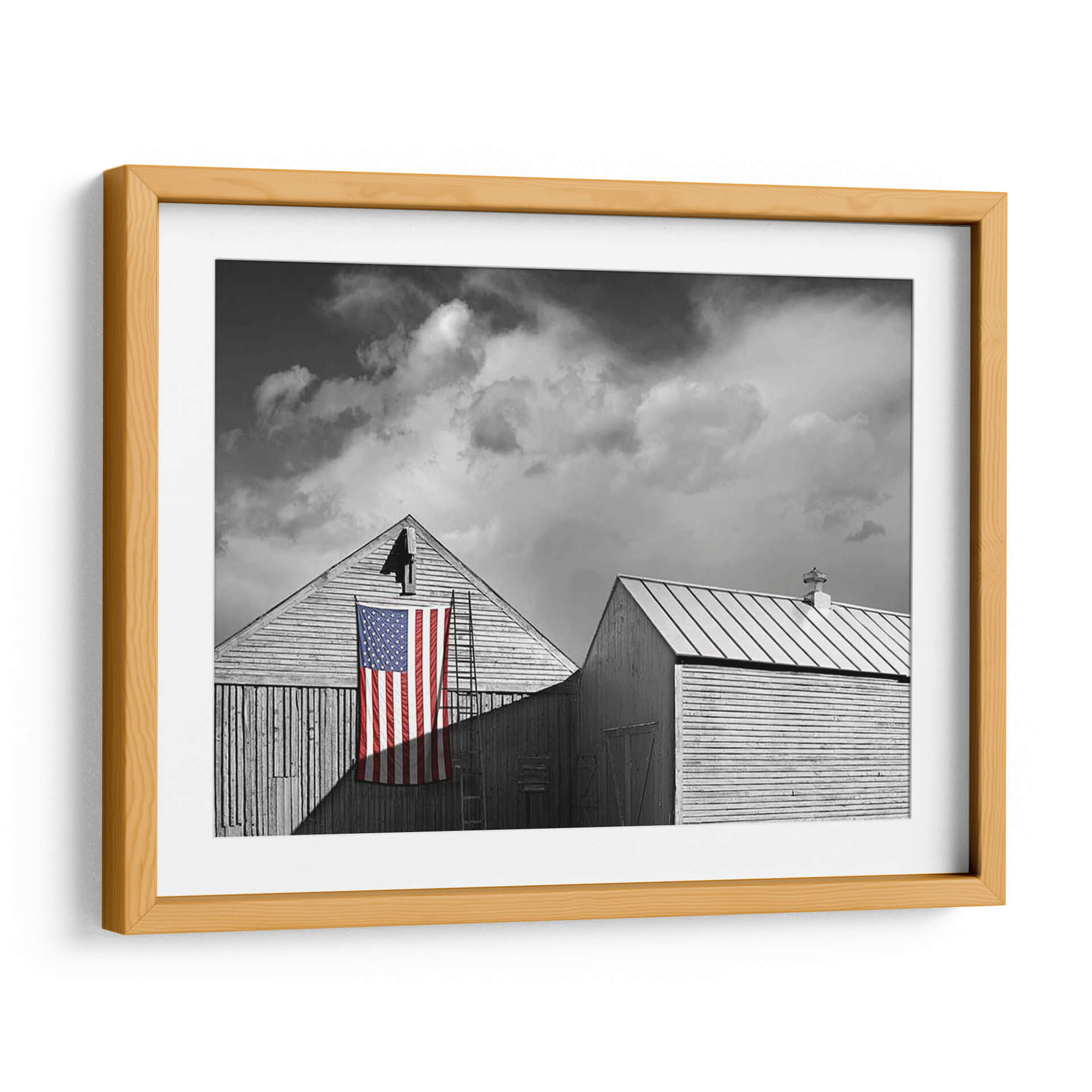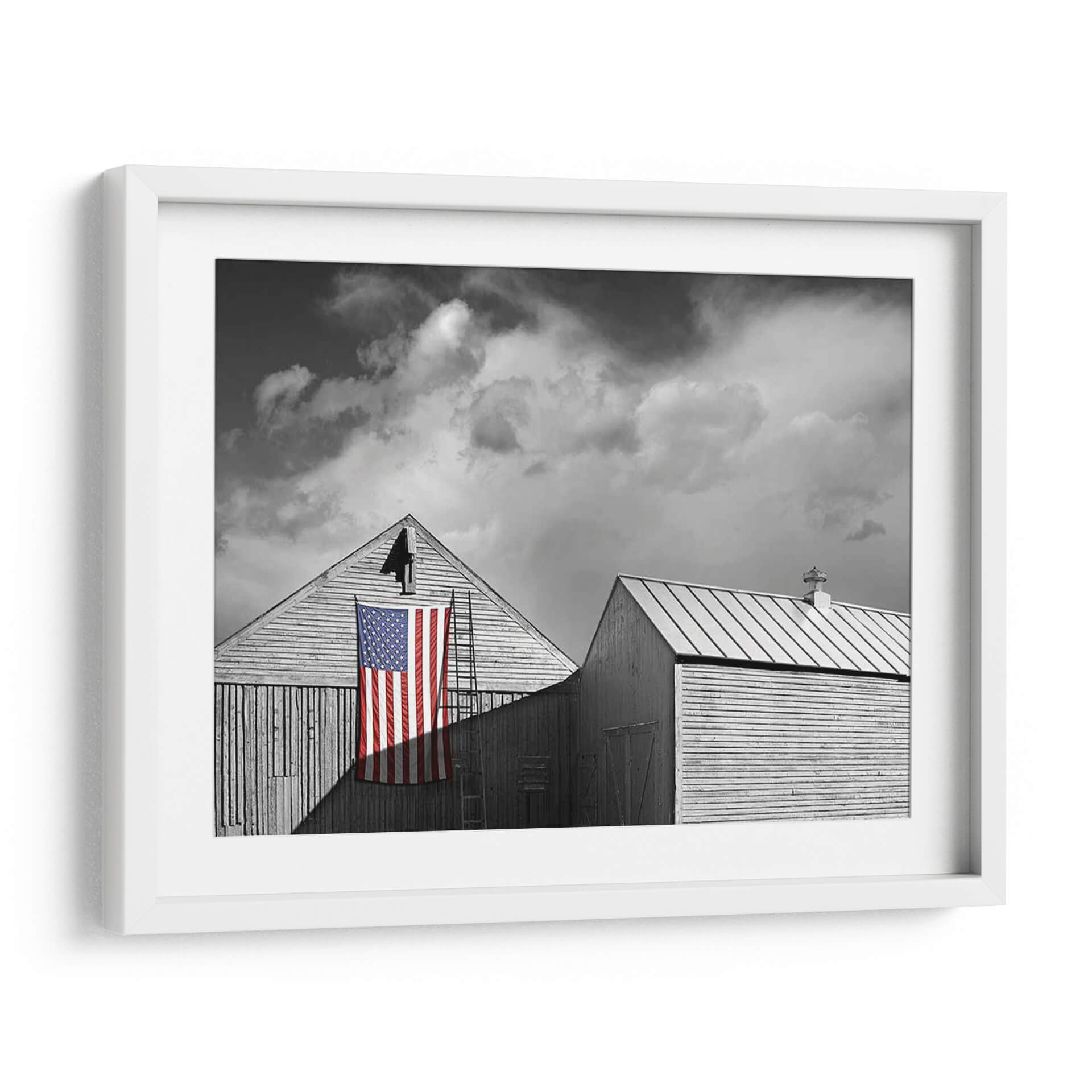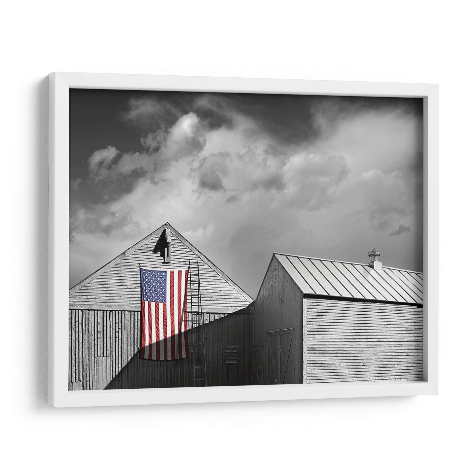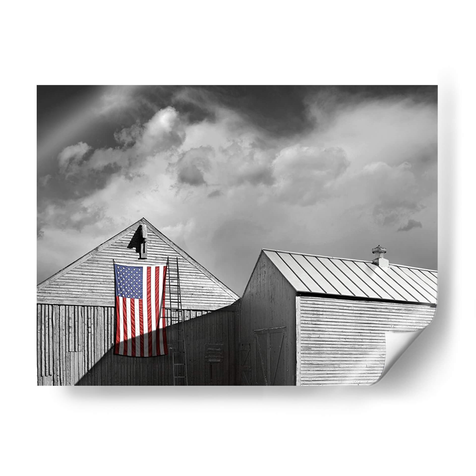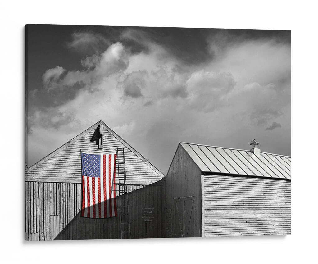 Captura la esencia de la tradición y el espíritu americano con "Banderas De Nuestros Agricultores V", una obra de arte digital del artista James McLoughlin. Esta pieza en blanco y negro, con el vibrante toque de color de la bandera estadounidense, evoca una sensación de nostalgia y orgullo patriótico. La composición, centrada en dos graneros de madera rústica y una escalera apoyada contra uno de ellos, crea una narrativa visual potente. Las nubes dramáticas en el cielo añaden profundidad y un toque de melancolía, contrastando con la firmeza de la bandera. El estilo fotográfico y la paleta monocromática resaltan la textura de la madera y la simplicidad de las formas, haciendo de este cuadro un elemento decorativo impactante. Ideal para espacios que buscan un toque de carácter y una conexión con la historia, como una sala de estar, un estudio o una oficina. "Banderas De Nuestros Agricultores V" es más que una decoración; es una declaración de identidad y un punto focal que invita a la reflexión sobre los valores y la herencia.
