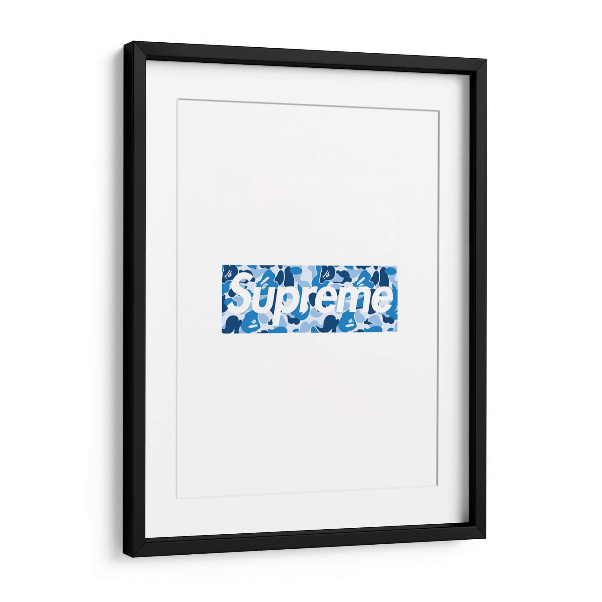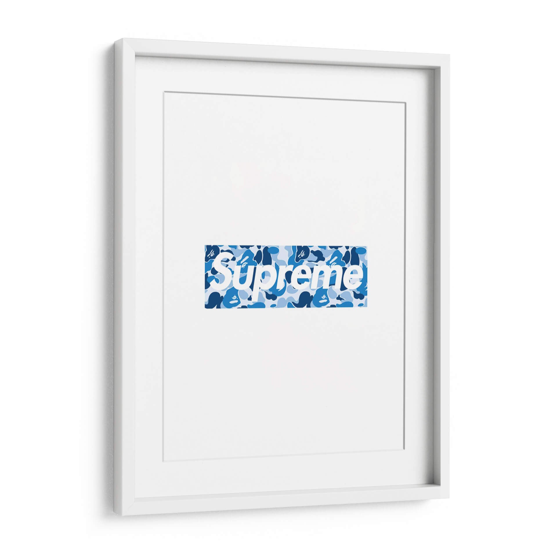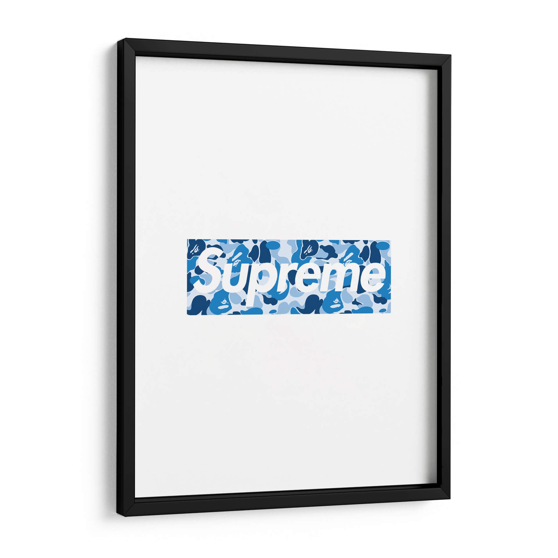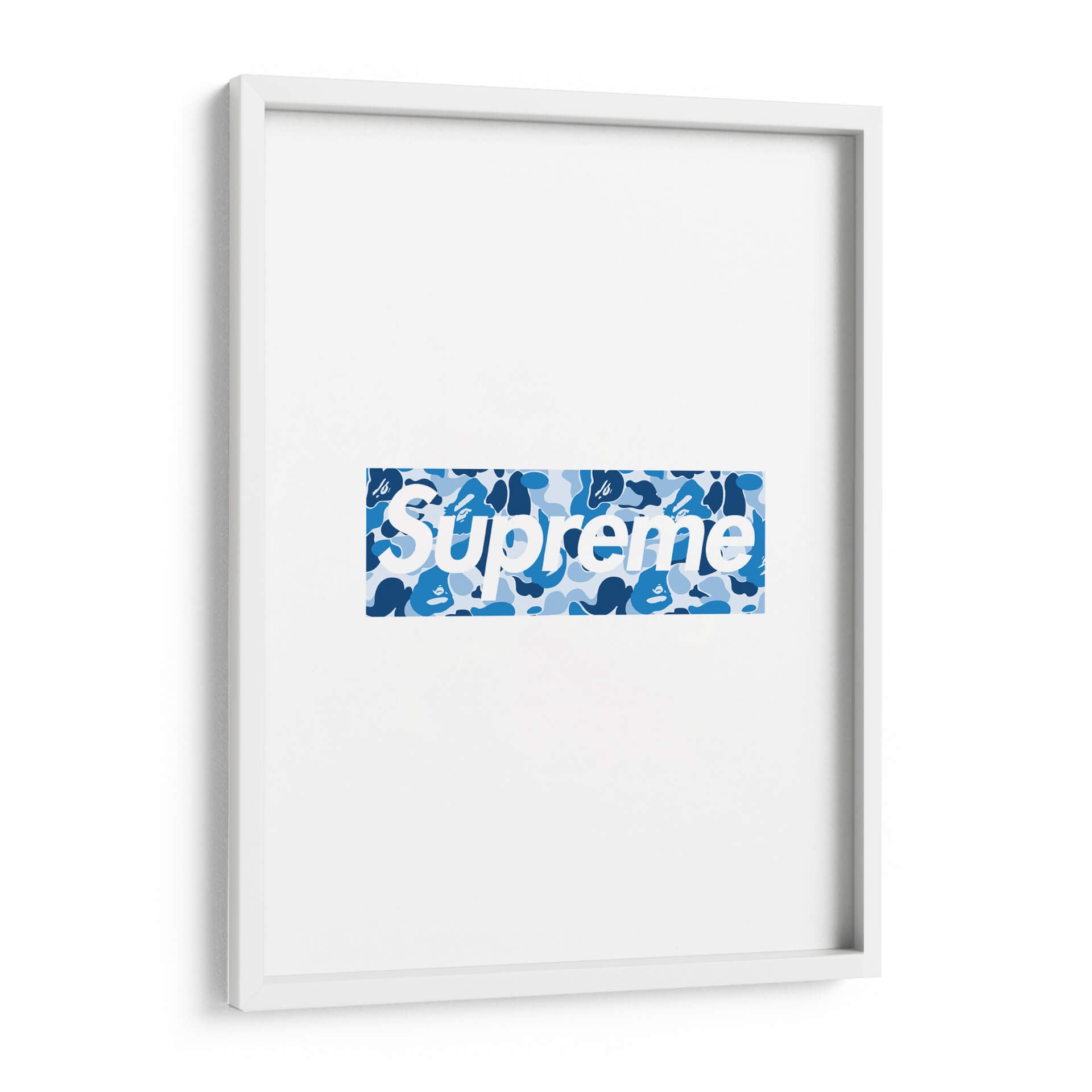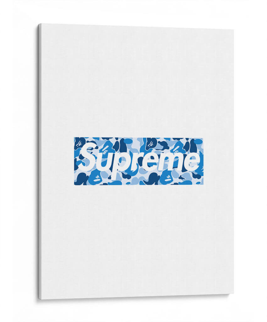 Este llamativo cuadro decorativo presenta un diseño icónico de "Bape X Sup Blue Box Logo", una obra que combina la estética urbana y la moda de vanguardia. La composición se centra en un logo rectangular con el texto "Supreme" en blanco, superpuesto sobre un vibrante patrón de camuflaje en tonos azules. El contraste entre el blanco nítido del texto y las diversas tonalidades de azul del camuflaje crea un efecto visual dinámico y moderno. El patrón de camuflaje, con sus formas irregulares y capas de azul claro, medio y oscuro, añade profundidad y textura a la pieza, evocando una sensación de energía urbana y estilo callejero. Este cuadro es ideal para espacios que buscan un toque contemporáneo y audaz, como salas de estar modernas, oficinas de diseño o dormitorios juveniles. Su diseño reconocible lo convierte en un punto focal instantáneo, capaz de dialogar con decoraciones minimalistas o complementar ambientes más eclécticos. Es una pieza perfecta para los amantes de la cultura sneaker y streetwear, aportando un aire de exclusividad y tendencia a cualquier pared.