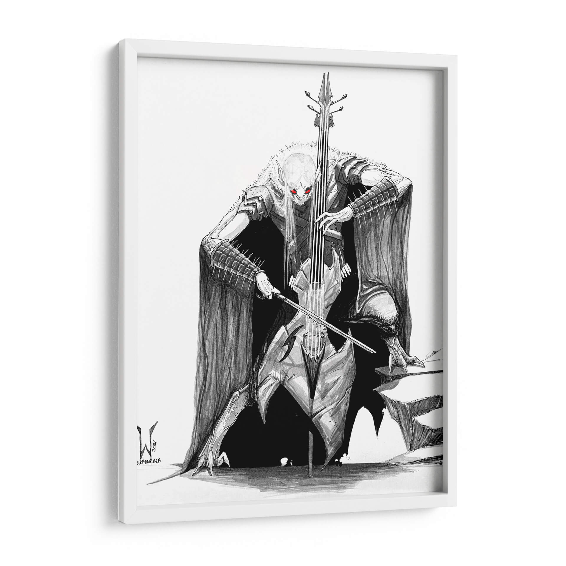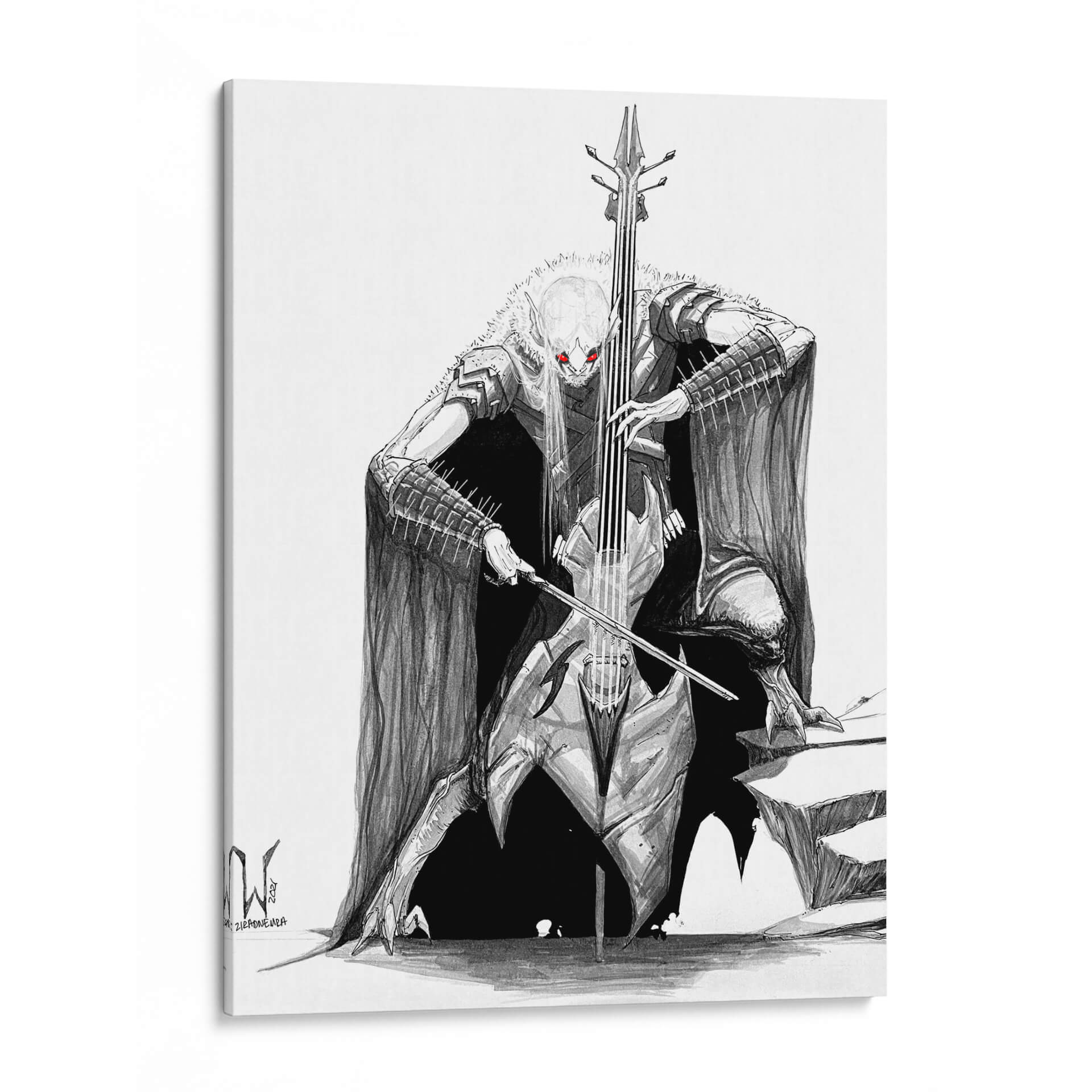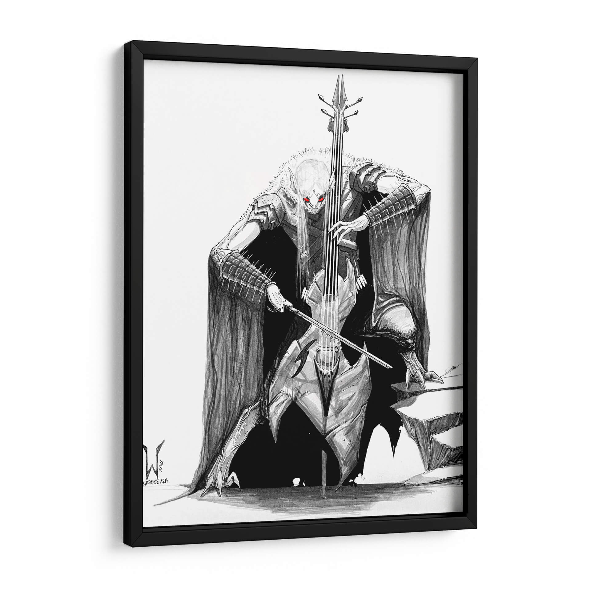 Sumérgete en el misterio y la potencia de la obra 'BlackMetal CELLO Bat', una pieza artística que fusiona lo macabro con lo melódico. Este cuadro decorativo, obra del artista siulziradnemra, presenta una figura imponente inspirada en el imaginario del heavy metal y el gótico, tocando un violonchelo con una intensidad que parece resonar en el espacio. La paleta de colores se centra en el blanco y negro, con vibrantes acentos rojos en los ojos de la figura, creando un contraste dramático y una atmósfera cargada de energía y fantasía. El estilo de ilustración detallada y sombreada aporta profundidad y realismo a esta criatura fantástica, capturando la esencia del black metal y su estética oscura. Es una pieza ideal para quienes buscan un arte de pared audaz y distintivo, capaz de convertirse en el punto focal de una sala de estar, un estudio o incluso una oficina con carácter. Si buscas un cuadro que evoque fuerza, misterio y un toque de rebeldía, 'BlackMetal CELLO Bat' es la elección perfecta para añadir personalidad y un relato visual cautivador a tu decoración.
