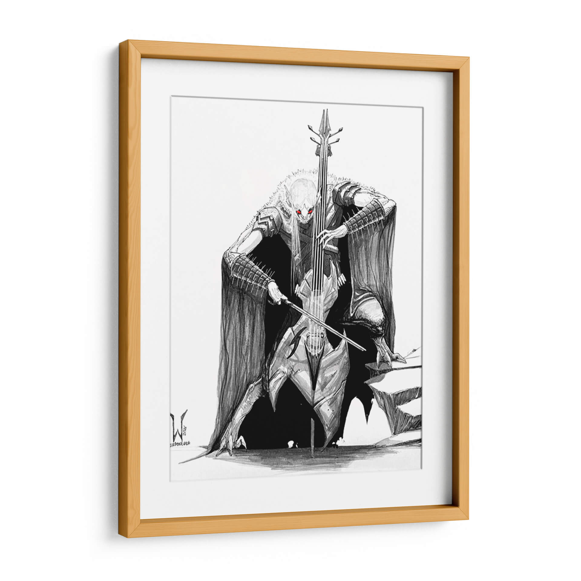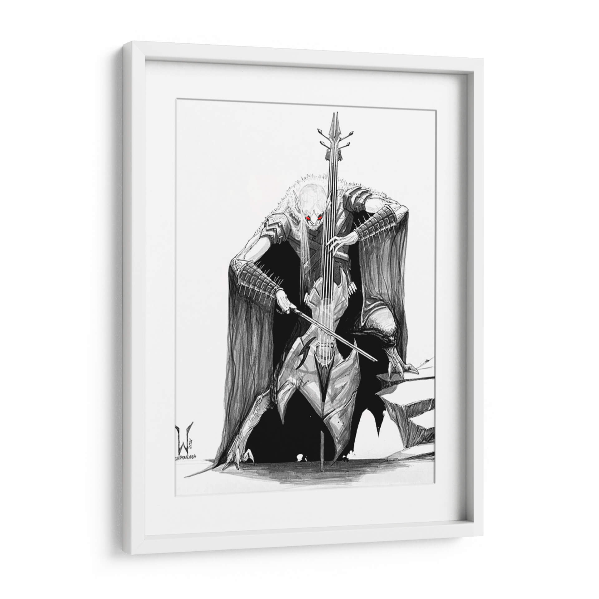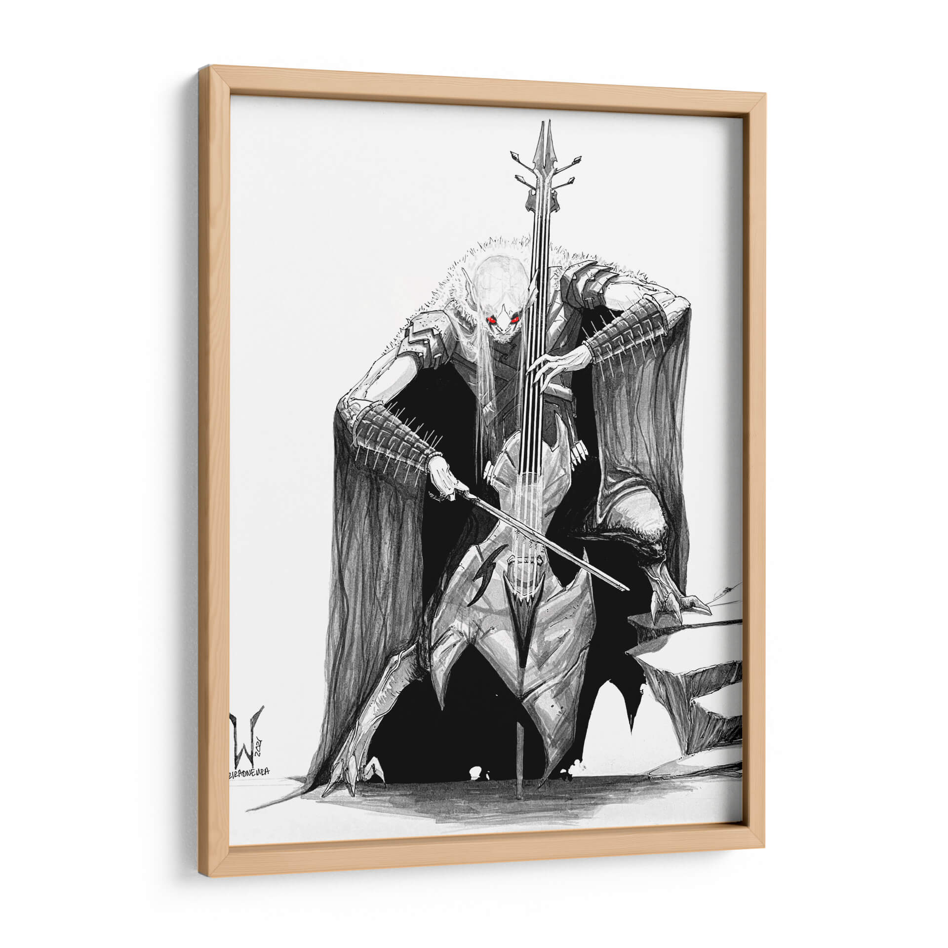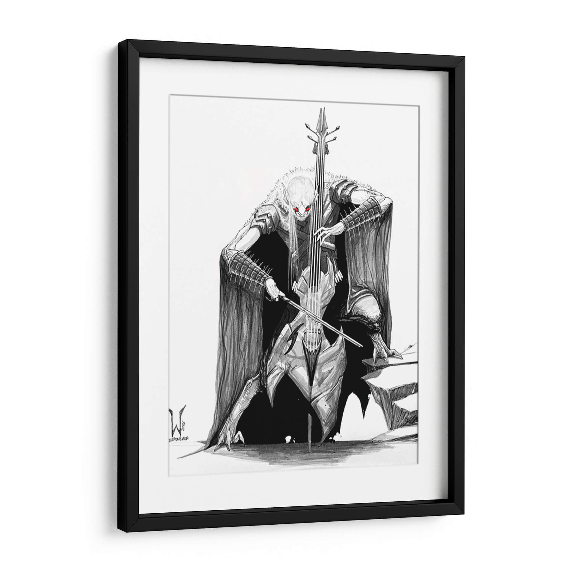 Sumérgete en el misterio y la potencia de la obra 'BlackMetal CELLO Bat', una pieza artística que fusiona lo macabro con lo melódico. Este cuadro decorativo, obra del artista siulziradnemra, presenta una figura imponente inspirada en el imaginario del heavy metal y el gótico, tocando un violonchelo con una intensidad que parece resonar en el espacio. La paleta de colores se centra en el blanco y negro, con vibrantes acentos rojos en los ojos de la figura, creando un contraste dramático y una atmósfera cargada de energía y fantasía. El estilo de ilustración detallada y sombreada aporta profundidad y realismo a esta criatura fantástica, capturando la esencia del black metal y su estética oscura. Es una pieza ideal para quienes buscan un arte de pared audaz y distintivo, capaz de convertirse en el punto focal de una sala de estar, un estudio o incluso una oficina con carácter. Si buscas un cuadro que evoque fuerza, misterio y un toque de rebeldía, 'BlackMetal CELLO Bat' es la elección perfecta para añadir personalidad y un relato visual cautivador a tu decoración.