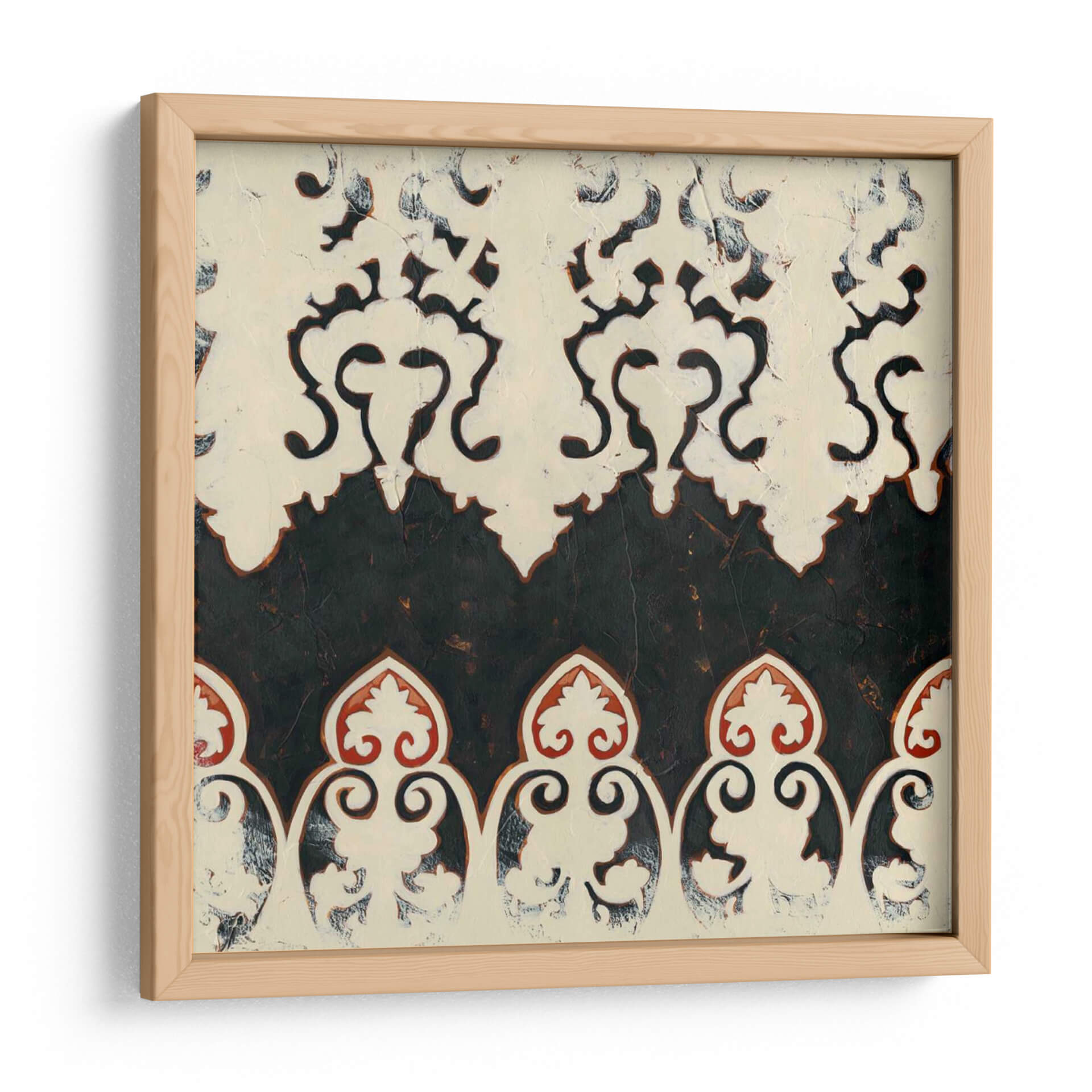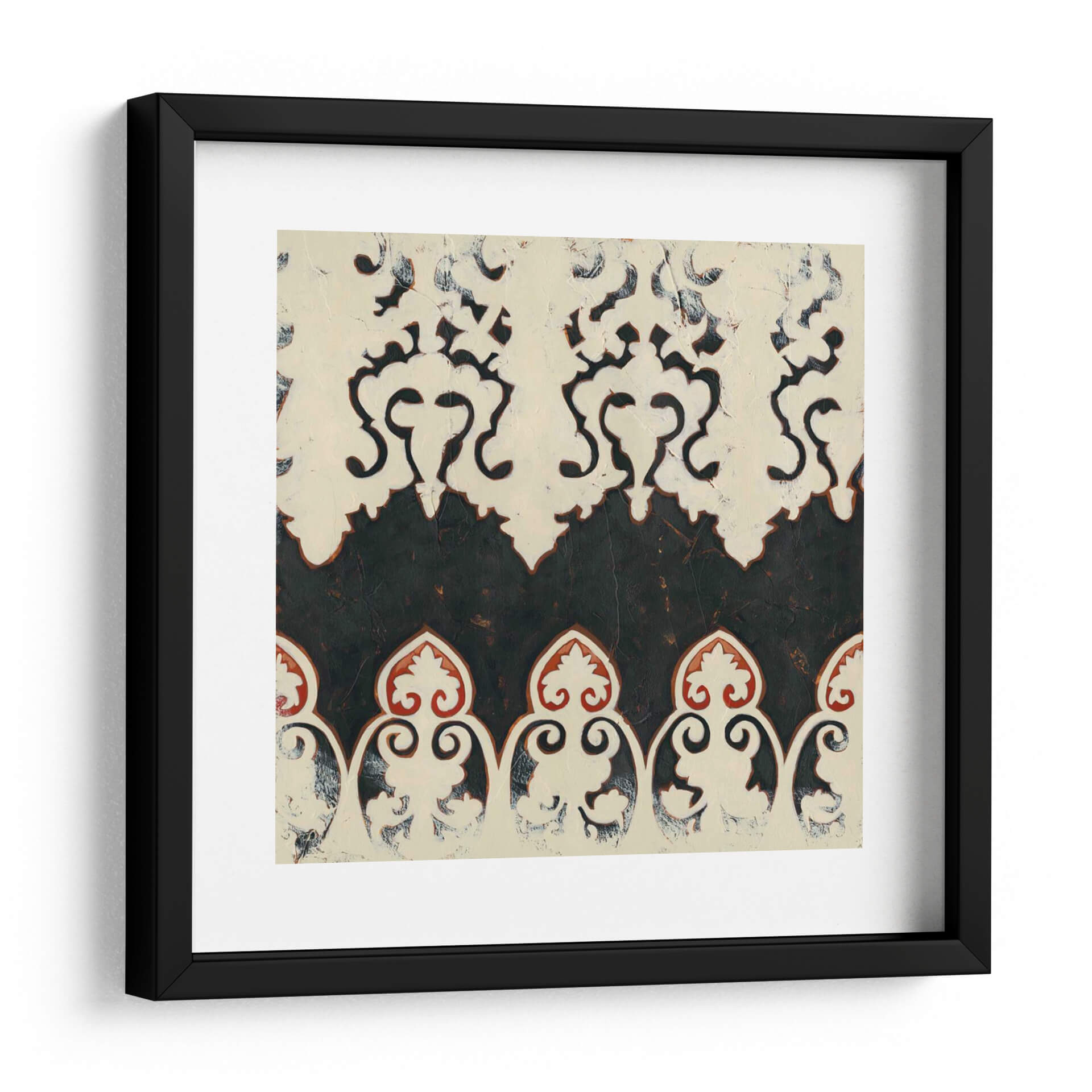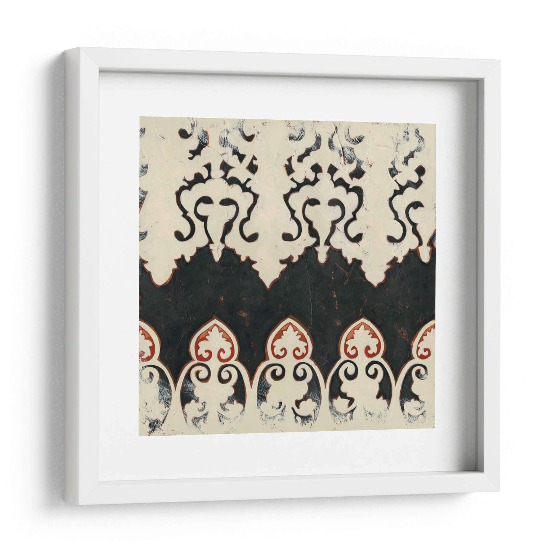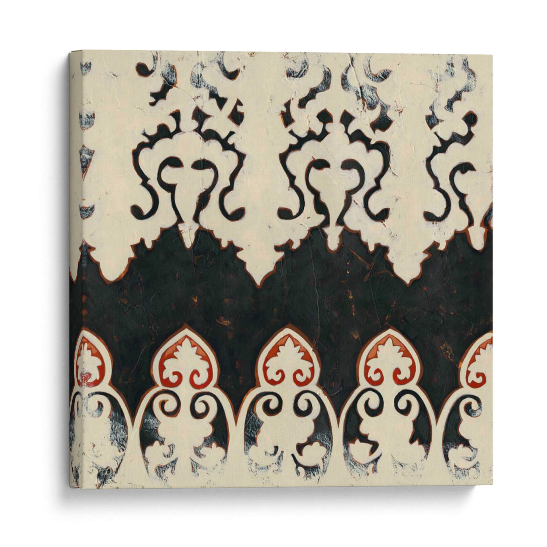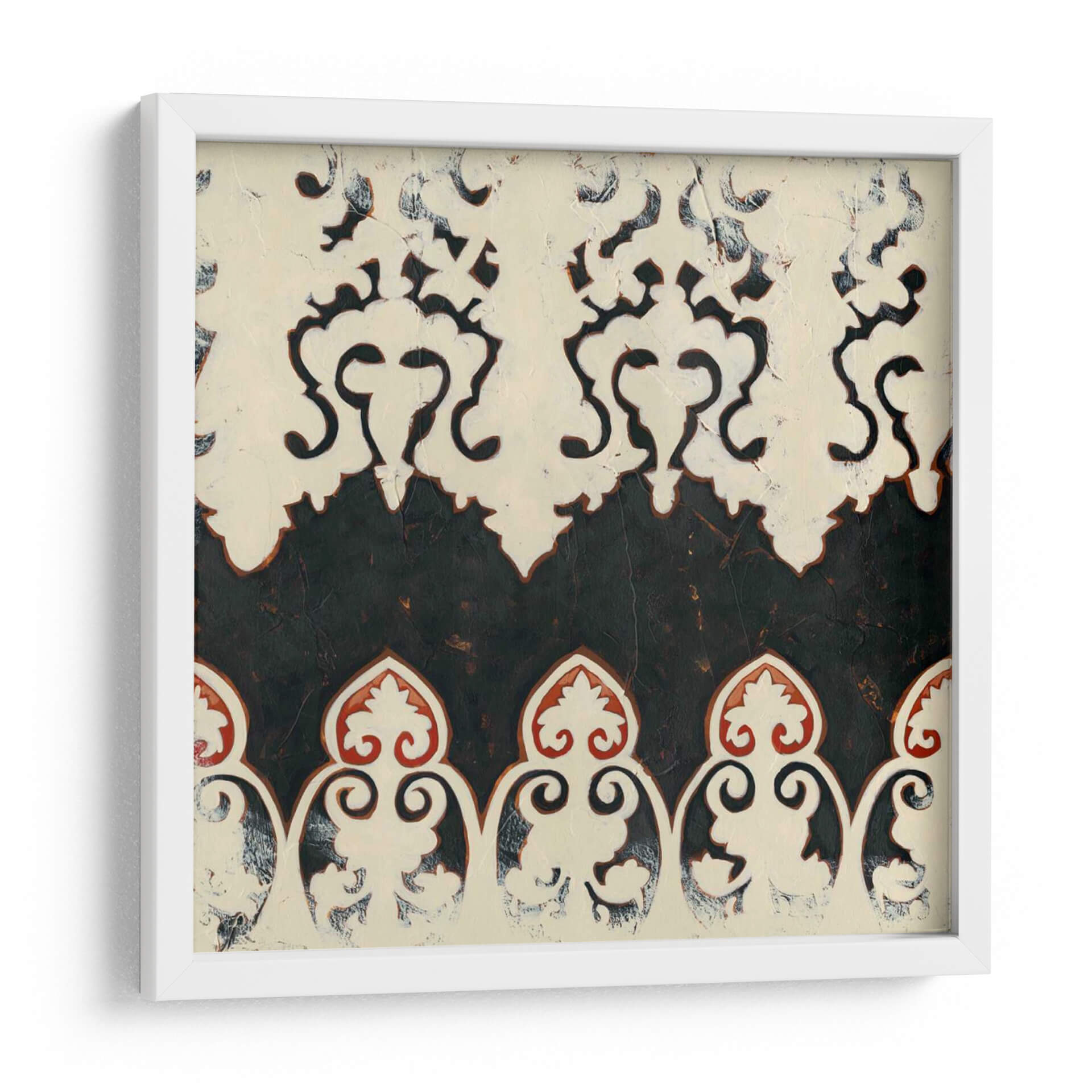 Sumérgete en la elegancia atemporal de "Bolero II", una obra de arte decorativo que evoca un sentido de sofisticación y misterio. Esta pieza abstracta presenta un cautivador patrón de filigrana en tonos blanco roto y negro profundo, con sutiles acentos de rojo terracota que añaden calidez y profundidad. La textura visual, reminiscente de un relieve o un estarcido desgastado, confiere a la obra un carácter orgánico y artesanal, invitando a la contemplación. La composición se organiza en bandas superpuestas, donde motivos florales estilizados y formas curvas se entrelazan en una danza rítmica, creando un efecto casi hipnótico. "Bolero II" es una elección perfecta para quienes buscan añadir un toque de distinción y un aire de intriga a su hogar u oficina. Ideal para espacios que buscan un equilibrio entre lo clásico y lo contemporáneo, este cuadro decorativo funcionará maravillosamente en salas de estar, comedores o estudios, aportando una atmósfera de refinada elegancia y un punto focal visualmente rico que dialoga con diversas paletas de colores. Su diseño intrincado pero limpio lo convierte en un complemento versátil para una decoración moderna, tradicional o ecléctica, transformando cualquier pared en una declaración de estilo y buen gusto.