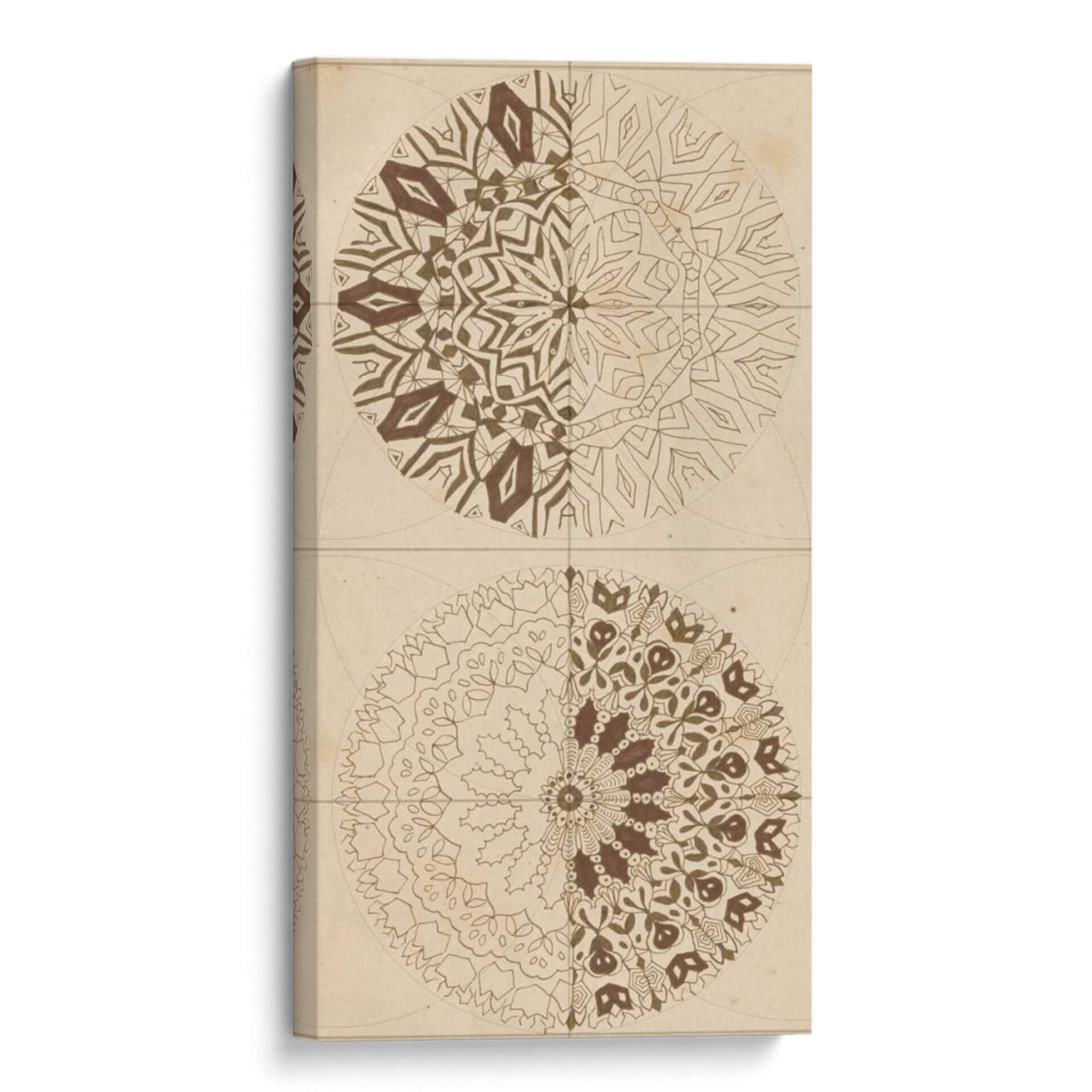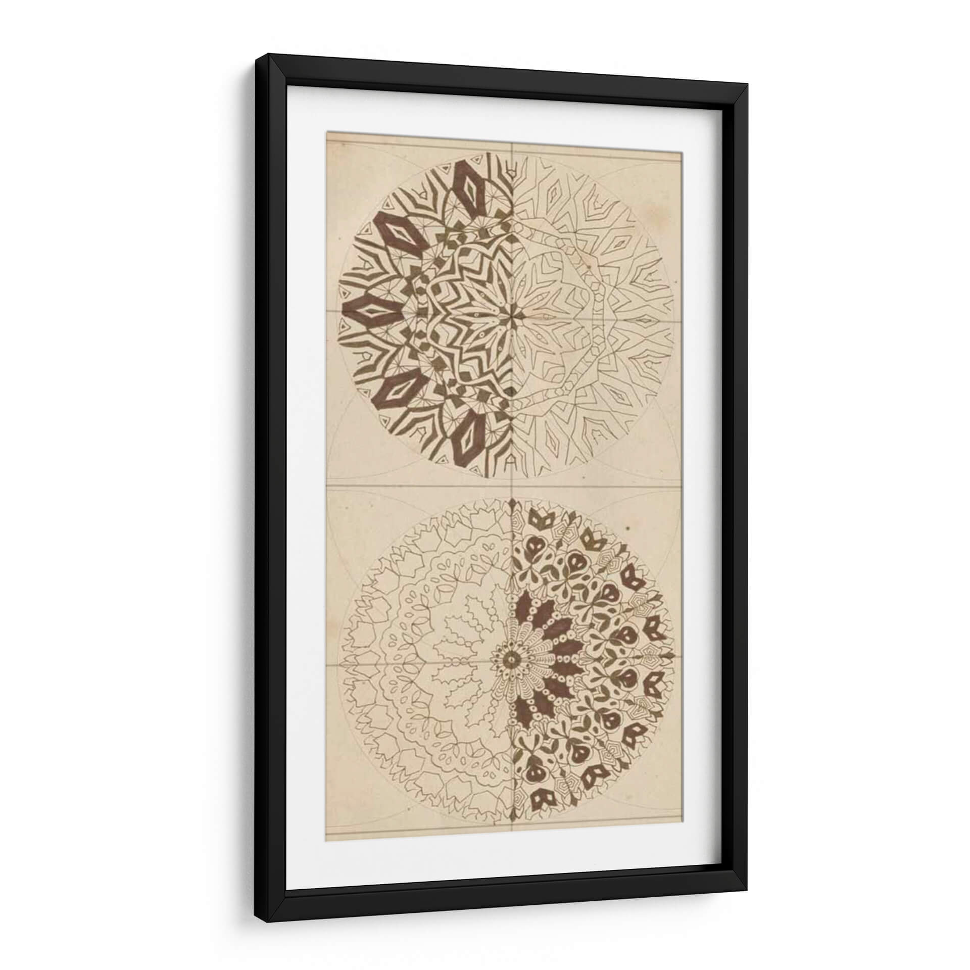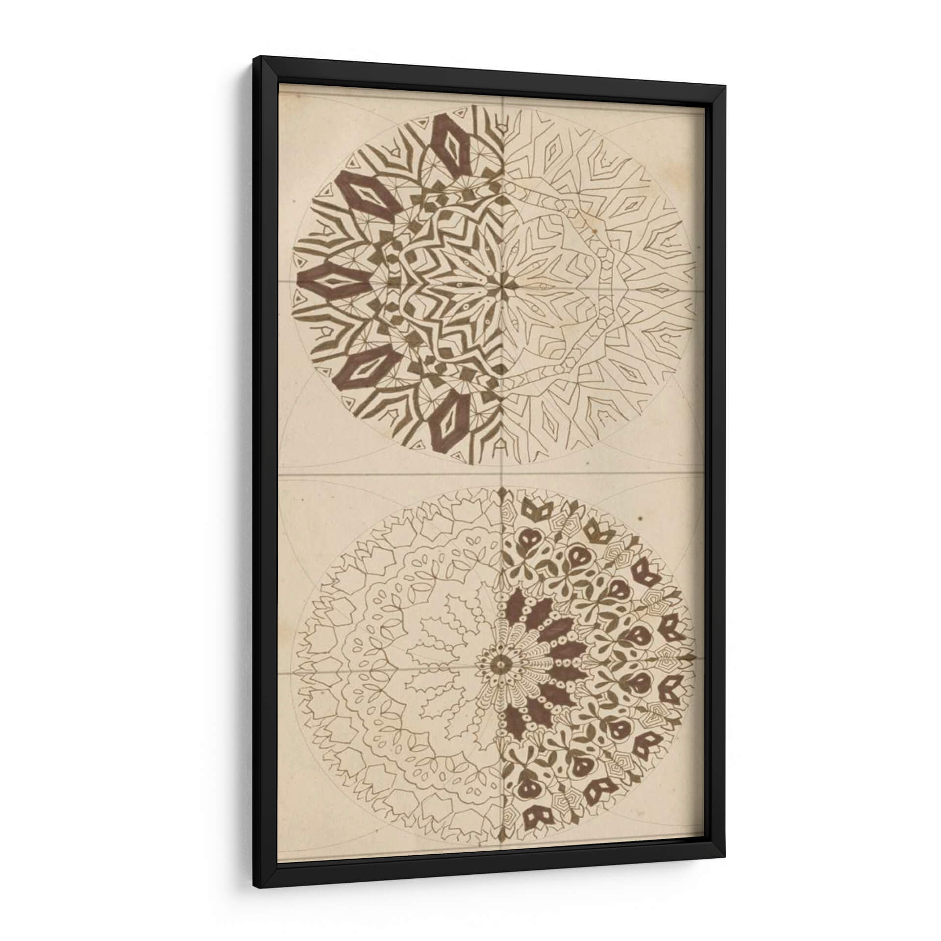 Sumérgete en la armonía geométrica y la sabiduría ancestral con "Bosquejo De Geometría Sagrada I" de Naomi McCavitt. Esta cautivadora obra de arte abstracto presenta dos mandalas simétricos, cada uno explorando intrincados patrones y formas que evocan un sentido de orden cósmico y espiritualidad. La paleta de colores, dominada por tonos tierra y marrones cálidos sobre un fondo de inspiración vintage, crea una atmósfera serena y meditativa, perfecta para infundir calma y reflexión en cualquier espacio. La mitad superior del cuadro revela un diseño más angular y estructurado, mientras que la mitad inferior se despliega en formas orgánicas y florales, ofreciendo un contraste fascinante que invita a la contemplación. Este cuadro decorativo es ideal para quienes buscan añadir un toque de profundidad, equilibrio y conexión espiritual a su hogar u oficina. Su estilo único lo convierte en una pieza focal excepcional para salas de estar, estudios o espacios dedicados al bienestar y la meditación, promoviendo un ambiente de paz interior y claridad mental. Descubre la belleza del orden y la interconexión en esta pieza de arte contemporáneo.
