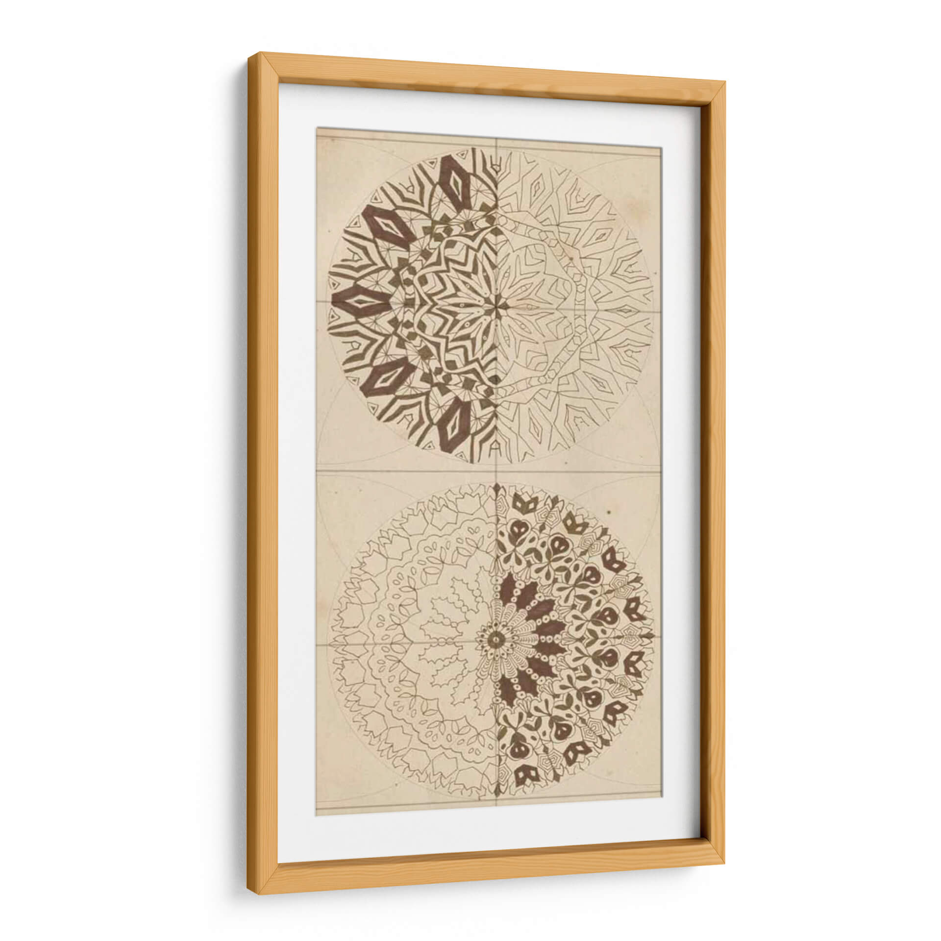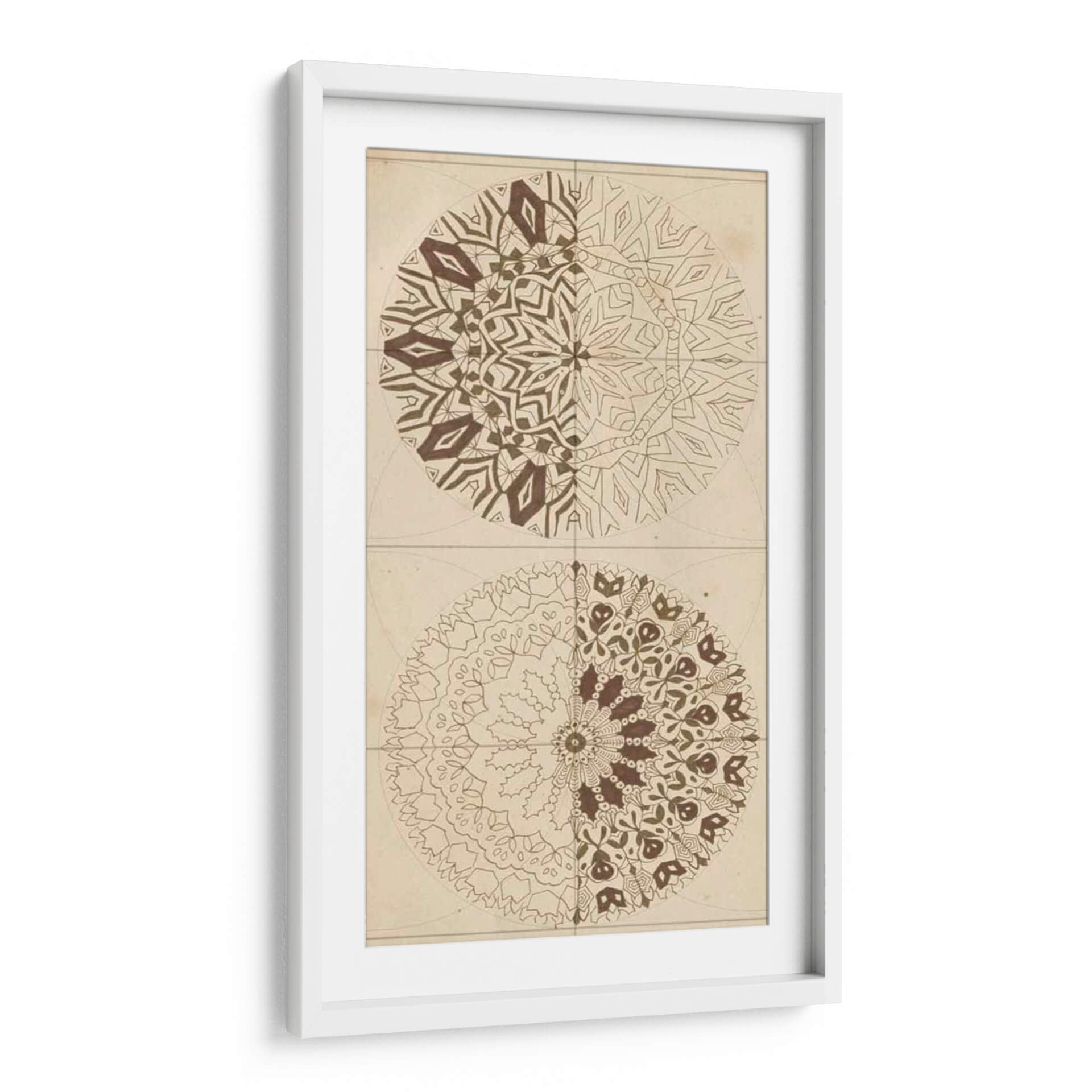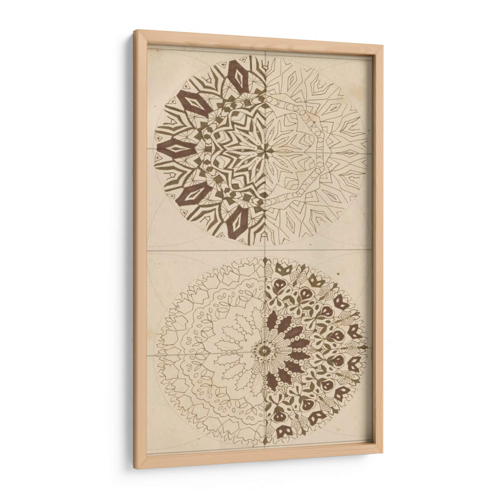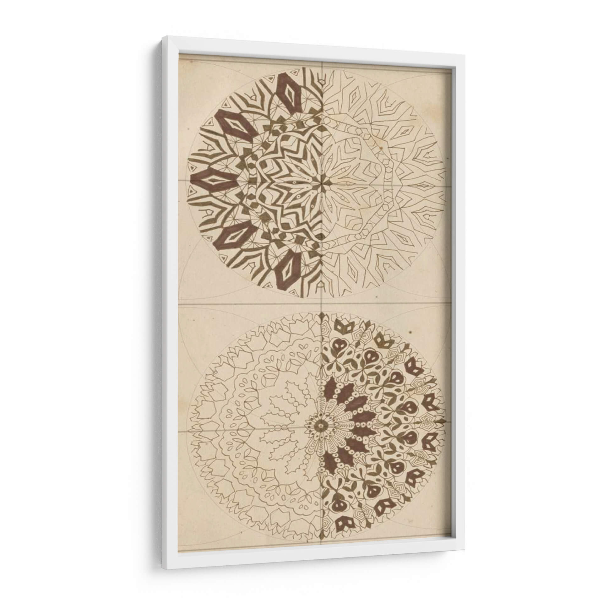 Sumérgete en la armonía geométrica y la sabiduría ancestral con "Bosquejo De Geometría Sagrada I" de Naomi McCavitt. Esta cautivadora obra de arte abstracto presenta dos mandalas simétricos, cada uno explorando intrincados patrones y formas que evocan un sentido de orden cósmico y espiritualidad. La paleta de colores, dominada por tonos tierra y marrones cálidos sobre un fondo de inspiración vintage, crea una atmósfera serena y meditativa, perfecta para infundir calma y reflexión en cualquier espacio. La mitad superior del cuadro revela un diseño más angular y estructurado, mientras que la mitad inferior se despliega en formas orgánicas y florales, ofreciendo un contraste fascinante que invita a la contemplación. Este cuadro decorativo es ideal para quienes buscan añadir un toque de profundidad, equilibrio y conexión espiritual a su hogar u oficina. Su estilo único lo convierte en una pieza focal excepcional para salas de estar, estudios o espacios dedicados al bienestar y la meditación, promoviendo un ambiente de paz interior y claridad mental. Descubre la belleza del orden y la interconexión en esta pieza de arte contemporáneo.