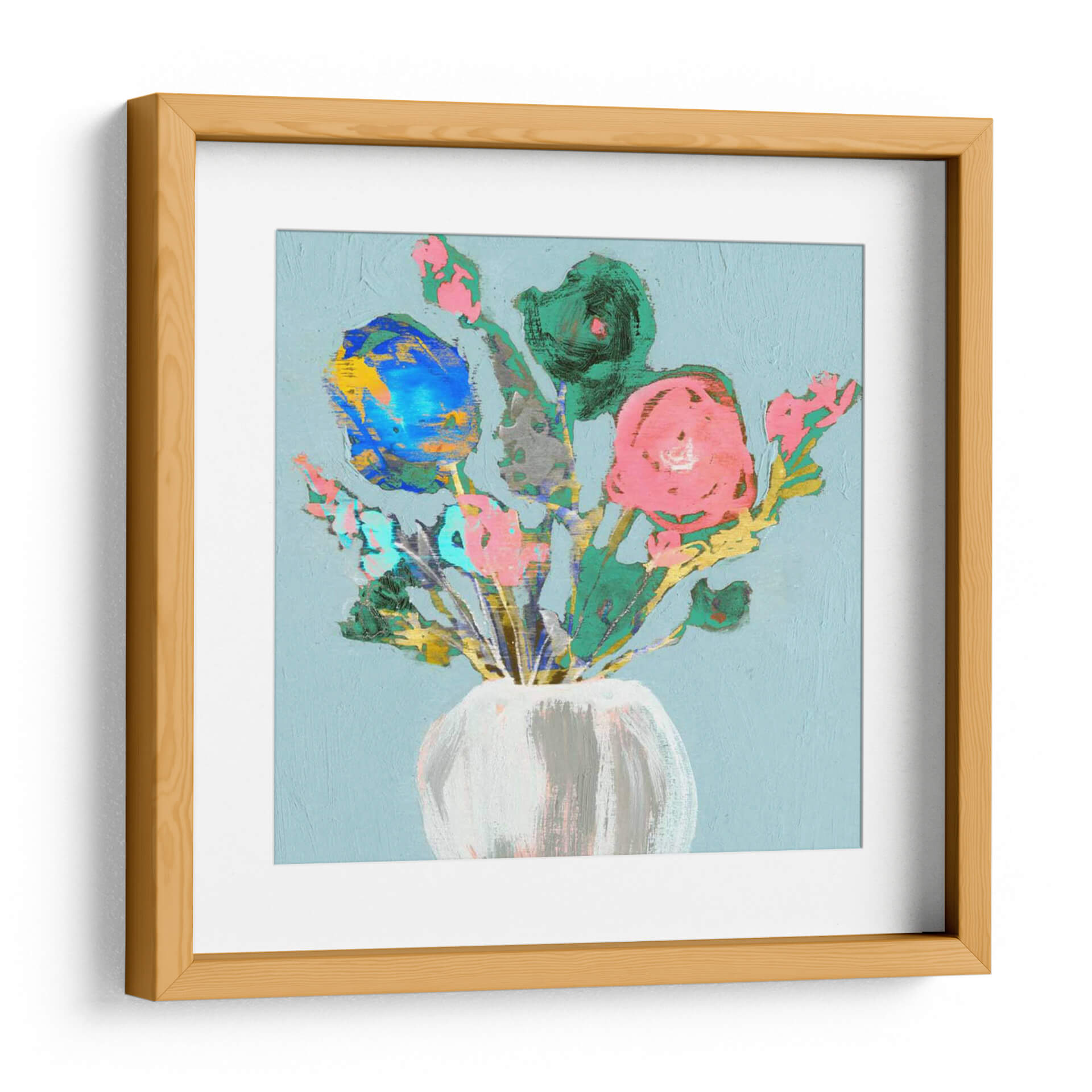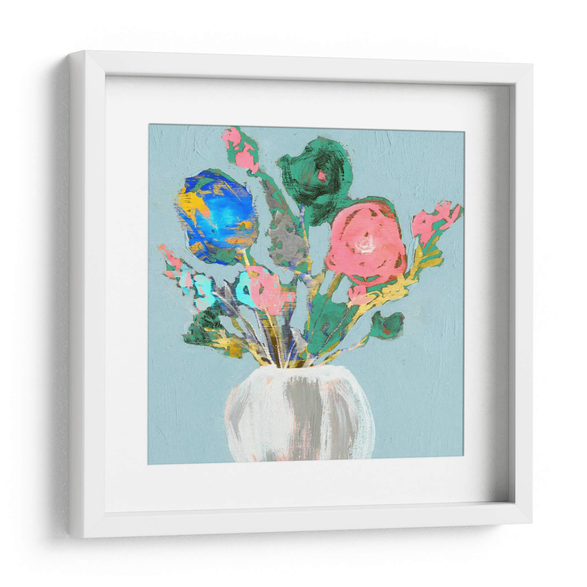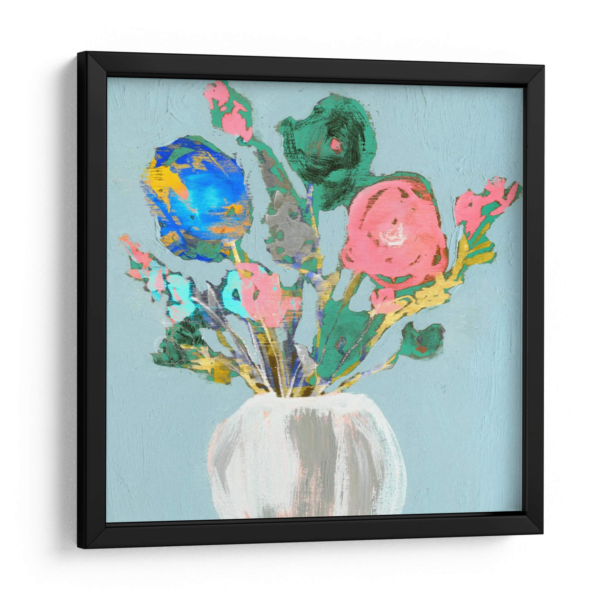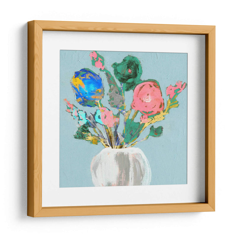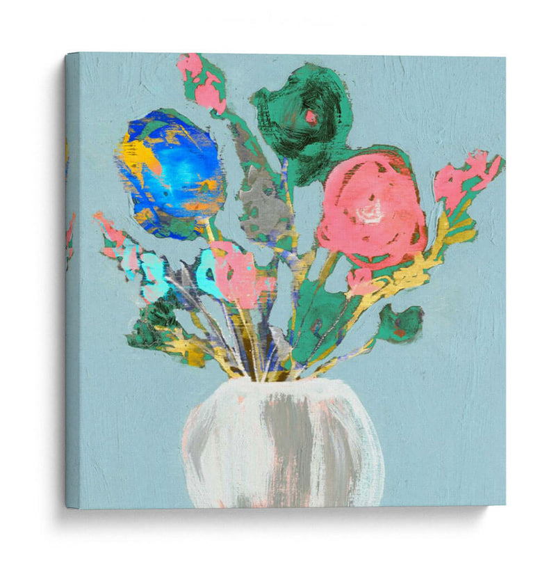 Embellezca su espacio con el vibrante cuadro decorativo "Bouquet Fun Ii" de Jennifer Goldberger. Esta obra de arte contemporáneo presenta un alegre arreglo floral capturado con pinceladas audaces y un toque expresionista. Los vibrantes tonos rosas, azules y verdes, contrastados con toques dorados y grises, crean una composición dinámica y llena de vida, sobre un delicado fondo azul cielo. La técnica gestual y la paleta de colores enérgica infunden una sensación de alegría y frescura, haciendo de este cuadro una pieza ideal para añadir un punto focal de color y personalidad a cualquier habitación. Su estilo moderno y desenfadado lo convierte en una excelente opción para salas de estar, comedores o incluso oficinas, aportando un toque artístico único y contemporáneo. "Bouquet Fun Ii" es más que una simple decoración; es una celebración de la belleza floral y la expresión artística que inspirará y deleitará a quienes lo contemplen, invitando a la conversación y al disfrute visual.