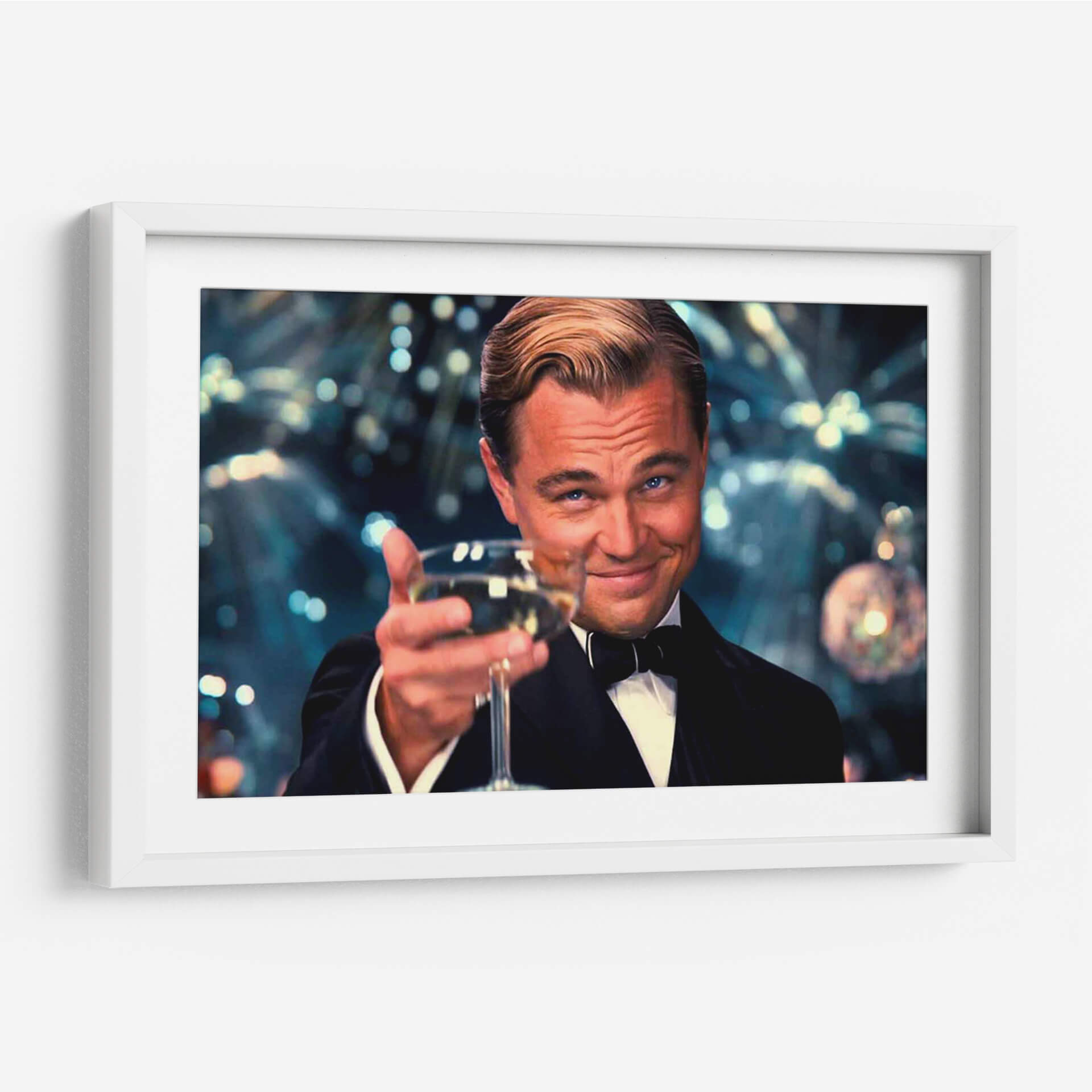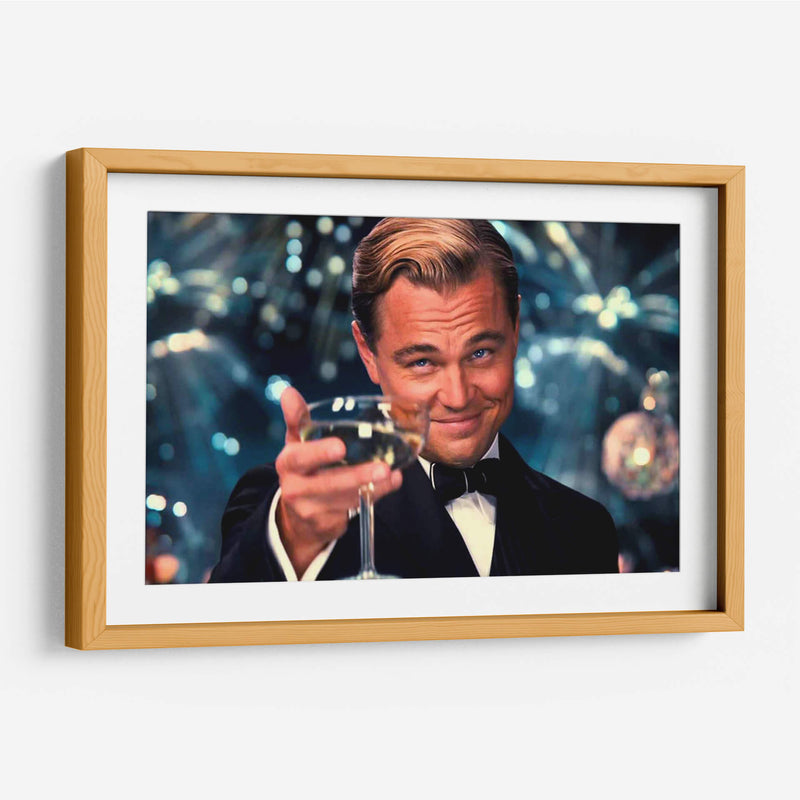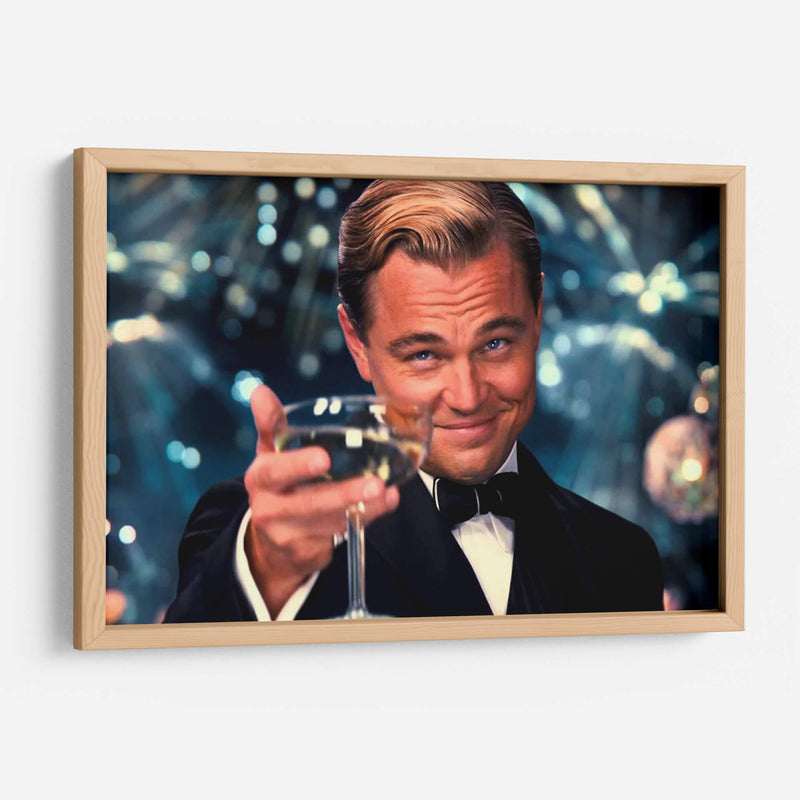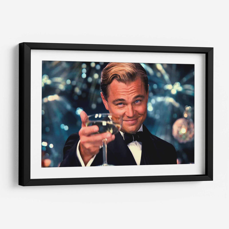 Captura la esencia del glamour y la celebración con este impresionante cuadro decorativo 'Brindis de Gatsby'. La obra presenta un primer plano cautivador de un hombre brindando, con una expresión de alegría y confianza. Los colores vibrantes, dominados por el azul profundo del fondo salpicado de luces bokeh, contrastan con la elegancia del traje y la frescura de la bebida. Este cuadro evoca una atmósfera de fiesta opulenta, lujo y optimismo, ideal para infundir vitalidad a cualquier espacio. La composición, centrada en el gesto del brindis, invita a la interacción y al disfrute. Es una pieza perfecta para salones modernos, comedores o estudios que buscan un toque de sofisticación y un recordatorio visual de los momentos festivos de la vida. Su estilo cinematográfico y su energía positiva lo convierten en un punto focal dinámico, capaz de transformar la decoración de cualquier hogar u oficina, añadiendo un aire de celebración perpetua. Este cuadro decorativo es una excelente elección para quienes aprecian el arte que narra historias y evoca emociones.