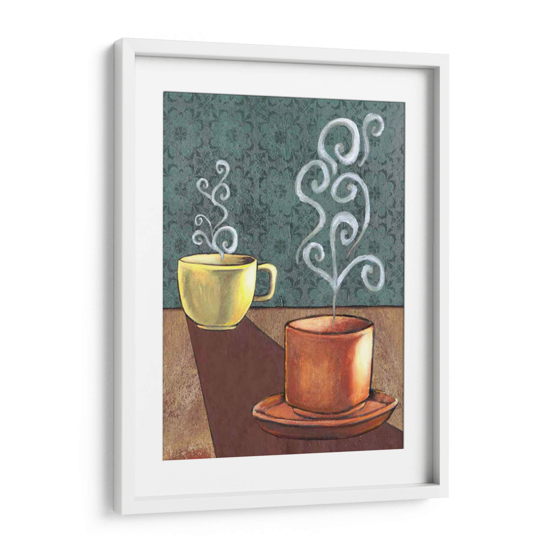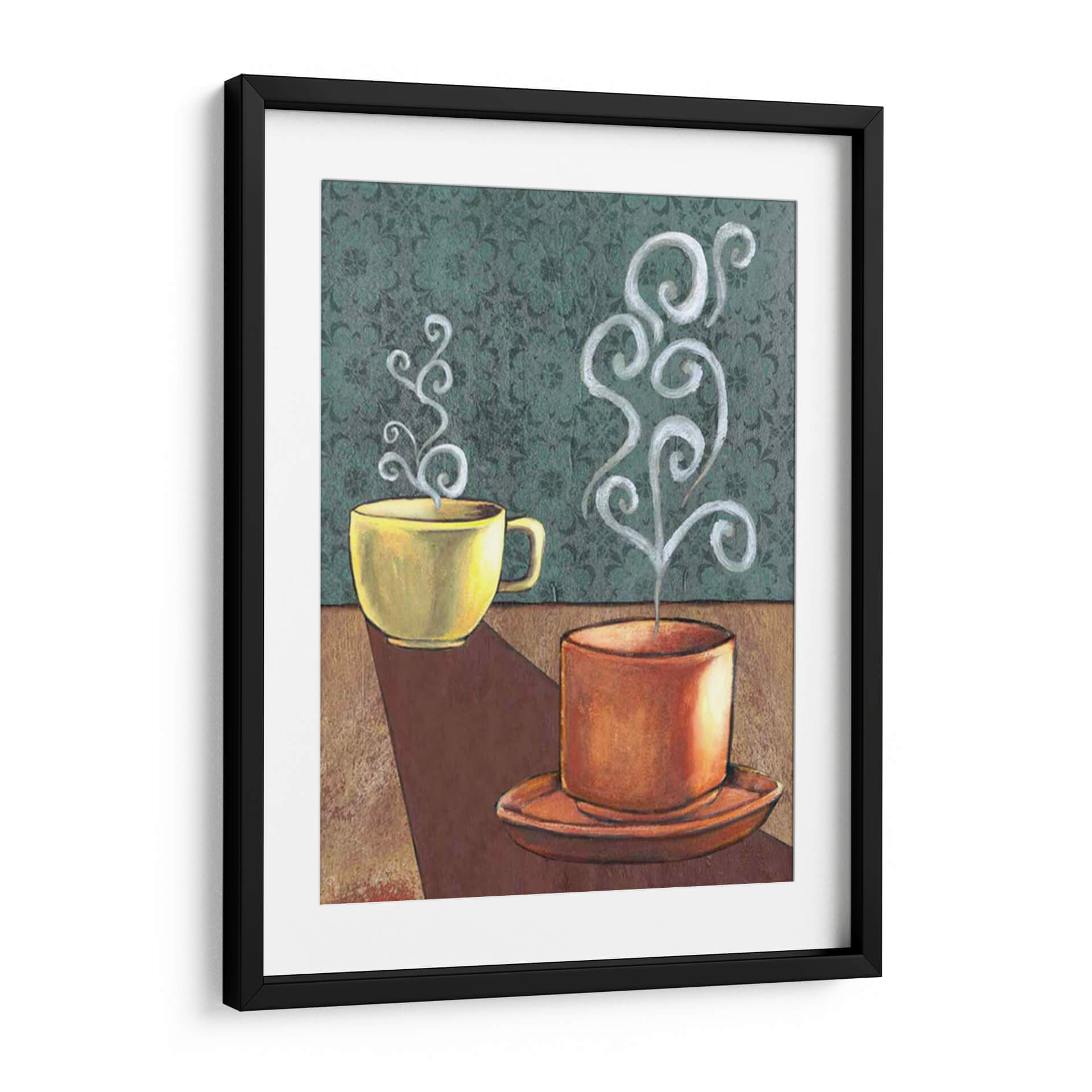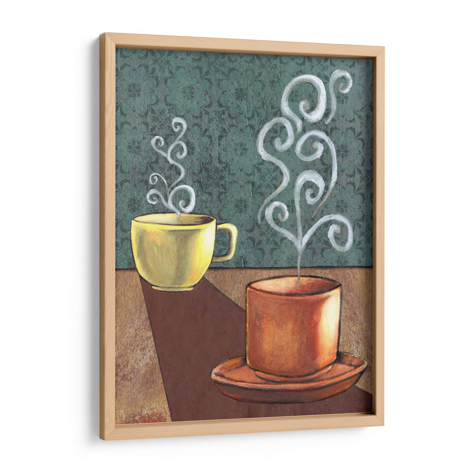 Embárcate en una experiencia sensorial con "Buenos Días Tazas II" de Grace Popp, una obra de arte que captura la calidez y el aroma reconfortante de una mañana acogedora. Este cuadro decorativo presenta dos tazas humeantes, una de un vibrante amarillo y otra en tonos terracota, dispuestas sobre una superficie texturizada que evoca la calidez de la madera y un fondo con un sutil patrón damasco en verde petróleo. El vapor que emana de cada taza se representa con elegantes espirales blancas, añadiendo un toque de movimiento y delicadeza a la composición. La iluminación suave y la paleta de colores terrosos y cálidos crean una atmósfera de tranquilidad y confort, perfecta para iniciar el día con serenidad. El estilo artístico, con toques de realismo y una pincelada expresiva, aporta profundidad y carácter a la pieza. "Buenos Días Tazas II" es ideal para infundir un ambiente de calma y sofisticación en cocinas, comedores, cafeterías o cualquier espacio donde se desee un recordatorio visual de los placeres sencillos de la vida. Transforma tu hogar en un refugio de paz y buen gusto con esta encantadora representación de un ritual matutino.